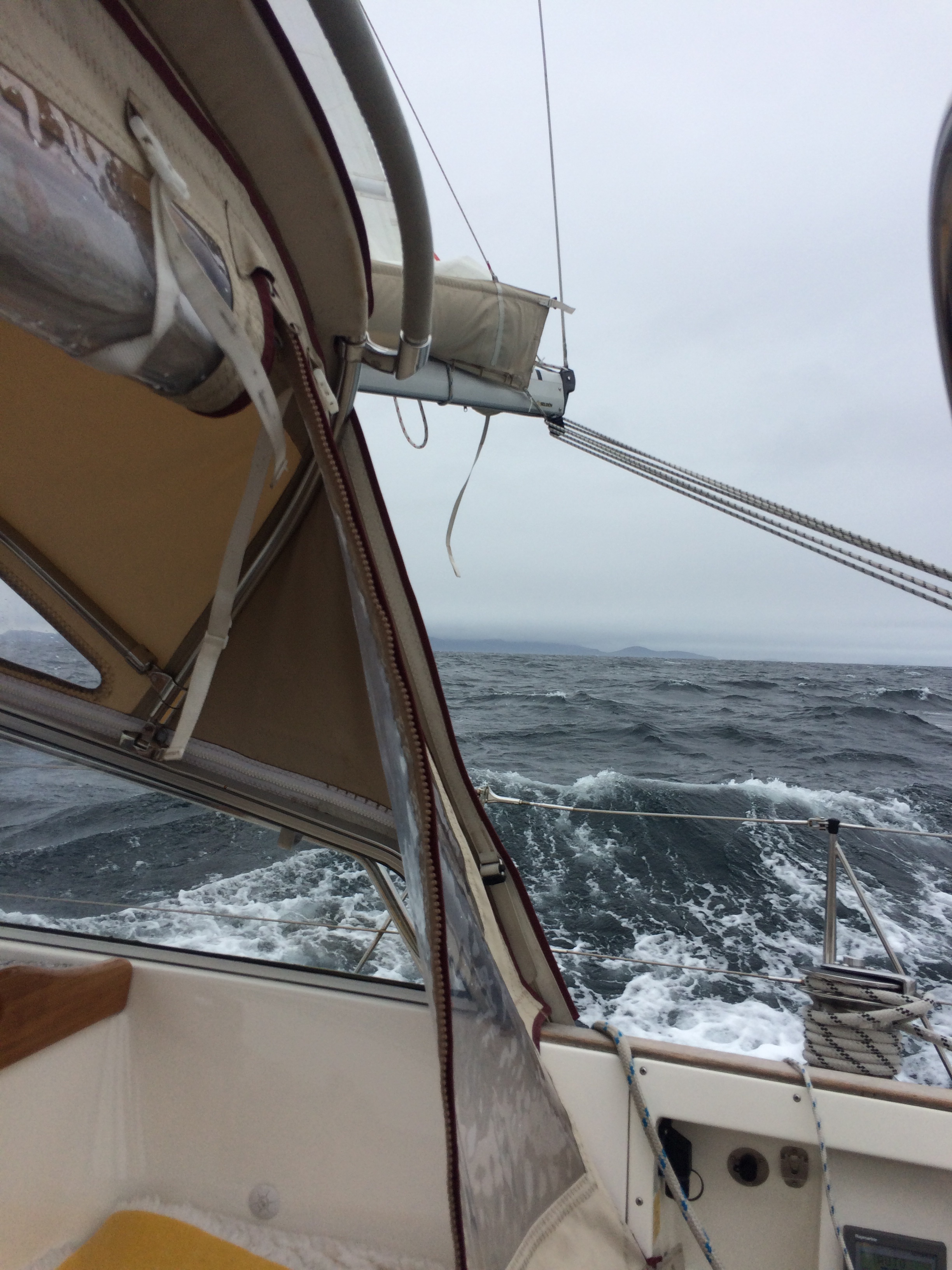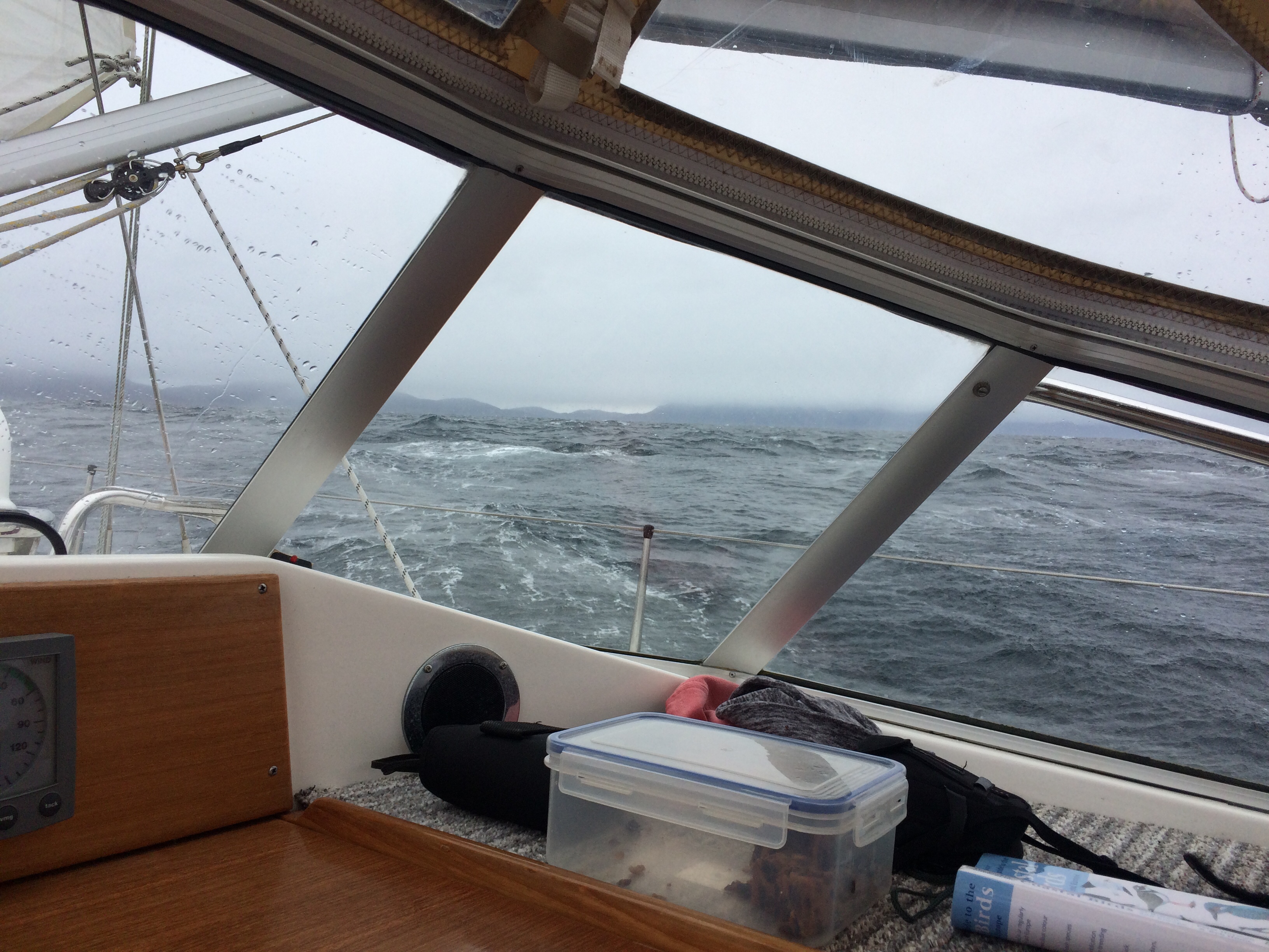 Well Trixi started whirring sometime in the dark if the night. She only starts if the wind is excess of 12 knots. There were obviously waves developing and we were aware that the wind was going to change direction into the east at some stage. That just makes for a bit of uncomfortable night. A bit of an issue was that we had absolutely no service/ no signal on our phones and the VHF radio didn’t seem to work either so we’re completely reliant on the previous 24 hours weather forecast being accurate. Knowing that the weather was going to deteriorate but there was a best window of opportunity early in the day, if not we might be stuck there for a few days. So got up 7 ish, looked out of the window… panicked 🤭 The wind had changed completely to an easterly as was forecast which meant it was blowing straight into the bay. Dropped our lovely mooring and Set of into the grey murk and headed downwind towards the outer Hebrides. We had to go a bit north as you can’t sail completely downwind and then gybed when the gps plotter gave us 60 degrees on our bearing to our destination Loch Boisdale. Once gybed we headed directly there. The weather was horrid, rain , rough sea state and winds gusting to 28 knots along with deteriorating visibility. All yuk and NOT my favourite.