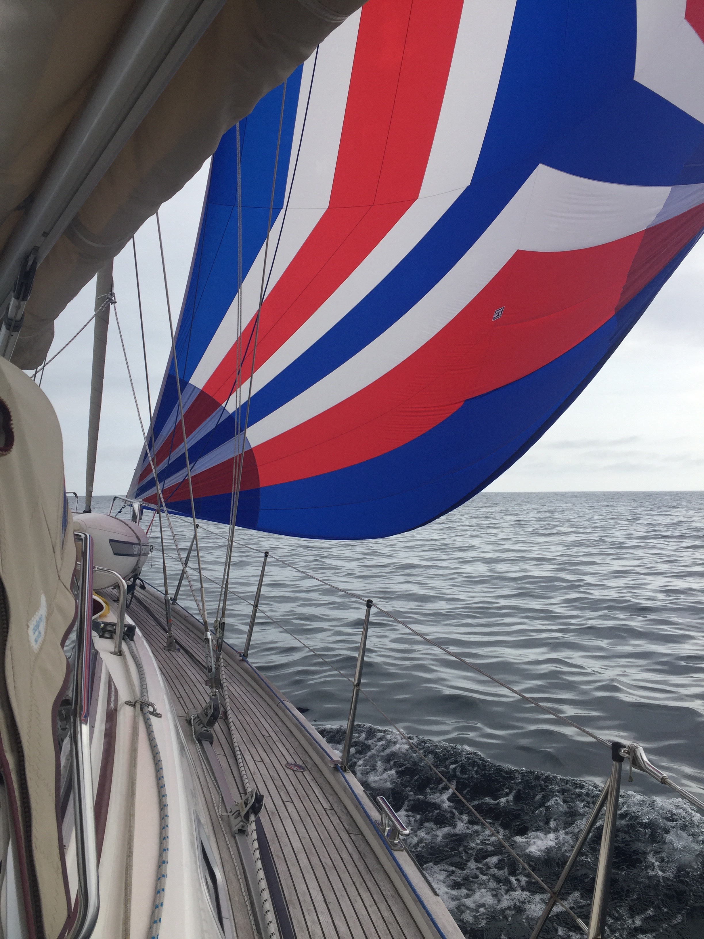 What I learned today…………13 knots is the maximum wind speed for using the spinnaker. Don’t be tempted to leave it until it is unmanageable….even if it’s exciting and you’re going really fast!