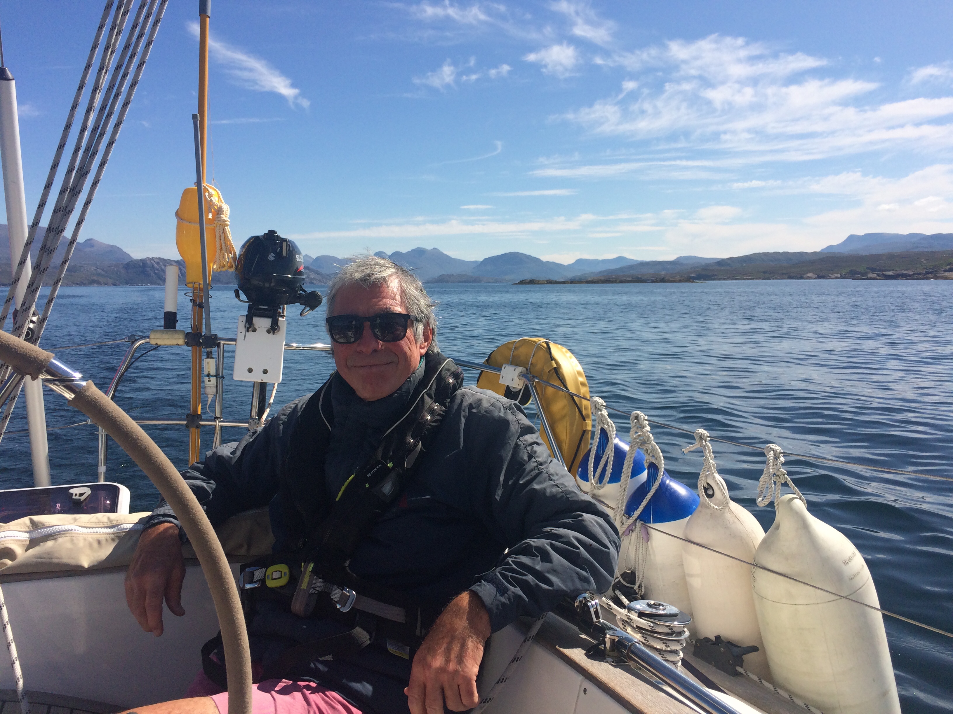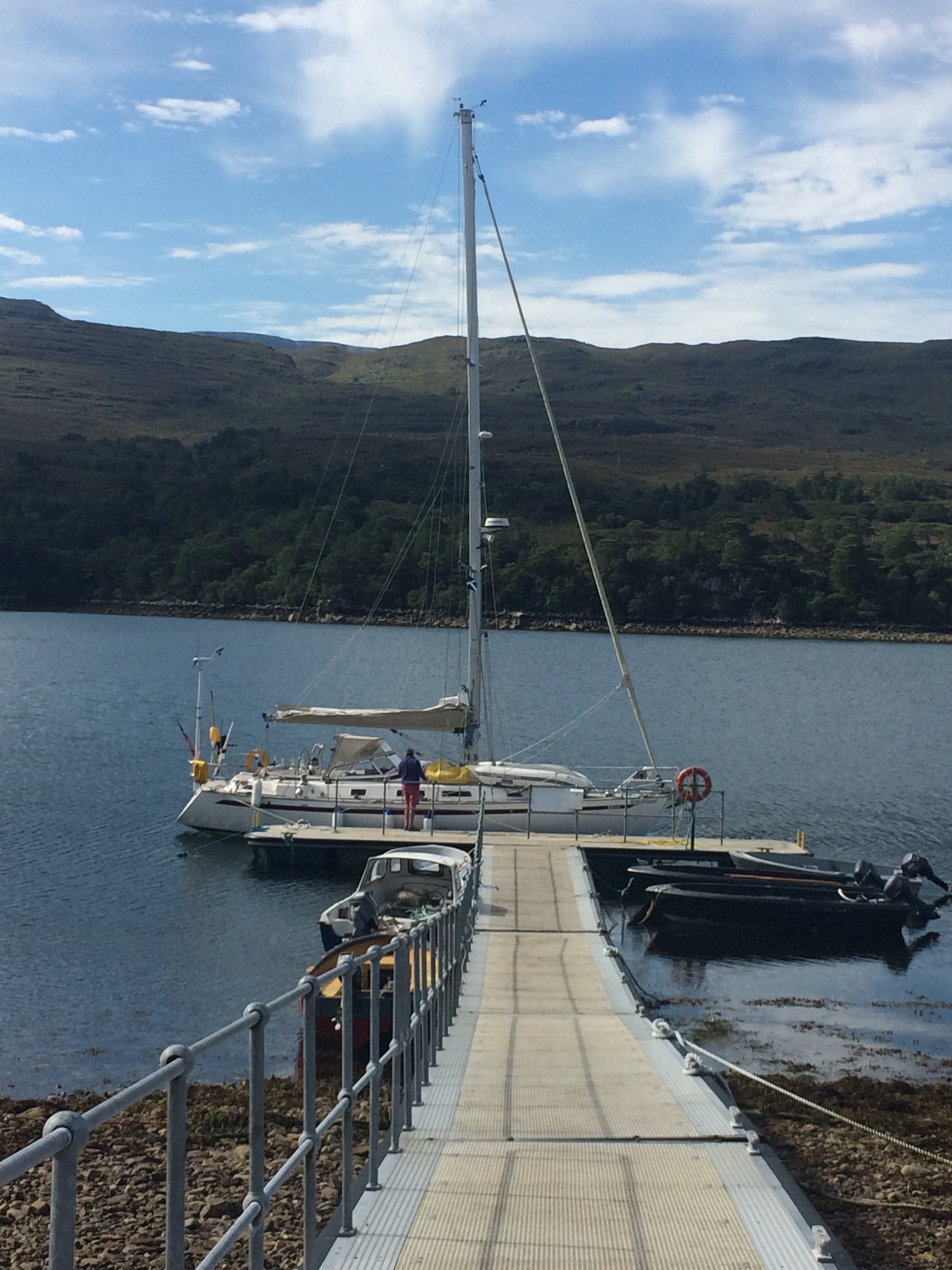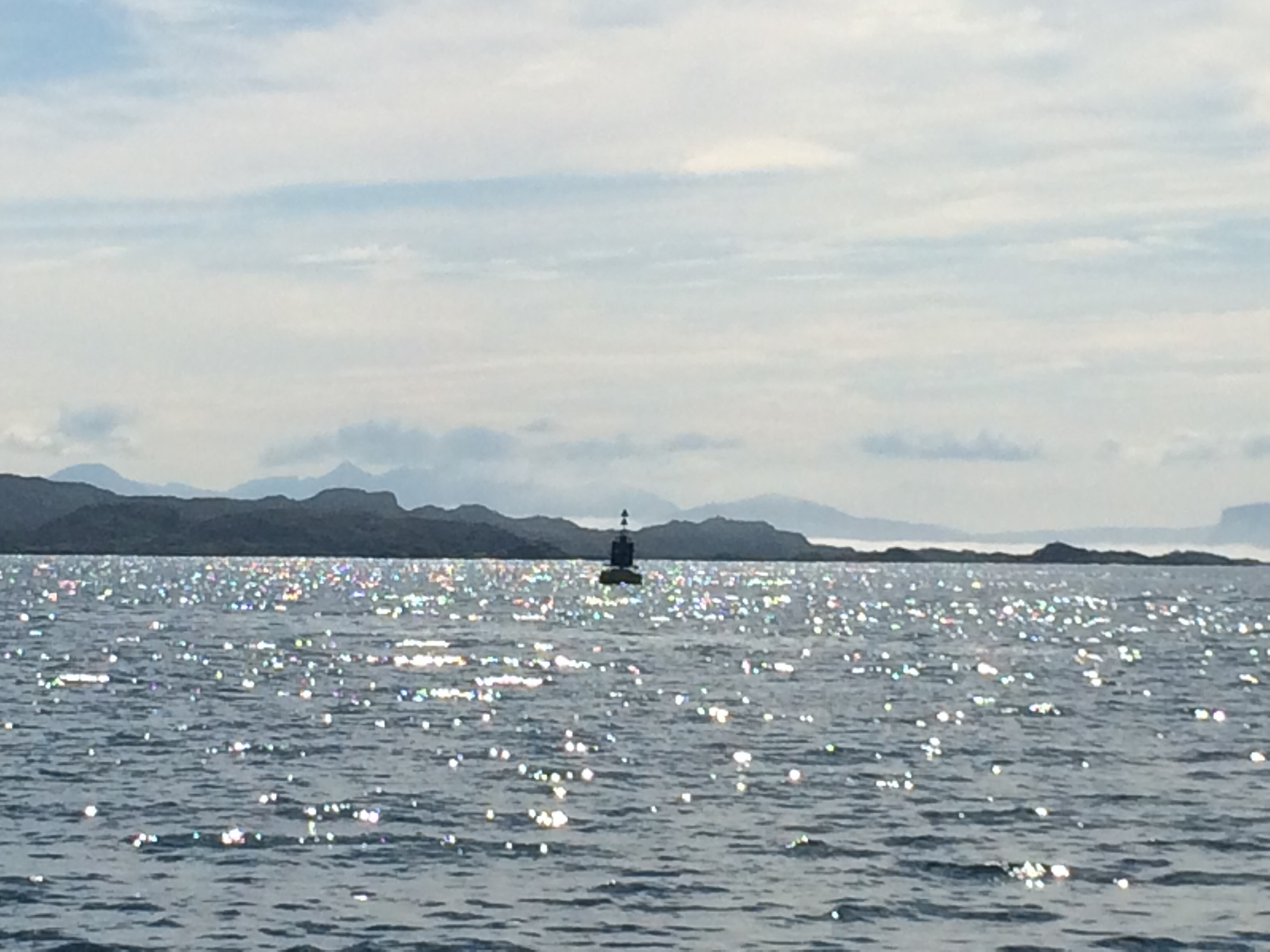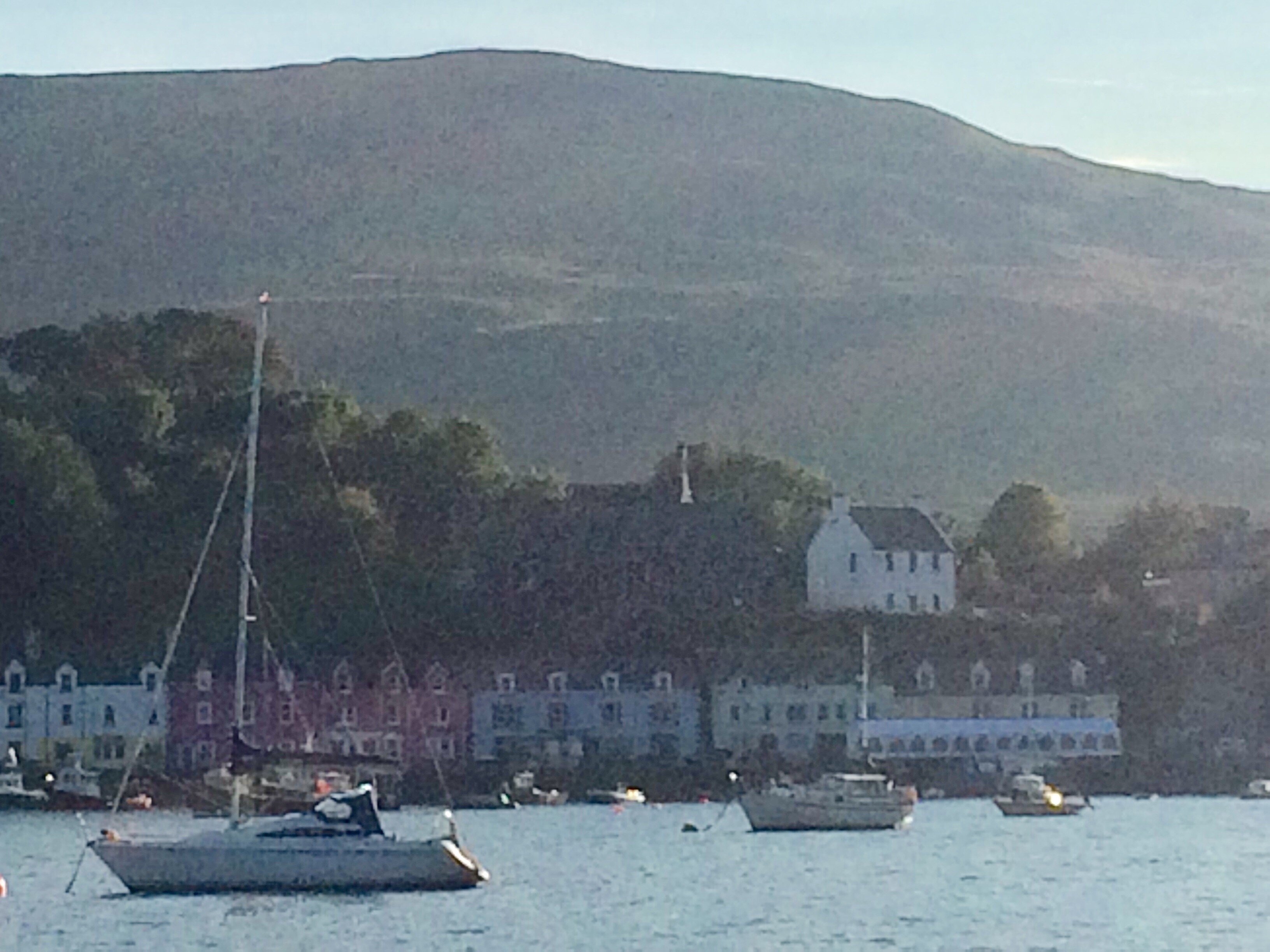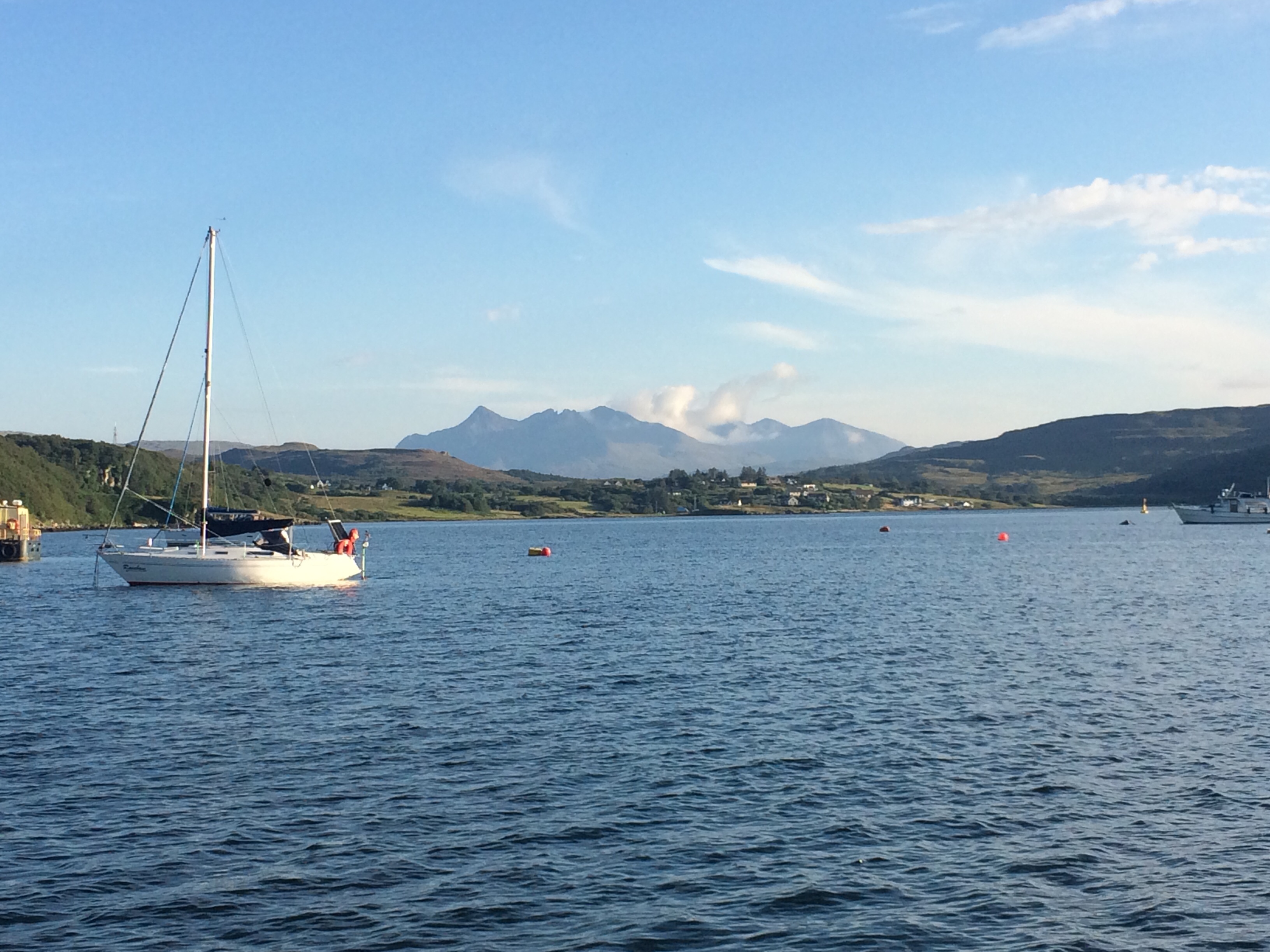 Seeing the blue sky and sunshine was a real relief as was dreading another day of fog. Fortunately although there was fog out to sea, it never really caused a problem and visibility was good throughout. We started off by making our way to a little pontoon which had a hose on it so we could top up our water. Wondered about the depth as looked shallow but all okay and a good thing to have done. I made Julians day by managing to get a Sunday times, Some fairy liquid and some shortbread 😊 from the village shop, whist he manned the hose. We proceeded out of the beautiful Loch with views of the mountains absolutely beautiful behind us. It’s not far to the top of Rona from the exit of the loch, and thereafter the sound of Raasay. Once we had rounded the northern tip of Rona… marked by a northerly cardinal , we actually put up the cruising chute ( well J did), and I have to say I am getting a bit more trusting of it! We carried it for at least 3 hours, gently cruising down the sound toward Portree….. sun, blue sky and sparkling flat sea….. oh yes …..and dolphins 🐬. Not sure it gets much better. Once into Portree harbour we were slightly disappointed that all the visitors moorings had a label on them saying “ do not use” we presume because they had not been serviced this year. So we anchored looking across to Portree and hopefully will have time tomorrow to have a little explore. Supper on board after sundowners!