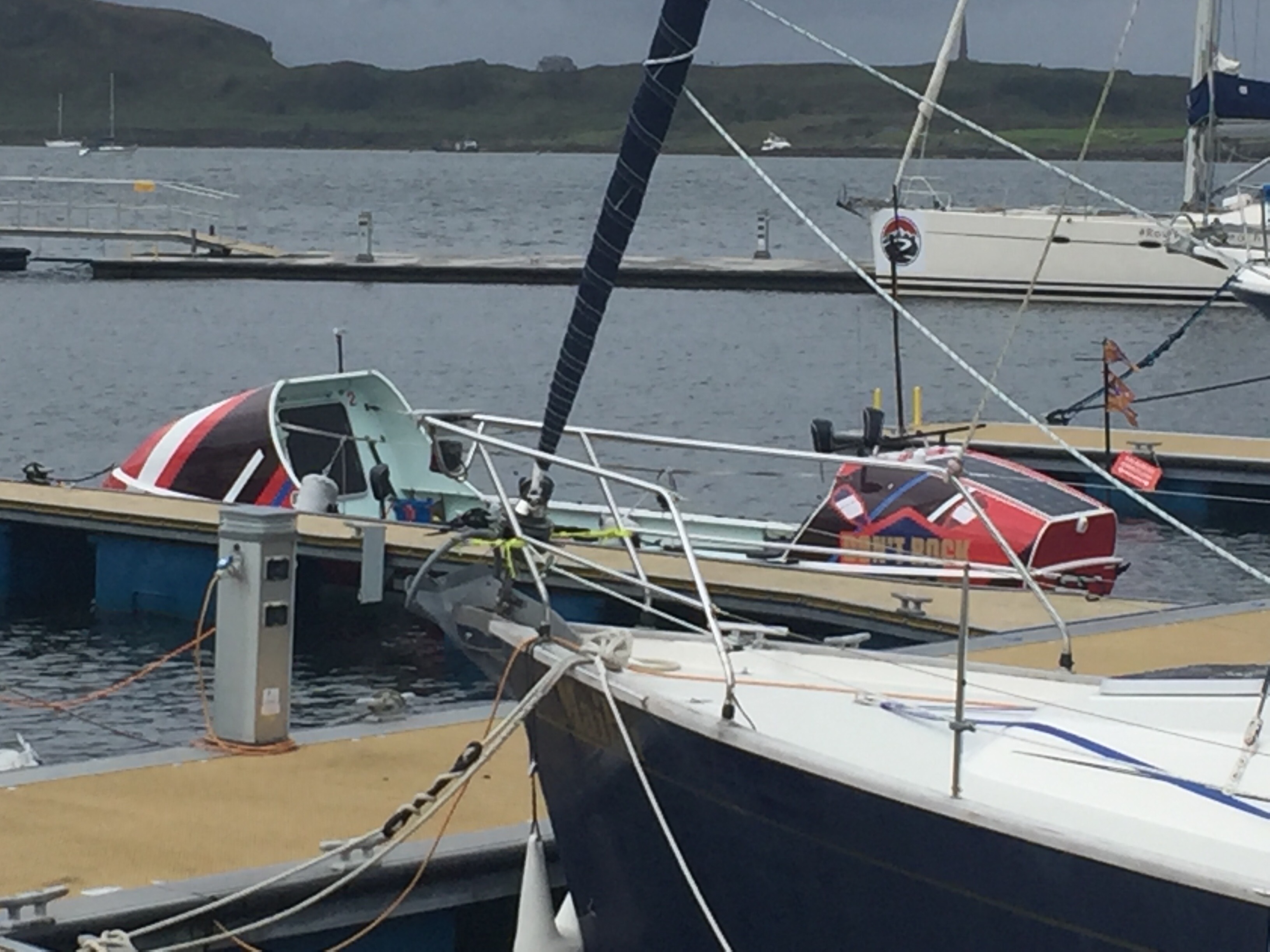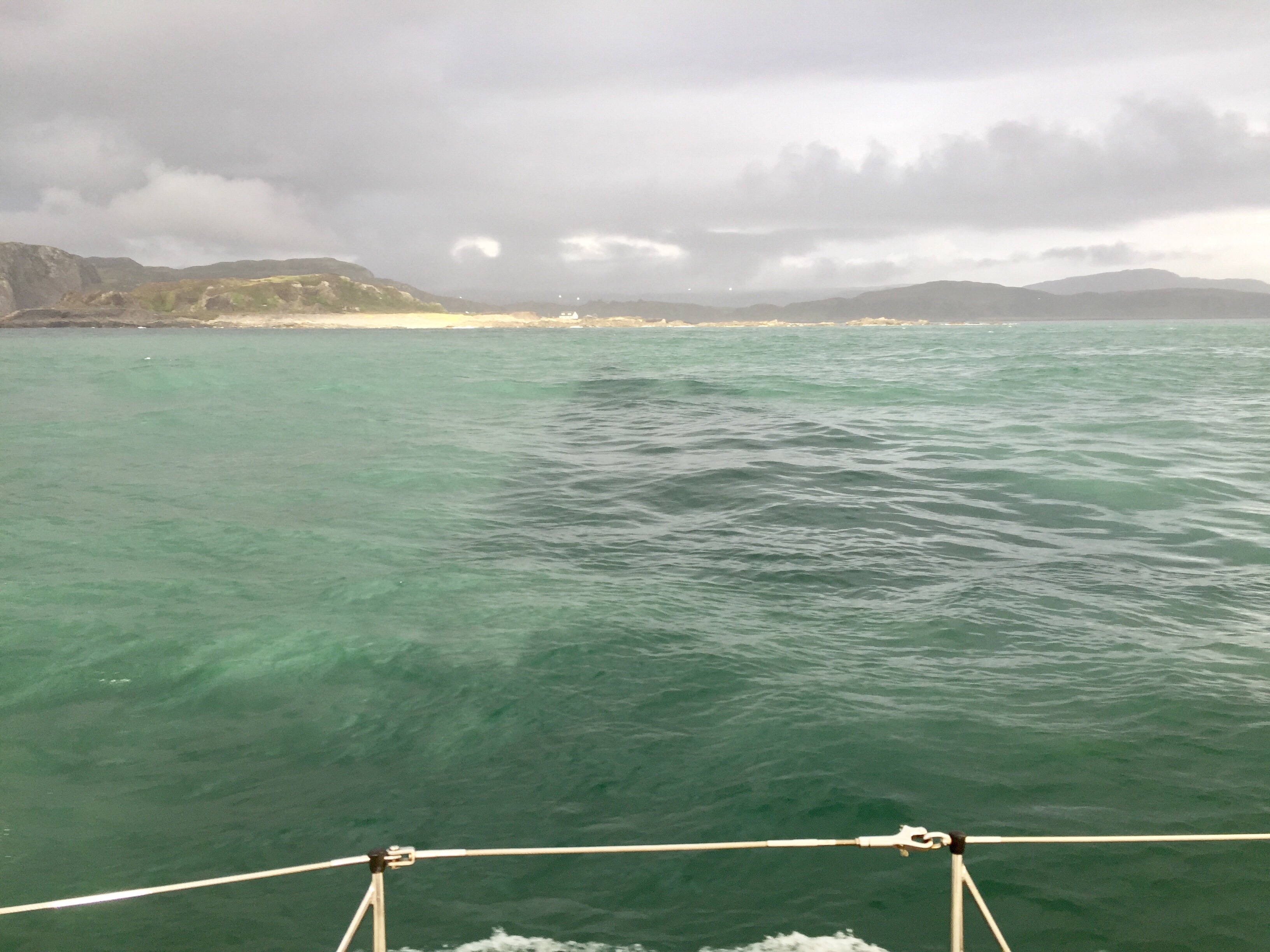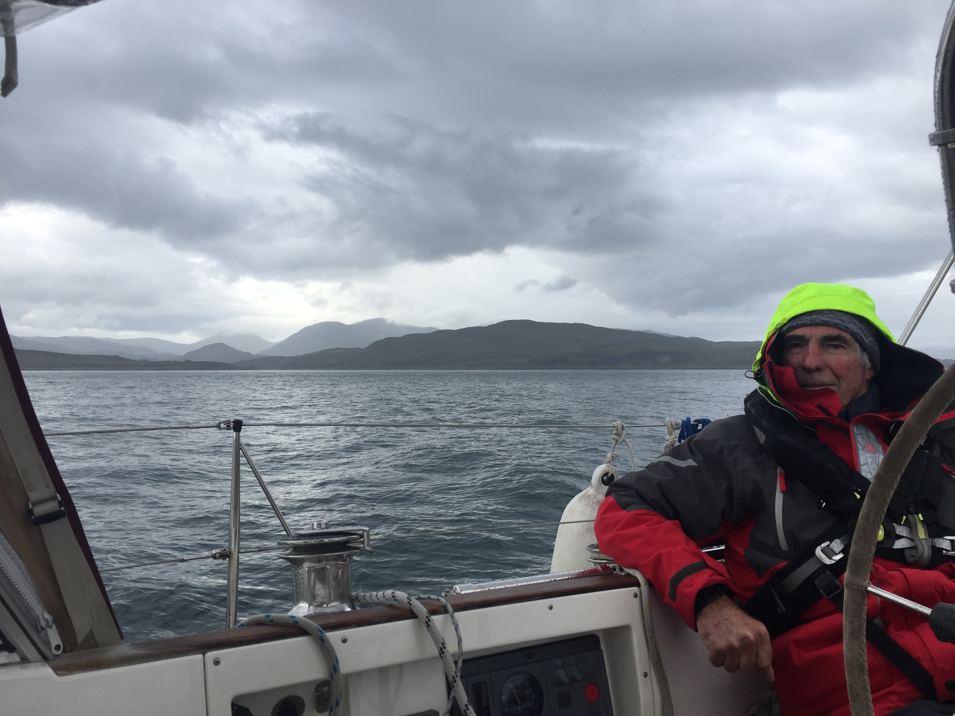 Now we are on a bit of a deadline to get to Troon ( I bought my train ticket yesterday), we have planned our route south, round the Mull of Kintyre and back into the Clyde. Trouble is the tides through the sound of Luing run in the right direction only from 7 am this morning or this evening. Neither are particularly good times but we decided to go for the evening one and put up with sailing bit in the dark at the end as the wind should be going round to the North west which will be a much better direction for the journey. So we had a morning to wait. Did various things, J got a new battery for his phone which had died and I had another lovely shower. There were two Atlantic rowing boats on the pontoons which was interesting…..so tiny!!! We eventually set off about 230 pm into a grey, drizzly murky afternoon. We had to be at the top of the sound about 7 pm. The wind was okay to begin with but we were having to tack and then it dropped, went all over the place and came back in various different directions. We kept pulling in the headsail, putting on the donkey ( motor) and then doing it all in reverse when the wind came back. Anyway, got to the sound at the right time! Annoying then that the tide still seemed to be against us! Although the sky was pretty black, at times the sun broke through and gave the most amazing light and colour effects to the seascape . The black hills and white houses of easedale looked spectacular as the sun shone on the white breakers on the shoreline, and seagulls contrasted against the cliffs. The photo J took shows the shadow of our sail cast on the green water….. if you look closely! The wind had filled in by now and we had an amazing sail under a (lovely )10 knot ( my favourite speed) wind on flat water down towards the sound of Jura. Julian cooked us a fantastic hot meal! Scottish pies, potatoes and mange touts! No less! Cuppa hot cocoa for pudding . Sadly it got dark. The funny thing is one spends a lot of Time looking out for lobster pots during the day, once dark you just forget about them! ( and hope! ) I don’t like sailing in the dark. Whenever we do it the wind seems to get up and you’re crashing along through pitch black without being able to see where you’re going . There are Lots of “allegedly” identifiable lights….. (according to proper navigators, rather than RYA day skippers). They look simple in the text book but in reality, are very confusing. Red and green and white. All flash singly, or don’t flash or in odd sequences…. all of which you’re supposed to remember. Perspective is lost at night so what is near or far-away is difficult to fathom. Not really selling it am I!! Anyway fortunately we have a wonderful plotter which tells us exactly where we are thank goodness! So we continued to speed down the black coast of Jura in up to 20 knots. Since the wind was at 90 degrees we were going fast and with 2 knots of tide with us, were careering along at 9 knots ! We finally arrived at our destination, just before midnight and I was very relieved when the anchor bit, and we finally came to a standstill. We could vaguely make out the outline of the Jura distillery on the shore! So we had one to celebrate……