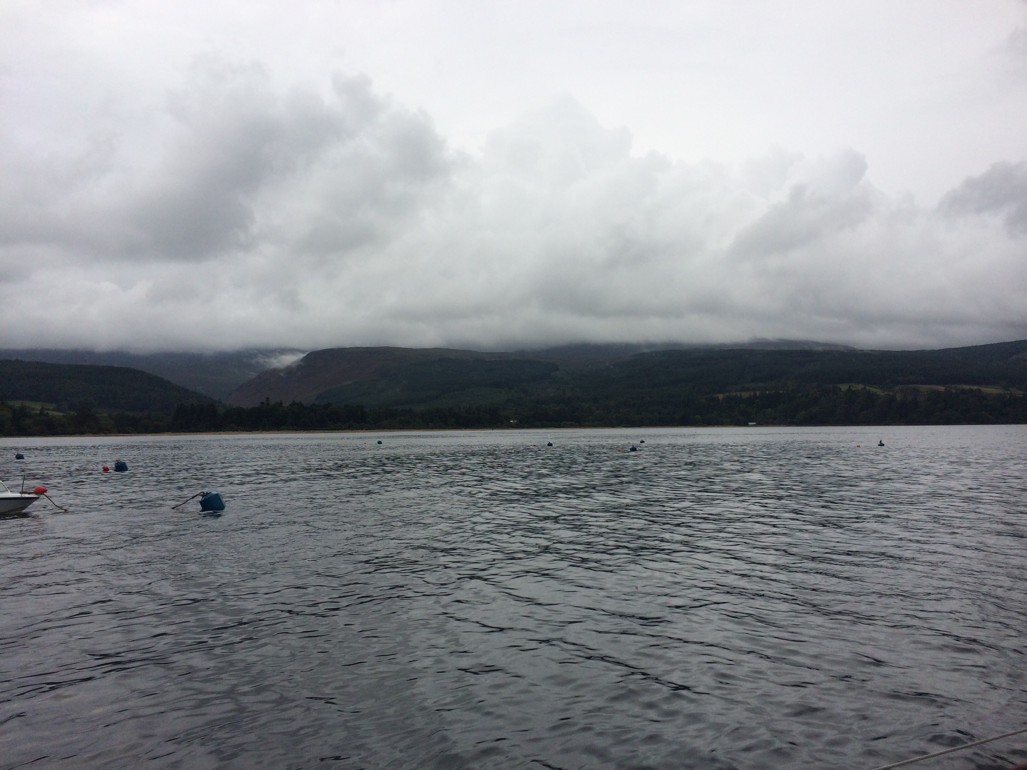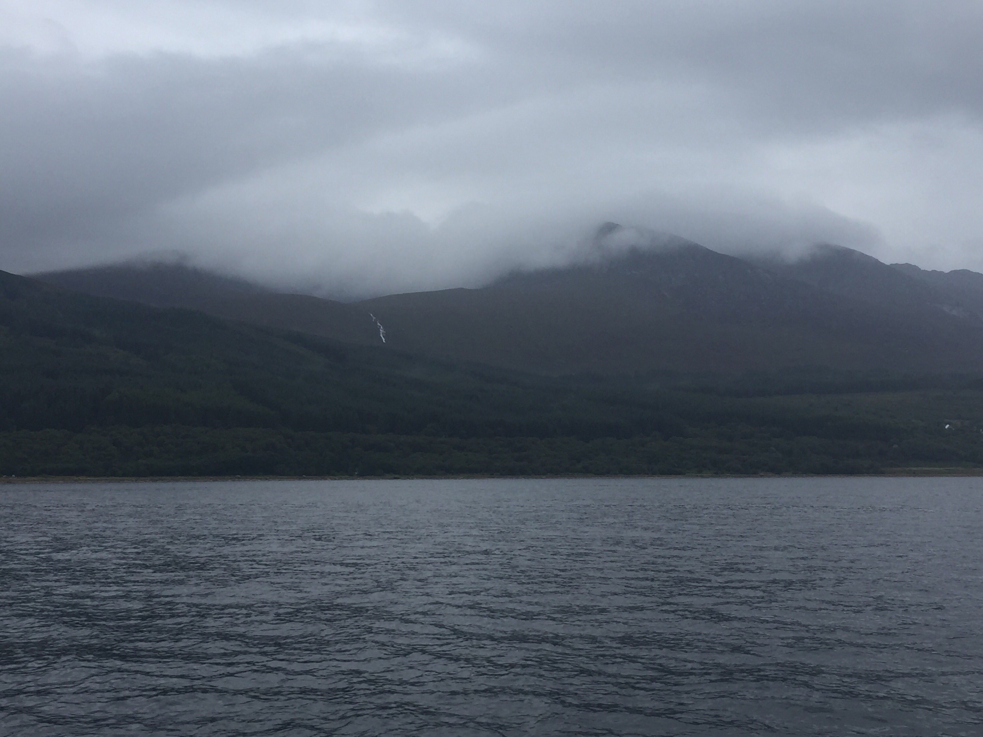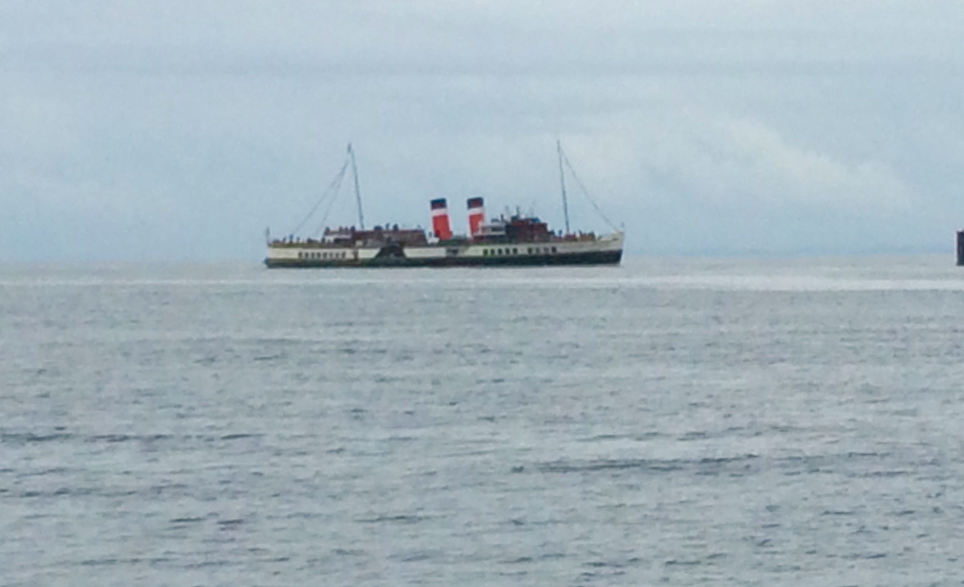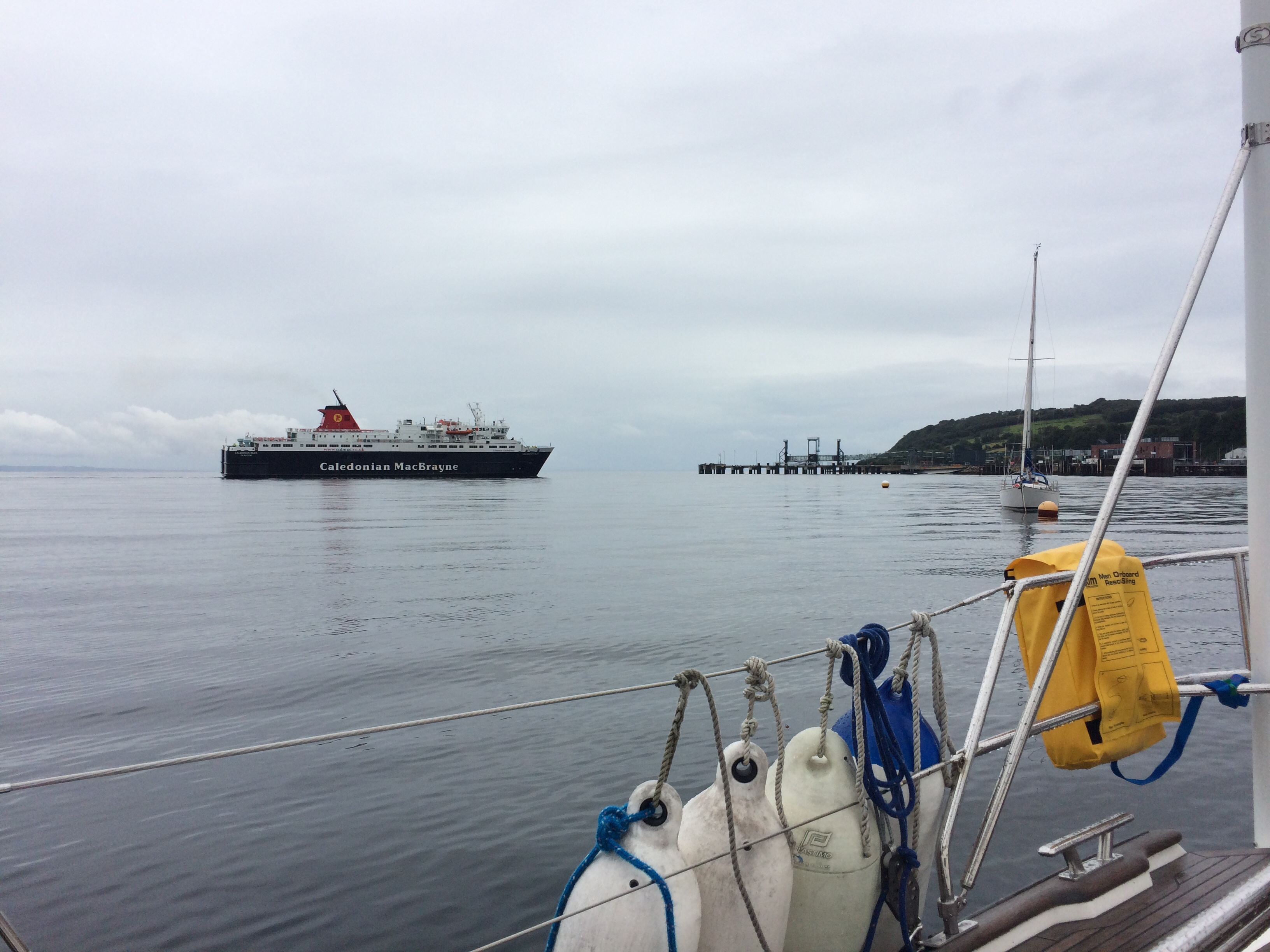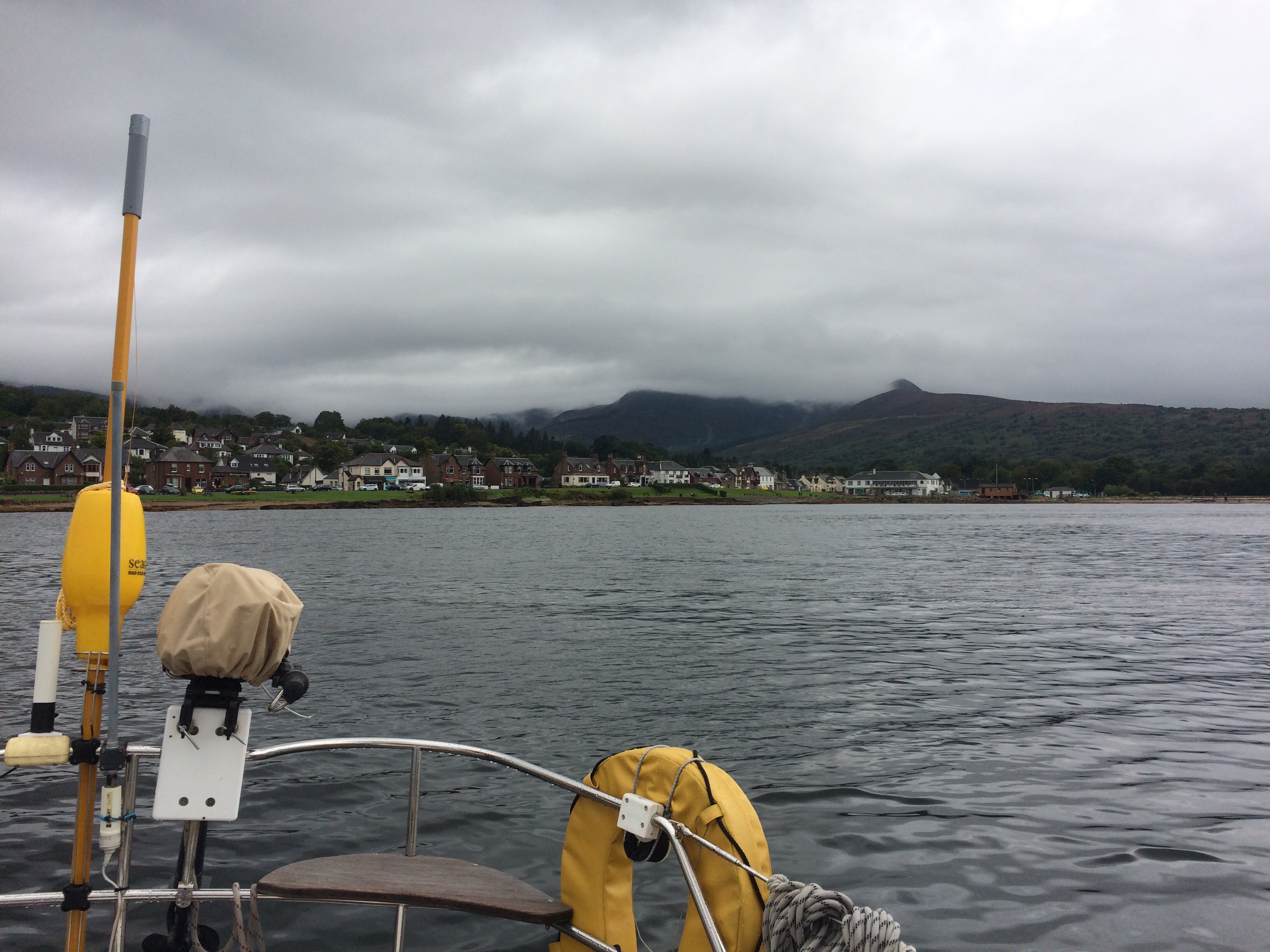 Given the beautiful scenery and sunset last night , today dawned a bit disappointing. We woke to Drizzle and low cloud . All the colours from yesterday gone , to be replaced by a 100 shades of grey . After breakfast we got the dinghy ready and set off to the beach near the castle. Our friends that were camping nearby had invited us for coffee …… about 10 minutes walk from the beach. It was just dull at this point and we left the dinghy on the beach attached to a rock. The tide was going out( I’d worked that out!) so we didn’t have to lug the dinghy any distance thank goodness. The campsite borders the river / stream which runs down to the loch and supplies the distillery……they seem to be almost as prevalent as ferries! It was lovely to see Ed and Kirsty, Flo and Fin. Despite the pretty atrocious weather they’d had they were remarkably happy but probably looking forward to ditching the camping idea and moving to the very posh house in saddel bay (for a family celebration) the day after tomorrow! Happy birthday Lee!! We made our way back to the boat and just as we clambered on board the heavens opened. Suffice to say the rest of the day was a bit of an endurance test. Doing everything wet is miserable. The wind kept moving around and we couldn’t really sail. We were hoping to get some great views of goat fell as we passed by on the east side of Arran, but not a chance! We had originally planned to go to lamlash but on passing Brodick which apparently also had visitors moorings, we decided to cut our journey short. Also we’d never been here before and it’s always nice to go somewhere new. We picked up a mooring no problem…. 15 moorings and only us!! The town on the front opposite looked inviting… bustling shops and maybe the odd eatery or two! However….. it was still raining heavily and there’s really no fun in getting even more soaked than you already are….. so we decided to watch from afar, put the dinghy away, and put up with home cooked dinner instead . One issue here to remember, is that the ferry terminal is not far away and each time it comes in, which seems to be at a rate of knots….. it’s bow wave sets up a massive swell which rocks the boat around mercilessly for a good half an hour. Rather hoping the ferries stop running soon! Also a rather nice paddle steamer came in ……… presumably an original….. maybe a day trip or cruise up and down the Clyde from somewhere????