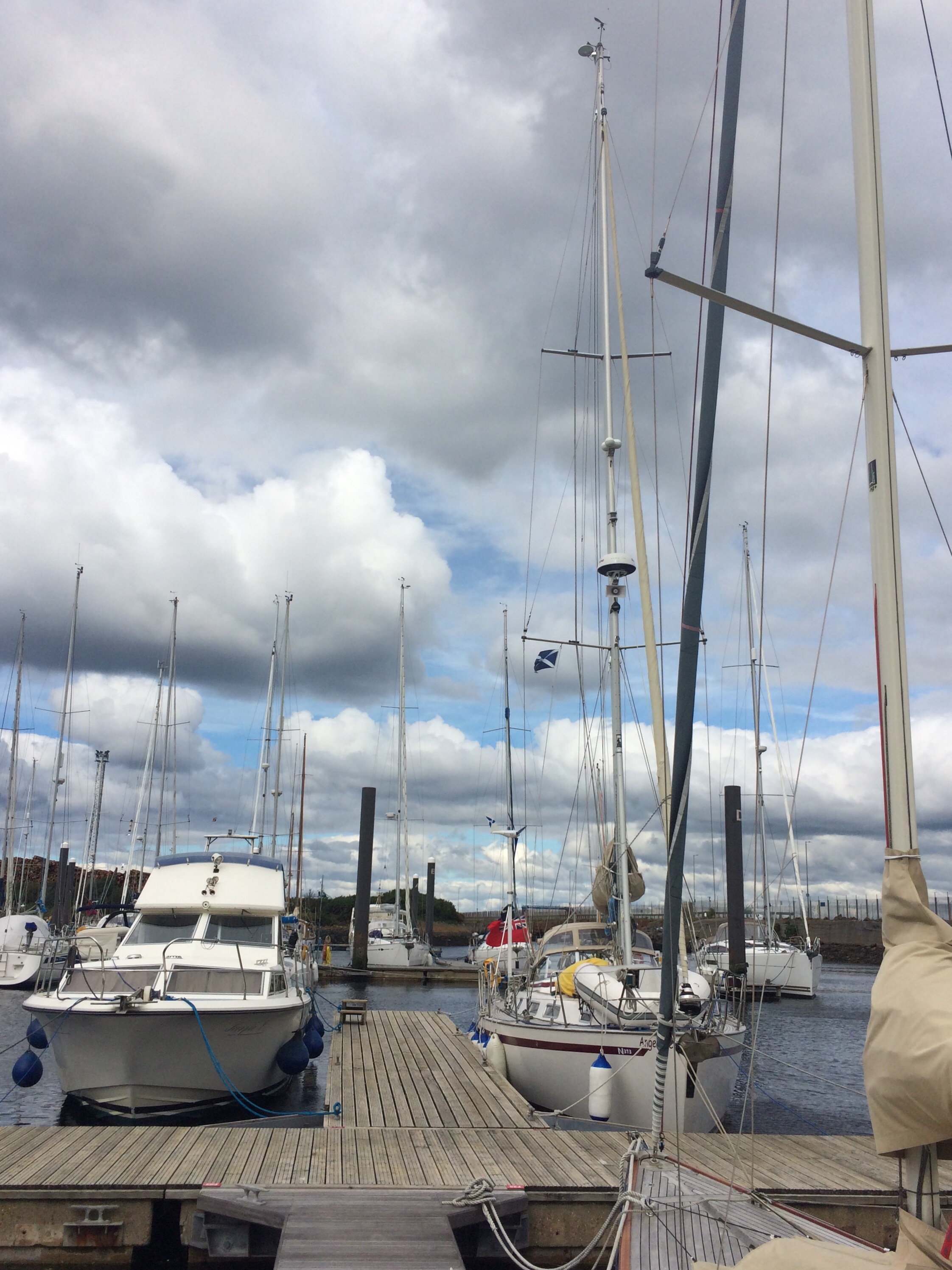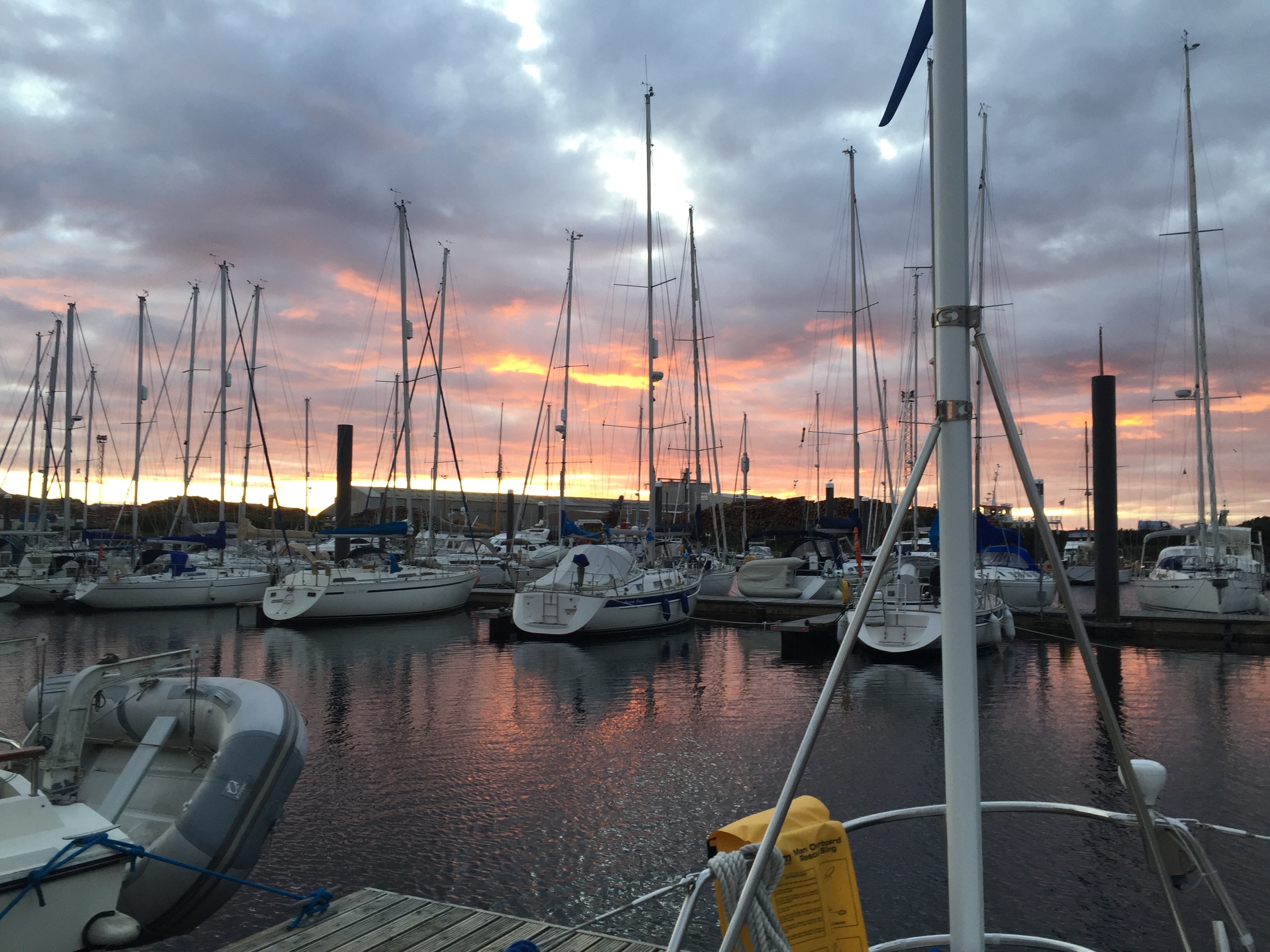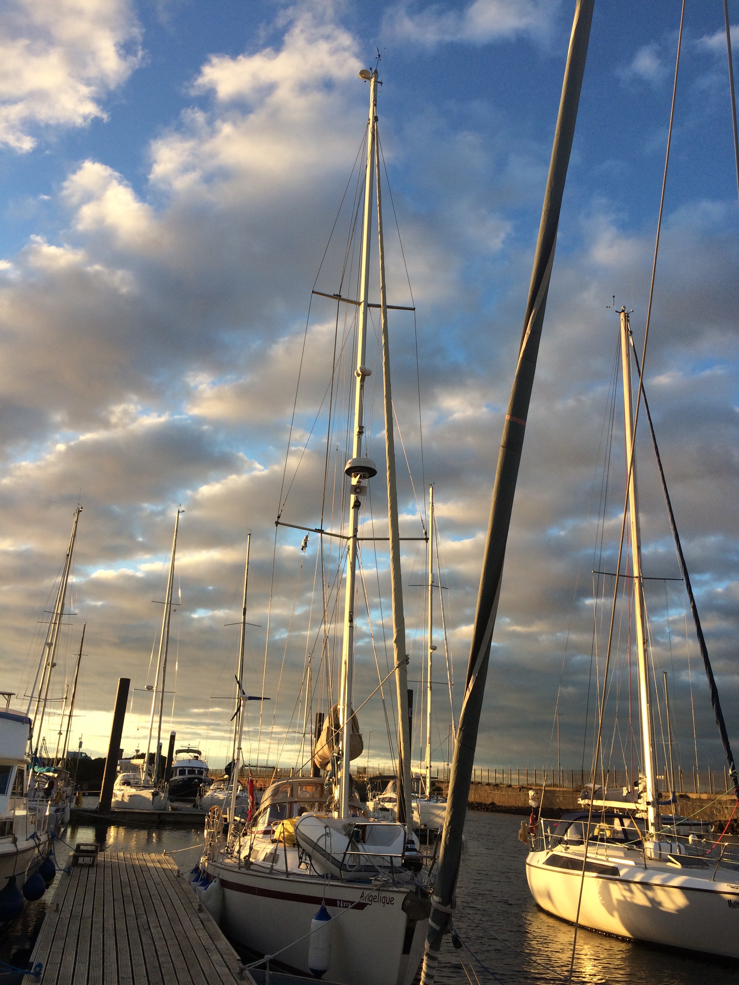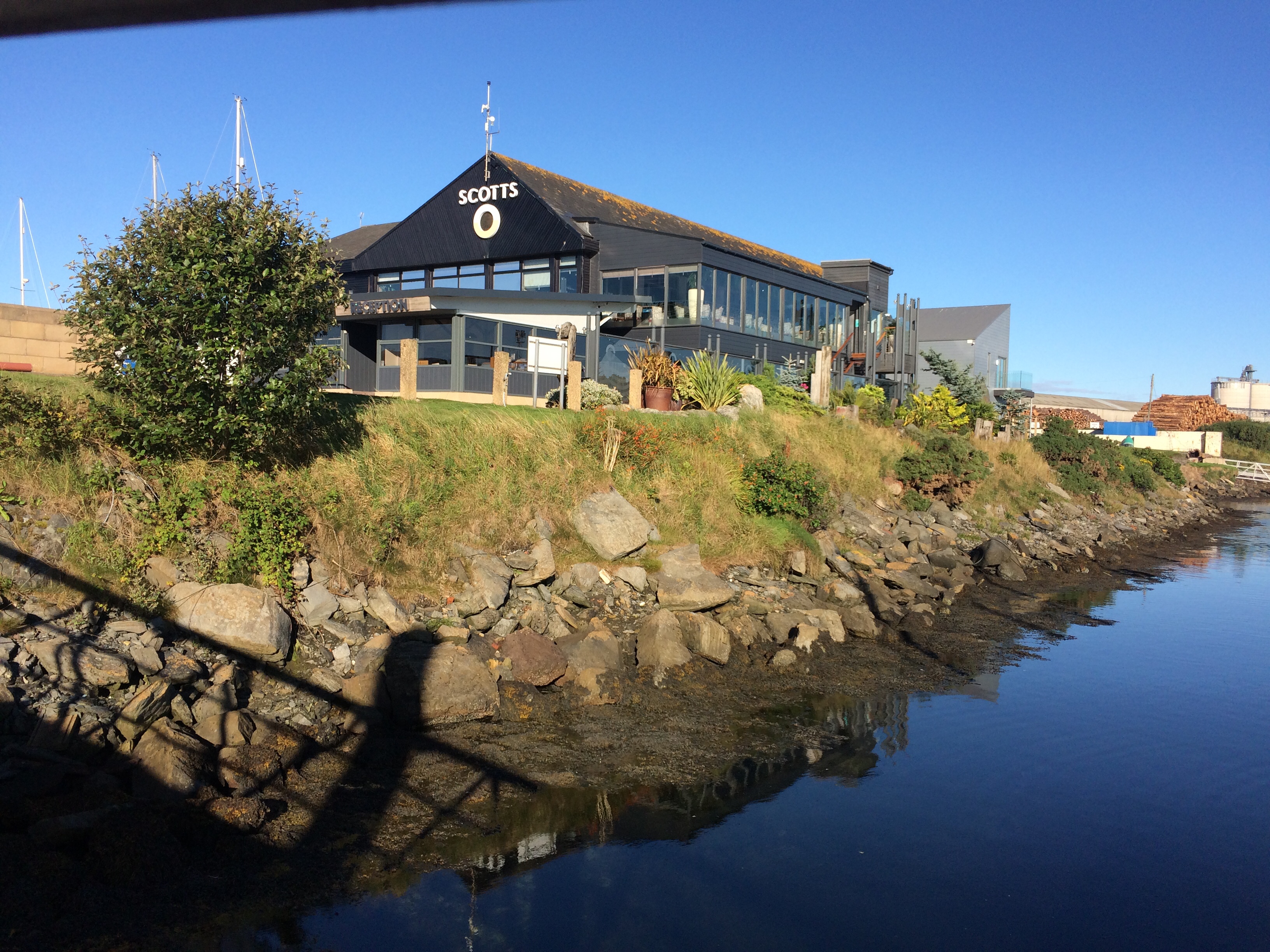 Neither of us slept. The wind started to come from a unpredicted direction…. right into the bay. The slight rocking we had noticed earlier ( when the cormorants were still perched happily on the buoys) deteriorated into a full blown 25 knot northeasterly. The forecasting for this evening had been variable depending on the source and the usually reliable met Office as well as the inshore forecast, had only predicted light winds. The boat although attached to a robust mooring was bucking up and down, burying her bow into the waves every few seconds. I would liken it to the worst airline turbulence you can imagine for 8 hours. We lay there trying to at least rest, feeling dreadful that we had subjected our poor boat to this. Eventually dawn broke and we could at last get up and get going. Getting off the mooring wasn’t much fun! The waves were strong and even clipped on with safety lines, didn’t feel very safe! Inside I was secretly thinking oh my goodness I hope J doesn’t want the mainsail up as I was very unshore I’d be able to keep the boat pointing in the right direction, let alone not wanting him going up to the mast in that sea. Fortunately he was of the same opinion and as luck we have it …the one saving grace of where we were, was that we could sail straight to Troon across the Clyde estuary, hopefully without tacking. We put out half the headsail ( this is easy as it’s just on a roller and can be completely controlled from the cockpit). Even with little sail out, we were still able to do 6 knots which meant we made good time and arrived in Troon about 3 hours later at 10 am. Troon is my final destination so as we arrived , I had mixed feelings of relief, exhaustion sadness and elation. Troon harbour is lovely and we spent a lovely afternoon sorting stuff out. I did washing and tumble drying whilst J went to Morrison’s. I also had a snooze! Lovely without any banging and crashing! We had a visitor too! Paul who lives nearby came to look us up , as he had known Angelique , and sailed on her since she was born! It was great to share stories of her past, and her present since we became the lucky owners. We also met an amazing young man who is bidding to become the youngest person to sail around the UK solo, at the age of 15. How brave is that! And I was pretty proud of my efforts! 😳. After all the chores, we finally sat down as the sun dipped in the sky, with some smoked salmon and a bottle of fizz, to celebrate the safe conclusion of a truly memorable 7 weeks, having sailed 1091 miles in our little boat. Once the sun had gone down and the colours of my last Scottish sunset for a while had faded away, we went up to enjoy a wonderful meal at Scott’s restaurant overlooking the marina and indeed right over the Clyde.