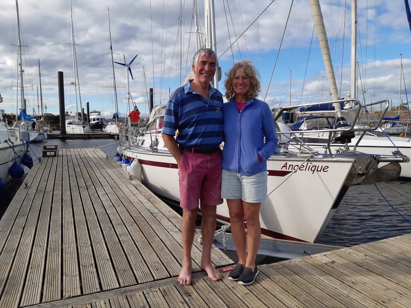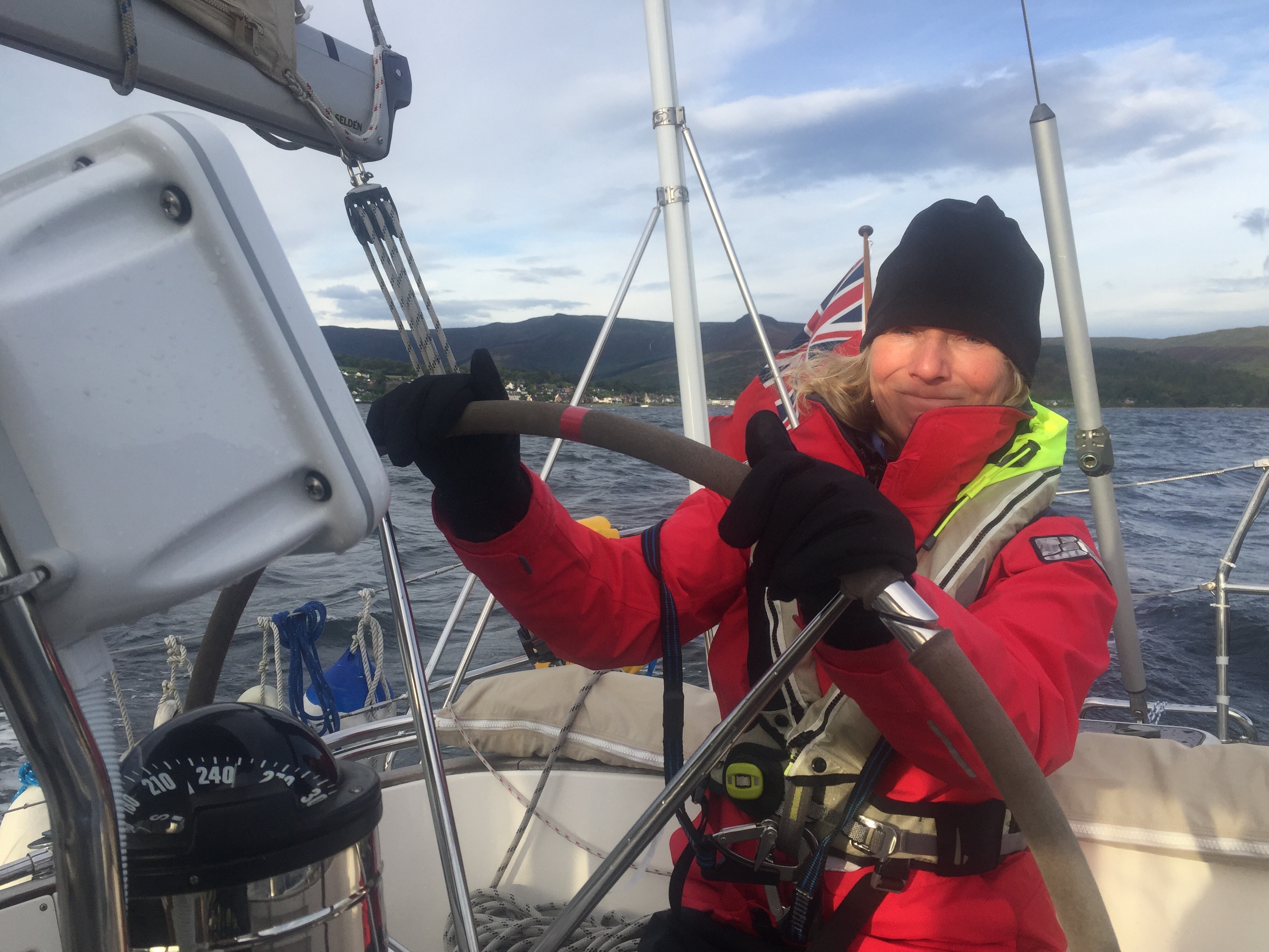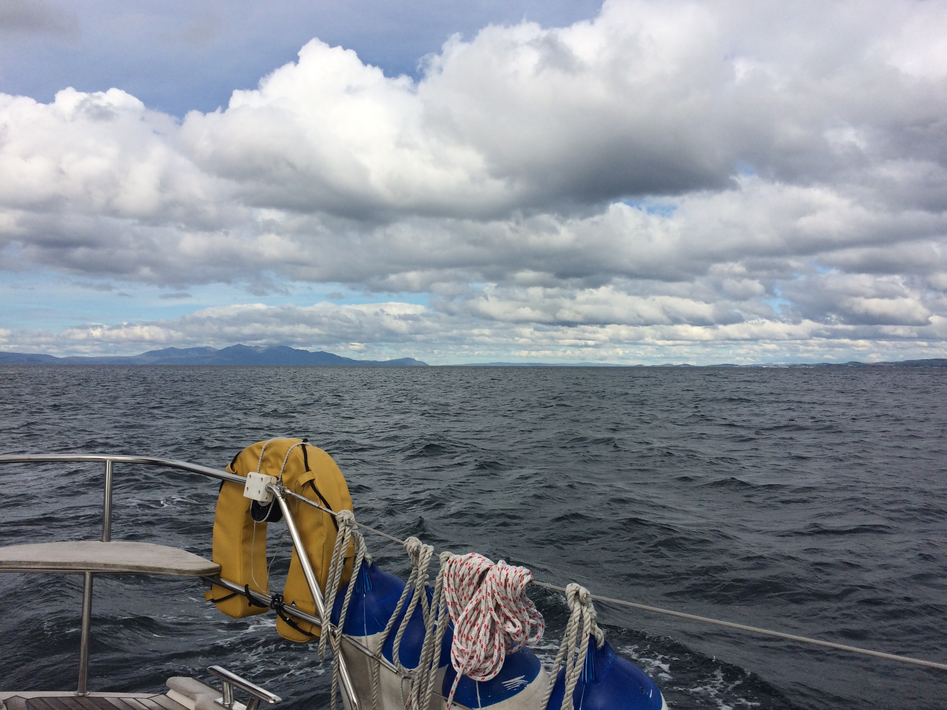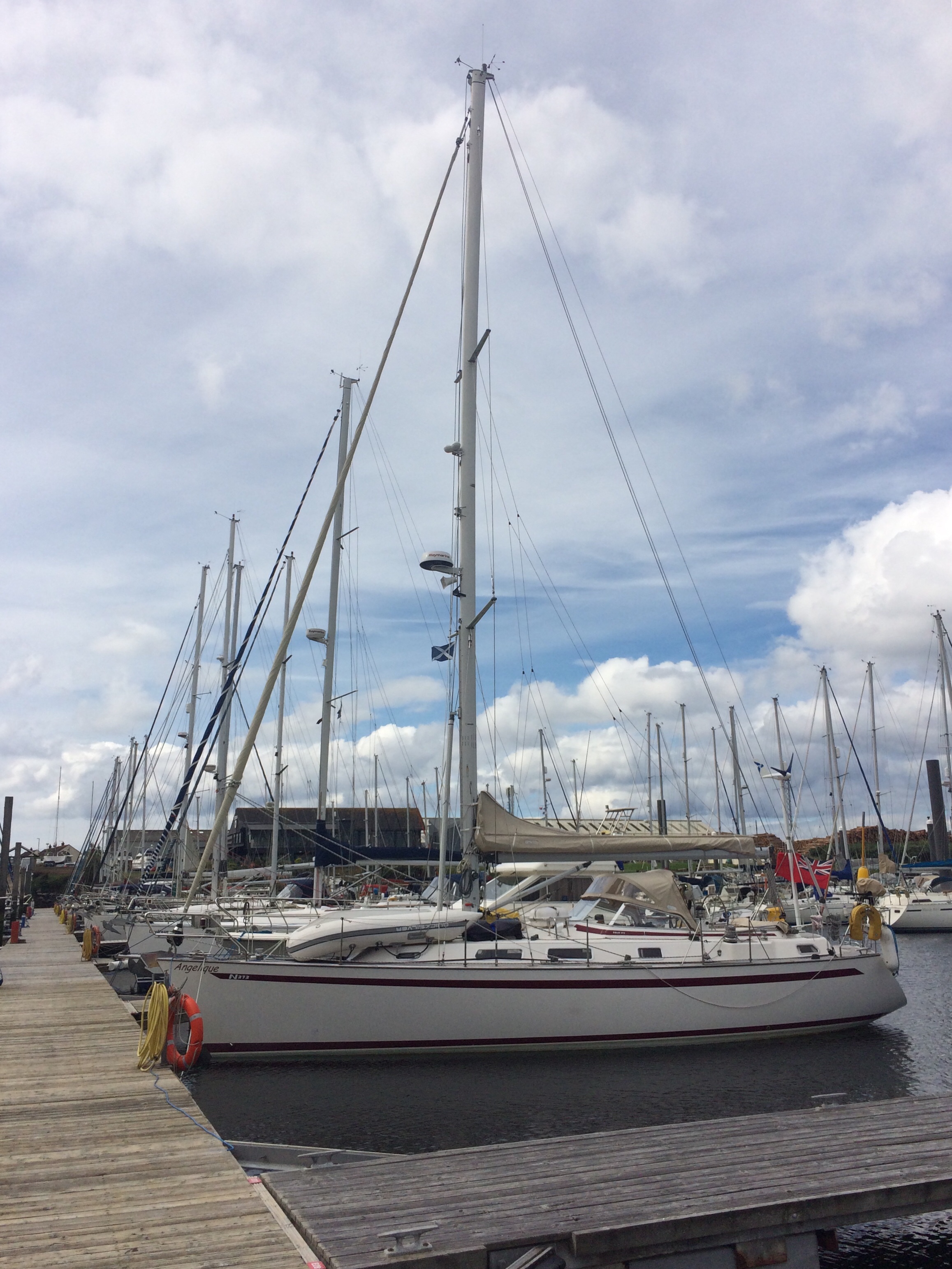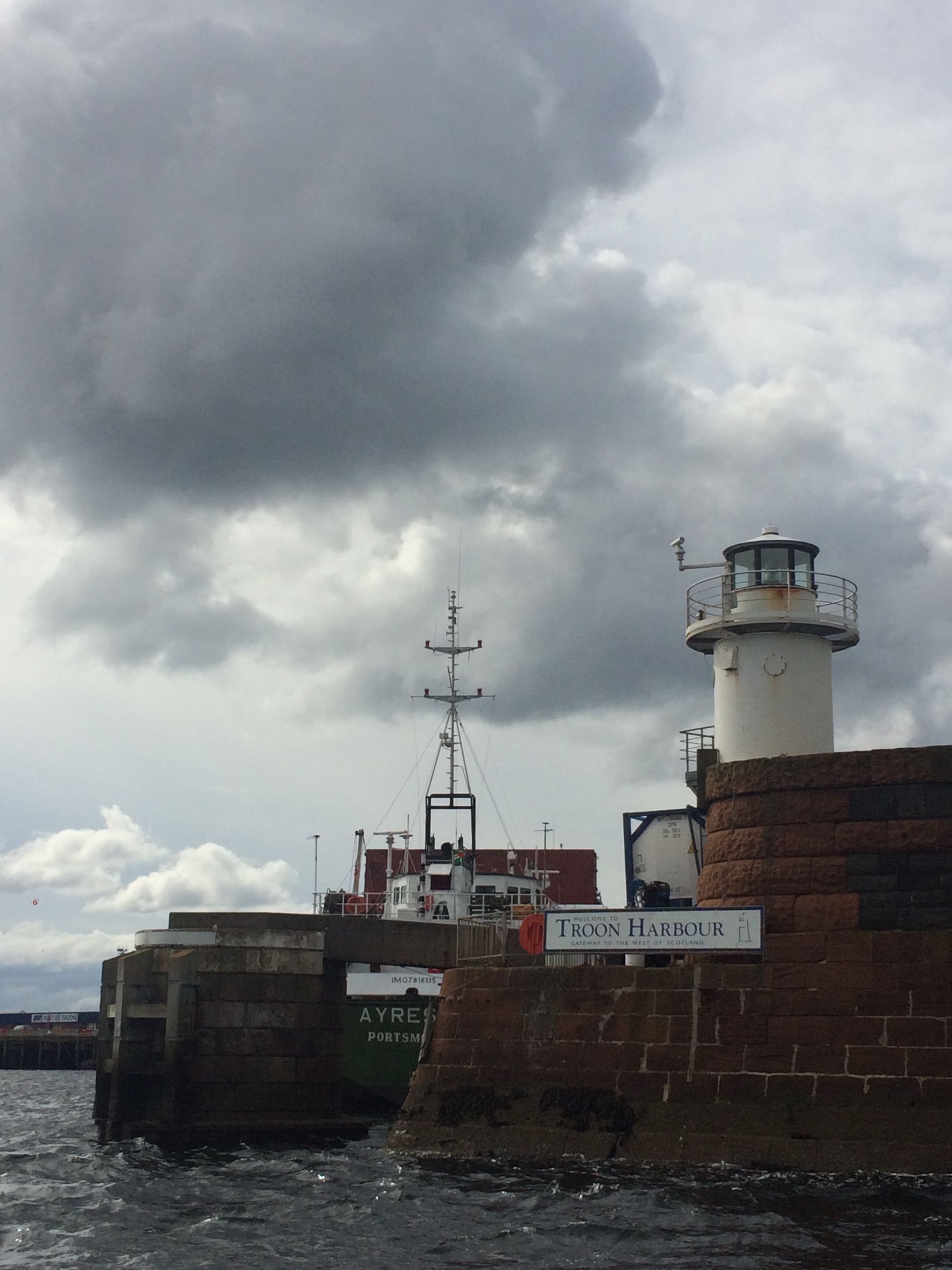 Neither of us slept. The wind started to come from a unpredicted direction…. right into the bay. The slight rocking we had noticed earlier ( when the cormorants were still perched happily on the buoys) deteriorated into a full blown 25 knot northeasterly. The forecasting for this evening had been variable depending on the source and the usually reliable met Office as well as the inshore forecast, had only predicted light winds. The boat although attached to a robust mooring was bucking up and down, burying her bow into the waves every few seconds. I would liken it to the worst airline turbulence you can imagine for 8 hours. We lay there trying to at least rest, feeling dreadful that we had subjected our poor boat to this. Eventually dawn broke and we could at last get up and get going. Getting off the mooring wasn’t much fun! The waves were strong and even clipped on with safety lines, didn’t feel very safe! Inside I was secretly thinking oh my goodness I hope J doesn’t want the mainsail up as I was very unshore I’d be able to keep the boat pointing in the right direction, let alone not wanting him going up to the mast in that sea. Fortunately he was of the same opinion and as luck we have it …the one saving grace of where we were, was that we could sail straight to Troon across the Clyde estuary, hopefully without tacking. We put out half the headsail ( this is easy as it’s just on a roller and can be completely controlled from the cockpit). Even with little sail out, we were still able to do 6 knots which meant we made good time and arrived in Troon about 3 hours later at 10 am. Troon is my final destination so as we arrived , I had mixed feelings of relief, exhaustion sadness and elation. Troon harbour is lovely and we spent a lovely afternoon sorting stuff out. I did washing and tumble drying whilst J went to Morrison’s. I also had a snooze! Lovely without any banging and crashing! We had a visitor too! Paul who lives nearby came to look us up , as he had known Angelique , and sailed on her since she was born! It was great to share stories of her past, and her present since we became the lucky owners. We also met an amazing young man who is bidding to become the youngest person to sail around the UK solo, at the age of 15. How brave is that! And I was pretty proud of my efforts! 😳. After all the chores, we finally sat down as the sun dipped in the sky, with some smoked salmon and a bottle of fizz, to celebrate the safe conclusion of a truly memorable 7 weeks, having sailed 1091 miles in our little boat. Once the sun had gone down and the colours of my last Scottish sunset for a while had faded away, we went up to enjoy a wonderful meal at Scott’s restaurant overlooking the marina and indeed right over the Clyde.