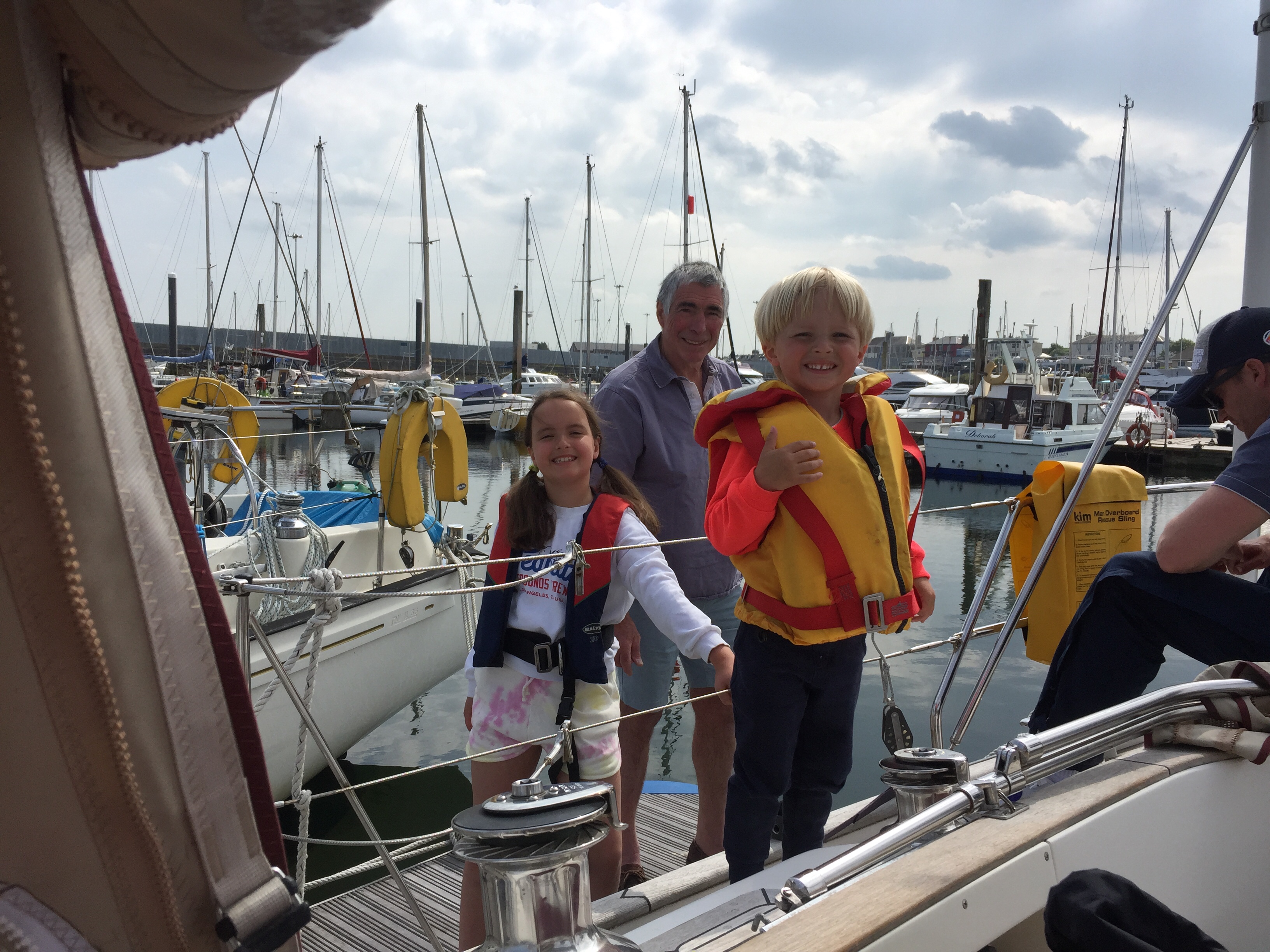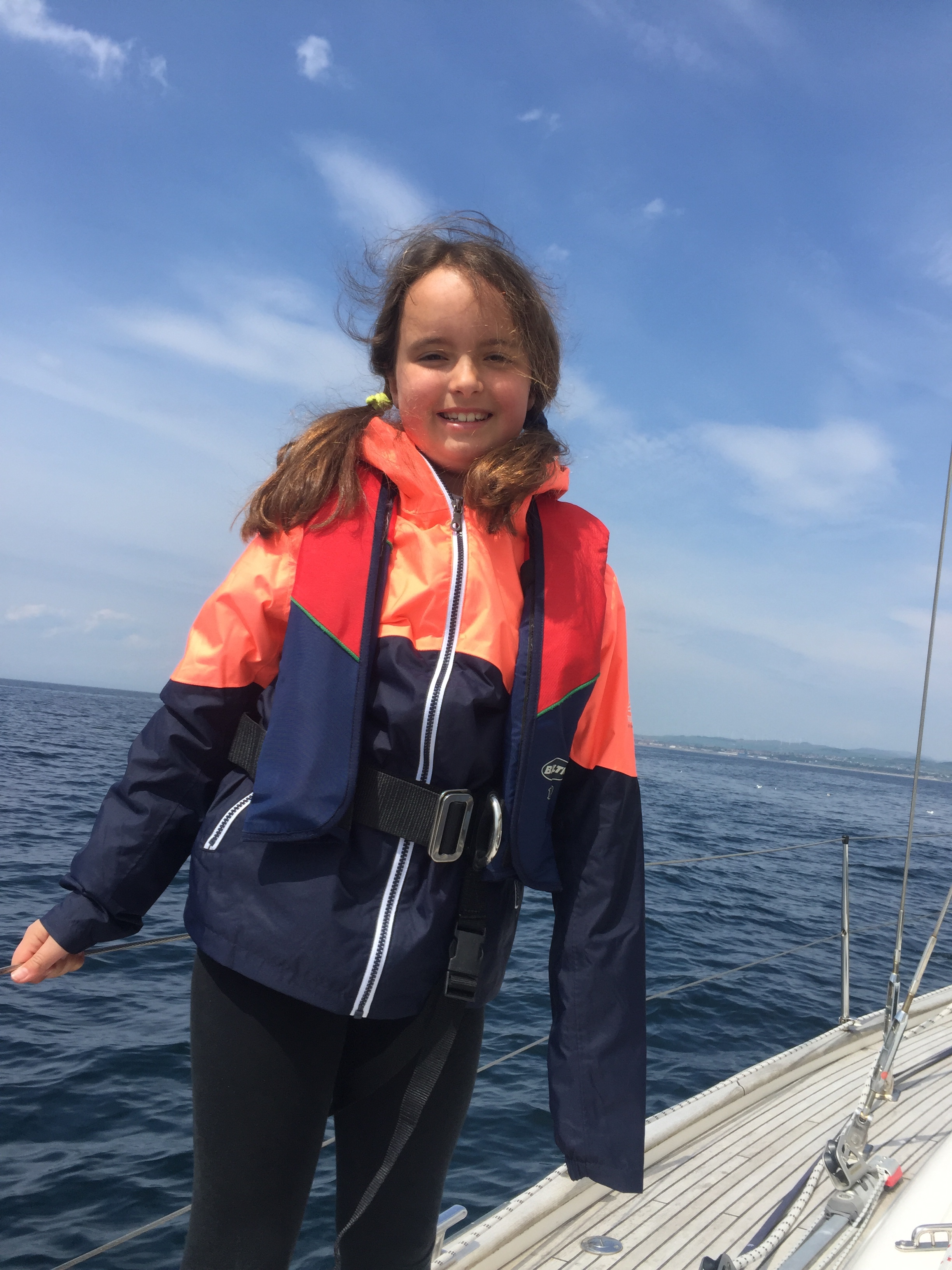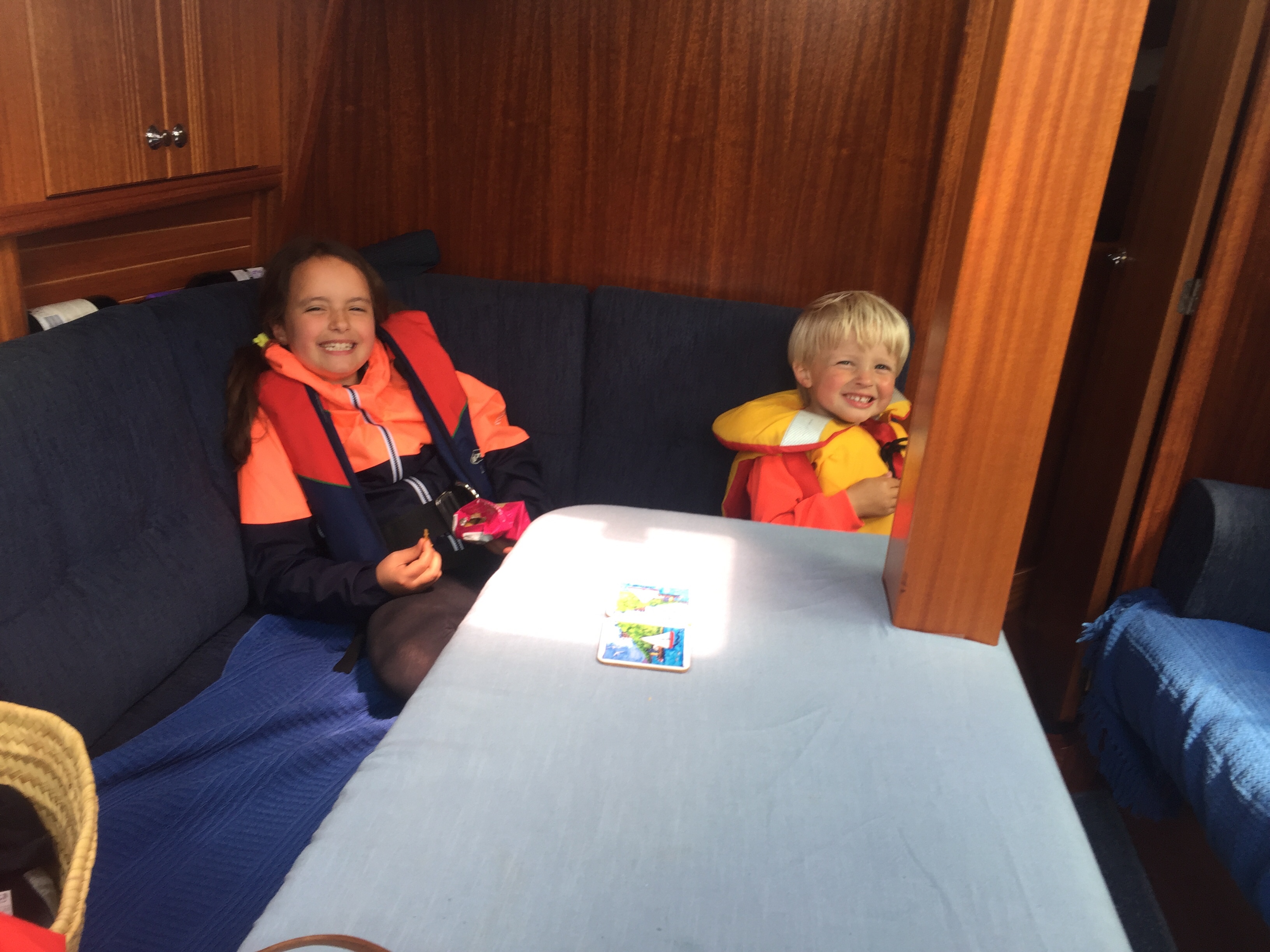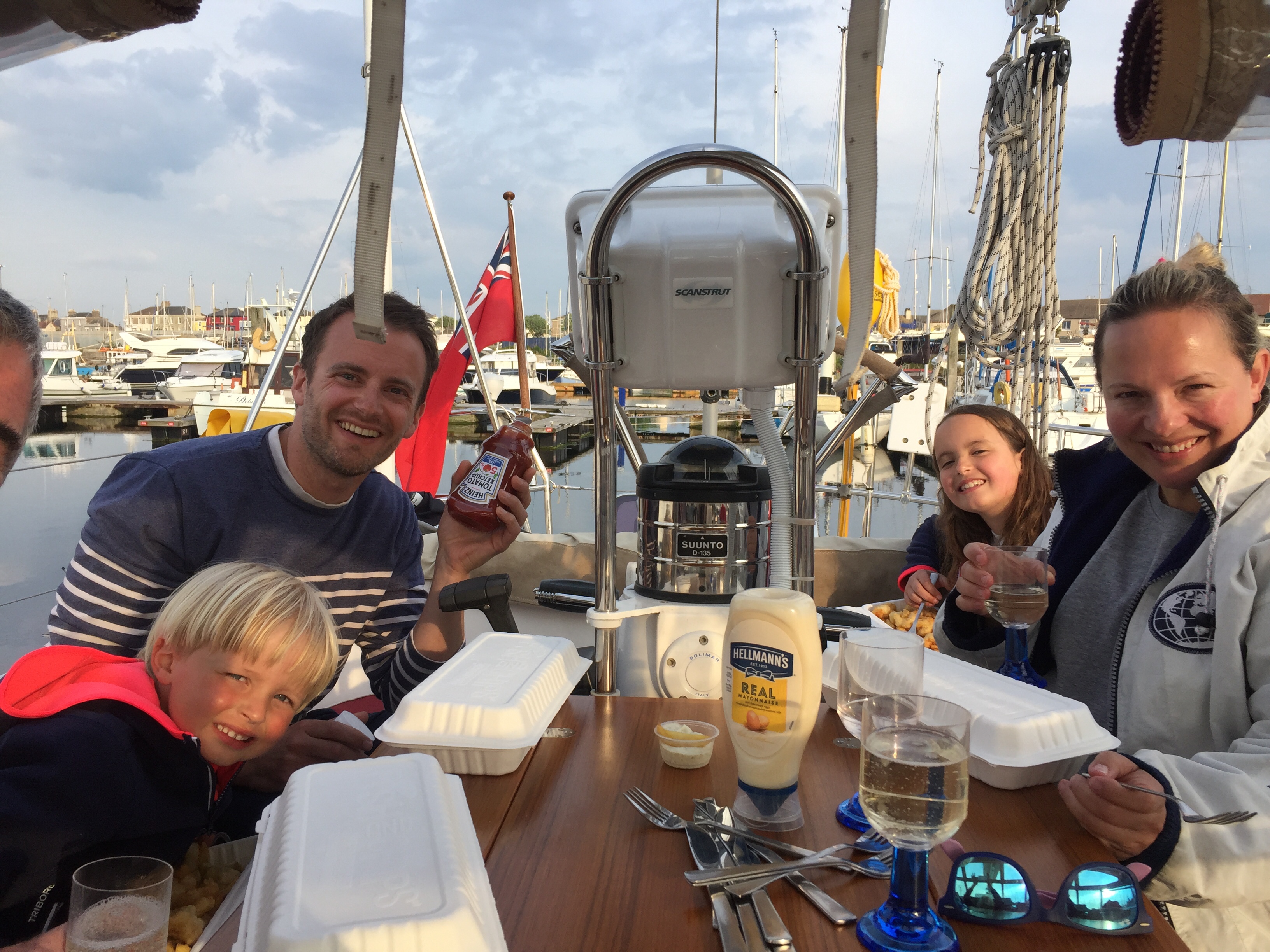 First night spent in the forepeak cabin was fabulous! I always sleep well on the boat on the comfy comfy memory foam mattress! The electrician arrived as promised at 730 and sweated away trying to solve all our issues for a couple of hours. Sadly he couldn’t give Trixi (our windmill) a new switch…… something to do with her Bluetooth connection????? Which means she is permanently ON ! That’ll be very noisy whenever we have the next storm! I then got up and went to the supermarket again and bought sausage rolls and Cornish pasties for lunch . On my return J tells me his laptop won’t switch on…. not a flicker and trying old tricks to fix haven’t worked 😩. The family joined us after their breakfast and we set sail. Everyone very excited…. at least for a while! We sailed out into the bay in light winds and sunshine and the kids all had a go at steering. Had lunch bobbin around as we couldn’t get the anchor remote to work…. but eventually as ever J got it going. We got the dinghy and motor off and Jenny Alby and Isla enjoyed whizzing around on s very calm sea! Returned quite late to marina and Jenny and the children went for a swim on the beach while we put Angelique to bed. Rob bought wonderful fish and chips which we are on deck in the evening sunshine ☀️ lovely! Thank you!