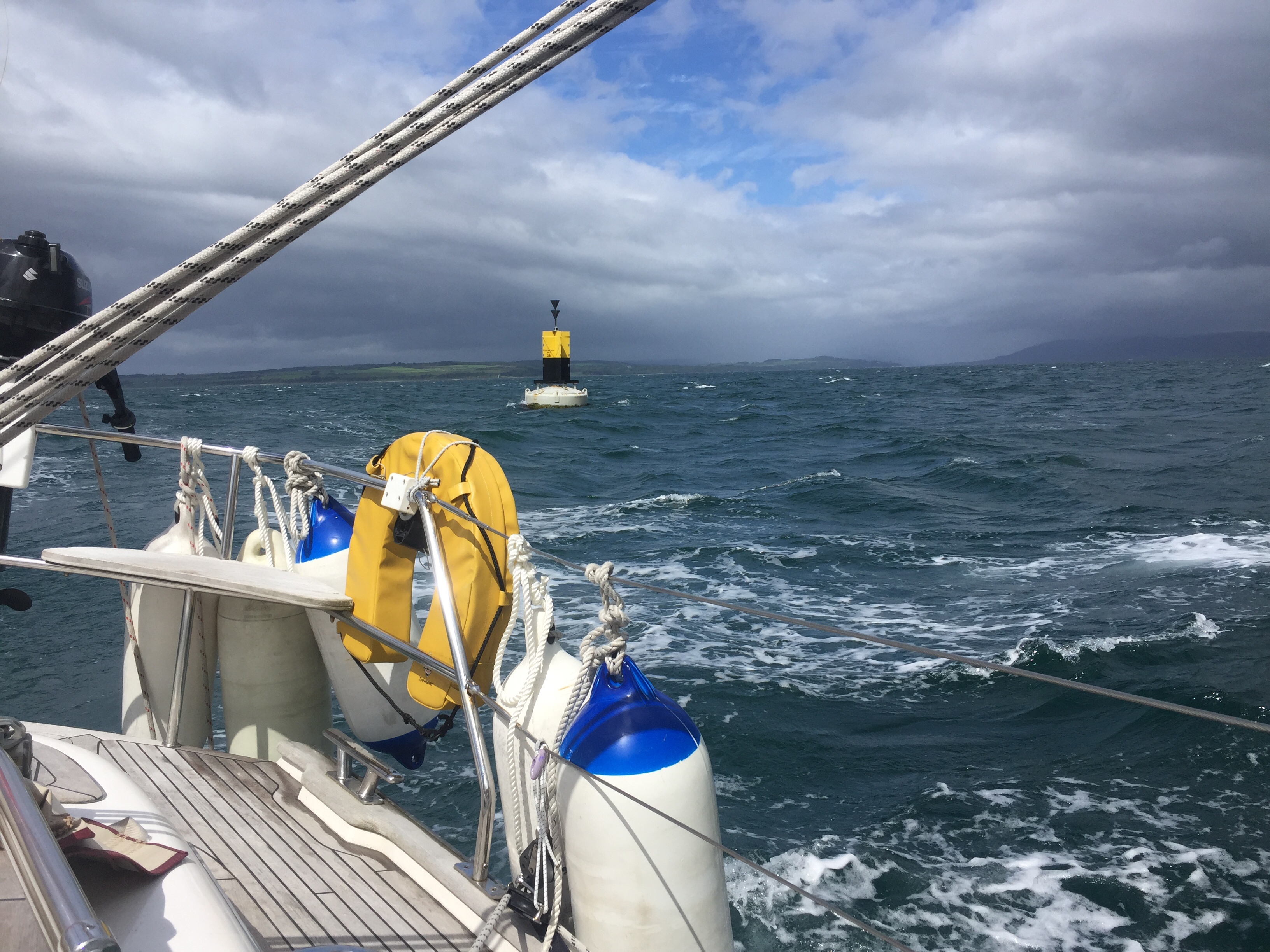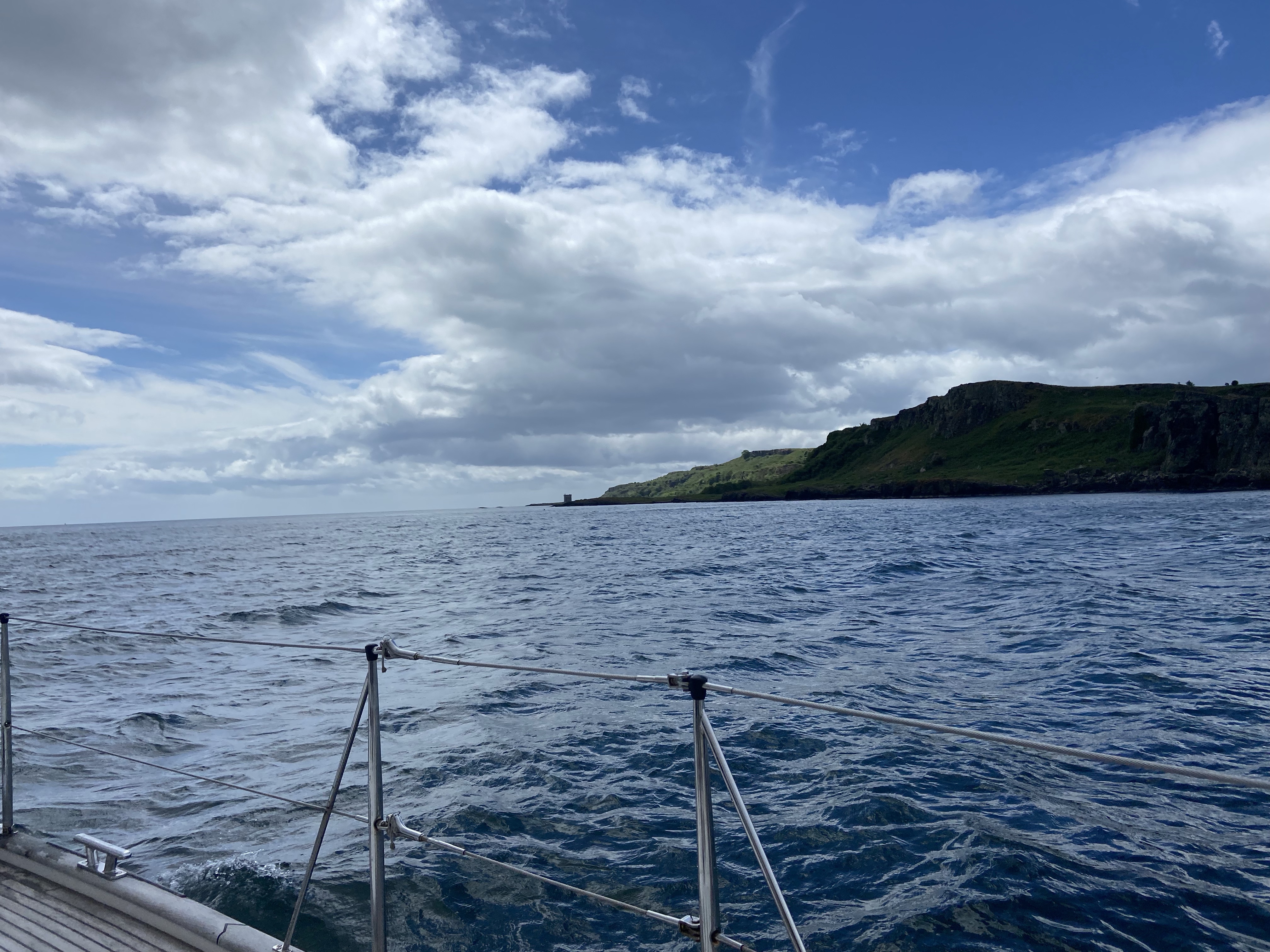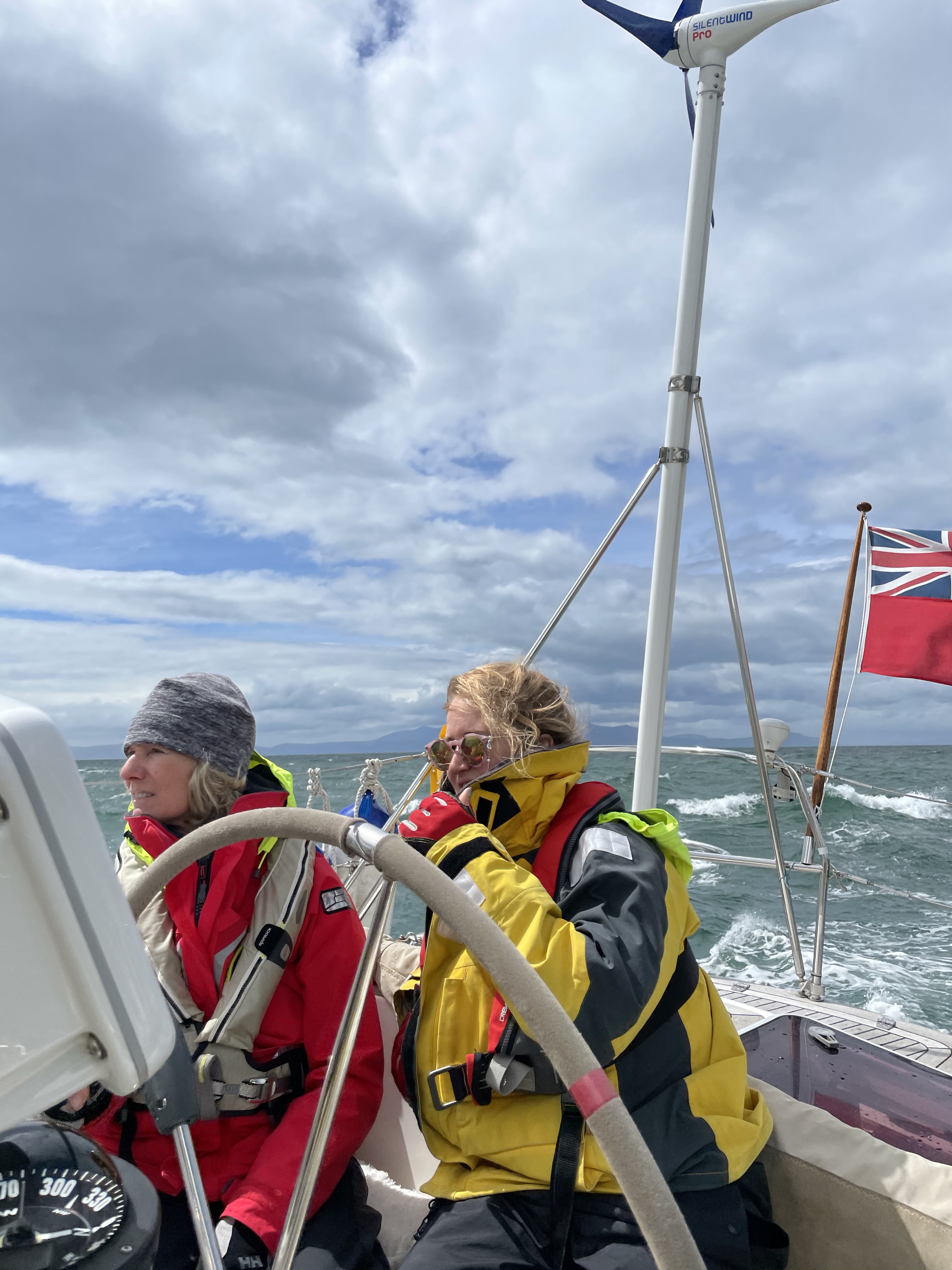 Not a particularly comfortable night . As were were near the outer limit of the marina, we weren’t very protected from the very strong gusty wind that had sprung up overnight. Getting off the berth was potentially a bit f s nightmare as we had another boat outside us which we had to avoid getting blown onto. With carefully worked out slip lines and help from both neighbours , The final manoeuvre went surprisingly well!!! Once out in the bay, it all seemed quite peaceful. Typical! We had a cracking sail home as the wind was increasingly from the west so we were going quickly and both A and W did great helming in tough waves with wind behind. We came down the firth of Clyde between great Cumbrae and little Cumbrae and then East to Troon. We got back around 4 ish and enjoyed going to Morrison’s and buying nice stuff for tea! Once all the jobs were done we enjoyed the evening sitting in the cockpit having bit of a celebration bubbly with nibbles! After salmon spuds and peas we played perudo and J won!!!