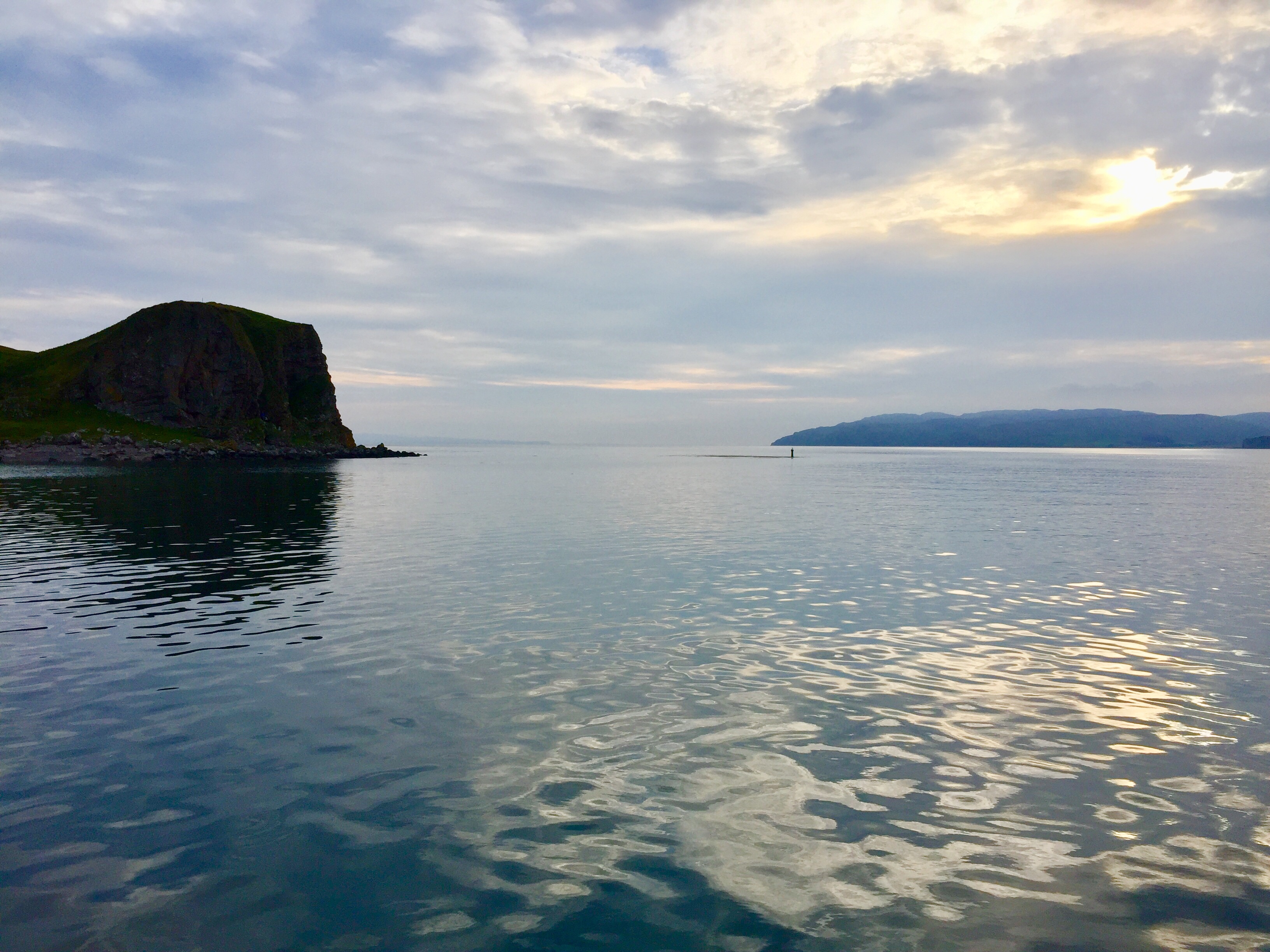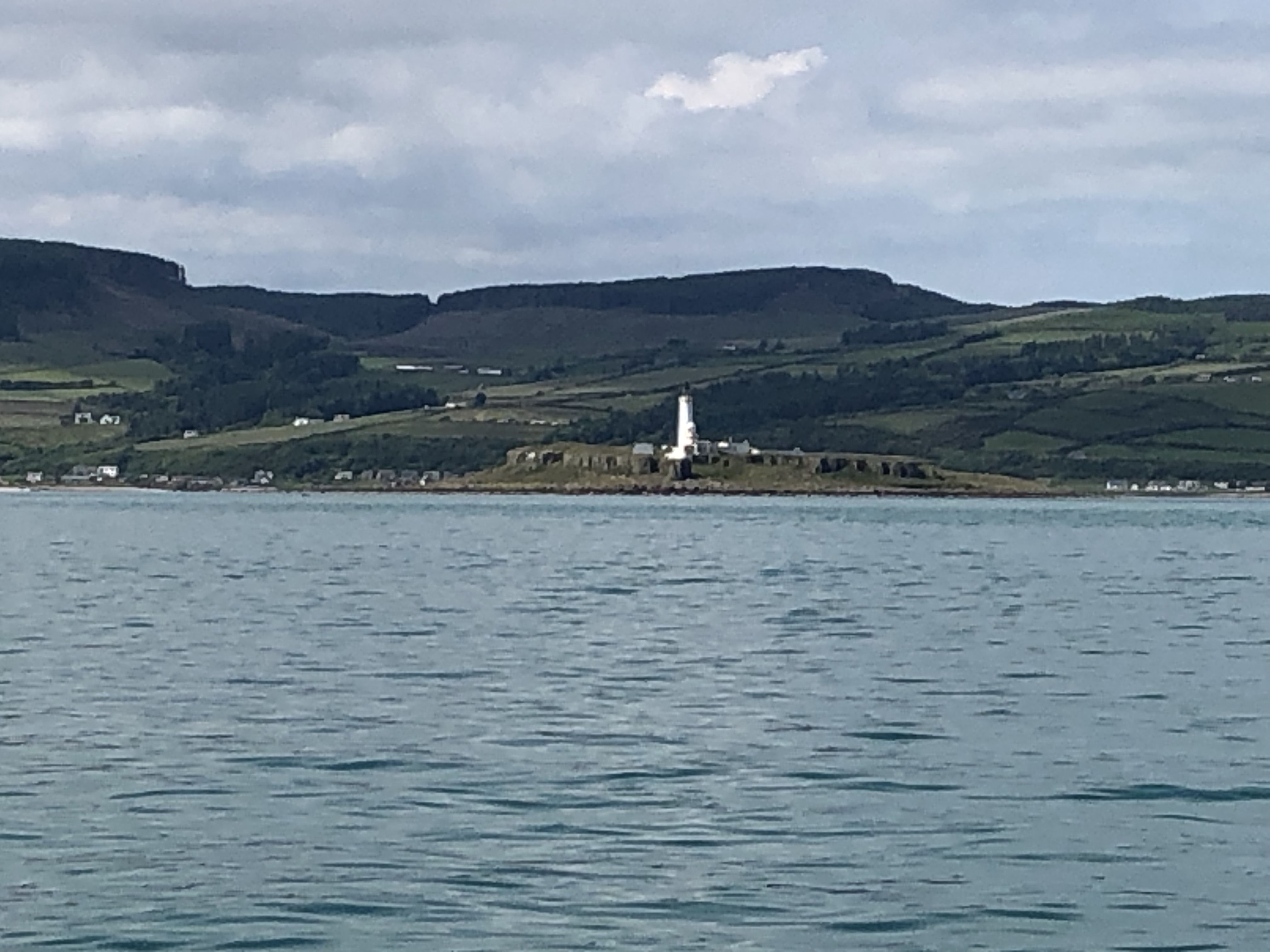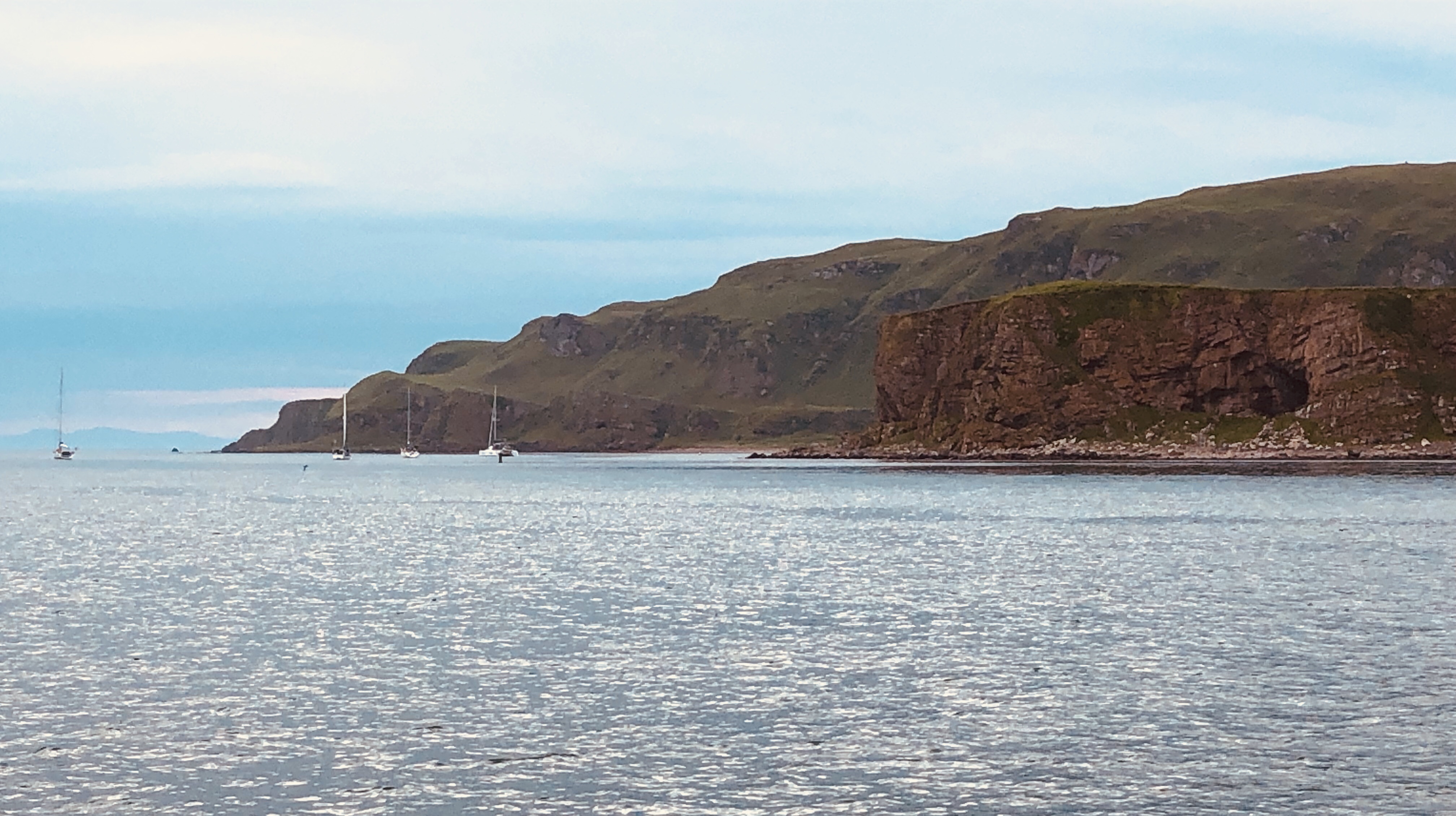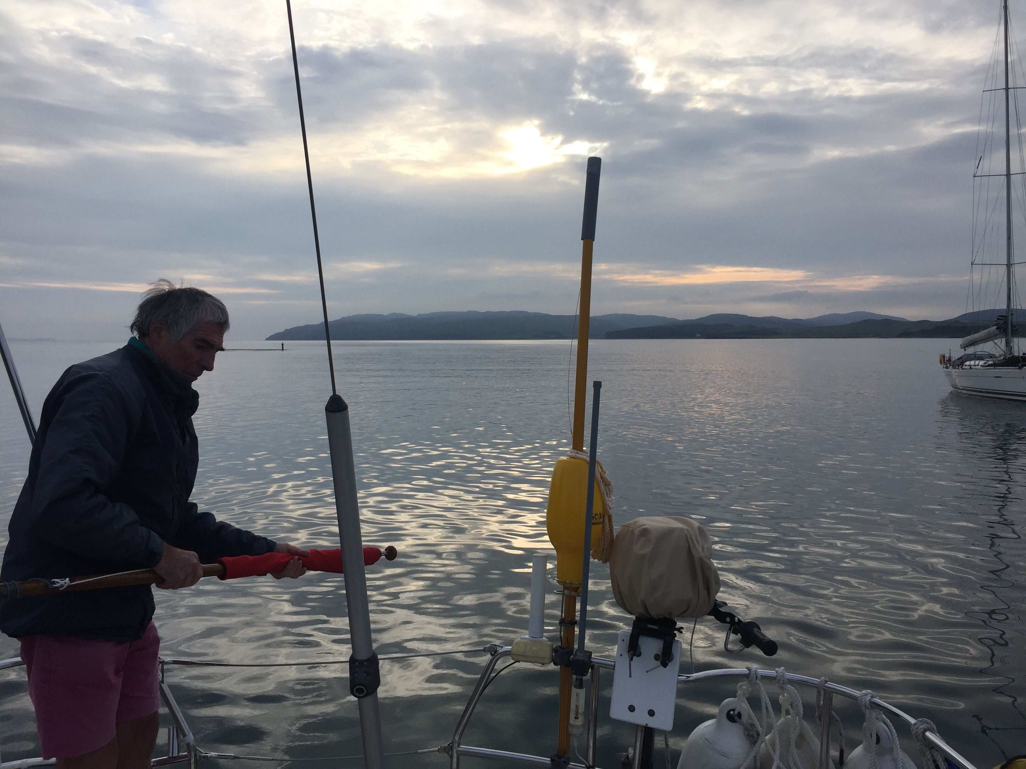 Today was thankfully good weather for going round the Mull… or at least the first leg. Favourable conditions meant we could stop overnight at Sanda, the only stopover recommended on the way. Before leaving we needed to fill up with fuel . Unfortunately In my enthusiasm ( panic) to tie up the lines on the fuel pontoon I managed to trip on one of the ropes and went a complete pearler, bruising my left hand and bruising & grazing both my knees. Fortunately I was wearing my gloves, thermals and trousers otherwise it could have been more disastrous! Once recovered we set off into a sunshiny day. We hadn’t gone more than 20 minutes… Julian offered a hot drink and …. the gaz has run out☹️! How annoying as we could have changed it before leaving and then not have to worry about finding camping gas in remote places! The sailing and the weather was beautiful. Long tacks southward with 10 knots of breeze. Eventually the breeze ran out and we had to motor . We could see a ship in the distance which didn’t appear to be moving and turned out to be our destination…. Sanda island! As we got nearer it was approaching 7 pm we started to see more and more sea birds on the syrupy sea. Islands like Sanda…., stuck out in the middle of the sea are always big bird colonies. There were puffins, guillemots, gannets and all sorts of seagull! Seals popped up to say hello like little periscopes. We anchored in amongst 4 other boats obviously waiting for the tide the next morning too. The Mull is one of those places you need to go with the tide … We sat in the cockpit and had a lovely evening. Pasties and salad for supper and watched the wild world we were in. We had to be up at 0630 in order to catch the tide so it wasn’t a late night.