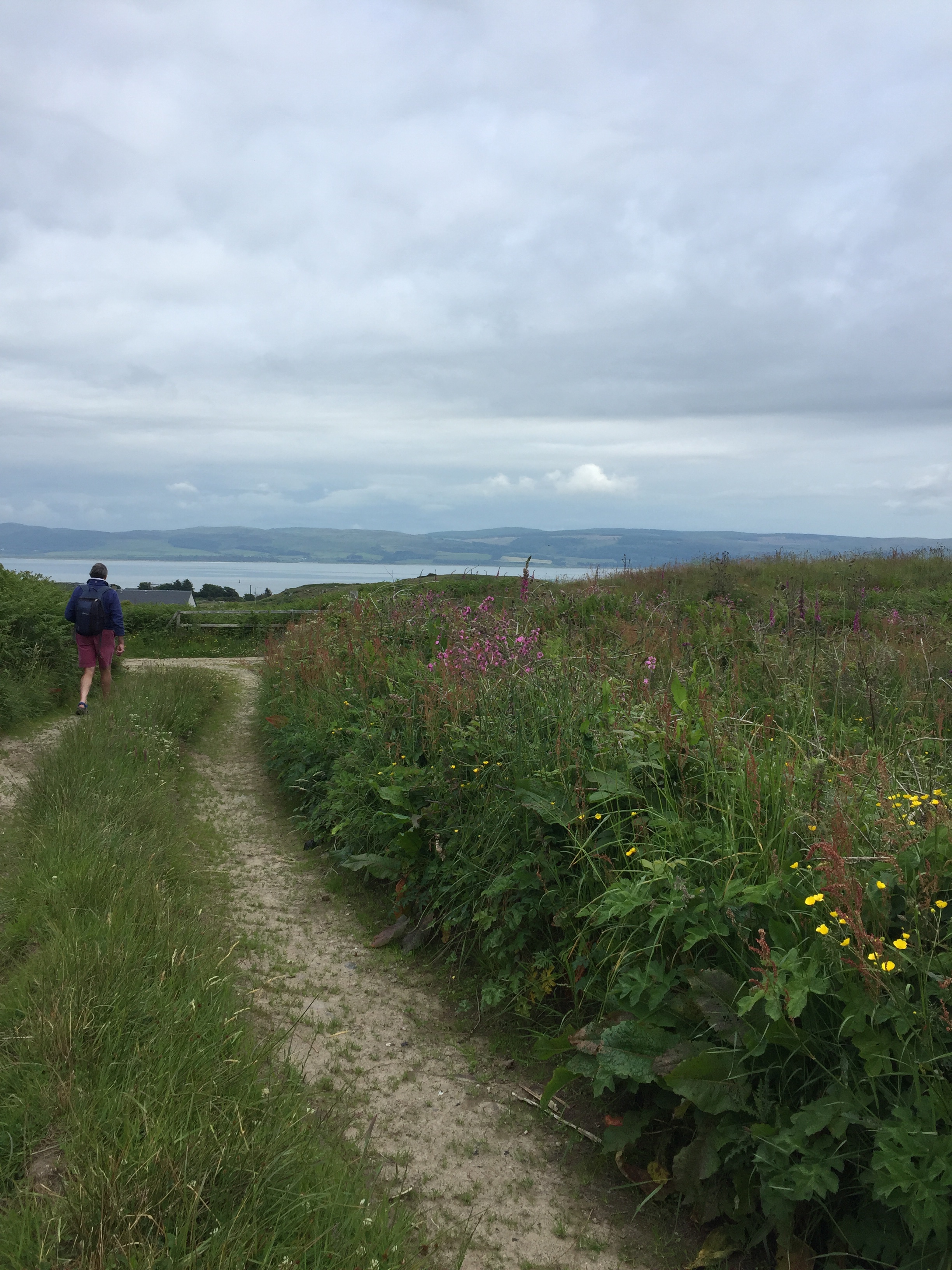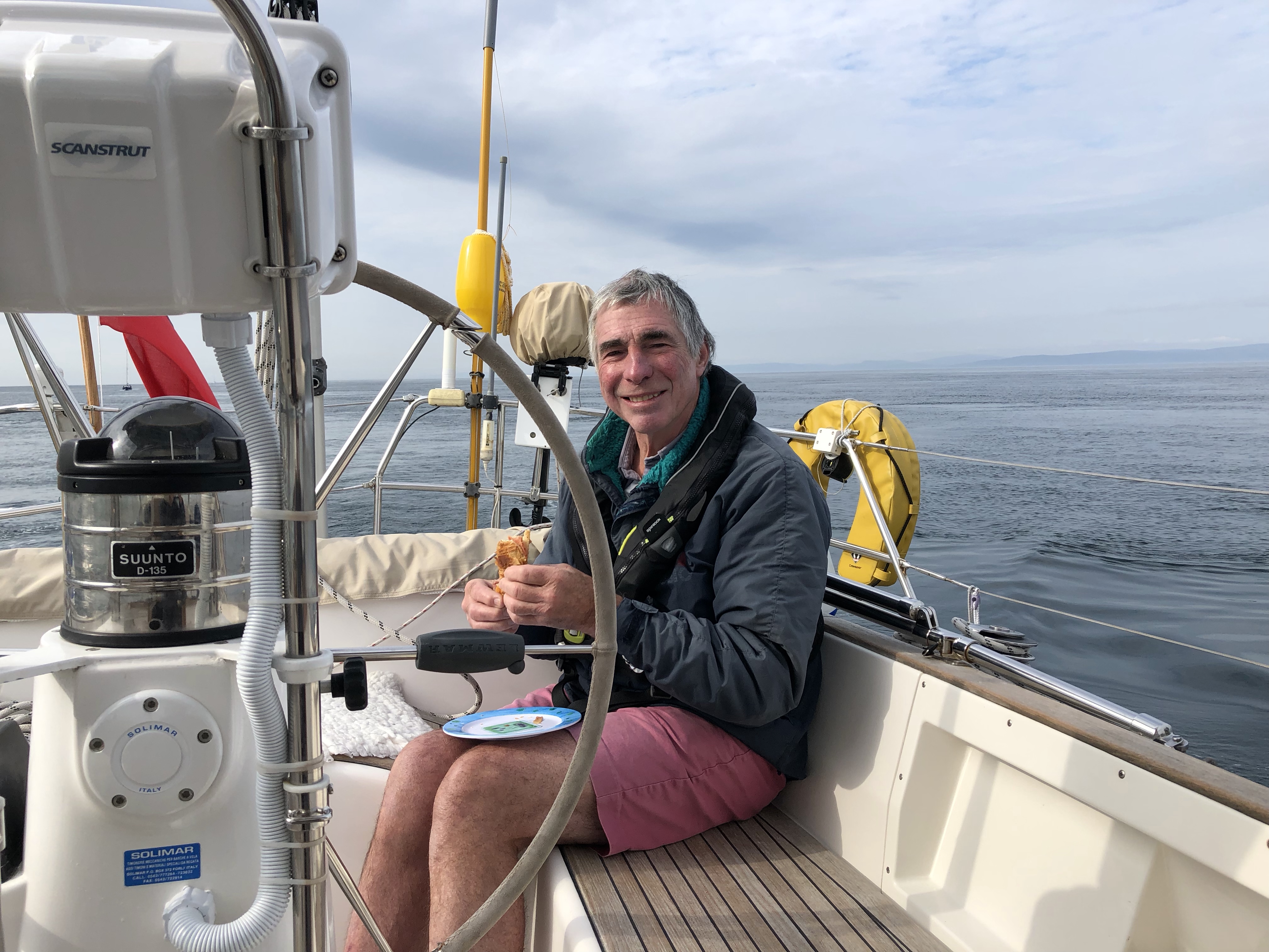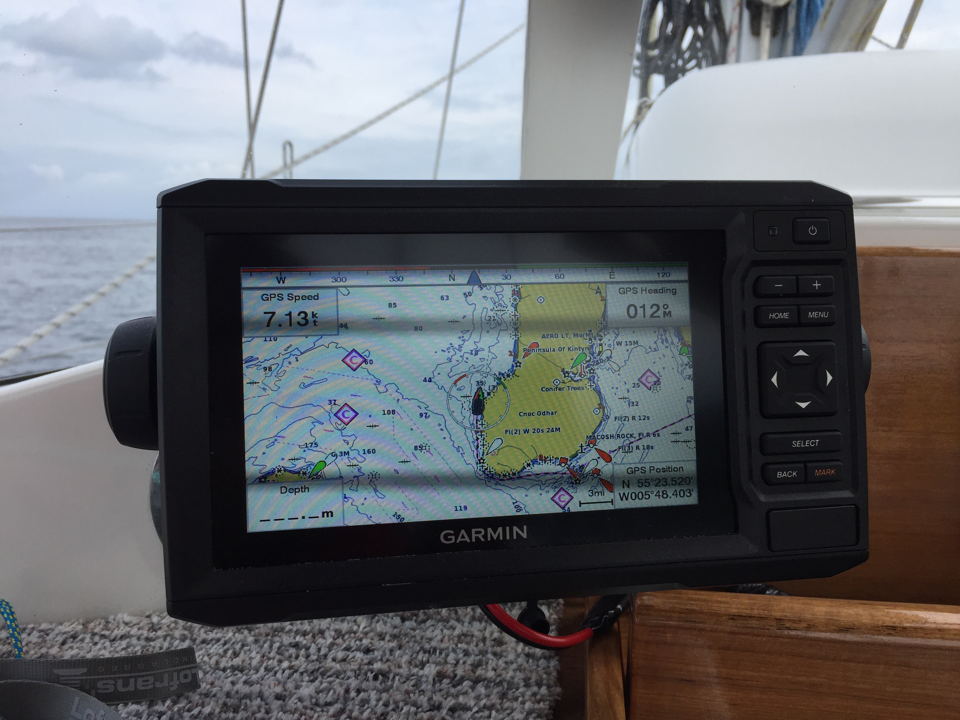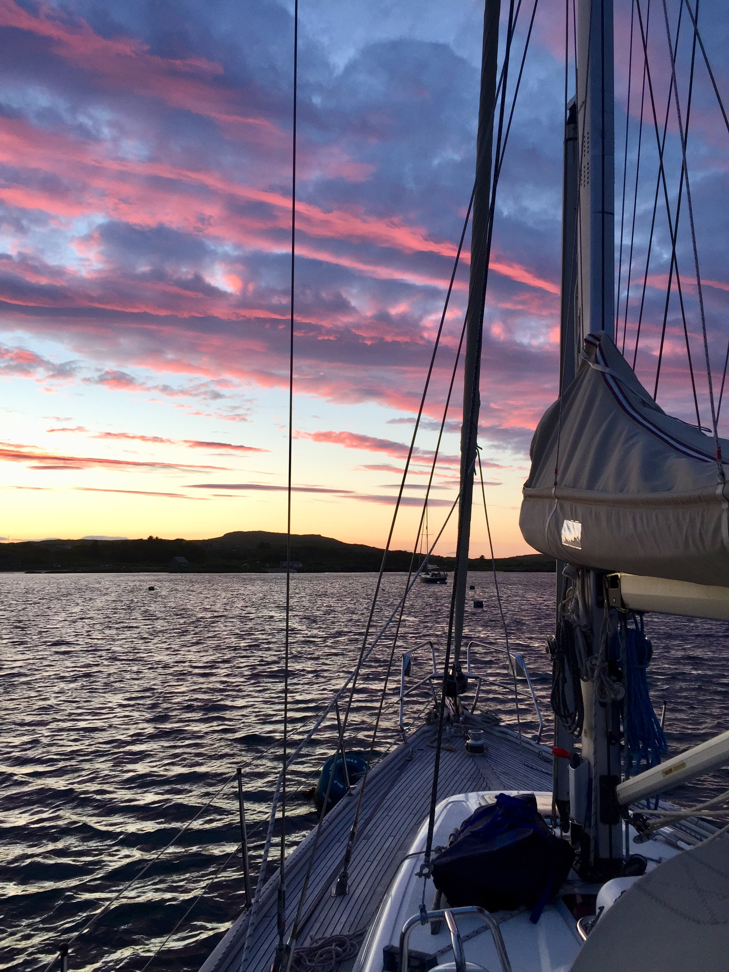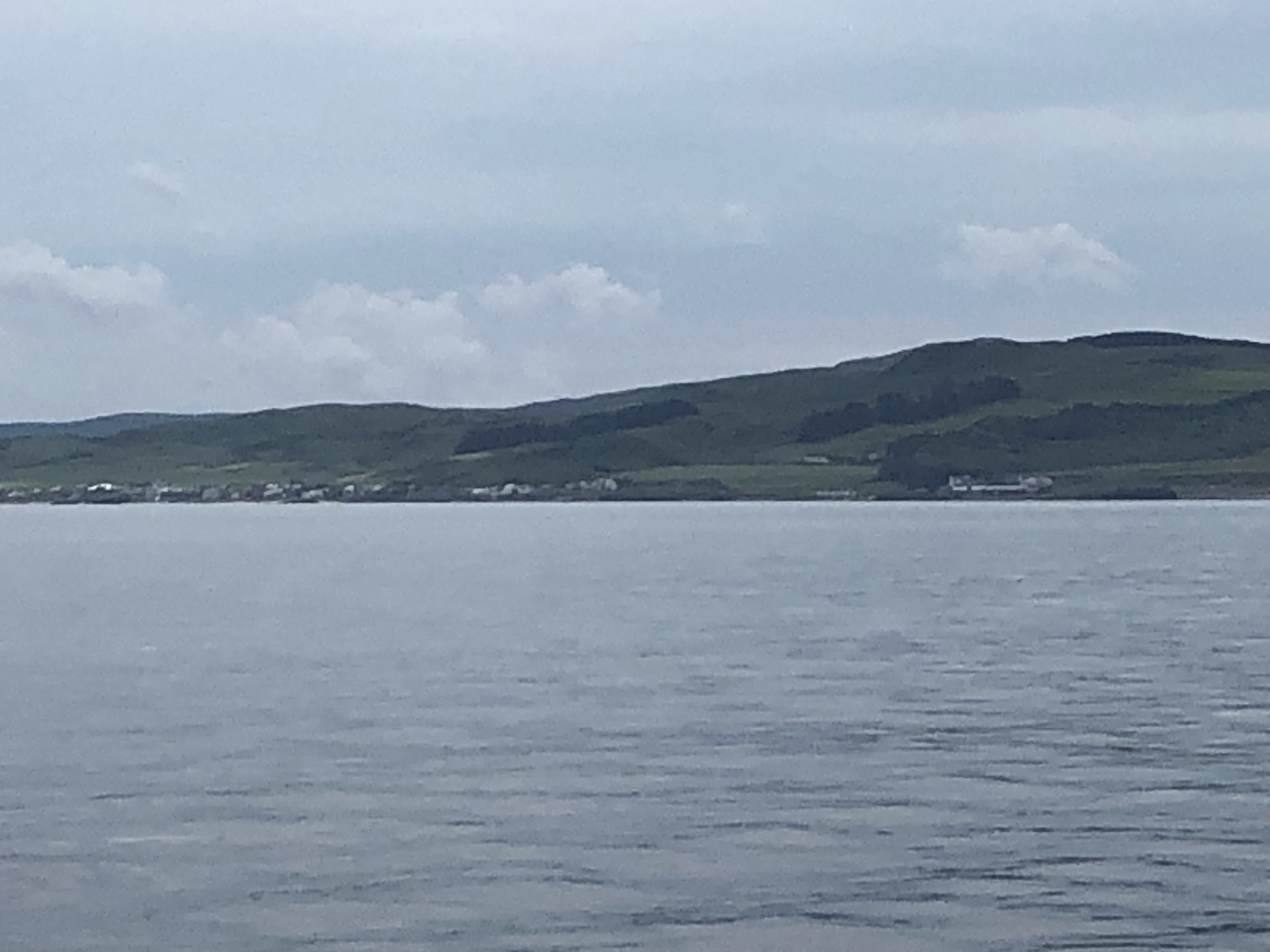 What a peaceful night. Waking to quietness apart from sound of seabirds. We had been expecting the anchorage to be “ subject to swell” but we certainly didn’t notice any. we were up st 0630 to catch the tide which started in the right direction st about 0730. We put the main up but there wasn’t much wind and what there was , was from behind us so we motored out into the hazy morning along with all of the other boats bar one going in the same direction. Because of the lack of wind the water was flat calm but there was still a very slight swell. We headed across to the shore of the Mull to be in the strongest tidal stream. At one point we had an extra 4 knots ( boat speed 9 knots) of tide helping us along so our total distance was actually more than the log would have recognised. Happy Father’s Day messages were received 🤗! . I cooked bacon and egg croissants for breakfast… whilst going round a fairly swirly roly bit at the corner! Now I definitely wouldn’t have been able to do that years ago. We did have a bit of wind as we approached gigha so sailed the last bit. We arrived about 2 ish and picked up the trot buoy on the mooring. Then fiddled around with the yellow mooring tool and lines and strops till we were secure. Quite an entertainment watching other boats come in during the afternoon and seeing the various ways they sorted out the less than easy moorings. Some just gave up and went and anchored …… one even right in the path of the ferry! 😳