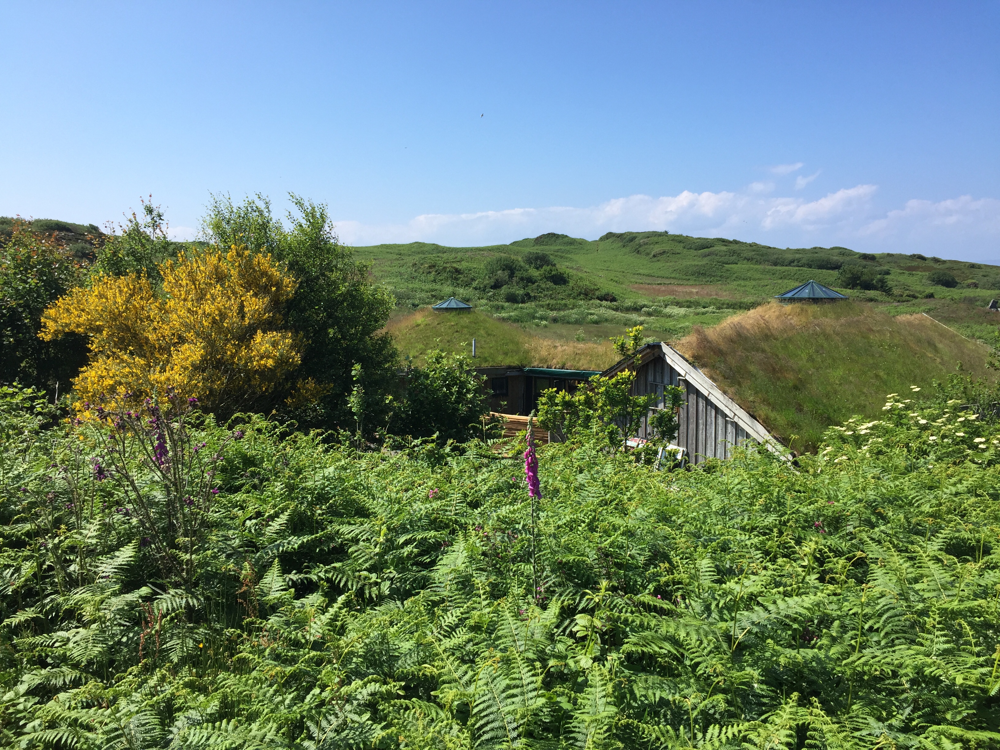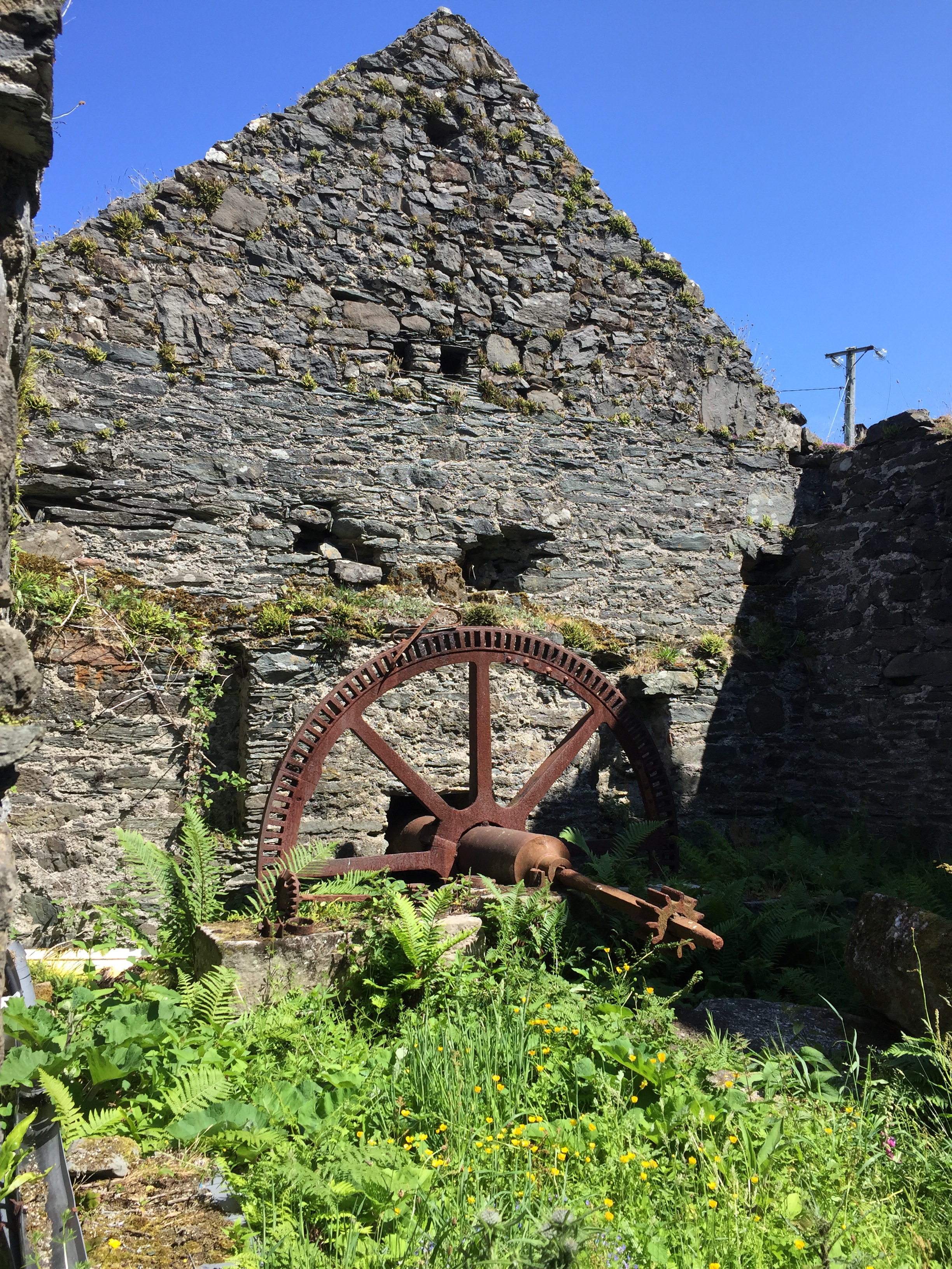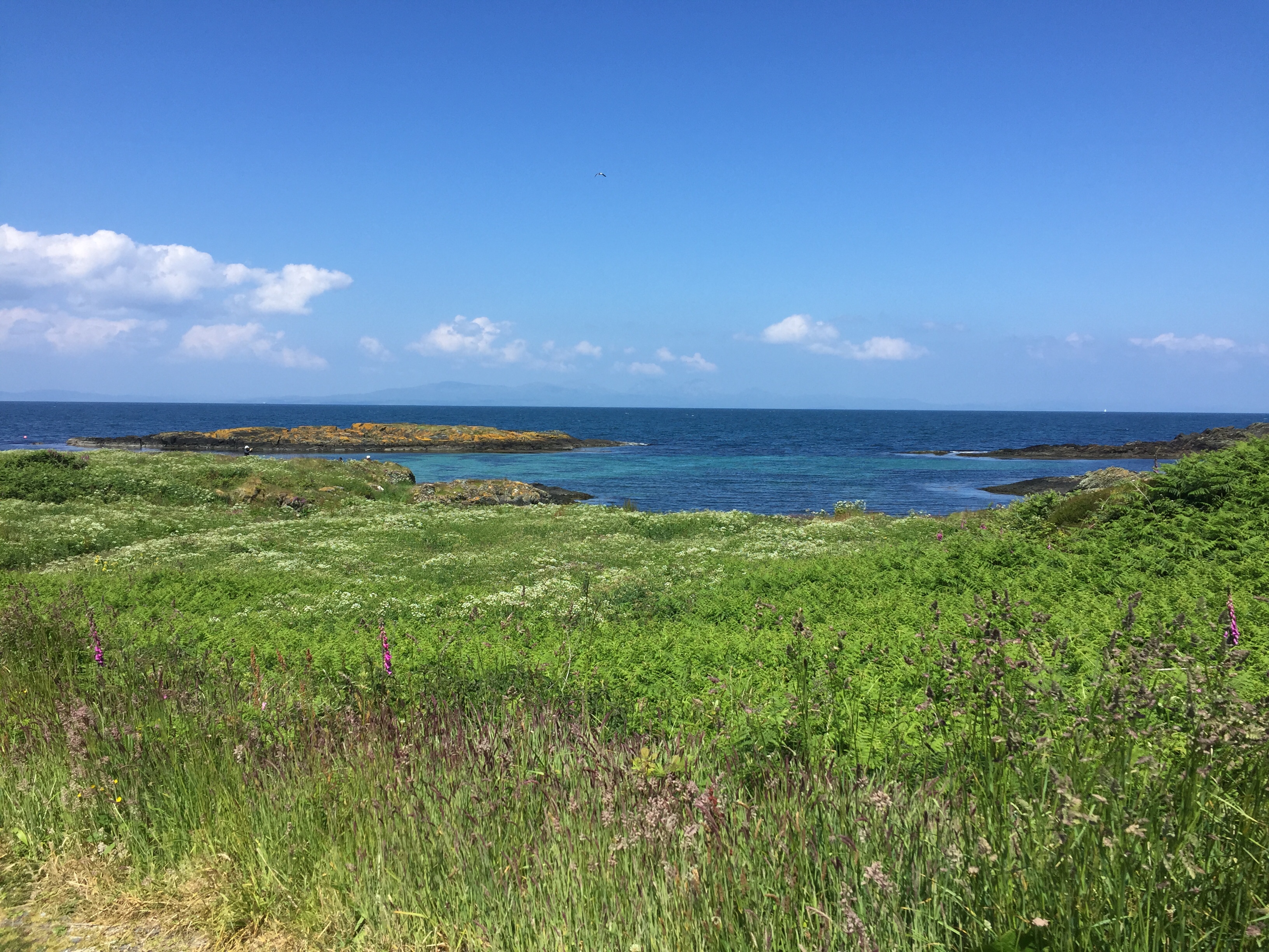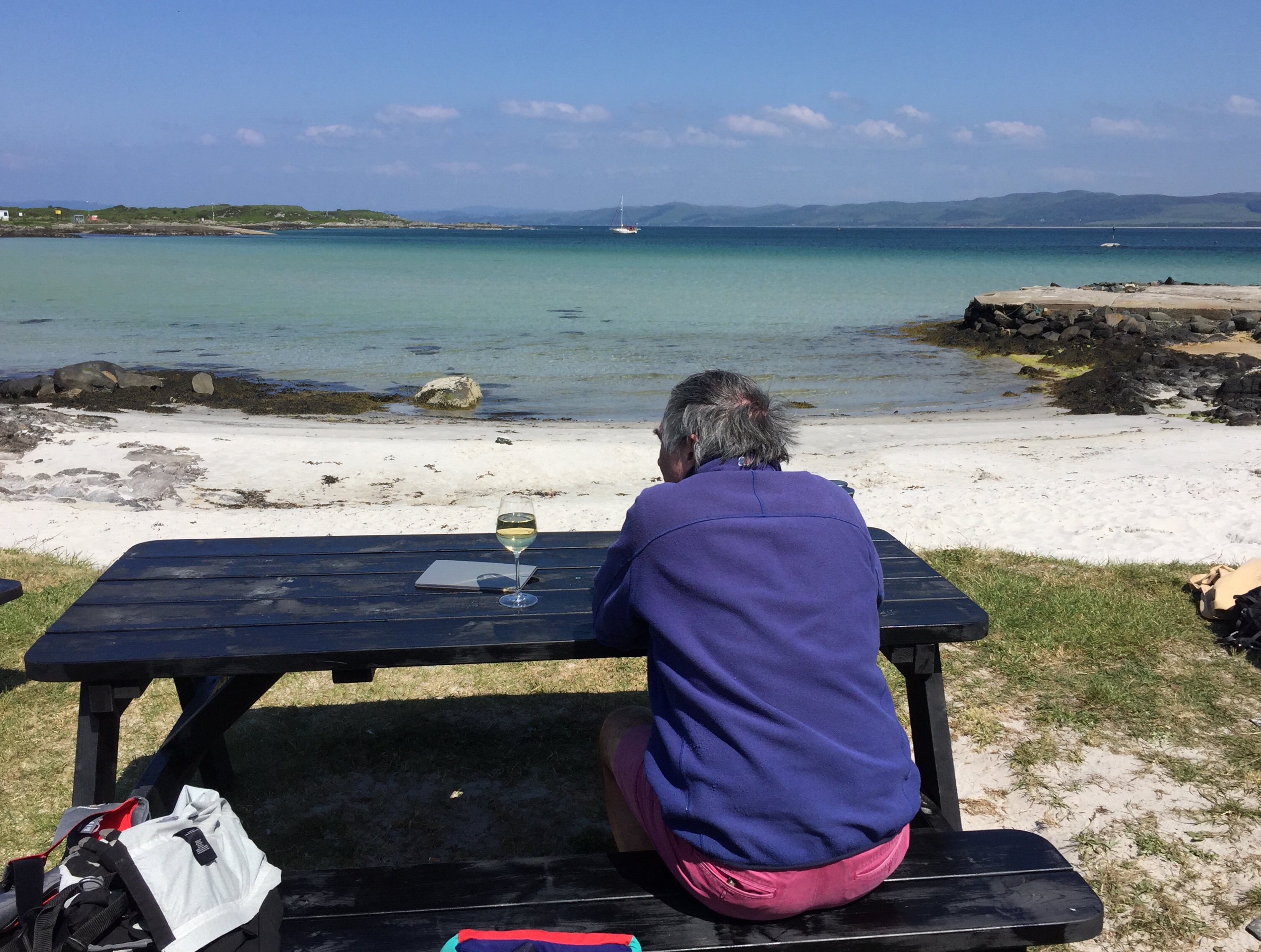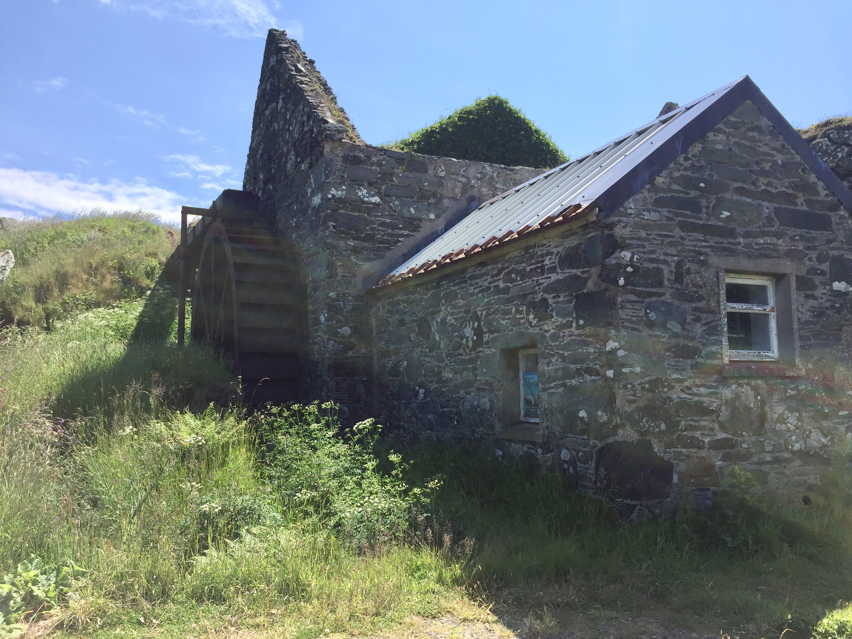 The longest day of the year ! For us a day of many things. As the wind had got up overnight it was a bit disturbed. J had got up to quieten the dinghy. this bay has a habit of looking beautiful and benign but once out from the land the wind whips across ferociously. I soon abandoned any plans of paddle boarding! We had booked lunch at the boathouse so went for a walk first. But before that filled our water carriers and used our trolley for The first time. As we’re not sure when we’ll next be alongside a pontoon. It was THE most beautiful day. Bright colours of blues and greens along with all the flowers are amazing. We walked over to the west side of the island. Spoke to a lady who lived in a self built turf roofed house … so remote above a stunning beach and near a derelict water mill . What community lived there you wonder.? She had a very friendly bearded collie called Rosie.