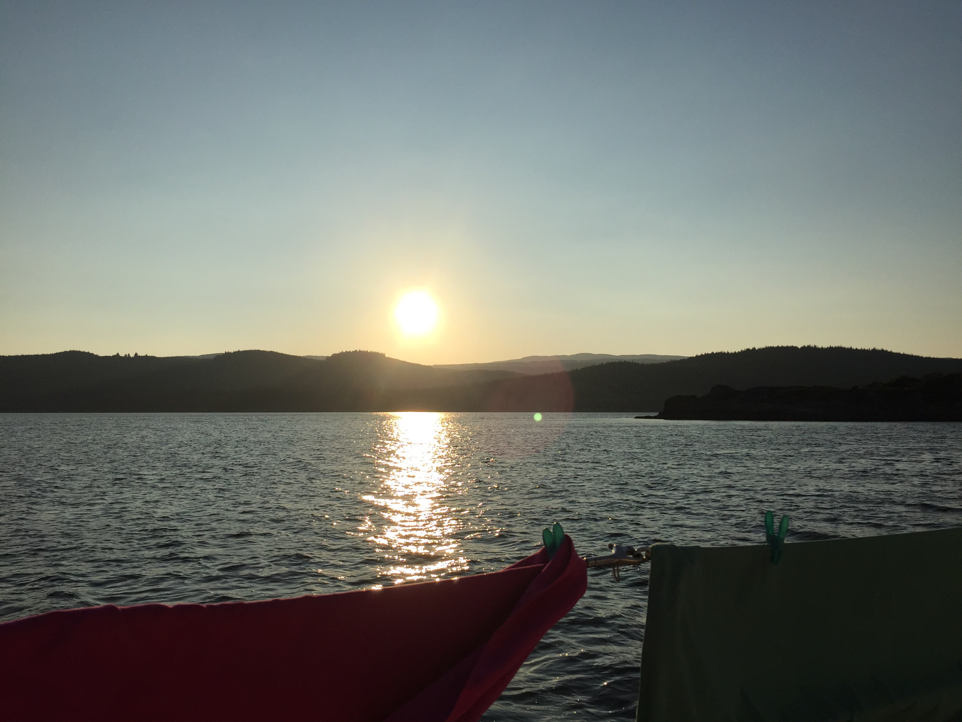 After lunch we returned to Angelique and left our mooring in winds blowing 20 knots. Our destination was west Loch tarbert not far but it certainly was a “ romping” sail. Wind on the nose and up to 23 kt. The water is shallow here which meant choppy white water. Eventually entering the Loch of course just as the ferry was coming out. We had ( I had) several minutes of not breathing watching it coming straight toward us……. never get over my ferry panic! We found the most peaceful and secluded anchorage to stick the hook down and enjoyed a beautiful sunset on the longest day of the year. Didn’t even need to cook!
