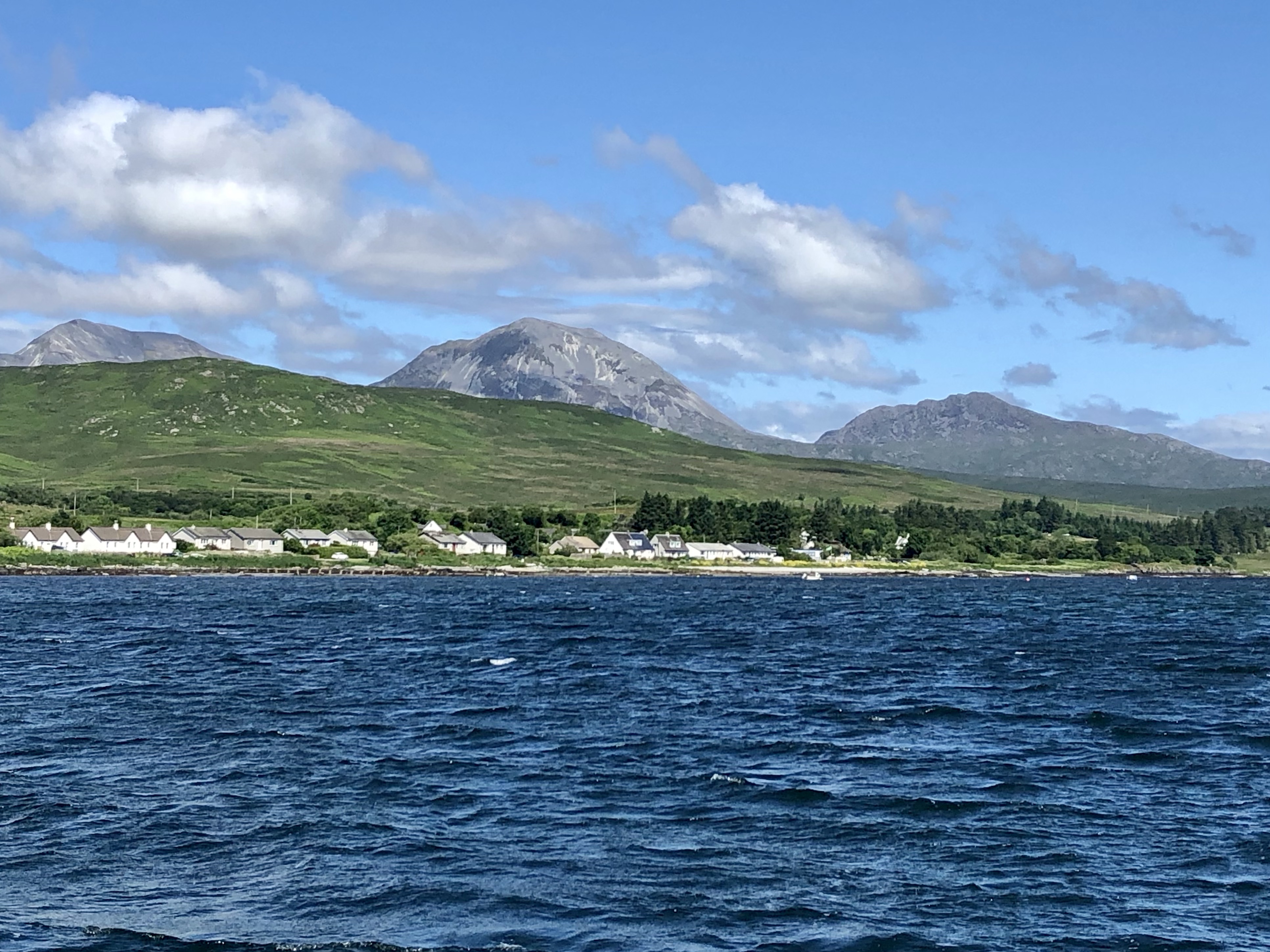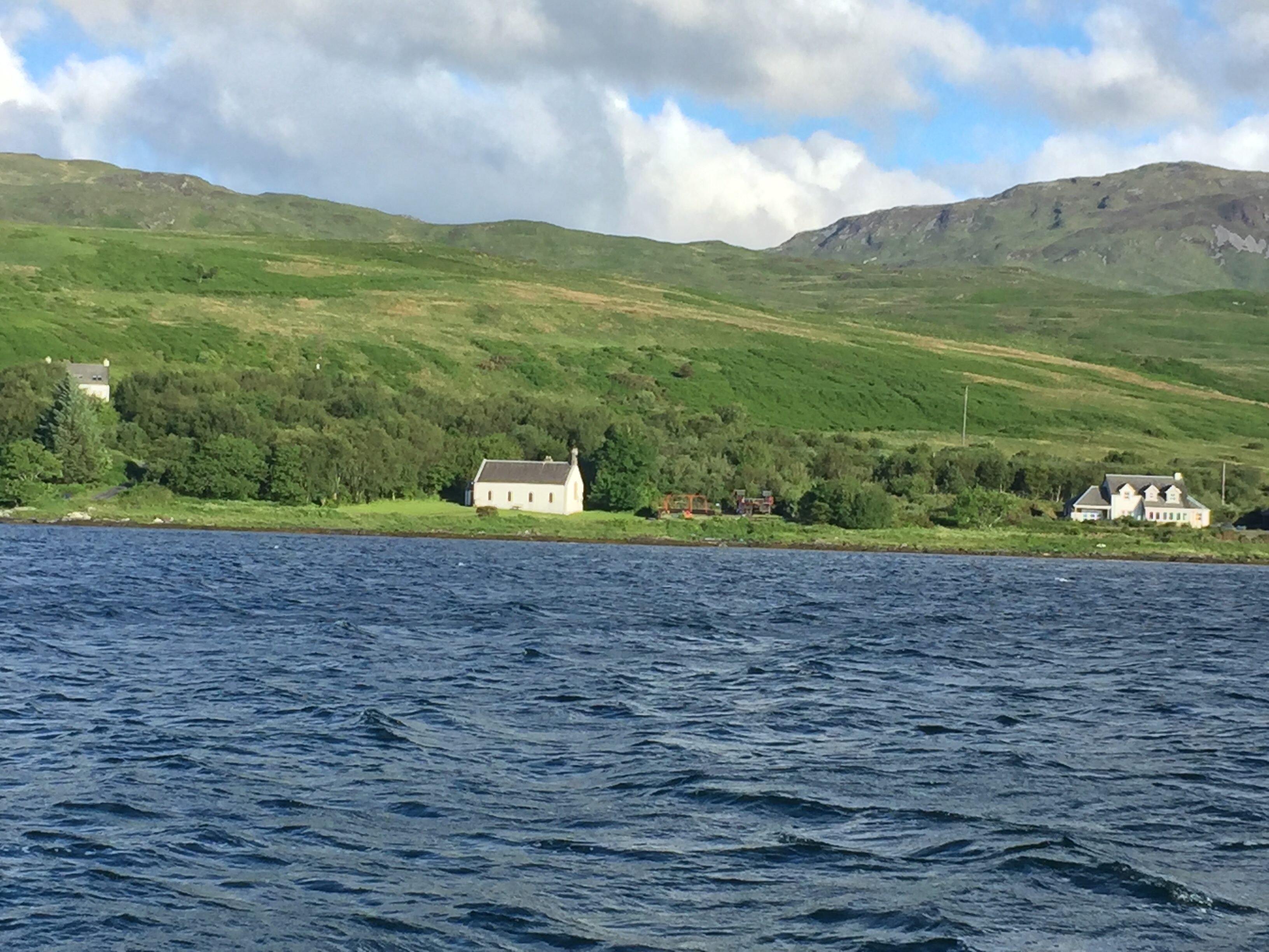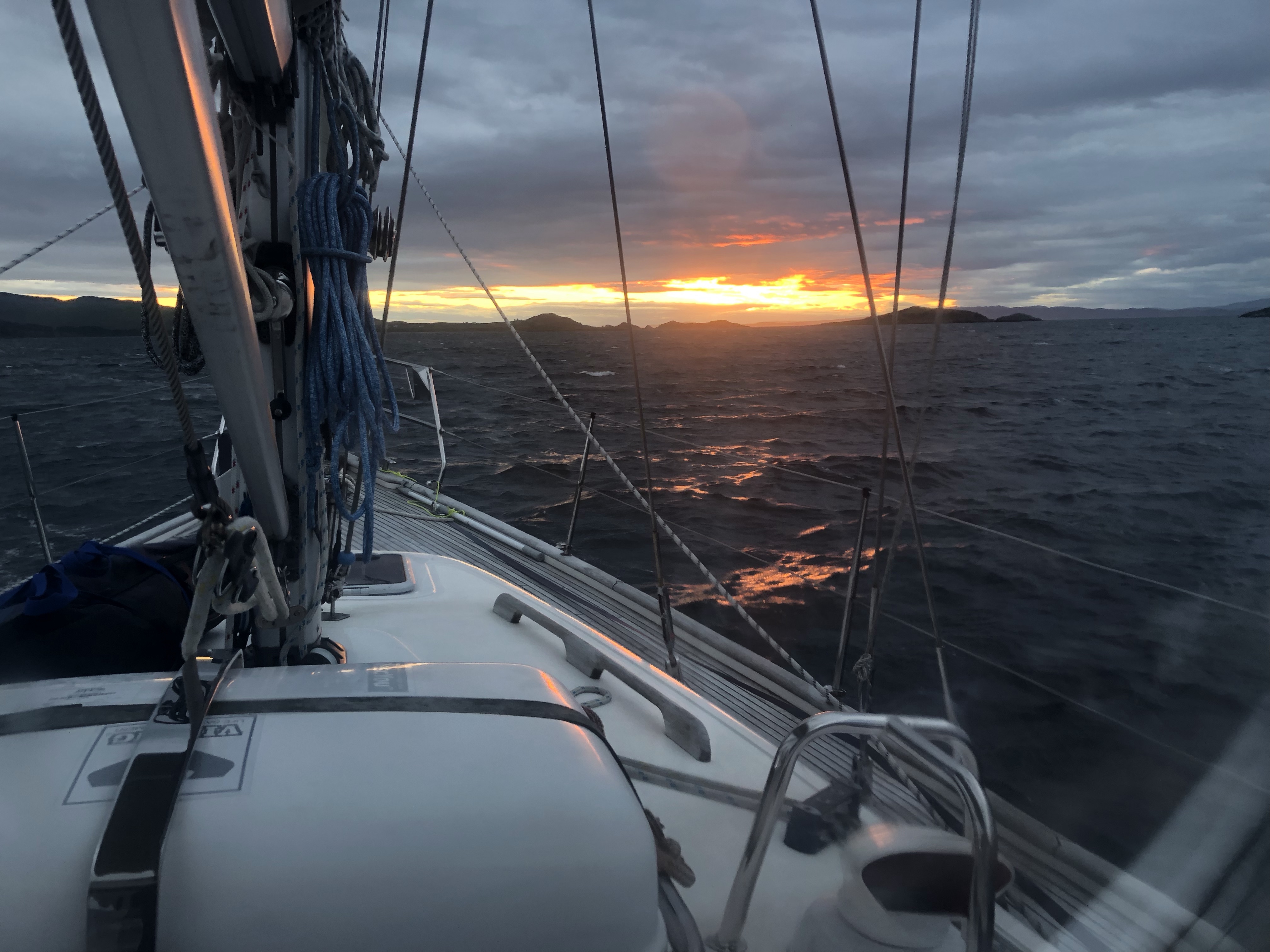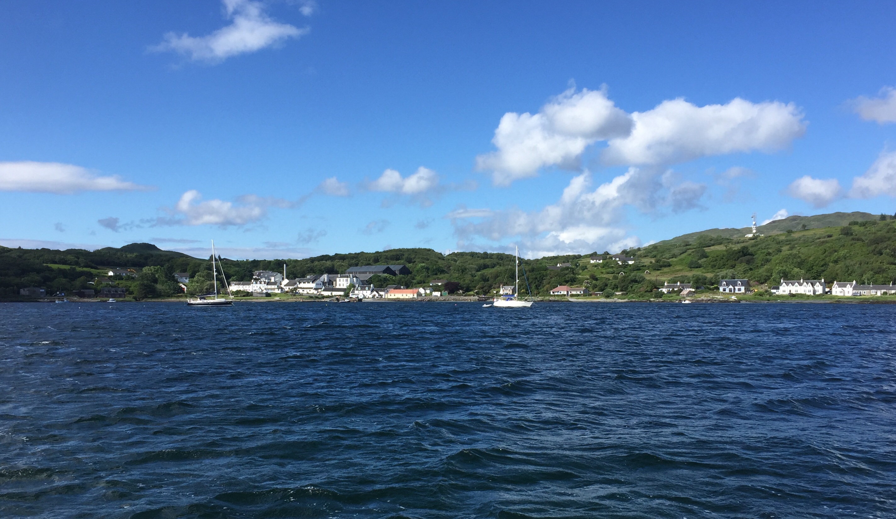 It’s been a long day . Longer for Julian who stayed up to keep anchoR watch right through the night. I can’t post his pictures of the dawn as we have no signal but it was beautiful in a wild sort of way! I got some hours sleep and got up about 0630. The visibility is clear and the sun shining. Buts it’s oh so cold and the wind hasn’t let up st all . Still we haven’t moved which is the main thing. J went for s well earned rest and I took the next 4 hours watch. Checking with each time Angelique swings on her anchor that the transit with something on the shore hasn’t changed. Mine is the little white chapel on the shore in line with the main halyard on the boat. It becomes an all consuming task. The wind was consistently 25 knots plus but not quite as high as yesterday. Julian managed to set the anchor alarm on the new plotter so it will alert us if the boat moved by more than 70 m. Several other boats have are and anchored……. probably most hoping as we did for a visitor mooring! The bay is now quite full and you can’t helping feeling that the local economy would benefit hugely from the maintenance of moorings….. not least the distillery! Always a favourite with boaty people!