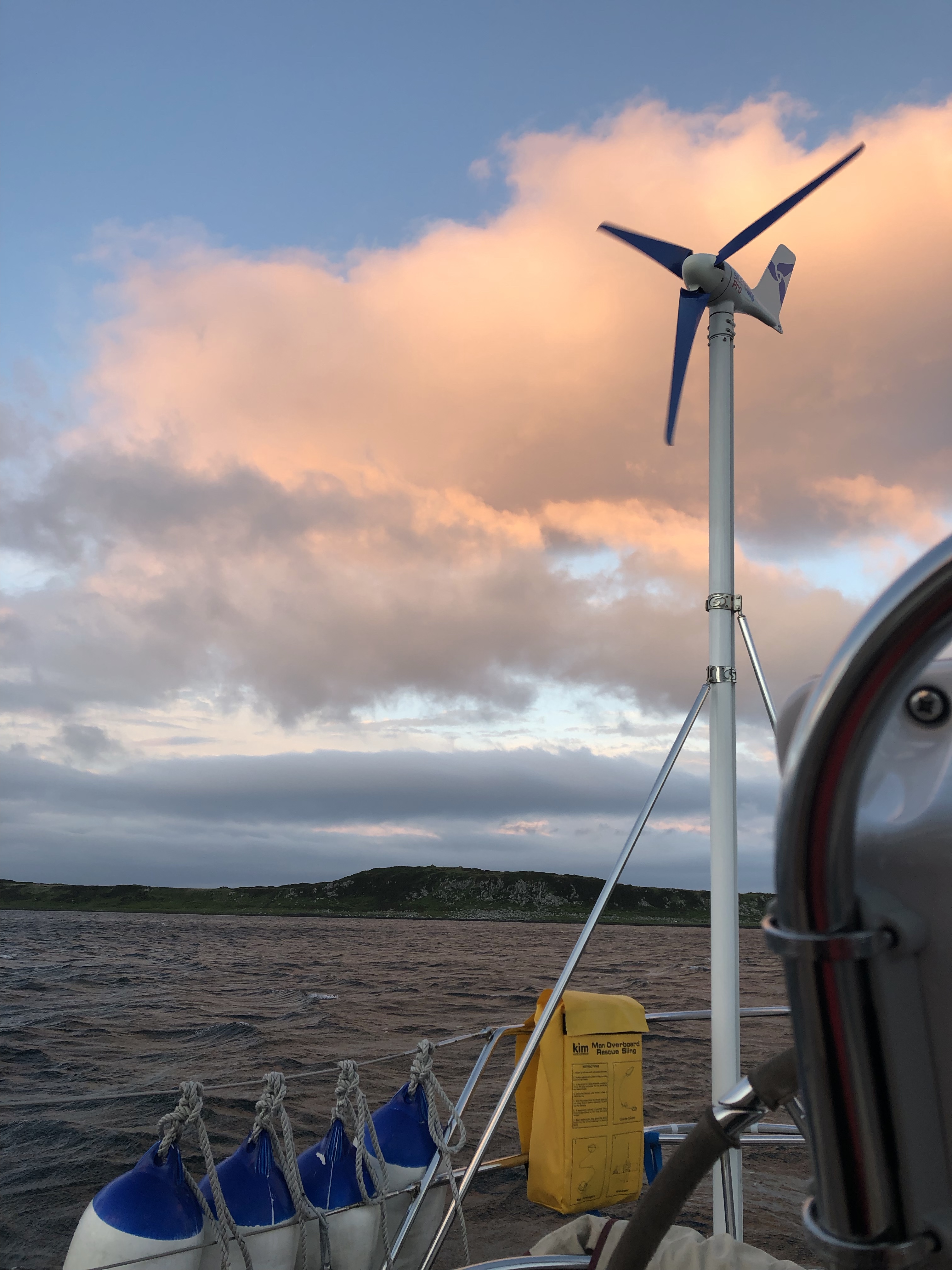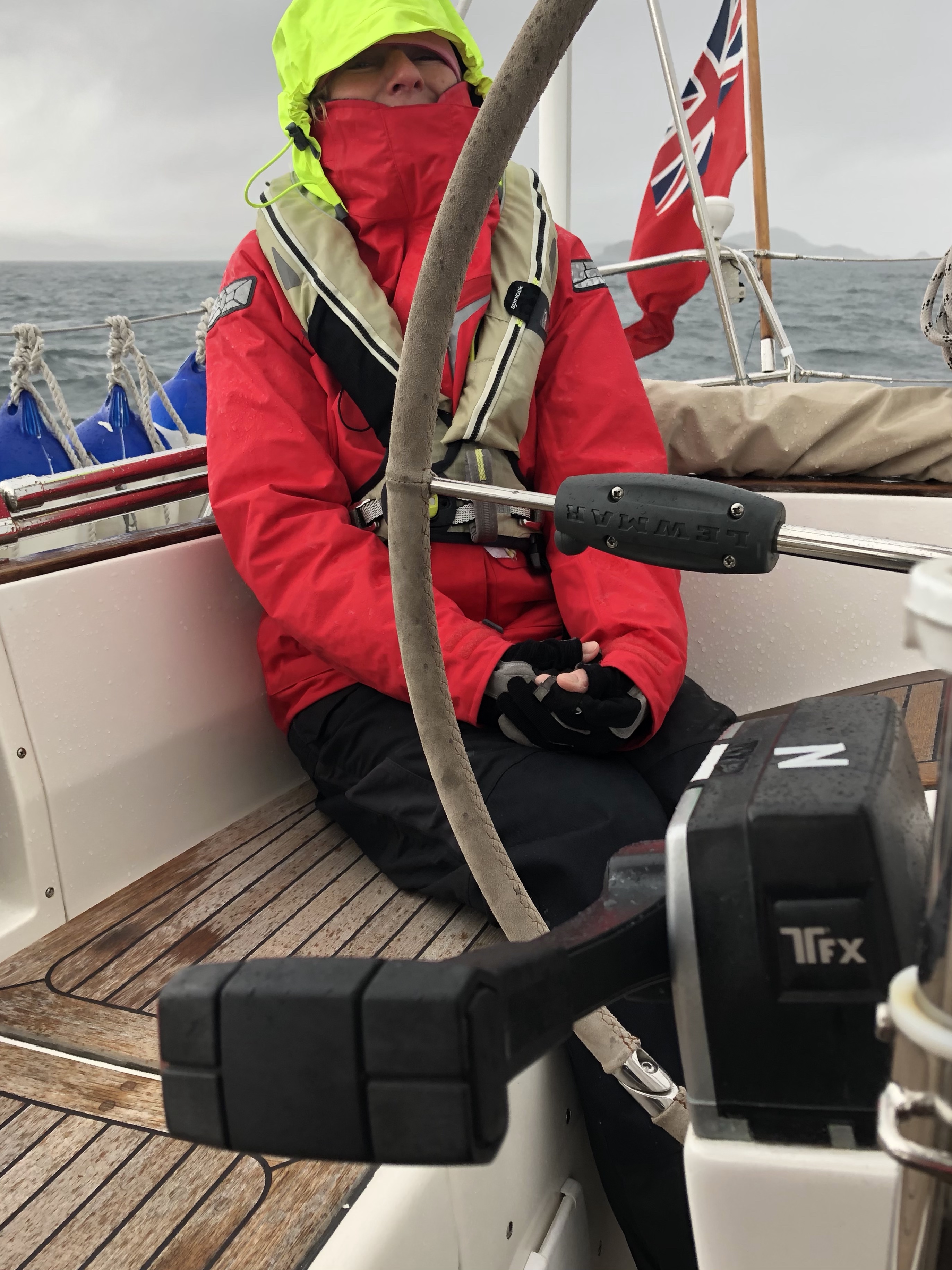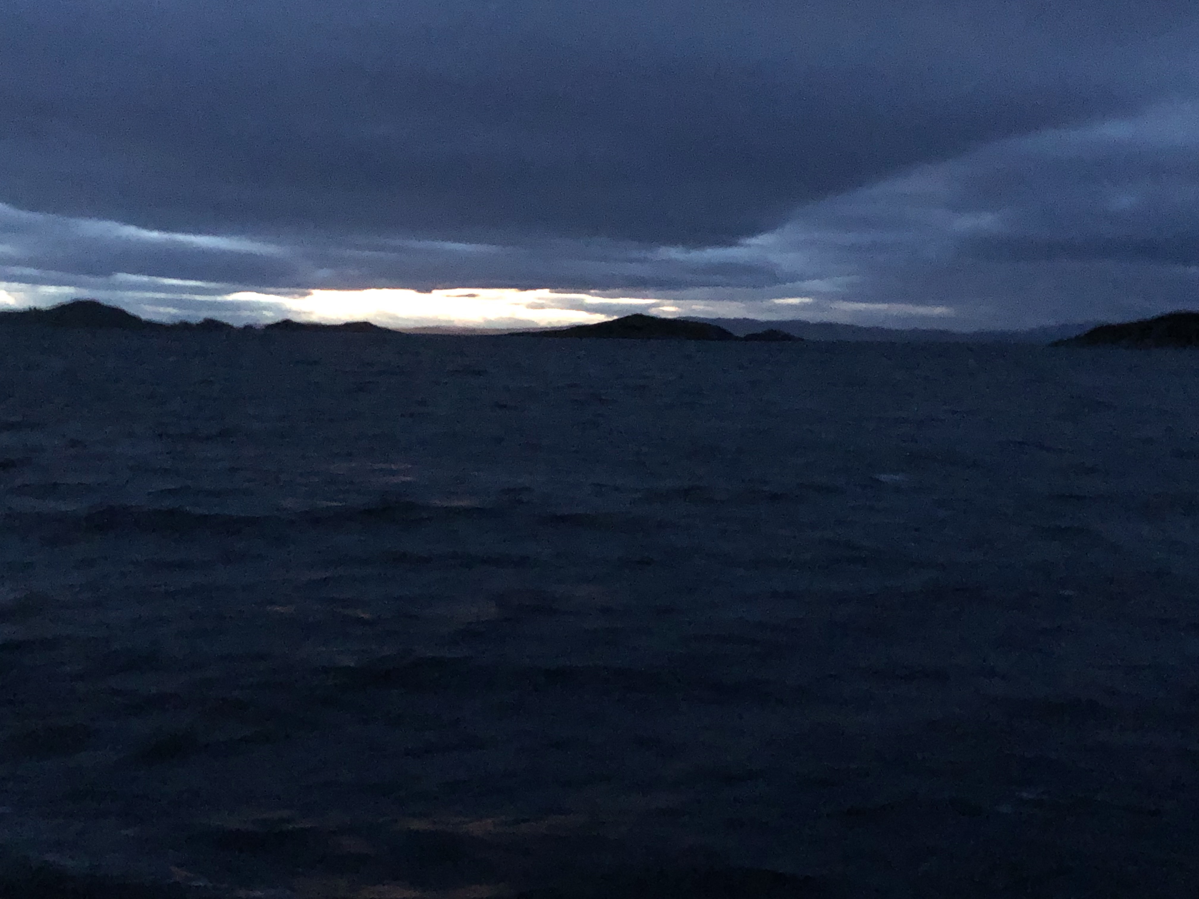 Although rainy and very poor visibility to begin with the sea state was pretty calm for a while and we even saw one chap row ashore. We did some jobs… we were thinking of going to the shop but it was so miserable we decided to abandon that plan. I even washed my hair to make the most of the hot water created by motoring. We sat and discussed “next few days “ plans And celebrated the fact that Alice has finally completed on her house and has the keys!!Julian cooked yummy sausage beans and spuds. We were aware the wind was getting up…. as forecast. Cold front having gone through and wind direction changed to Northerlies with clearing skies. About 9 pm the wind was getting really strong and suddenly We noticed outside the shorescape was changing quickly. Our anchor was dragging and it was all hands on deck. I had just started to do the washing up…….. the wind was gusting over 30 kt and it was really hard to keep the boat going in the desired direction without being blown sideways. I was pretty scared. I had to have the throttle hard on to make any way whilst J tried to retrieve and clean the anchor which was now covered in weed. We noticed that one of the other boats also had a problem but he looked like he was alone on his boat and eventually after several tries at re-anchoring, he set off into the dusk in a very lumpy sound of Jura. I do hope he found shelter soon. I had noticed a dorsal fin approaching his boat at the beginning of the mayhem and a few minutes later a few of them (Dolphins) were next to us. Maybe they were just being nosy but it felt like they were there to help to lend moral support… that’s what I like to believe! Once we had successfully anchored further up the Loch, they disappeared……. who knows, but I was grateful to them. I had been having to use the engine at full throttle so the vague burning smell I thought might be that until I realised a sort of smoke from the saloon and in the nick of time realised the smell was coming from the cooker and the pan of water I’d been boiling for washing up. It had just boiled dry by the time I turned it off😱 . We sat for a long time watching day turn to night and listened to the gale around us gusting up to 33 kt. You don’t normally get white water in anchorages! We focused on transits to show us if the anchor was holding and J put out most of our 70 m of chain. I eventually went and got some rest but Julian stayed up all night. It’s still blowing and is forecast to do so for the next 24 hours ☹️