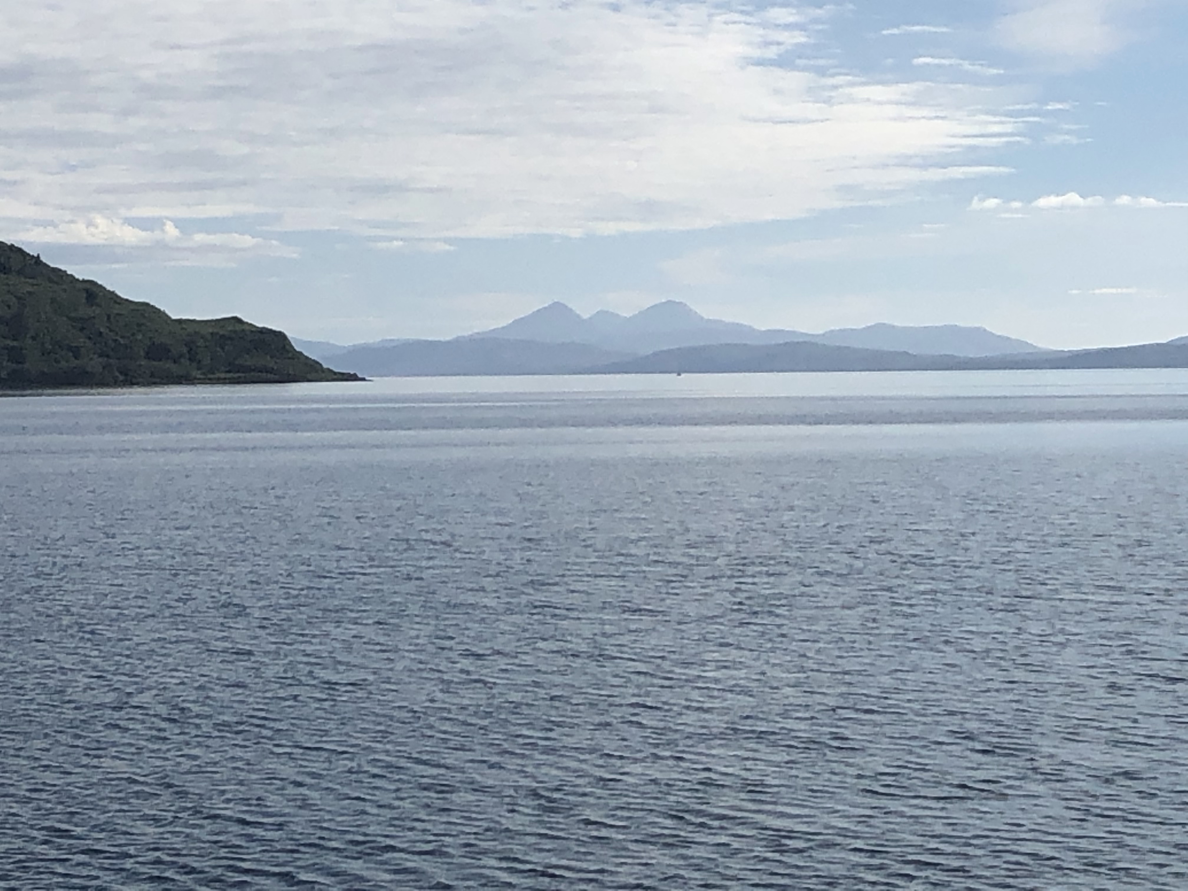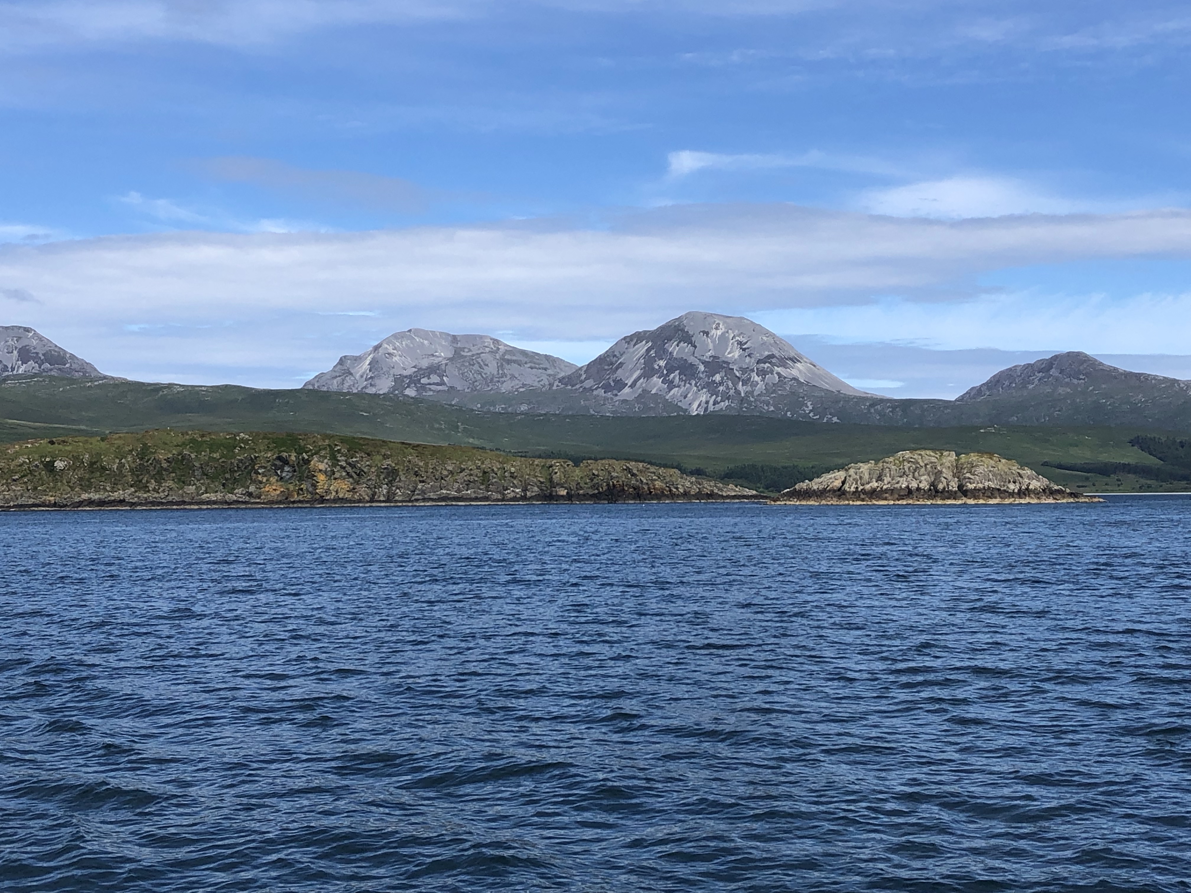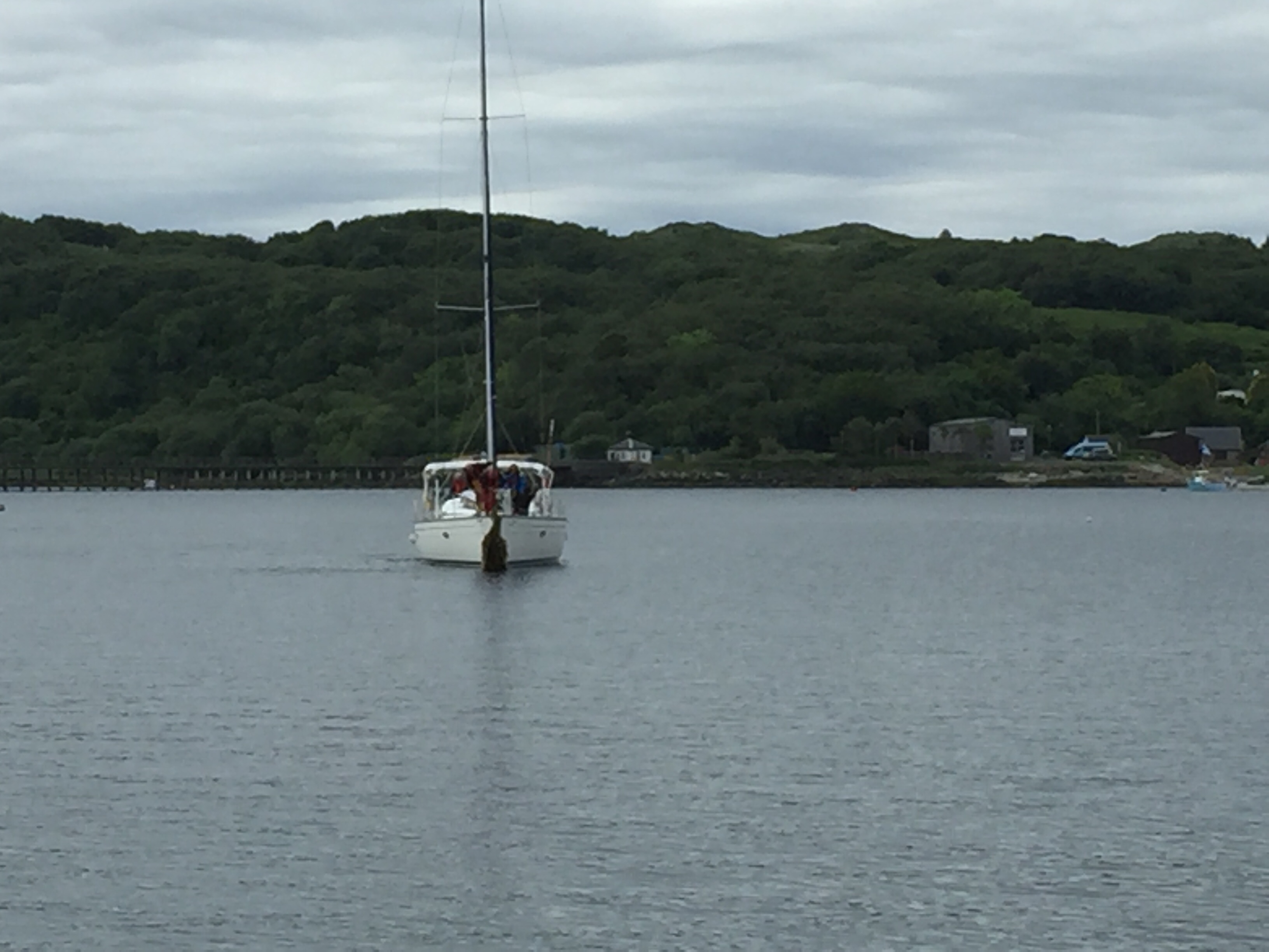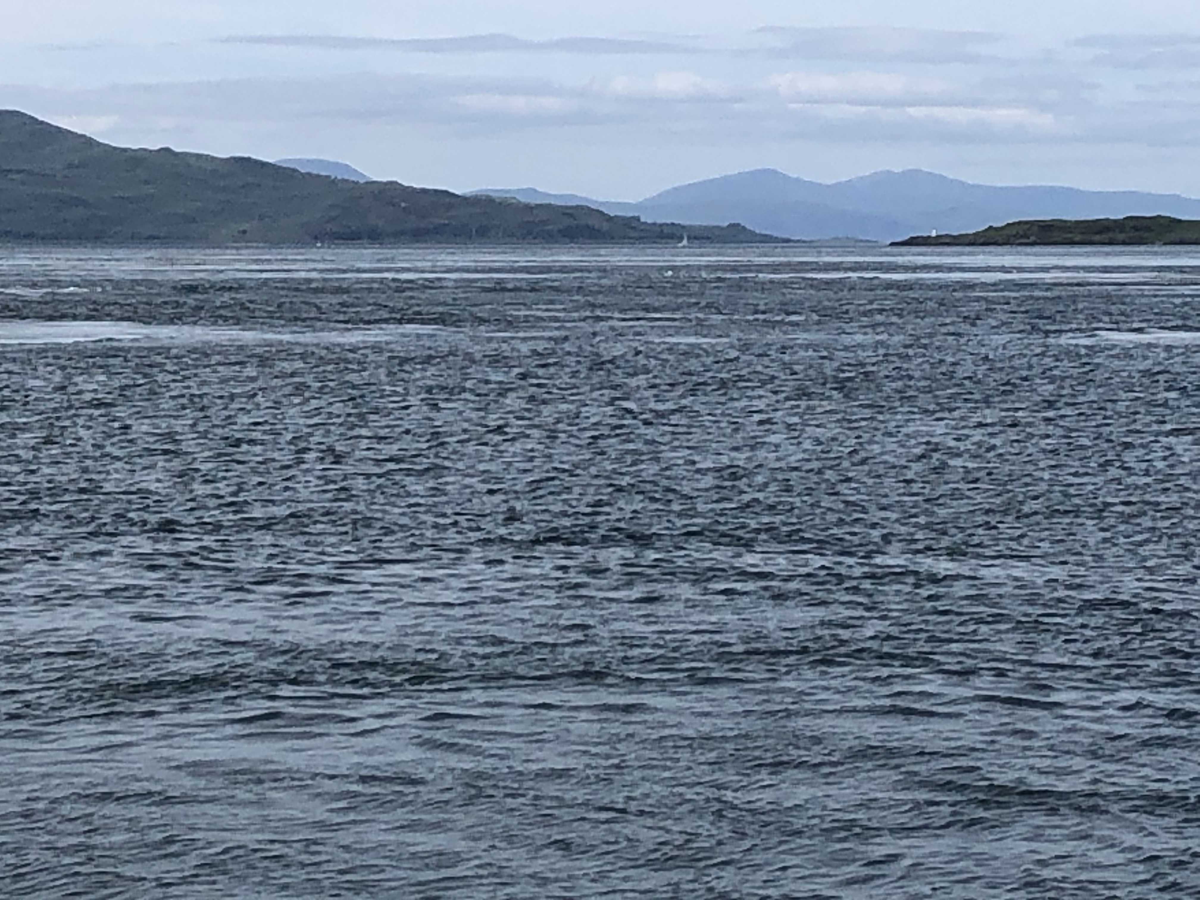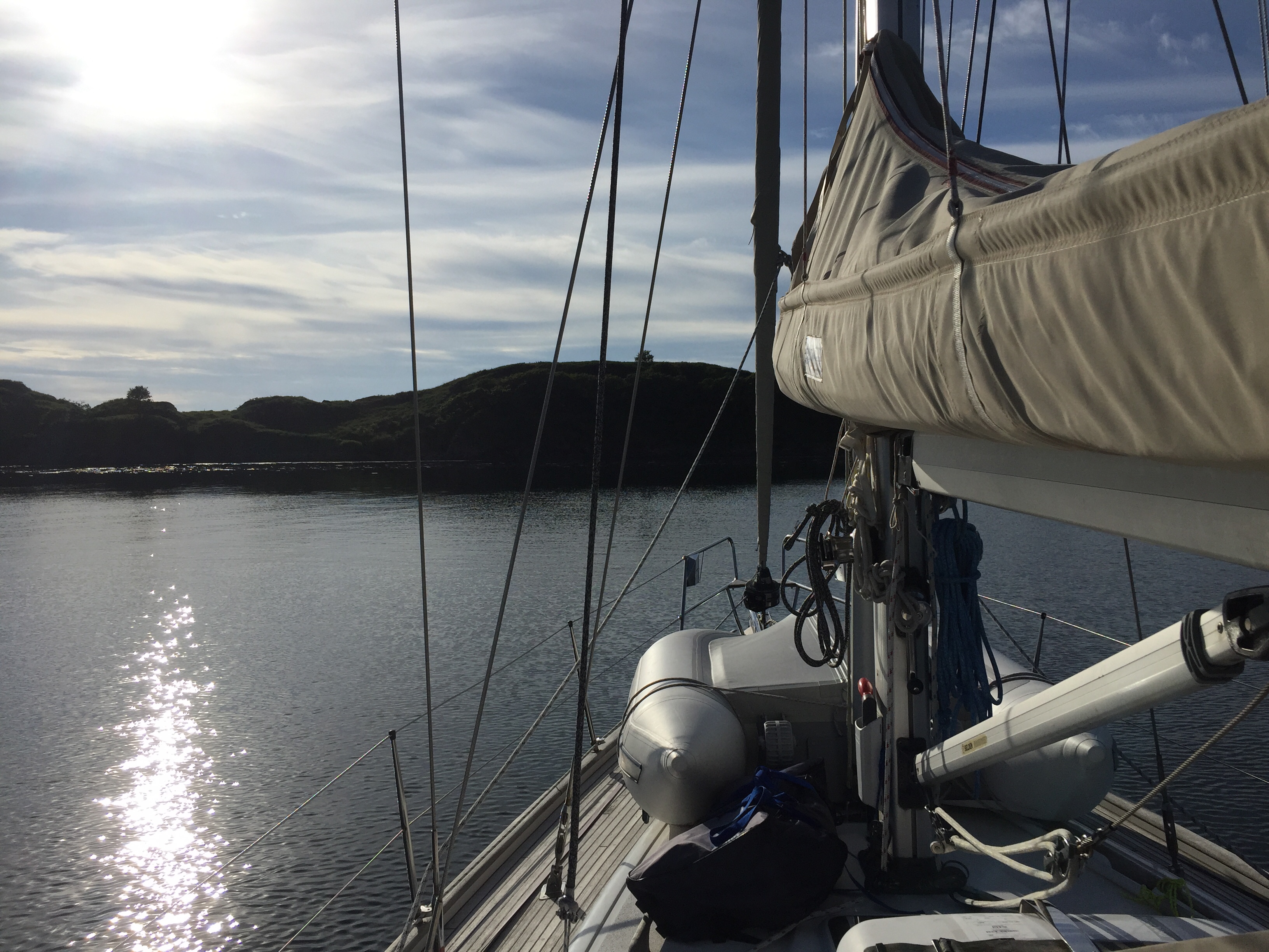Eventually a peaceful night! The wind died around dusk and we decided to not stay up! Wanting to leave the anchor alarm on but for some reason the LED anchor light which we plug into the same 12 v socket as the plotter, would not work on an alternative socket! Annoying! No matter. All was quiet in the morning and there were signs of life stirring on the other boats. Everyone had the same problem with getting their anchor up covered in seaweed. It took us about half an hour to get ours in! Cleaning it and cutting off the weed as you draw up each meter. The sun was out albeit together with a cloudy sky. We set off tacking up a flat sea in 7-10 kt of breeze. Very pleasant and you couldn’t believe it was the same world as 24 hours ago. The wind died around lunchtime and we had a lovely hour motoring up the east coast of Jura, looking at all the little bays …. potential anchorages. Tarbert bay and Lussa bay looked especially inviting. As we approached the northern end of Jura you get into the weird turbulence of the tidal streams that affect this area. Flat Whirlpools and white water are milling together to form the strangest feeling under the boat. You think you’re doing 4 or 5 knots but actually you’re doing 0.5 kt. Obviously in calm weather it’s interesting but can be alarming in windier conditions. It’s near the entrance to the notorious gulf of Coryvreckan, which is still an ambition of mine to sail through . Maybe later ……how about it T & S?? By now the sun was hot and the wind behind us….. for once it felt warm! We decided to anchor in a bay opposite Crinan basin called Gallanach bay. Beautiful, secluded and wild. No one here except a flock of greylag geese and some seals. The sun is setting over the bow of Angelique and we have gin and tonics and beer in hand.