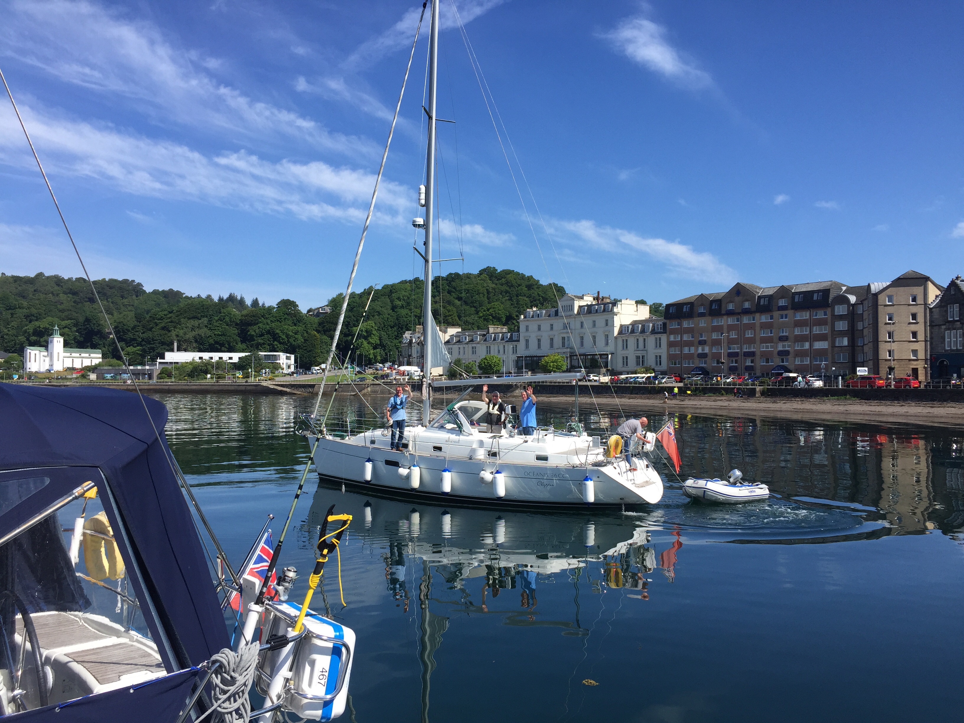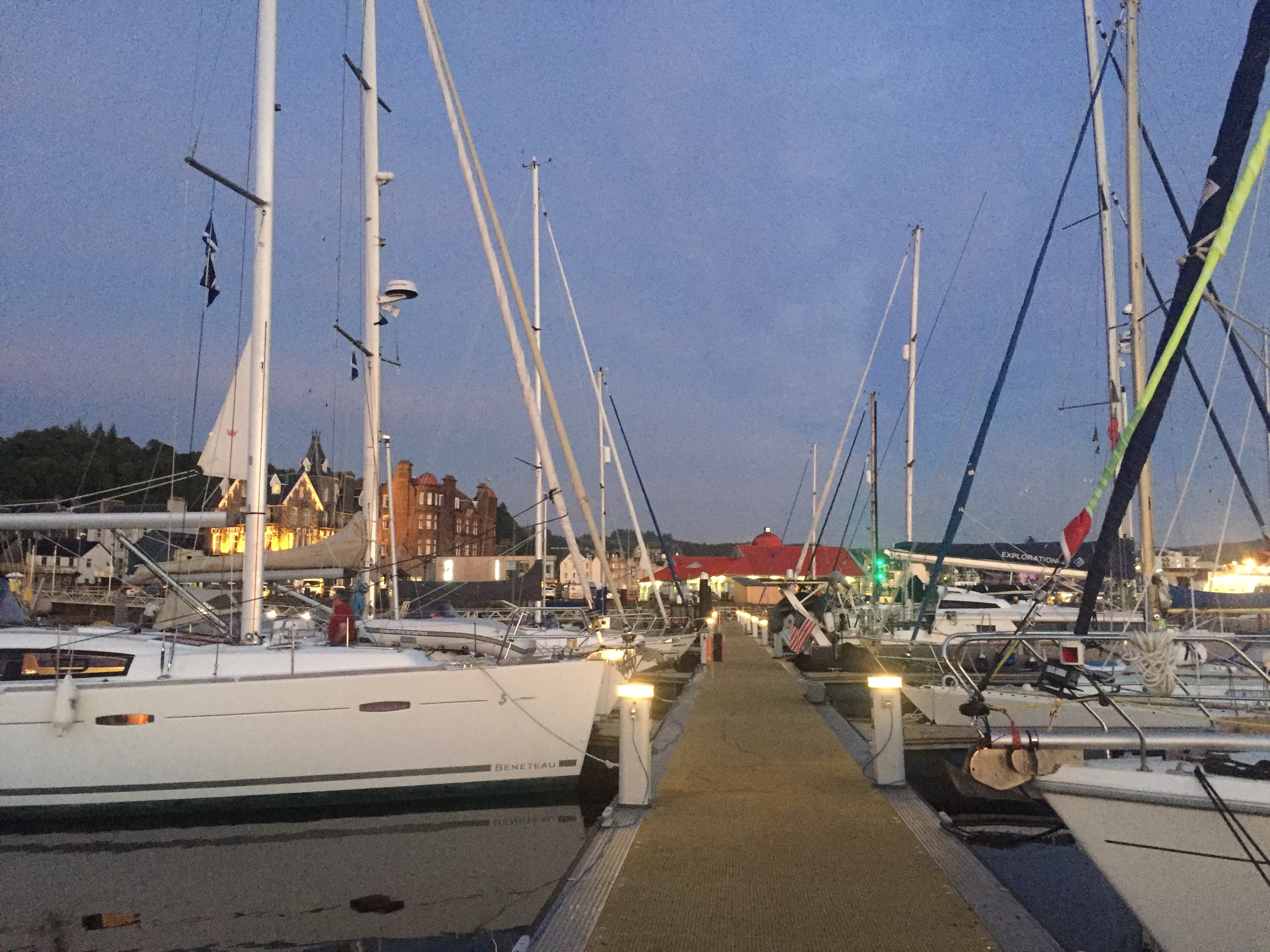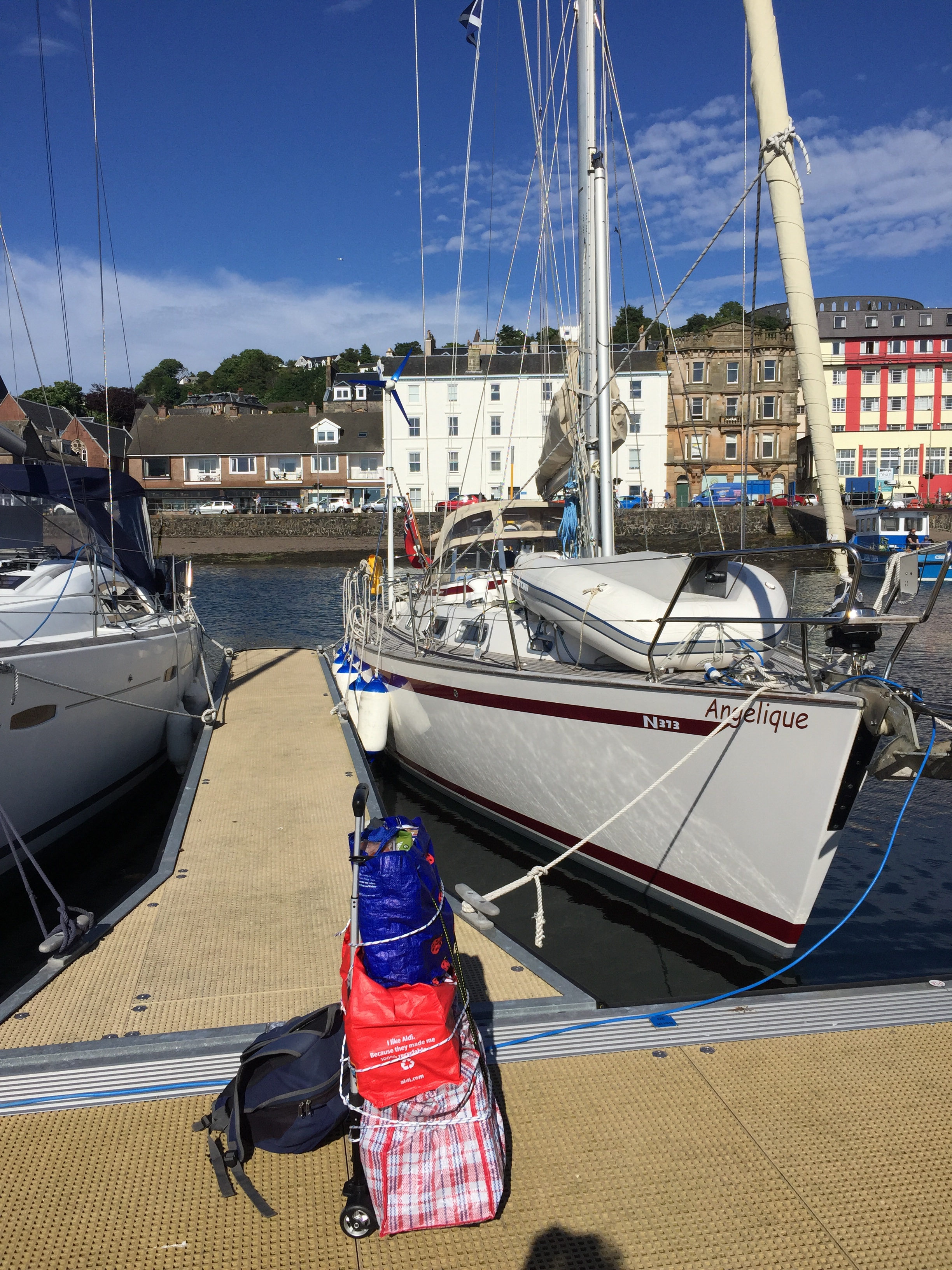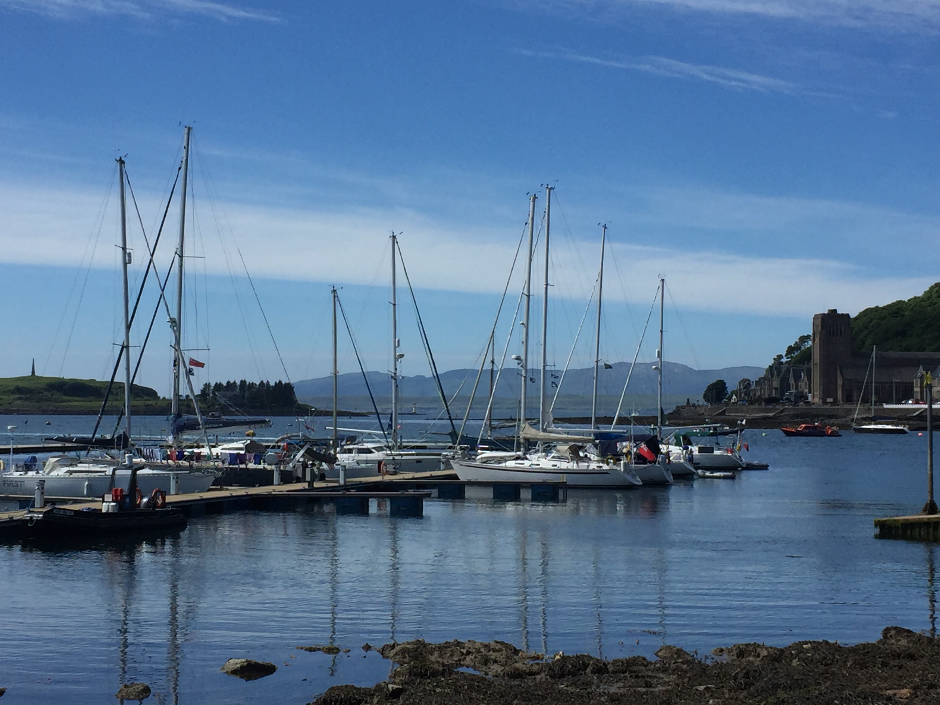 We set off the few miles up Kerrera sound towards Oban. No wind to speak of so we motored the whole way. The little transit marina is only for visiting boats and we were pleasantly surprised that it wasn’t busy. We chose s nice “starboard to“ berth and nice to be attached to something solid once again! Our friends Nigel and Brenda popped over to see us from dunstaffnage early afternoon and we had coffee before they had to go and fly off home! We then made our way to Tesco’s armed with a large shopping list, bags , the new trolley, string and the empty gaz canister. Couldn’t get the gaz but did manage to get our load back to the boat without the trolley breaking!!! In the evening Julian’s freind Fred ( from Shrewsbury)and crew mates, were coincidentally on a boat in Oban too and they kindly invited us for dinner…. delicious Roast beef and couscous followed by cheese and biscuits. Many thanks all aboard Kestrel!