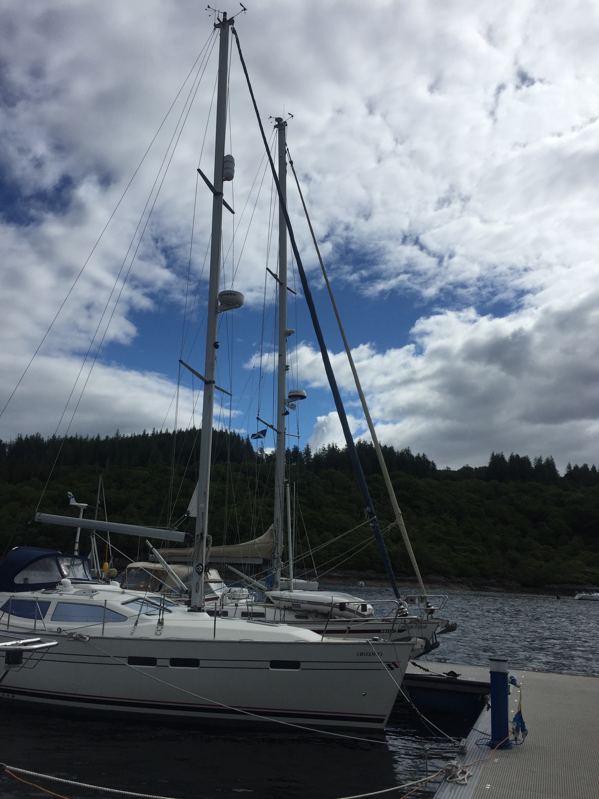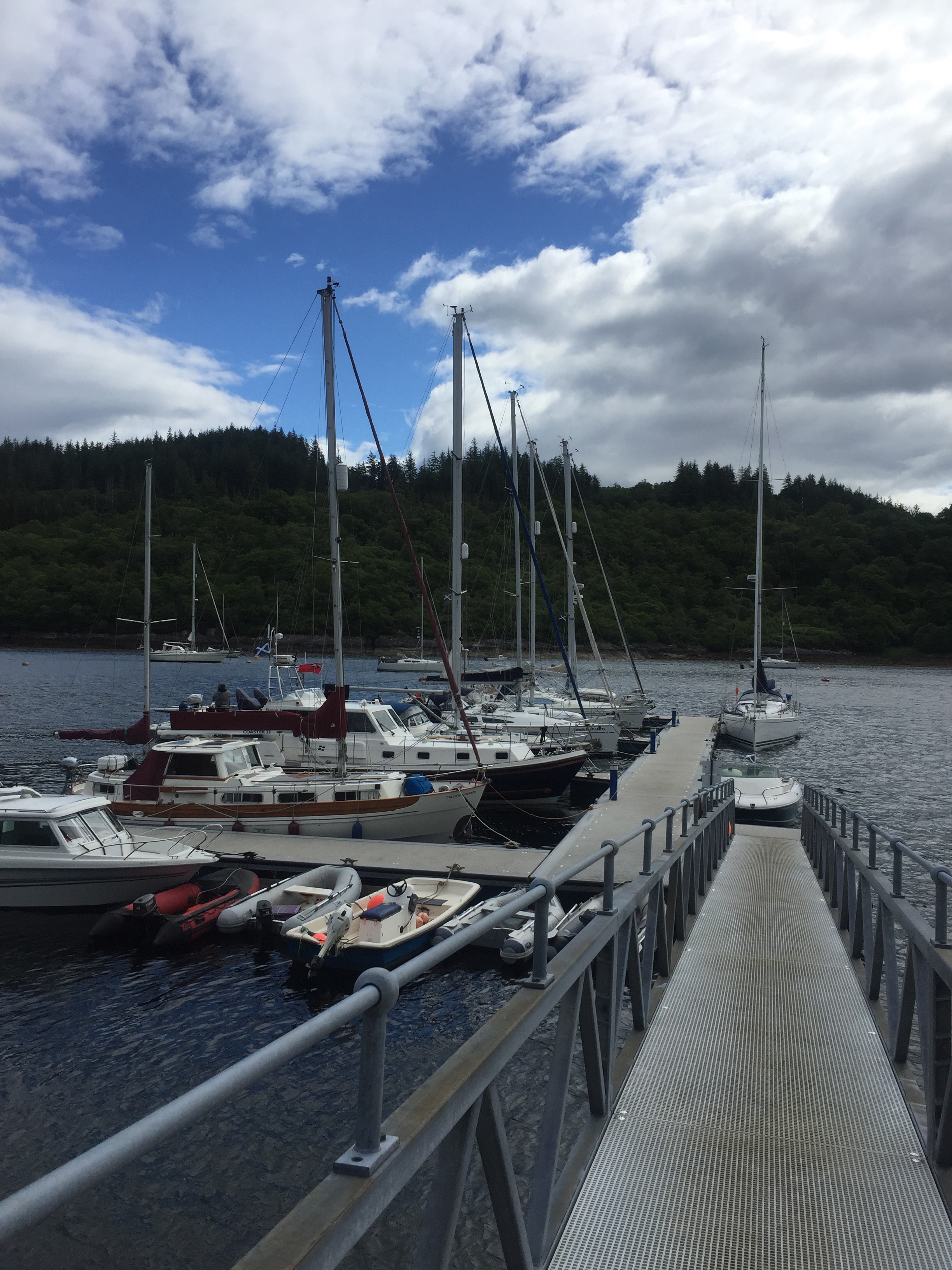 We had phoned ahead to book our berth as it’s only a small marina with room for about 10 boats plus swinging moorings. Jan has kindly put us on the Hammer head which should have been straightforward…. Once securely tied up I went and bought food from the lovely little village shop for a nice supper for the 4 of us. It’s only going to be spaghetti Bol but haven’t sorted the roast out yet! Strawberries and cream for pud followed by cheese and biscuits. Our friends arrived later and Nigel very kindly helped Julian to sort our WiFi router thing which now means we have better WiFi…. at least if we’re near an amplifiable signal. ( new word?) We had a lovely evening and it was great chatting with our chums Nigel and Brenda over supper and a wee dram….Salen is such a great little marina with everything you could need and the friendliest of welcomes. Thank you.