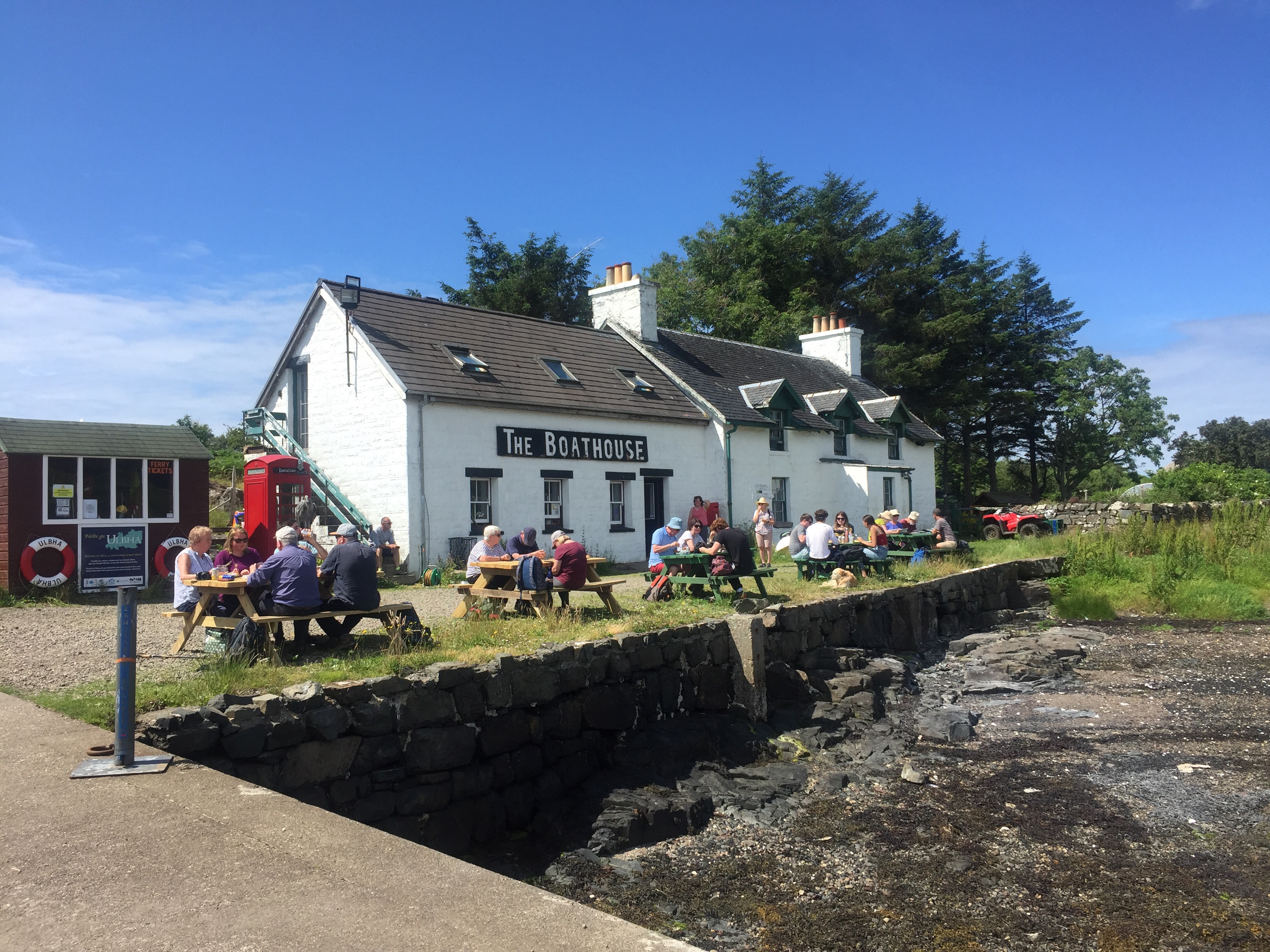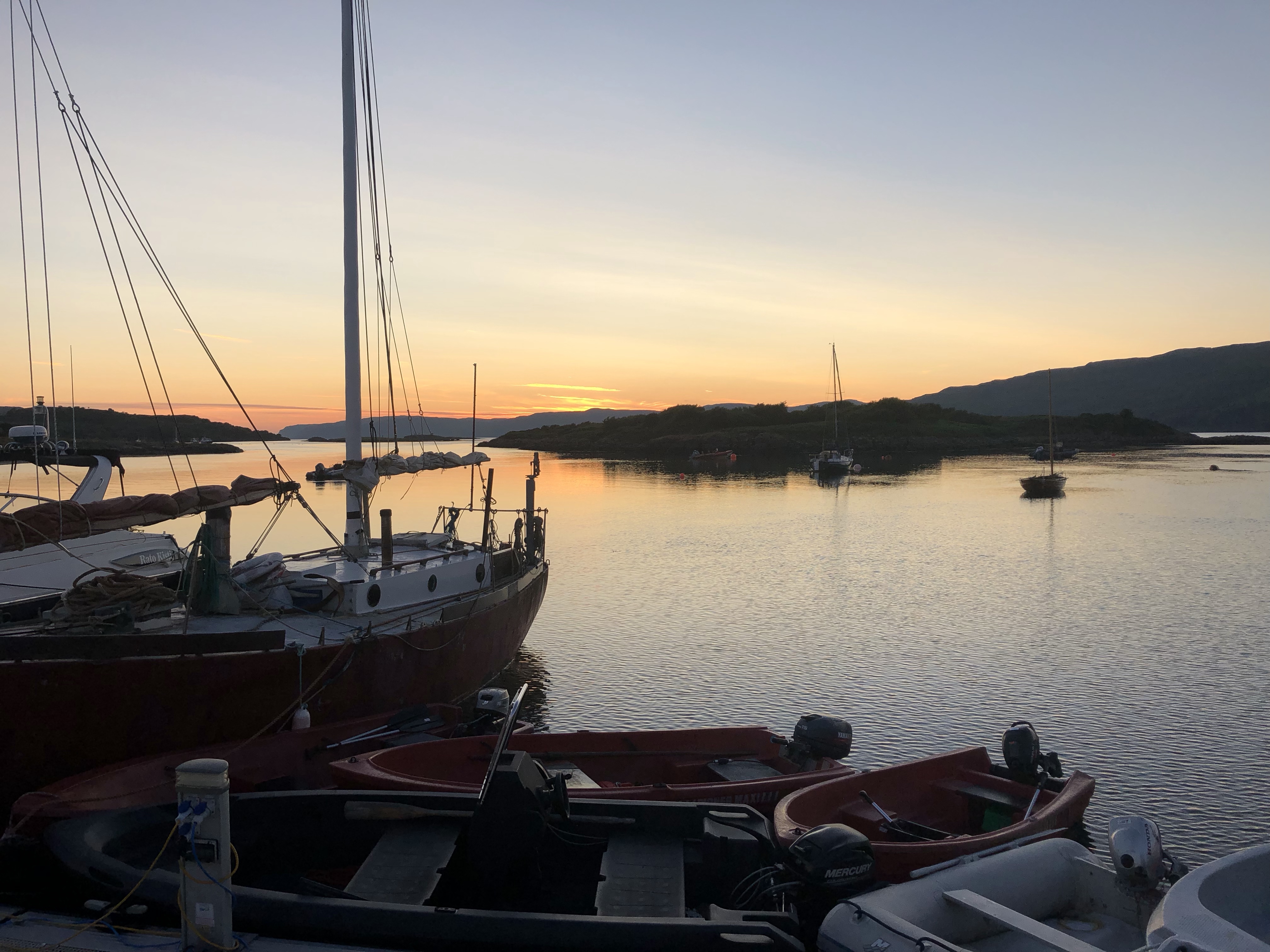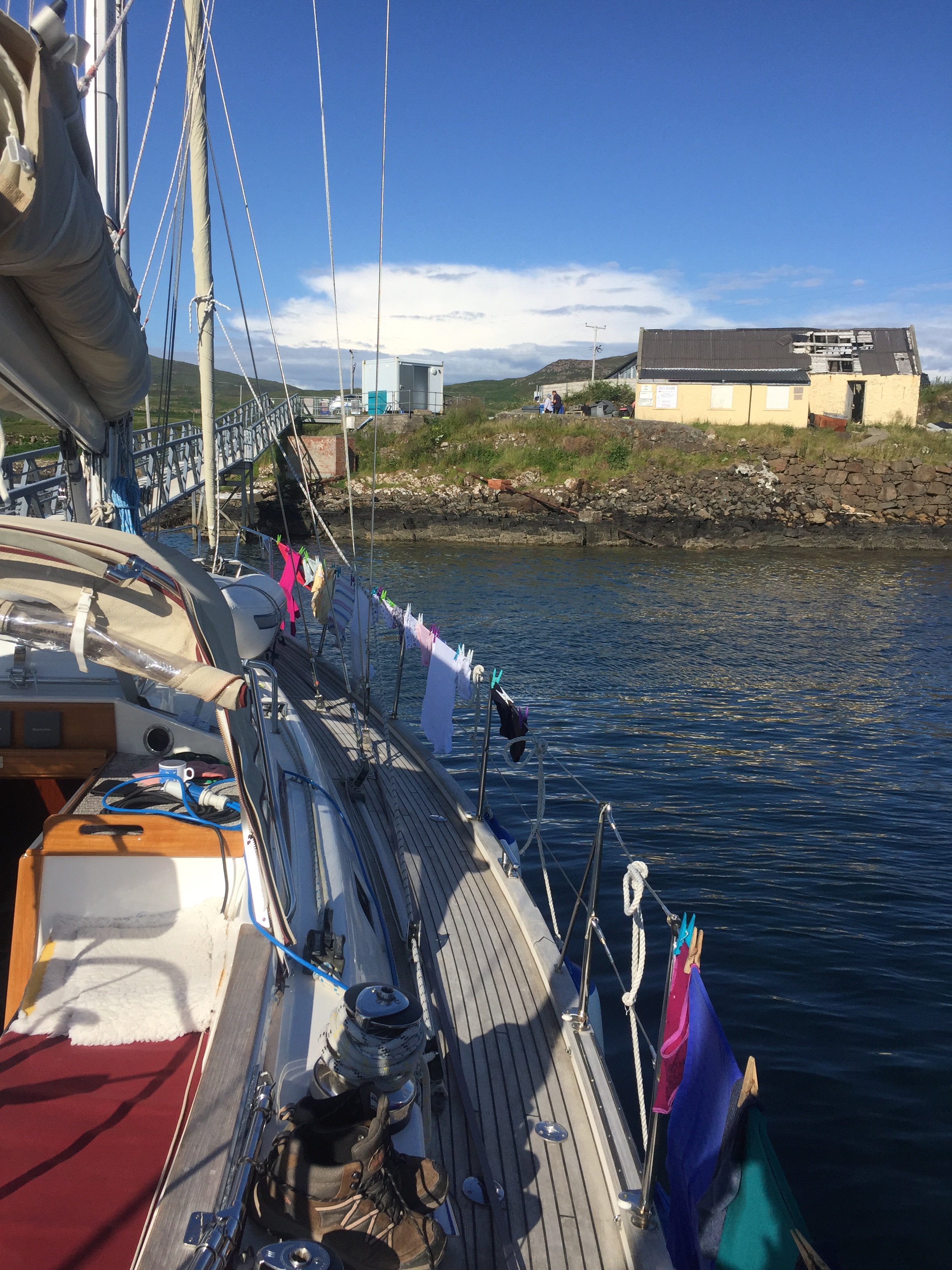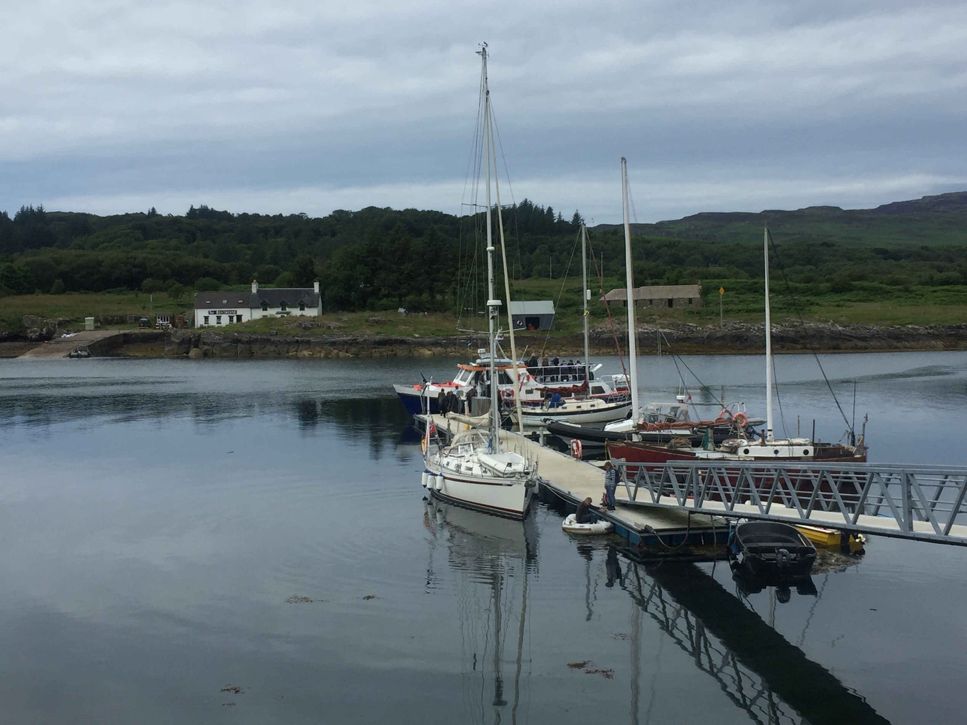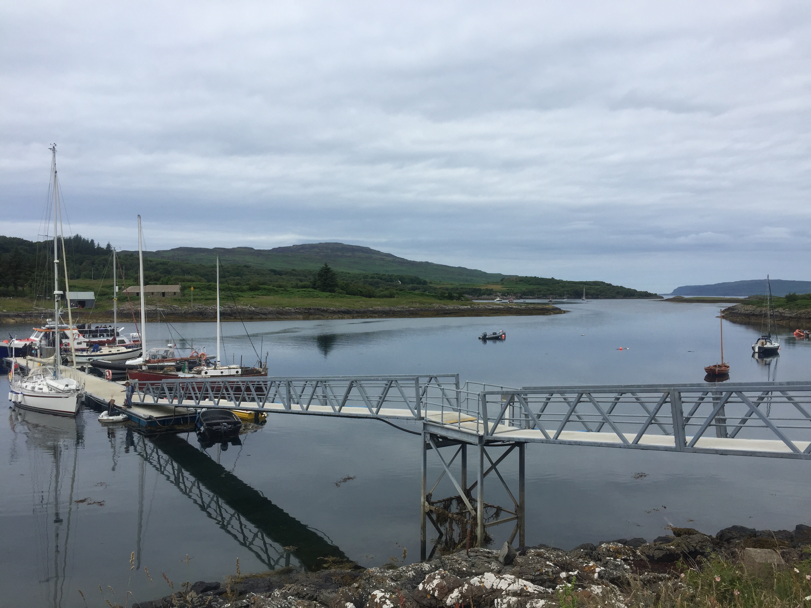 Today was a non sailing day. It was beautiful weather again and we decided to explore Ulva. The little ferry goes from the slipway just near the pontoons . It’s an on demand service that runs from 9 to 5 as many times as it’s needed to cross the 200 m from Mainland Mull to Ulva. you call the ferry by sliding a board to red so he can see it from the other side. We went across about 1030. We wanted to be back by low water as a bit concerned re the boat still being afloat ( not that there would be much we could do about it!) the sky was blue and it was hot! There are various walking trails in the island. No roads.. just tracks which tractors or quad bikes use. Also a really lovely cafe/ restaurant which we hoped we could have lunch at later. First stop was Sheilas Croft….. An old Croft done up. The lady Sheila lived there till the Early 1900s . Also had a bit of a museum attached showing all the history of the Island…. including the vikings, the highland clearances and Starvation point on Ulva 😞…………. We followed the woodland/ farm route which took us through ancient deciduous woods via Ulva house ( what’s the history there🤔?) and also round the coastline. It took us through beautiful wild flower meadows leading towards the sea . The path got more and more overgrown with bracken and brambles and obviously some of the styles and bridges had seen better days. But eventually we came out of the vegetation onto another beautiful grassy track leading back towards the farm and ferry. There were butterflies and dragonflies zipping about and bird song and all sorts of loveliness. Finally got back to “the boathouse “ which was doing a roaring trade. They were serving everyone just seated anywhere.., on the pier on the rocks if there were no tables empty. Lovely to see a vibrant and buzzing venue. J had potted Ulva crab and I had smoked trout quiche. We kept checking across to the pontoons to see if Angeliques mast was still moving ( or was she aground???) when eventually we got back … it was about 50 cm still under the keel. Yay! The afternoon was spent doing laundry by hand… takes ages!!! And also helping people as they come into the pontoons. It’s not the easiest place to berth but definitely one of the most helpful and friendly and we can’t wait to be back!