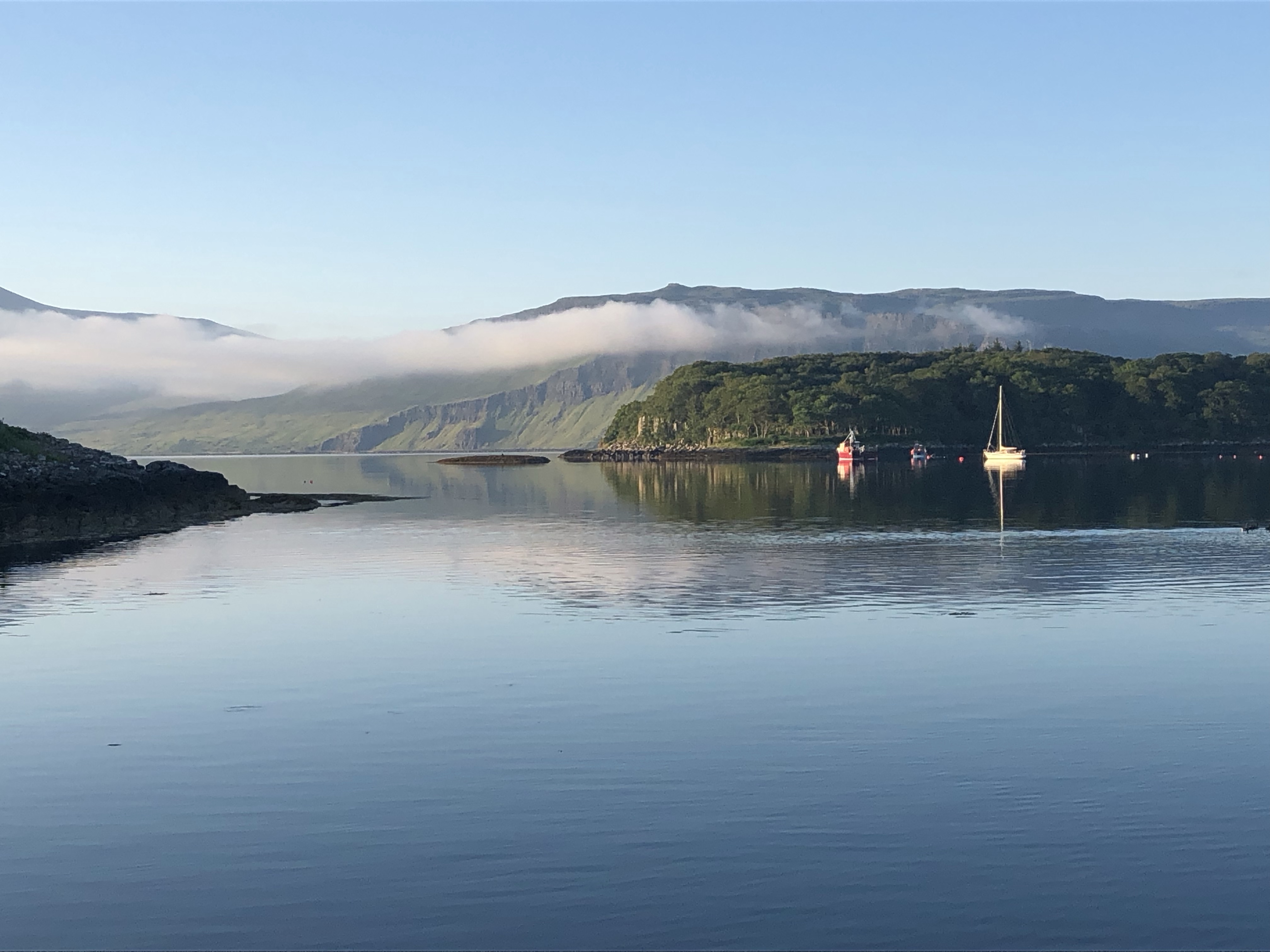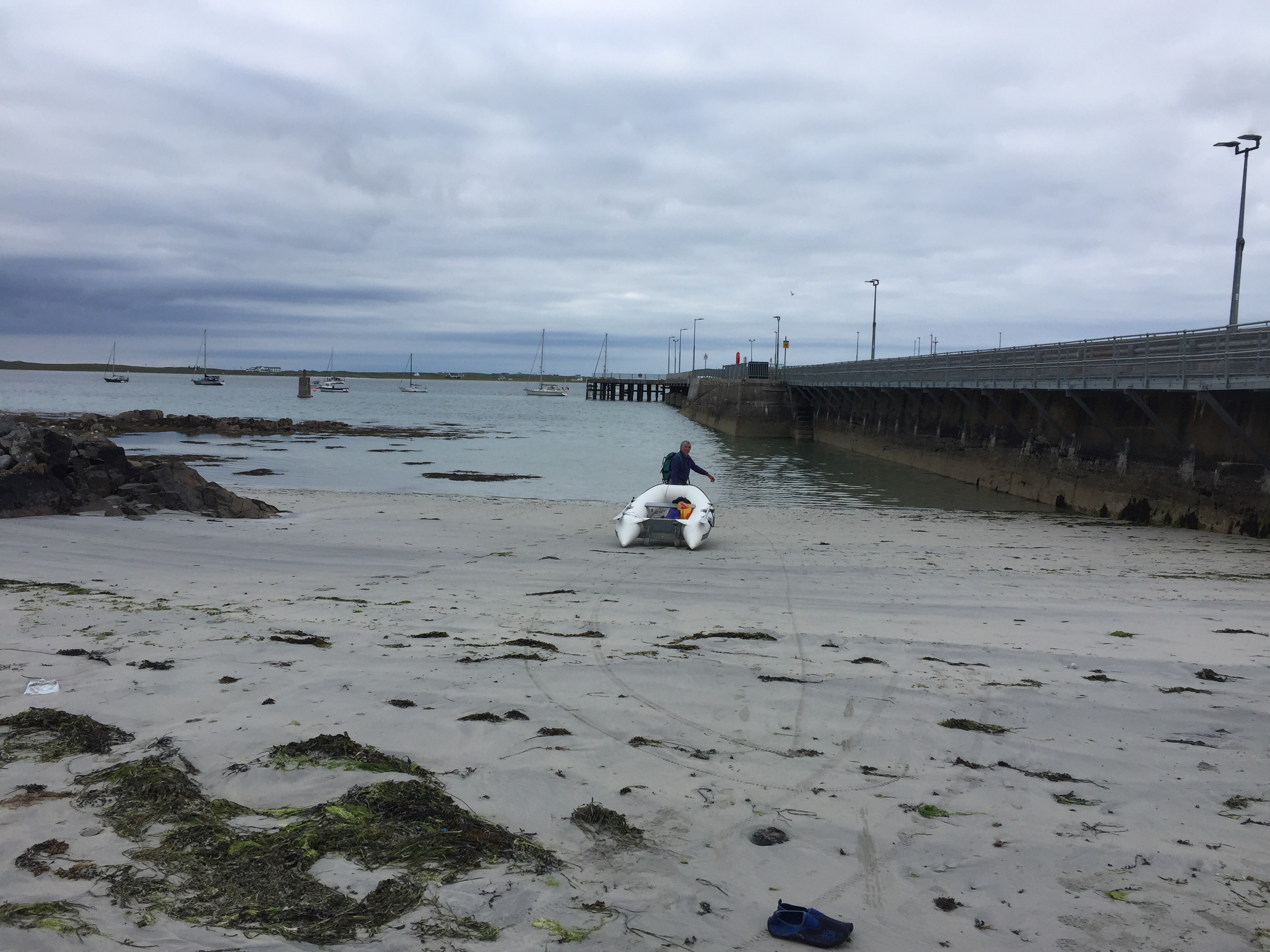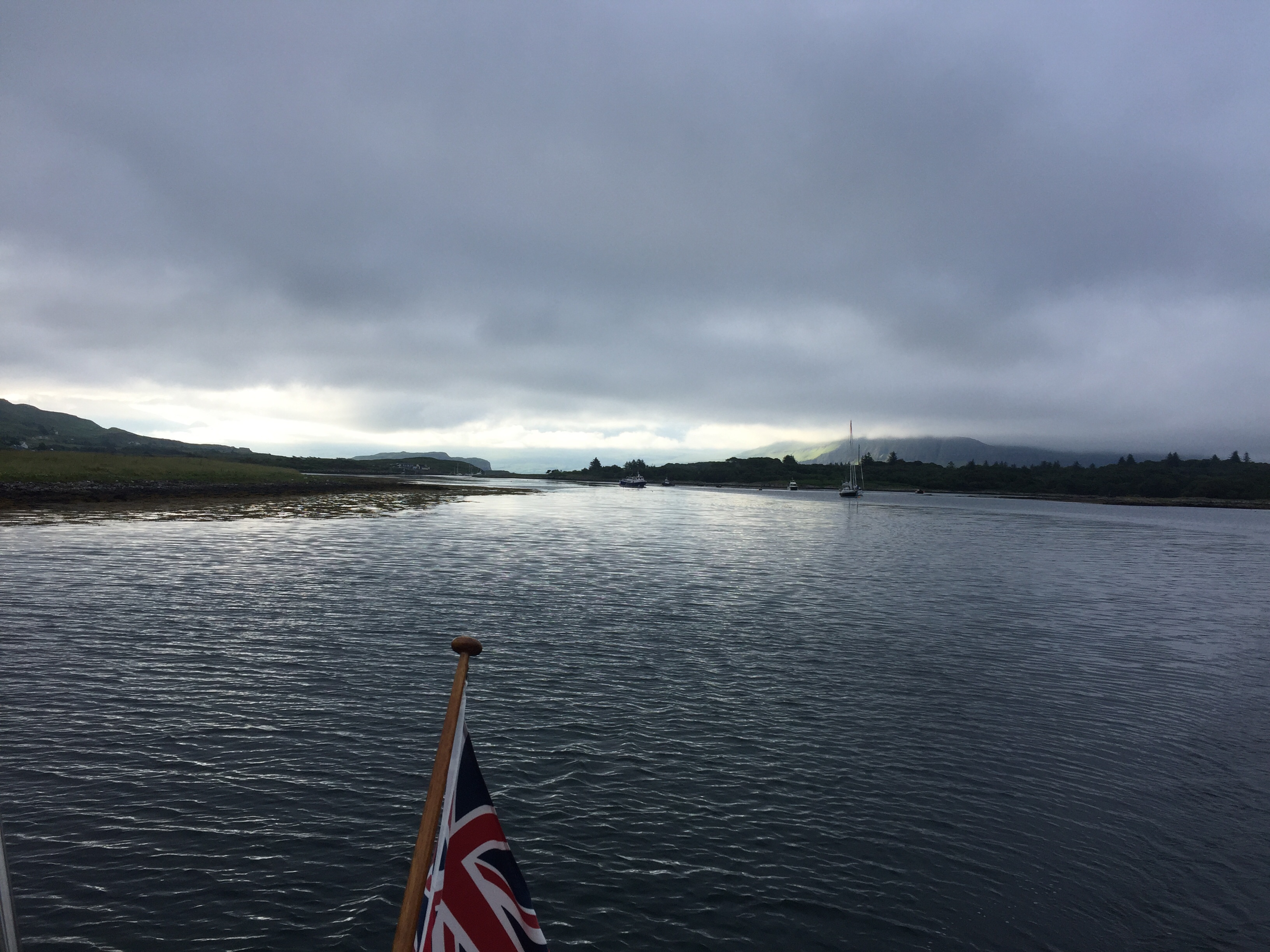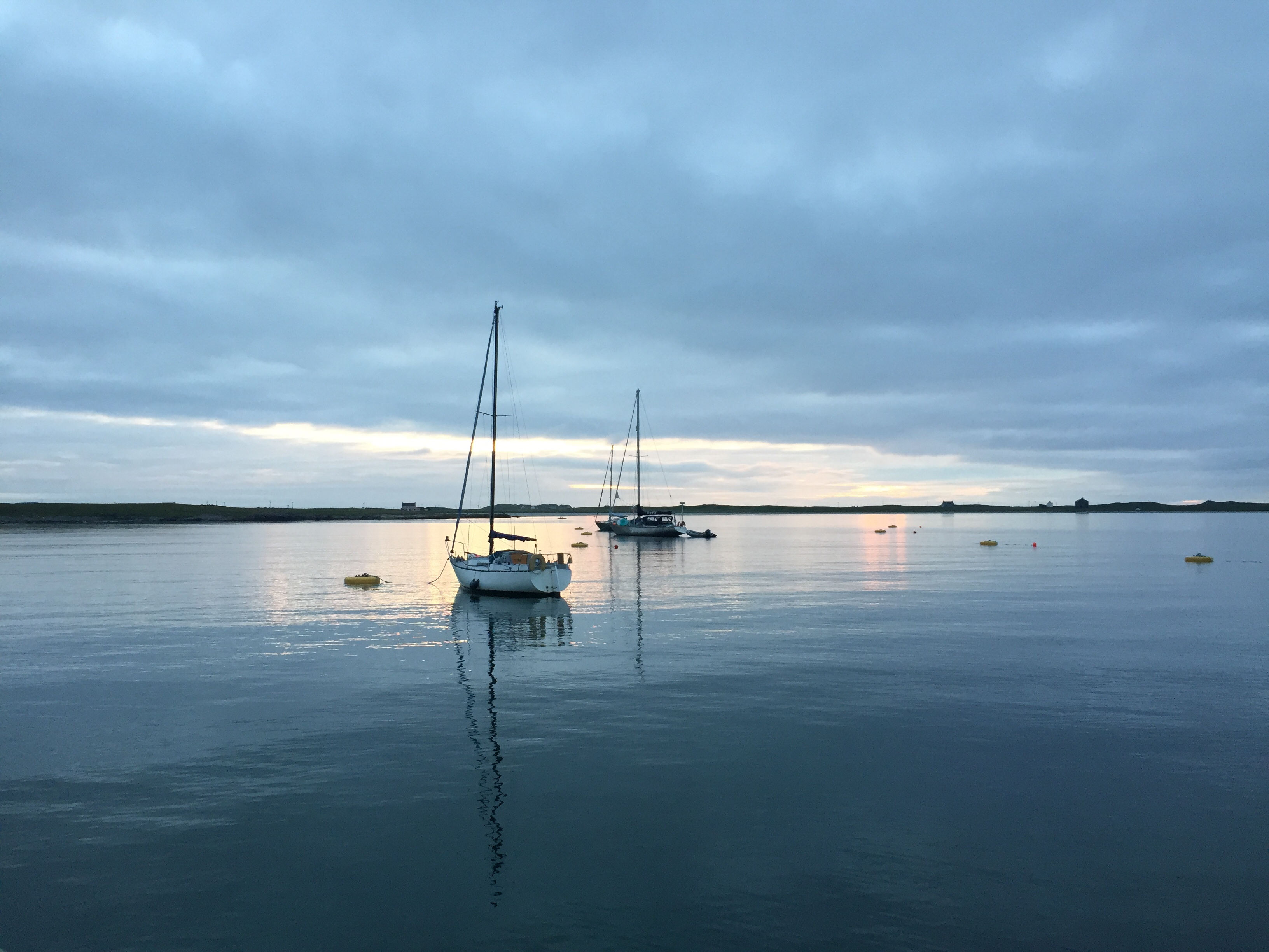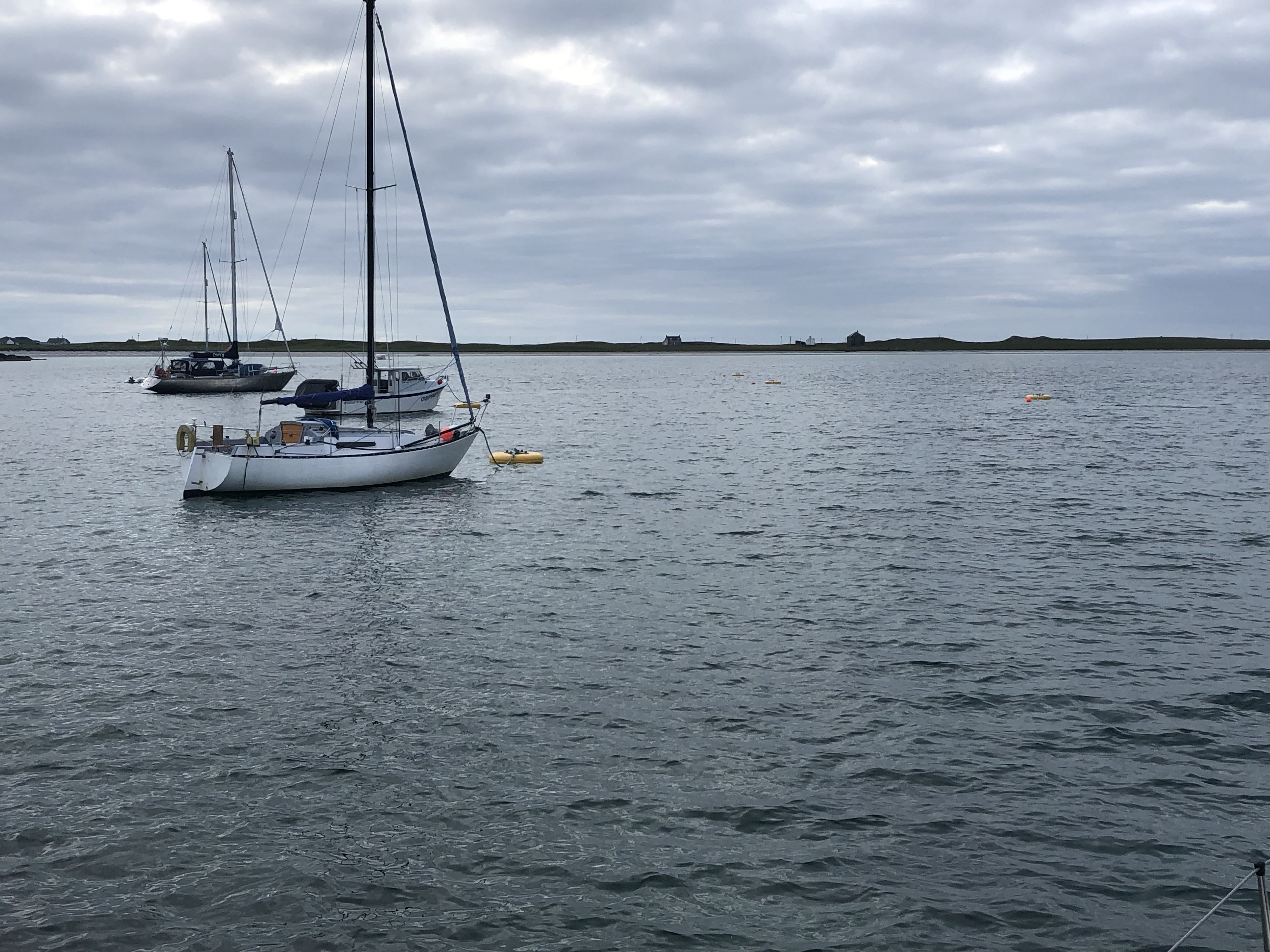 We got up at 6 as needed to be away 0730 in order to get the tides right, going north through Ulva sound. We needed to be going through on a rising tide since it’s a very shallow passage and lots of rocks! Also though in addition to needing enough water, it also wants to be not rushing through! Complicated! Soooo….. went at 0730. At 6 am the weather was gorgeous and we were so lucky, not a breath of wind to complicate things further. Sorted the lines out, springing the bow so the stern went out first and slipped away gently in reverse . The weather by 730 had clouded over and it was sultry and moody as we picked our way through the narrow channel which was also full of pot buoys and moorings😳. Antares chart on the iPad firmly supported on the binnacle, J made the challenge look easy and we emerged into Loch Tuath. Little wind but enough to sail and it was peaceful on the flat gloomy water. Our plan was to go across the sea of Tiree to Ariginour on Coll. We sailed past the Treshnish isles and as the wind was steady and gentle and we had 4g we were able to do a bit of research en route. We changed our plans mid morning as we were getting pushed back by the tide and the wind wasn’t strong enough to counteract it. And decided to go to Tiree instead!as it turned out…. a really good decision! Tiree has always been on the list, one of the reasons being it is where basking sharks can be seen if the planktons in the right place. Despite the wind being on the nose as usual the tacking angle meant we could basically point straight at our destination and we arrived mid afternoon after having a race with a Moody 42 ( they of course were unaware of the race) . Gott bay is stunning. A huge 5 mile wide bay of pure white sand. The backdrop is very Hebridean. Flat and windswept. With lonely white Crofts along the shoreline. We were expecting to anchor… in the anchorage that said “only anchor here in settled weather”, but what a thrill to espy through the binoculars what looked like visitors moorings. 10 identical yellow can, new looking moorings with red pick up buoys just north of the ferry quay. We were thrilled! And only 3 were taken so we could choose the nearest to the shore. Once attached and sorted, we dinghied ashore to explore. What a lovely place! We found the village Scarinish and in it a VERY well stocked coop. So got some groceries and rowed back to Angelique. The huge ferry came in and we were astonished at the number of vehicles getting in and off. It looks huge from where we are! We then had a lovely evening.. watching the news and tv old soaps as for once we had a signal.