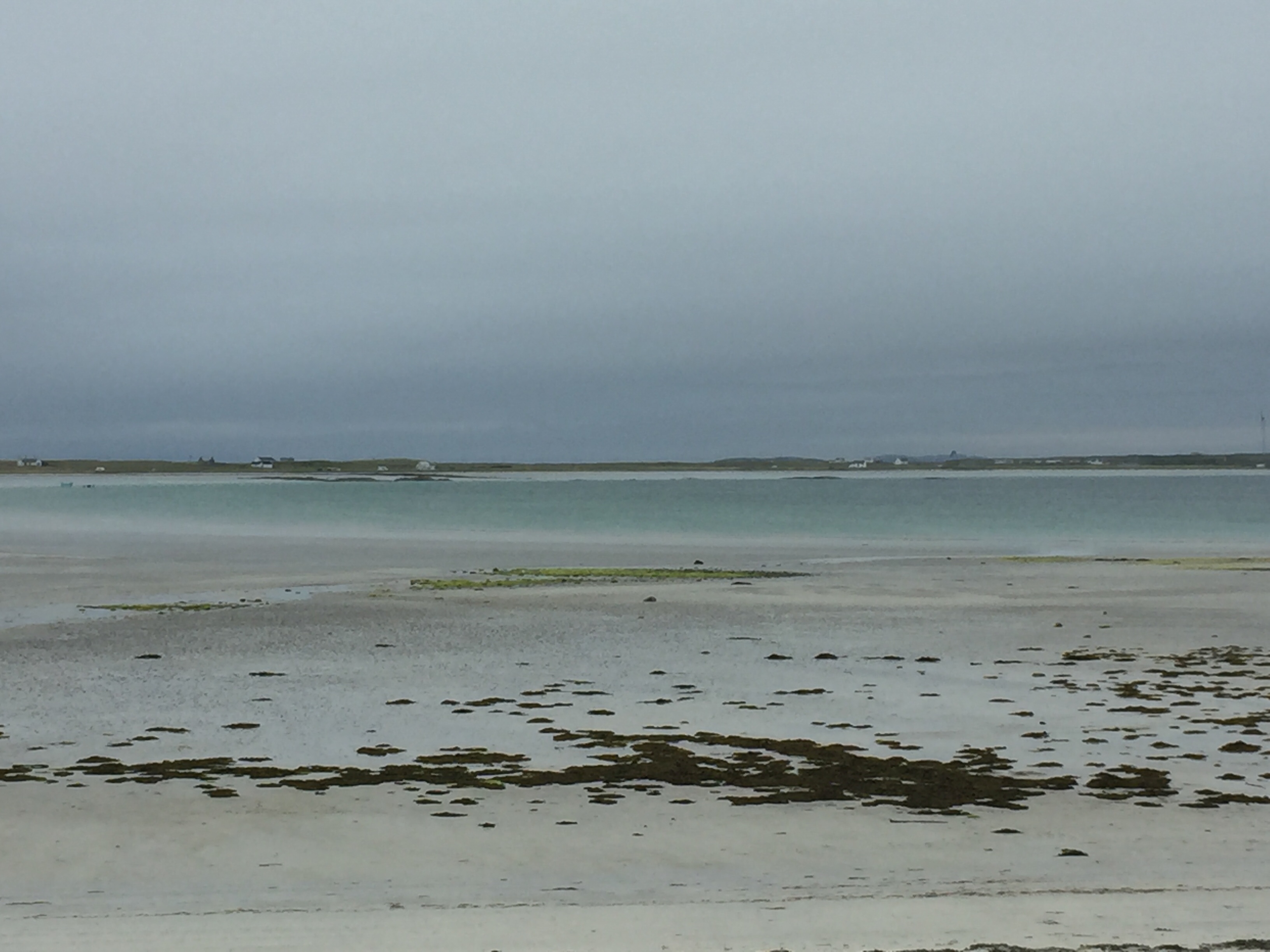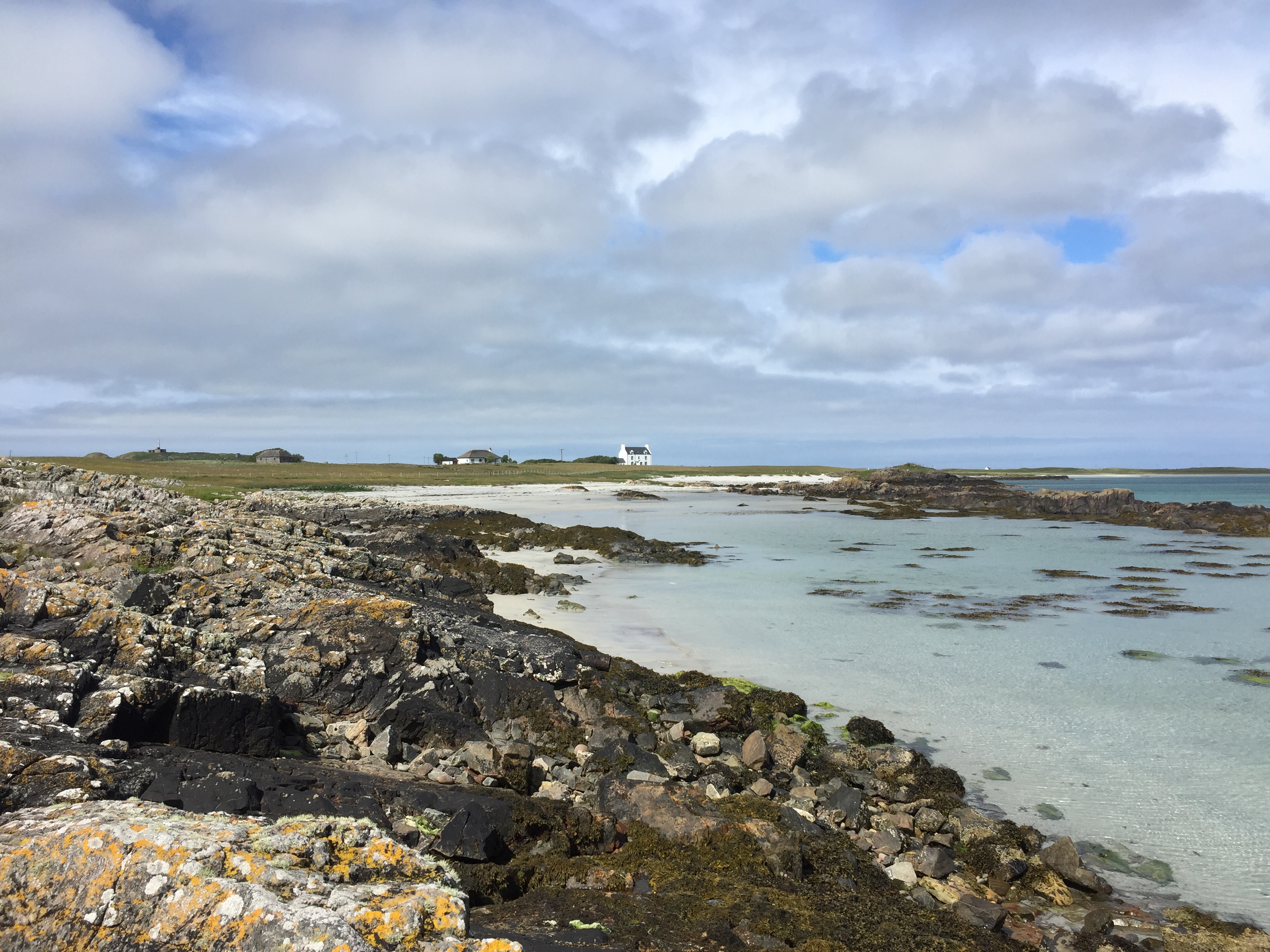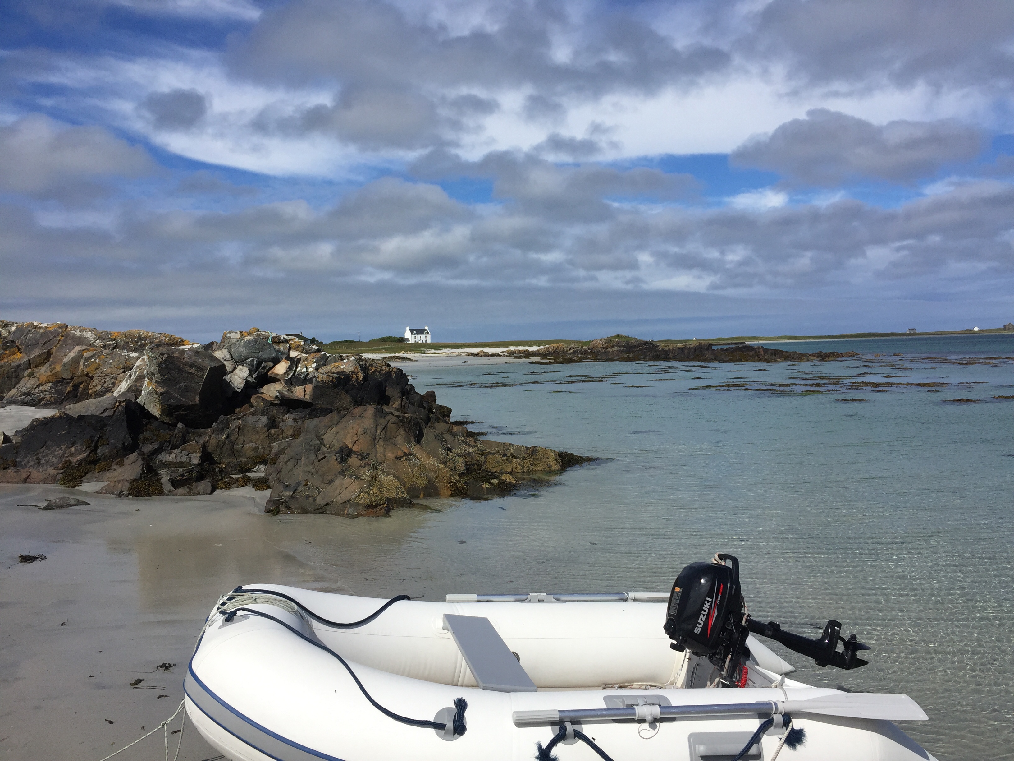 Stayed put today as we wanted to do a bit of exploration . It was a pretty miserable early morning and there was obviously a weather front going over from the west. Looked bleak. A bit disappointed as the rest of the uk is experiencing a heatwave and cloudless blue skies it seems. Anyway it did clear up … to some extent At least stopped raining and warm so we went ashore to buy the gaz canister at great expense! But then it did have a long way to get here. Lovely little shop/ cafe etc . Even have a laundry and shower for future reference. Whilst J was getting the gaz I had been chatting to a couple of sea kayakers … they do what we do but on kayaks. Camping and they carry all their water food and equipment in the little boats. Really interesting . We took the gaz back to the boat and by this time sea looked blue again so donned shorts instead of wet weather stuff and went back to do our exploring. Walking round the amazing white beach of Gott bay we could see kite surfers going so fast! Huge expanse of flat water. The other observations was so-much traffic! Many many camper vans and recreational vehicles. The Island is obviously doing a good staycation trade. We got back to Scarinish and found the hotel still under refurbishment but selling drinks so had a beer and some crisps overlooking the little old harbour. At that point the weather started to close in and we retreated to a covered area. There are sheep everywhere on this island. Just wandering about. I like sheep. but I appear to have no photos of them! Back on the boat we did some planning and J did one of his chicken surprise suppers😋.
