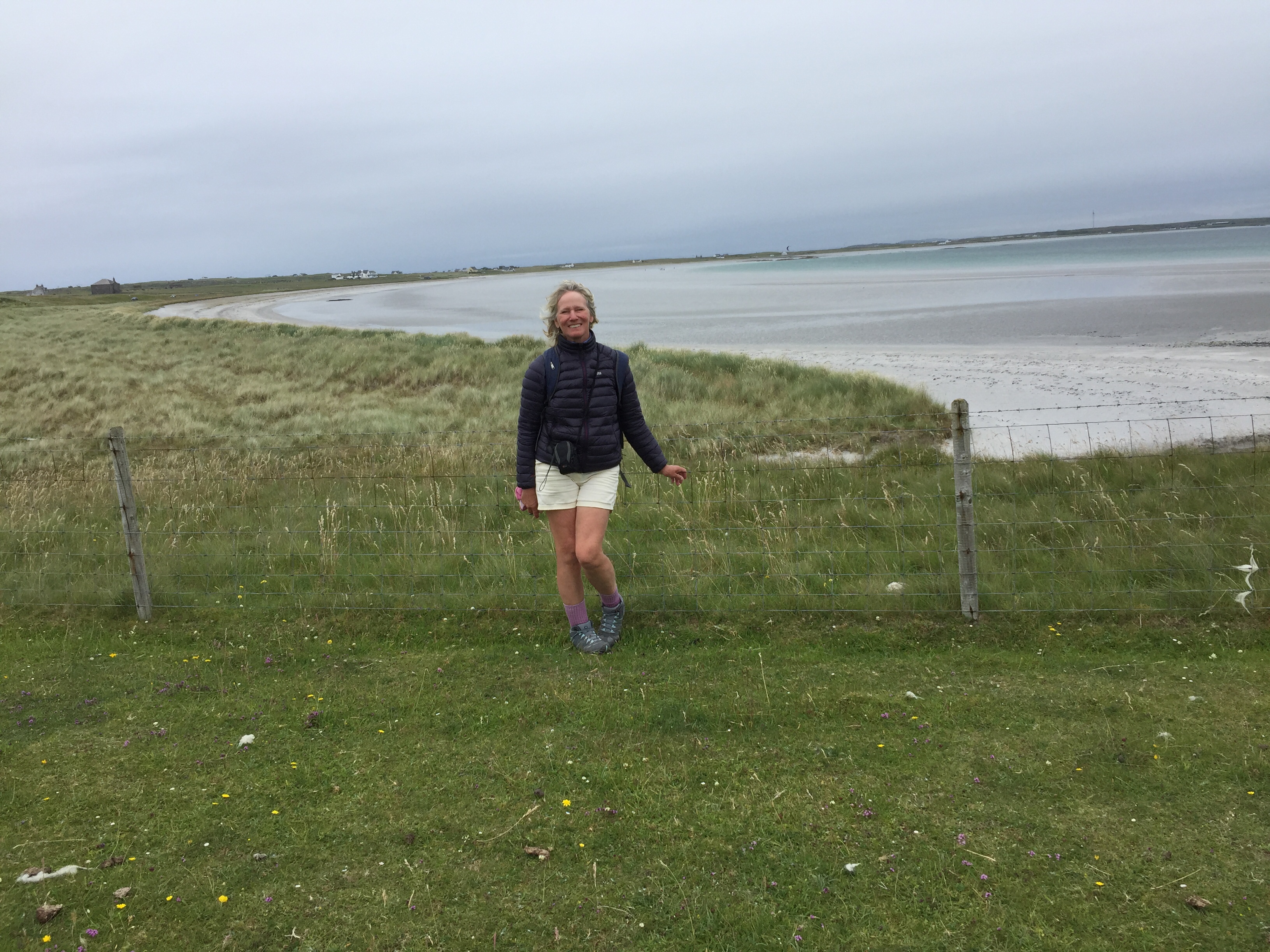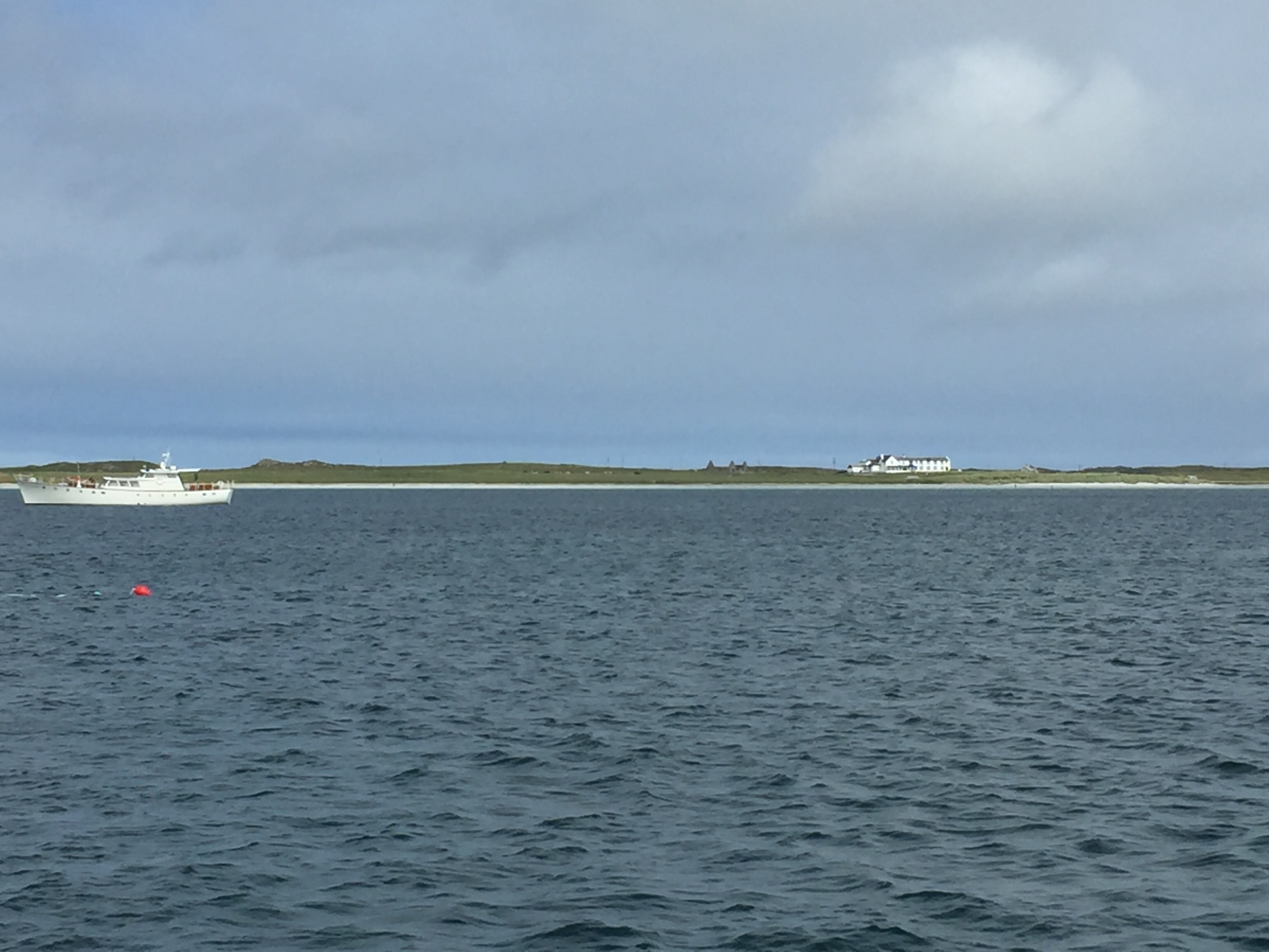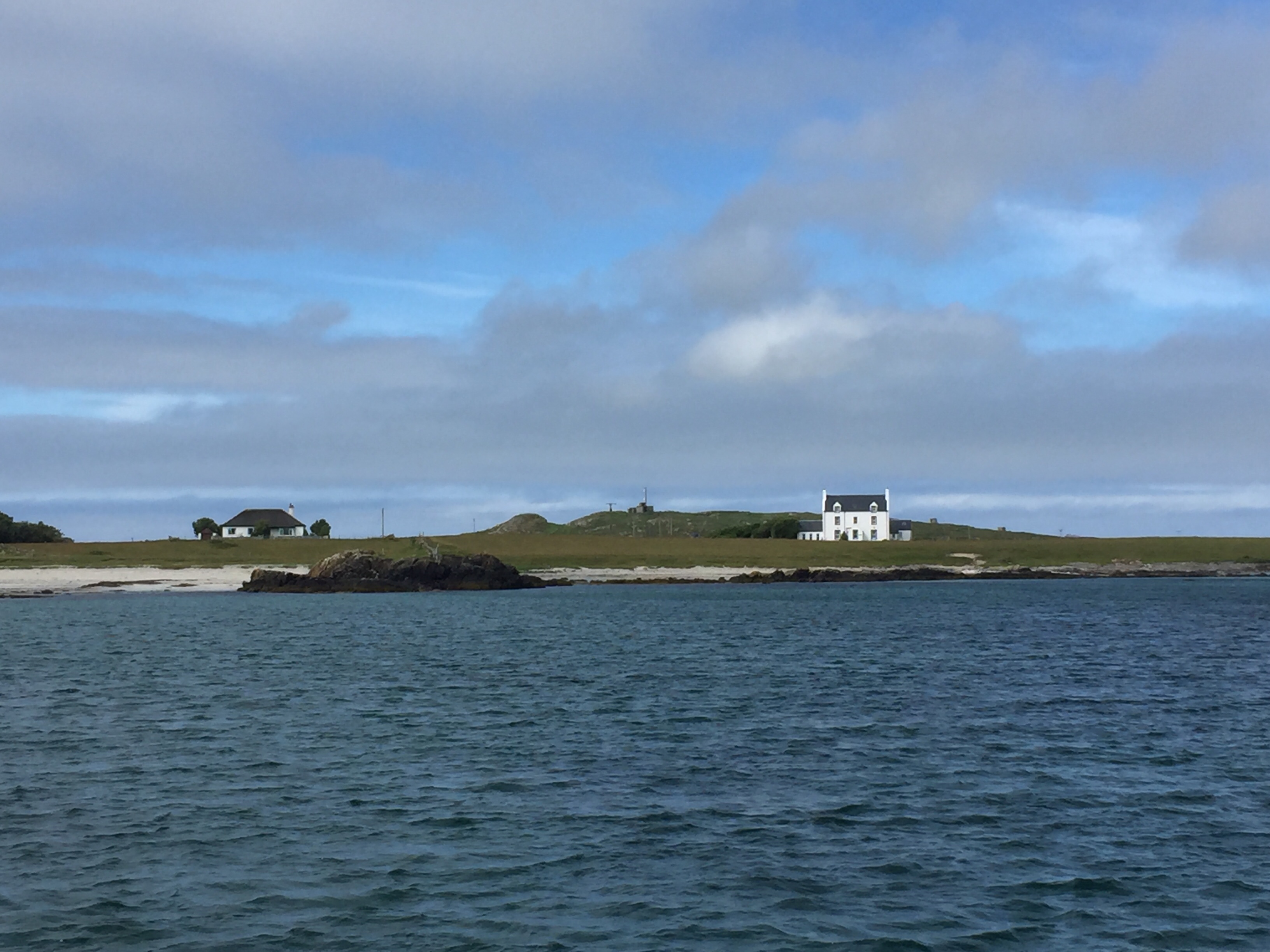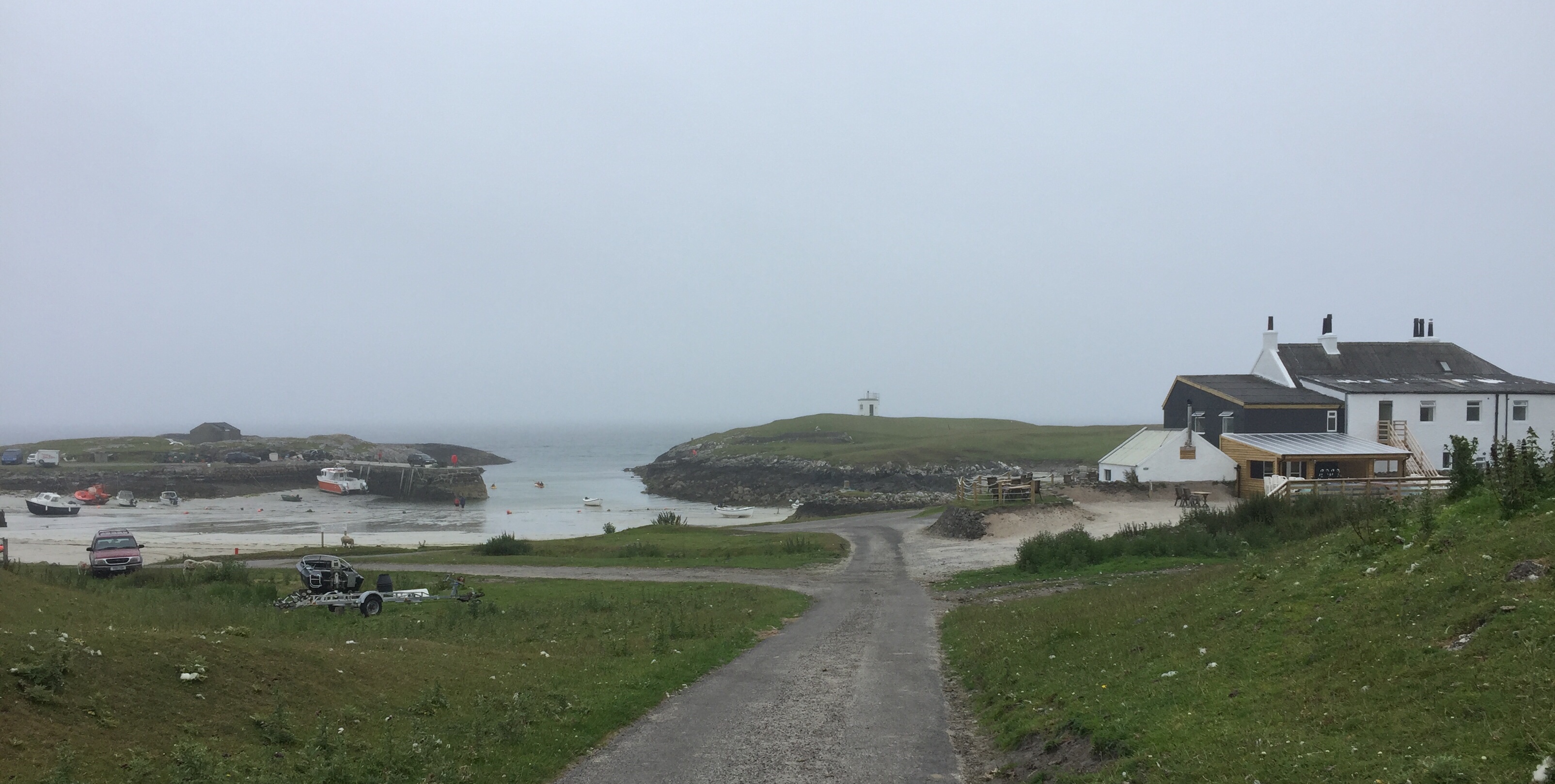 Stayed put today as we wanted to do a bit of exploration . It was a pretty miserable early morning and there was obviously a weather front going over from the west. Looked bleak. A bit disappointed as the rest of the uk is experiencing a heatwave and cloudless blue skies it seems. Anyway it did clear up … to some extent At least stopped raining and warm so we went ashore to buy the gaz canister at great expense! But then it did have a long way to get here. Lovely little shop/ cafe etc . Even have a laundry and shower for future reference. Whilst J was getting the gaz I had been chatting to a couple of sea kayakers … they do what we do but on kayaks. Camping and they carry all their water food and equipment in the little boats. Really interesting . We took the gaz back to the boat and by this time sea looked blue again so donned shorts instead of wet weather stuff and went back to do our exploring. Walking round the amazing white beach of Gott bay we could see kite surfers going so fast! Huge expanse of flat water. The other observations was so-much traffic! Many many camper vans and recreational vehicles. The Island is obviously doing a good staycation trade. We got back to Scarinish and found the hotel still under refurbishment but selling drinks so had a beer and some crisps overlooking the little old harbour. At that point the weather started to close in and we retreated to a covered area. There are sheep everywhere on this island. Just wandering about. I like sheep. but I appear to have no photos of them! Back on the boat we did some planning and J did one of his chicken surprise suppers😋.