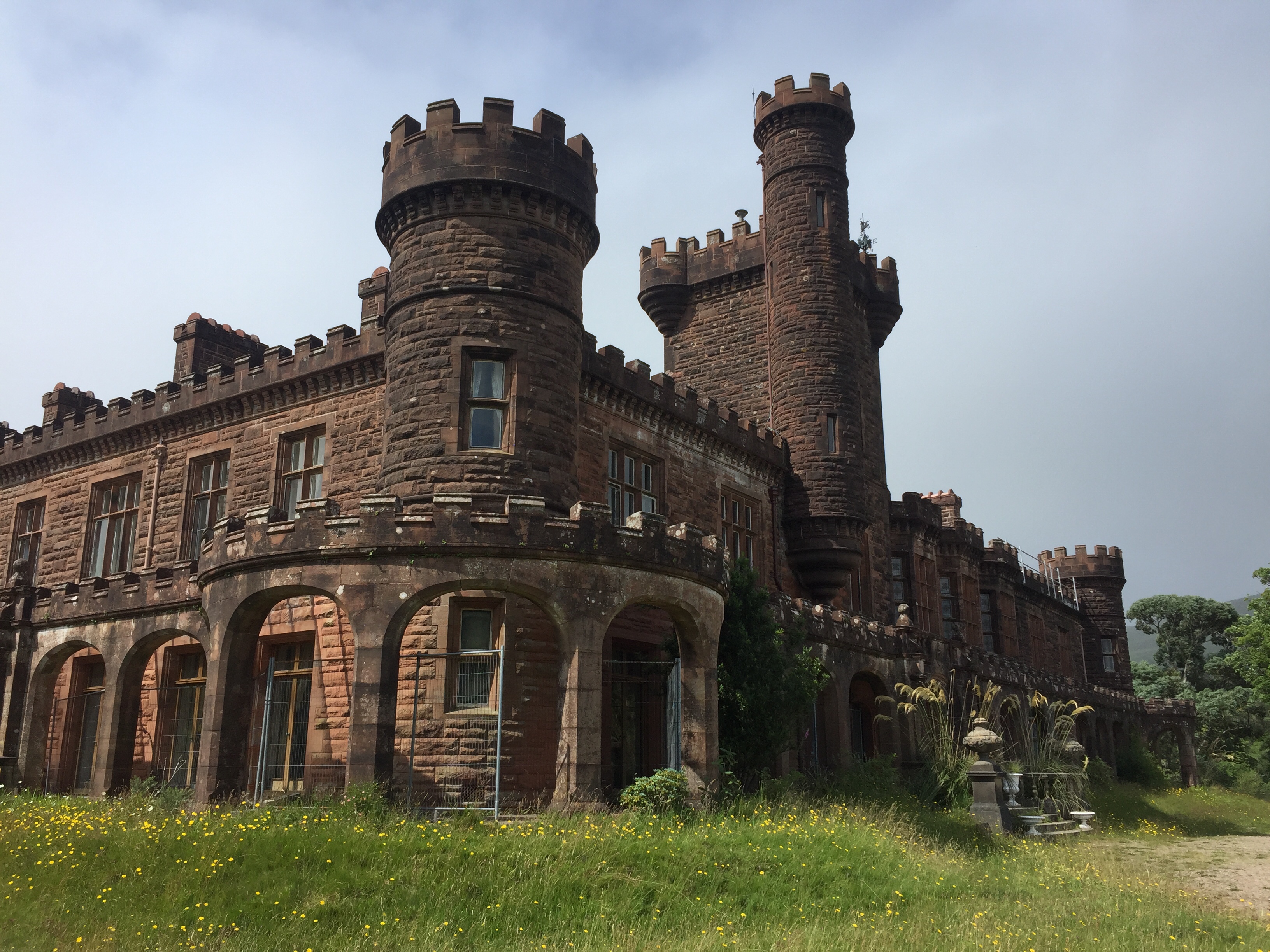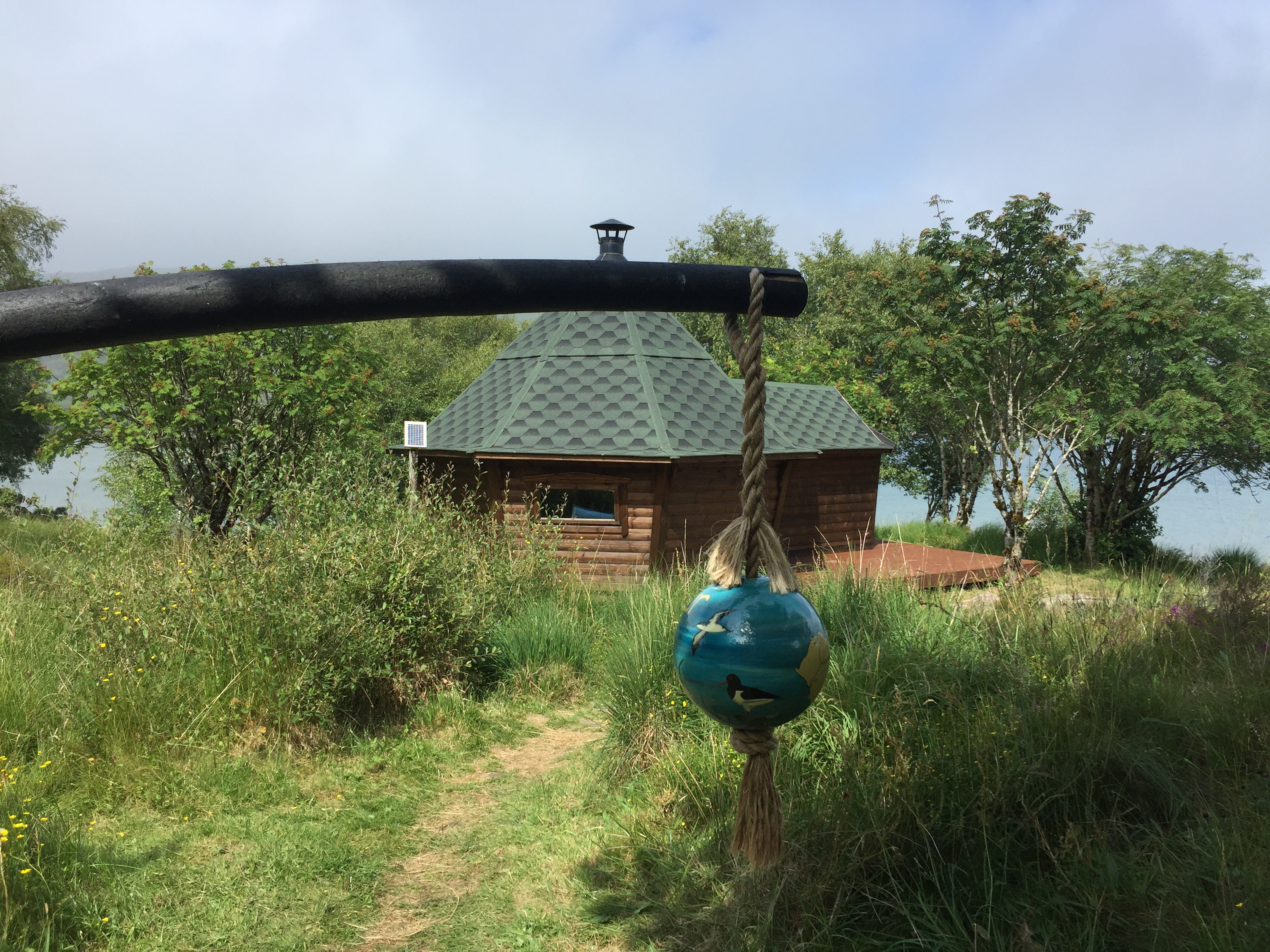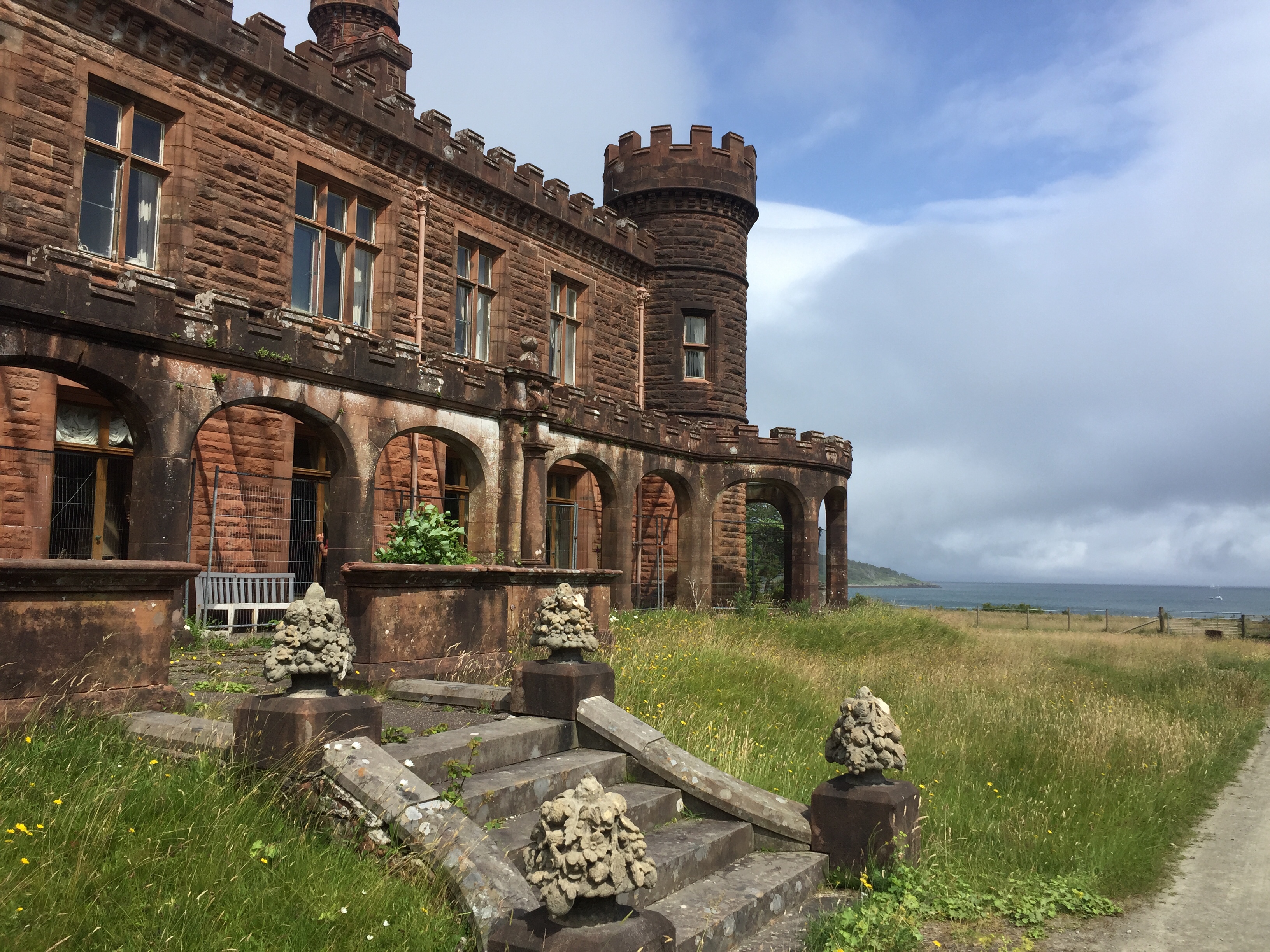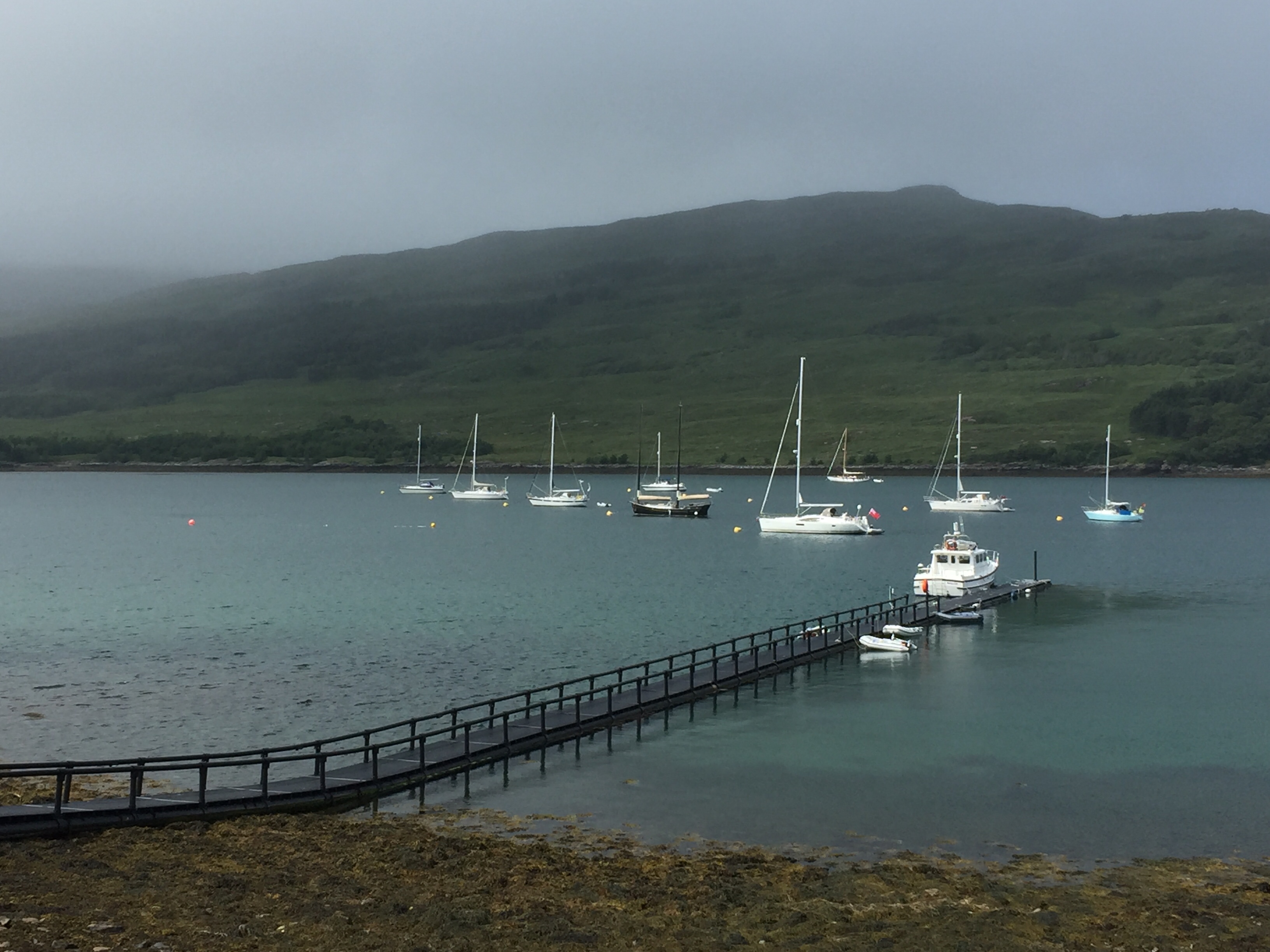 The wind was still funnelling down the valley creating quite strong breeze in the bay. This lasted the whole time we were there . We too the dinghy ashore and set off to explore. There are no tarmac roads just dirt tracks on the island. We landed the dinghy on the far side of the long pontoon ( my idea 👍) so it was on the calm side. All The other ones were moored up on the windward side and were bouncing around all over the place, presumably getting a bit wet! But it’s an observation ….. we humans are like sheep and tend to follow what previous people did. When we got back they were all on our side! We noted that a water tap and hose had been placed conveniently on the pontoon, excellent as we’d brought our water cans over for filling. Walking along the shore we noted a trail marked otter hide so thought we’d do that on the way back. A very leafy shore so grateful for the breeze as had forgotten to bring the insect repellent ☹️. First came across glam ping pods … a shut tourist information hut…. the bunkhouse ( amazing.. check it out) , a tiny craft shop selling crocheted bikini tops amongst other lovely things, and eventually ended up at the village shop and post office. Here there was also a shack doing food … but only open certain times. We bought some handwash stuff and a couple of ice creams and I posted a birthday card for Will but we’ll see whether it arrives! We then set if in a short circular walk into the interior of the island. Such a shame the cloud was still low as the views of the mountains would I’m sure have been wonderful. No midges thank goodness but a lot of cleggs ( aggressive horse flies ) have lots of bites! The path led down a peaty stream/ river and eventually rejoined the main road. From here we returned via a look at Kinloch Castle. What a strange, amazing but sad place. Unlived in and looking very unloved. Worth checking out its history. It’s in a state of dereliction but the interior looks just like the dusty setting for a Agatha Christie drama …. just no people there. Still furniture, books, artefacts, tea services and stuffed eagles in glass cases. Even a snooker table with the balls still on the table and just left. Completely bizarre. Just to the right of the castle I saw the most beautiful stag with huge antlers…. just standing, staring at me still as anything. I thought for a moment it was a model, or stuffed or something…. until It moved its head and then slowly ambled away into the greenery. Left me humbled once again. The next stop was the otter walk to the hide and then back to the boat. We filled up our water cans with rather peaty looking water, but did a taste check and it seemed fine!