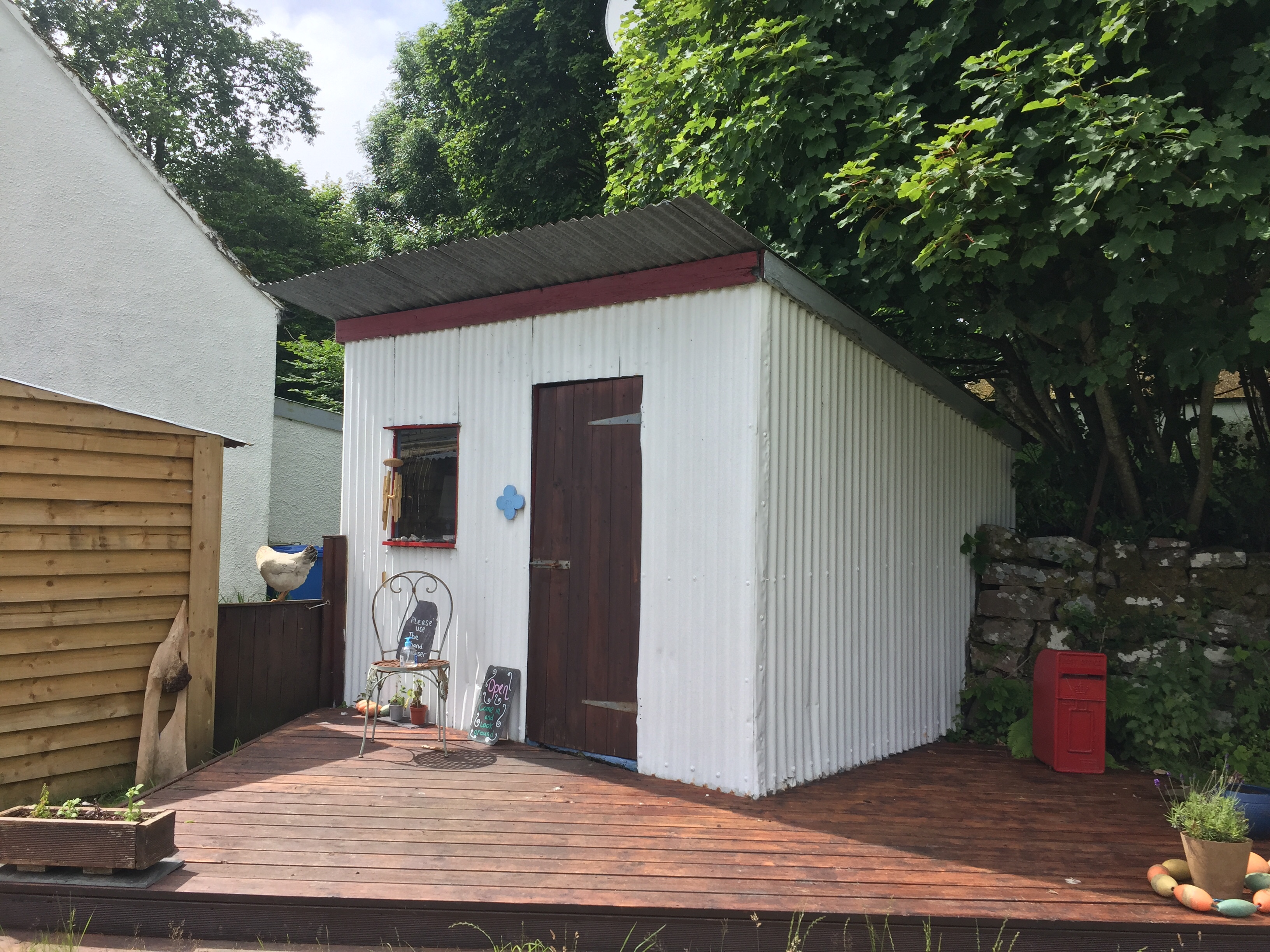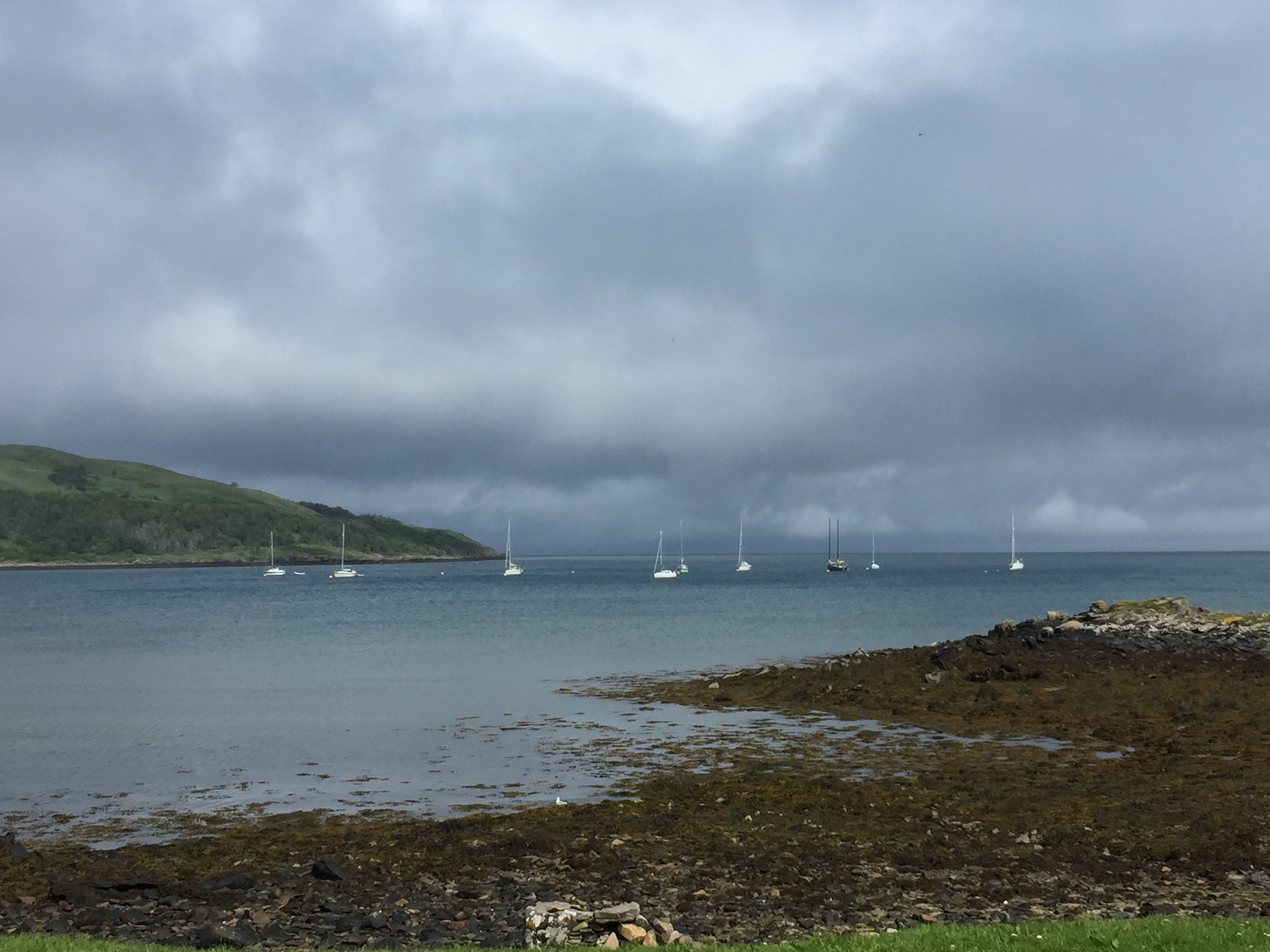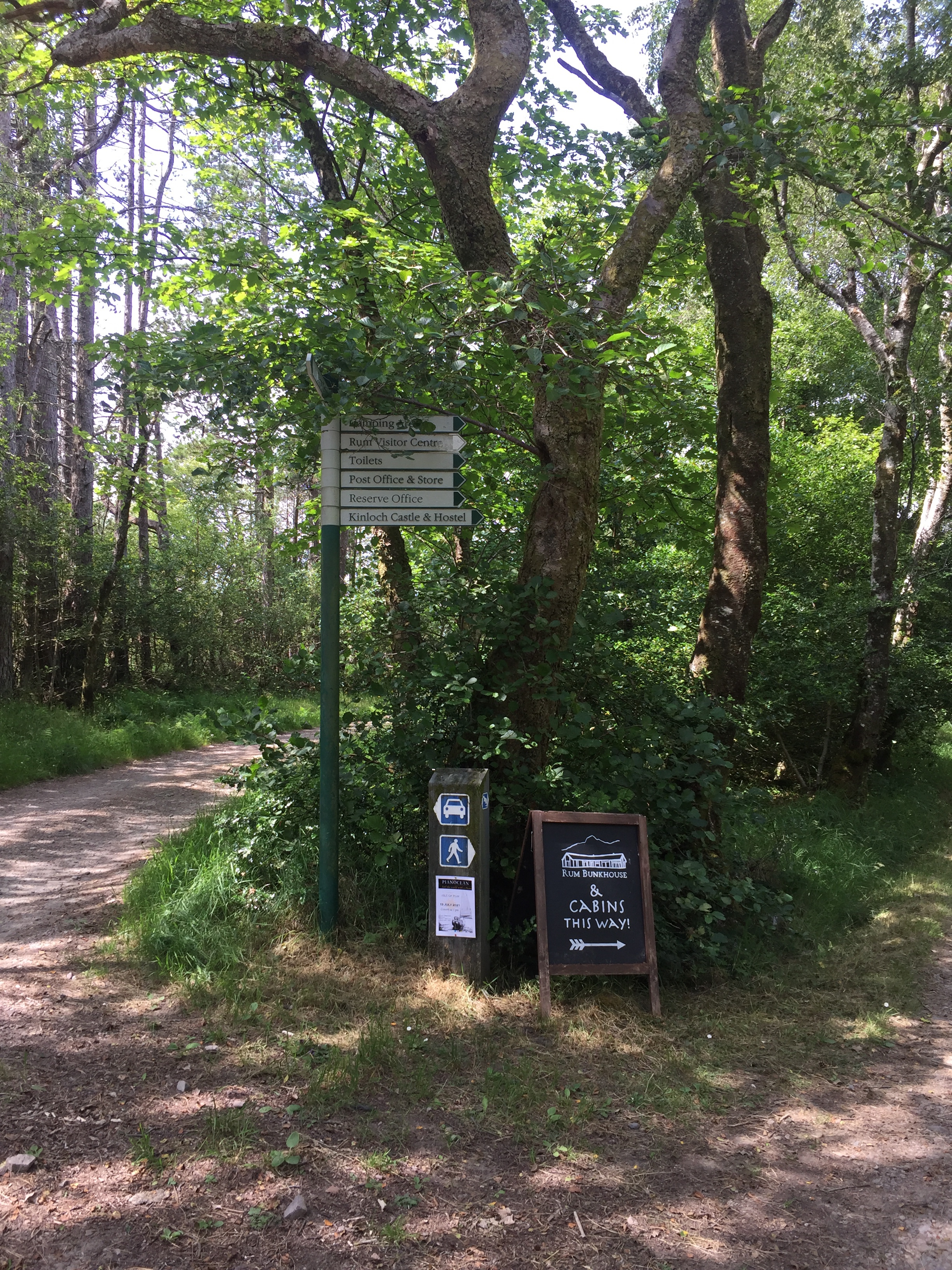 The wind was still funnelling down the valley creating quite strong breeze in the bay. This lasted the whole time we were there . We too the dinghy ashore and set off to explore. There are no tarmac roads just dirt tracks on the island. We landed the dinghy on the far side of the long pontoon ( my idea 👍) so it was on the calm side. All The other ones were moored up on the windward side and were bouncing around all over the place, presumably getting a bit wet! But it’s an observation ….. we humans are like sheep and tend to follow what previous people did. When we got back they were all on our side! We noted that a water tap and hose had been placed conveniently on the pontoon, excellent as we’d brought our water cans over for filling. Walking along the shore we noted a trail marked otter hide so thought we’d do that on the way back. A very leafy shore so grateful for the breeze as had forgotten to bring the insect repellent ☹️. First came across glam ping pods … a shut tourist information hut…. the bunkhouse ( amazing.. check it out) , a tiny craft shop selling crocheted bikini tops amongst other lovely things, and eventually ended up at the village shop and post office. Here there was also a shack doing food … but only open certain times. We bought some handwash stuff and a couple of ice creams and I posted a birthday card for Will but we’ll see whether it arrives! We then set if in a short circular walk into the interior of the island. Such a shame the cloud was still low as the views of the mountains would I’m sure have been wonderful. No midges thank goodness but a lot of cleggs ( aggressive horse flies ) have lots of bites! The path led down a peaty stream/ river and eventually rejoined the main road. From here we returned via a look at Kinloch Castle. What a strange, amazing but sad place. Unlived in and looking very unloved. Worth checking out its history. It’s in a state of dereliction but the interior looks just like the dusty setting for a Agatha Christie drama …. just no people there. Still furniture, books, artefacts, tea services and stuffed eagles in glass cases. Even a snooker table with the balls still on the table and just left. Completely bizarre. Just to the right of the castle I saw the most beautiful stag with huge antlers…. just standing, staring at me still as anything. I thought for a moment it was a model, or stuffed or something…. until It moved its head and then slowly ambled away into the greenery. Left me humbled once again. The next stop was the otter walk to the hide and then back to the boat. We filled up our water cans with rather peaty looking water, but did a taste check and it seemed fine!