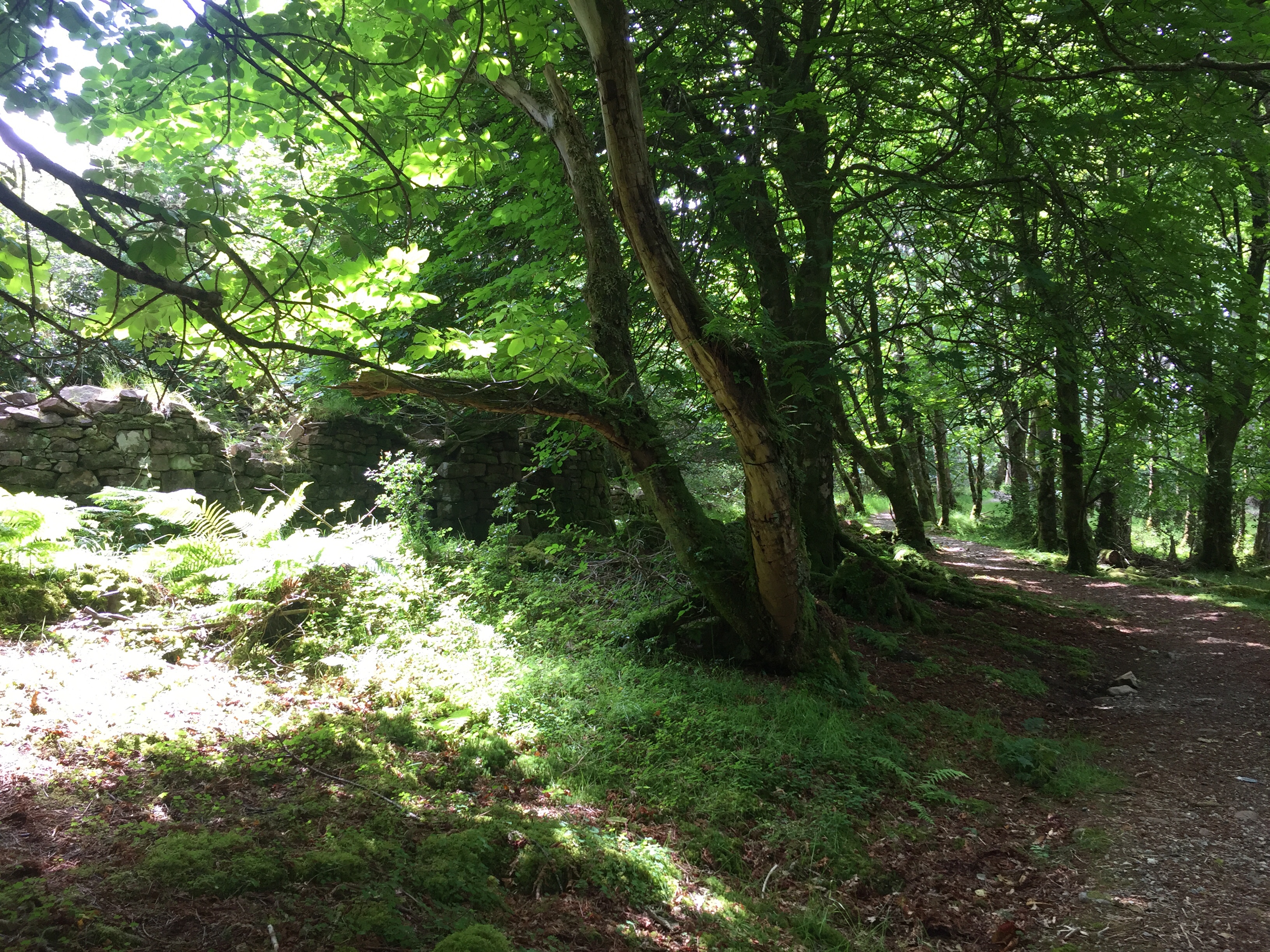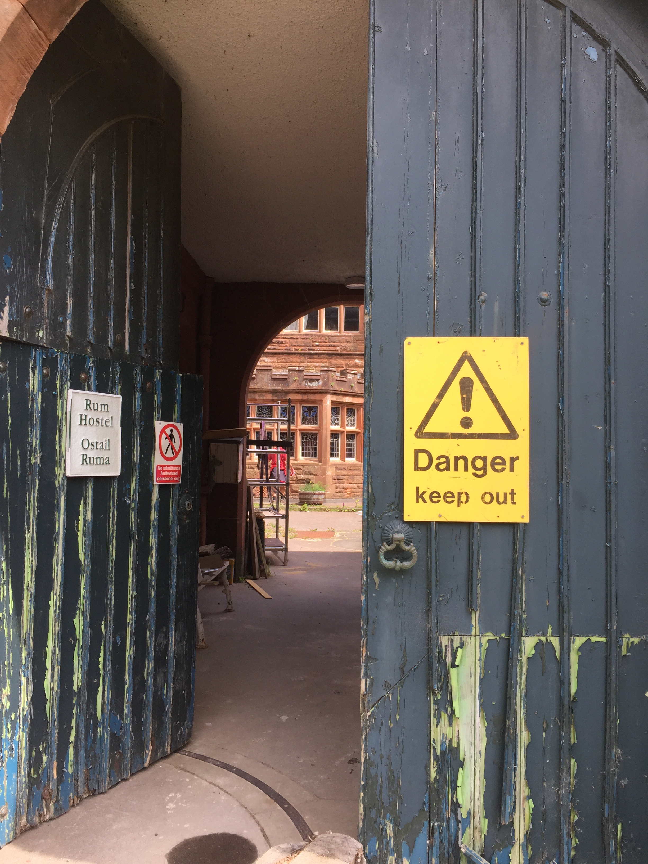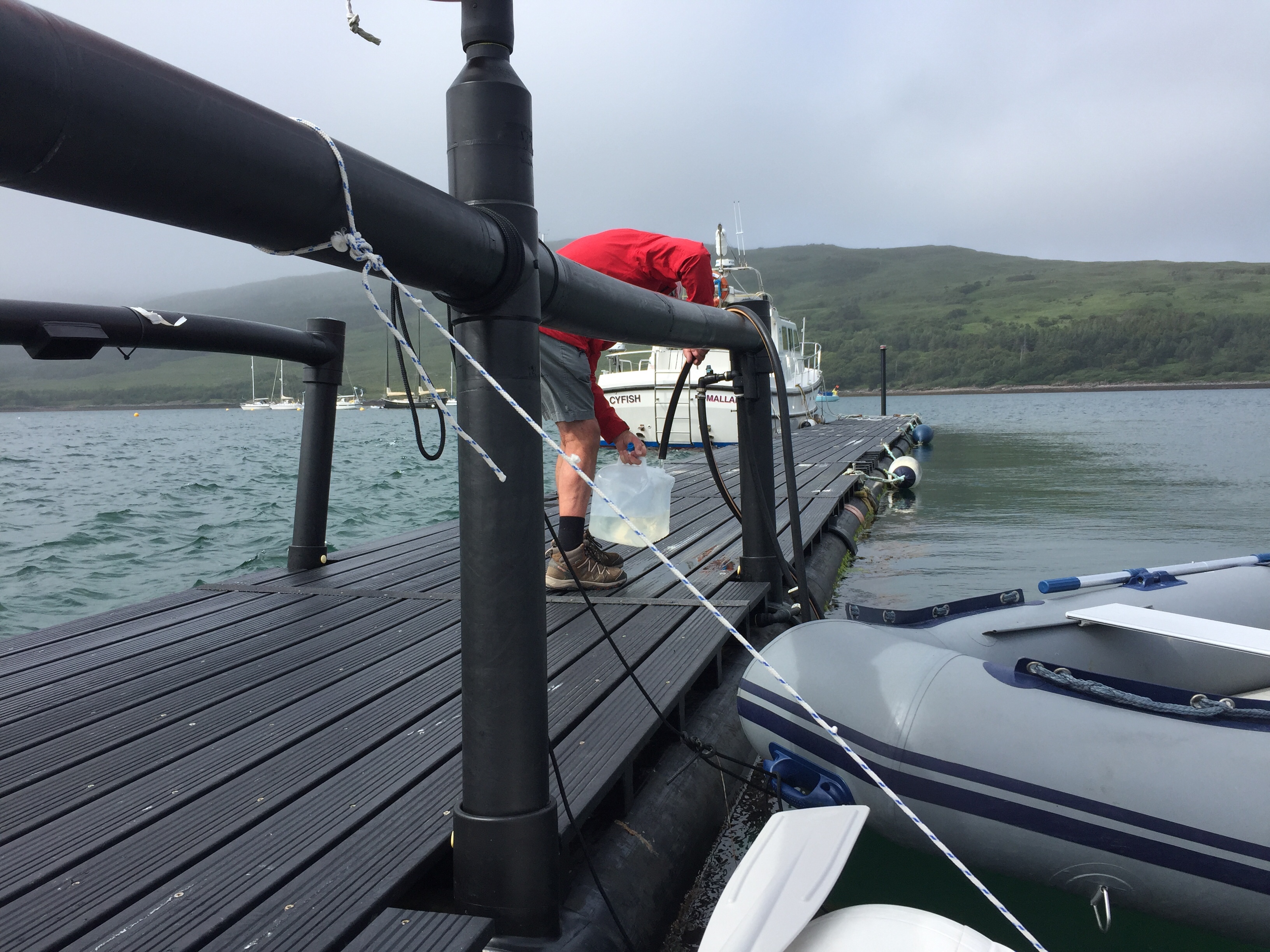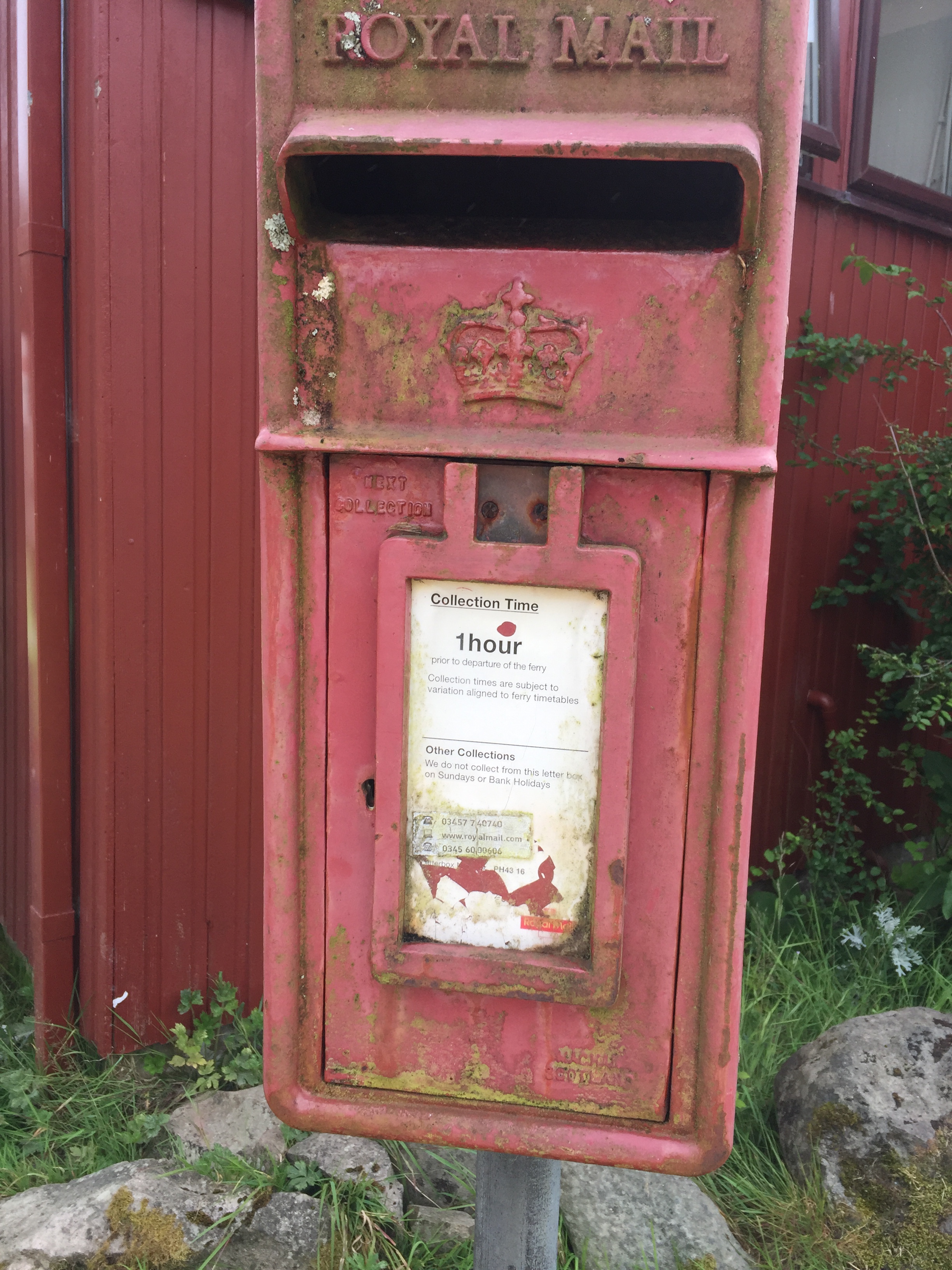 The wind was still funnelling down the valley creating quite strong breeze in the bay. This lasted the whole time we were there . We too the dinghy ashore and set off to explore. There are no tarmac roads just dirt tracks on the island. We landed the dinghy on the far side of the long pontoon ( my idea 👍) so it was on the calm side. All The other ones were moored up on the windward side and were bouncing around all over the place, presumably getting a bit wet! But it’s an observation ….. we humans are like sheep and tend to follow what previous people did. When we got back they were all on our side! We noted that a water tap and hose had been placed conveniently on the pontoon, excellent as we’d brought our water cans over for filling. Walking along the shore we noted a trail marked otter hide so thought we’d do that on the way back. A very leafy shore so grateful for the breeze as had forgotten to bring the insect repellent ☹️. First came across glam ping pods … a shut tourist information hut…. the bunkhouse ( amazing.. check it out) , a tiny craft shop selling crocheted bikini tops amongst other lovely things, and eventually ended up at the village shop and post office. Here there was also a shack doing food … but only open certain times. We bought some handwash stuff and a couple of ice creams and I posted a birthday card for Will but we’ll see whether it arrives! We then set if in a short circular walk into the interior of the island. Such a shame the cloud was still low as the views of the mountains would I’m sure have been wonderful. No midges thank goodness but a lot of cleggs ( aggressive horse flies ) have lots of bites! The path led down a peaty stream/ river and eventually rejoined the main road. From here we returned via a look at Kinloch Castle. What a strange, amazing but sad place. Unlived in and looking very unloved. Worth checking out its history. It’s in a state of dereliction but the interior looks just like the dusty setting for a Agatha Christie drama …. just no people there. Still furniture, books, artefacts, tea services and stuffed eagles in glass cases. Even a snooker table with the balls still on the table and just left. Completely bizarre. Just to the right of the castle I saw the most beautiful stag with huge antlers…. just standing, staring at me still as anything. I thought for a moment it was a model, or stuffed or something…. until It moved its head and then slowly ambled away into the greenery. Left me humbled once again. The next stop was the otter walk to the hide and then back to the boat. We filled up our water cans with rather peaty looking water, but did a taste check and it seemed fine!