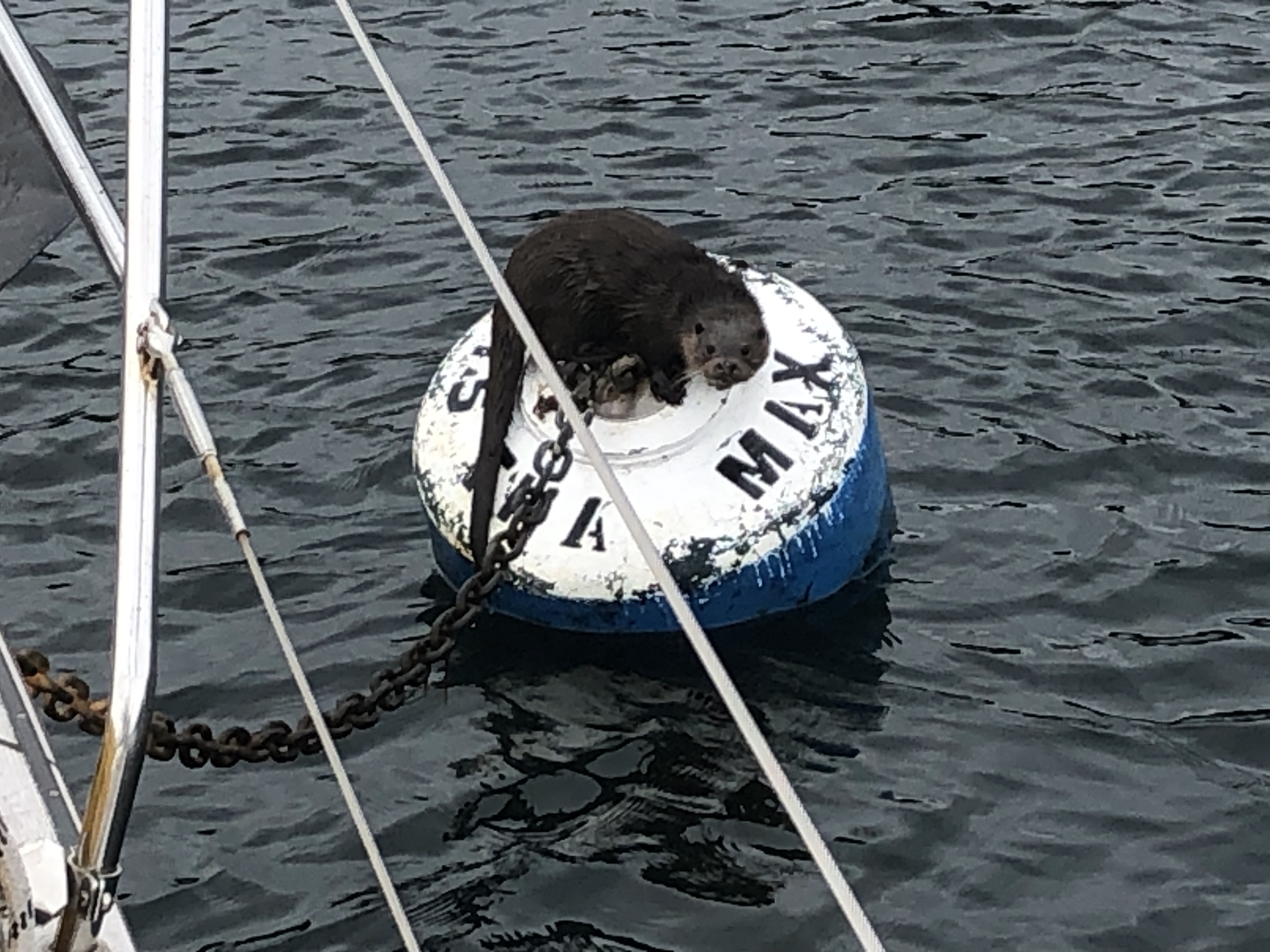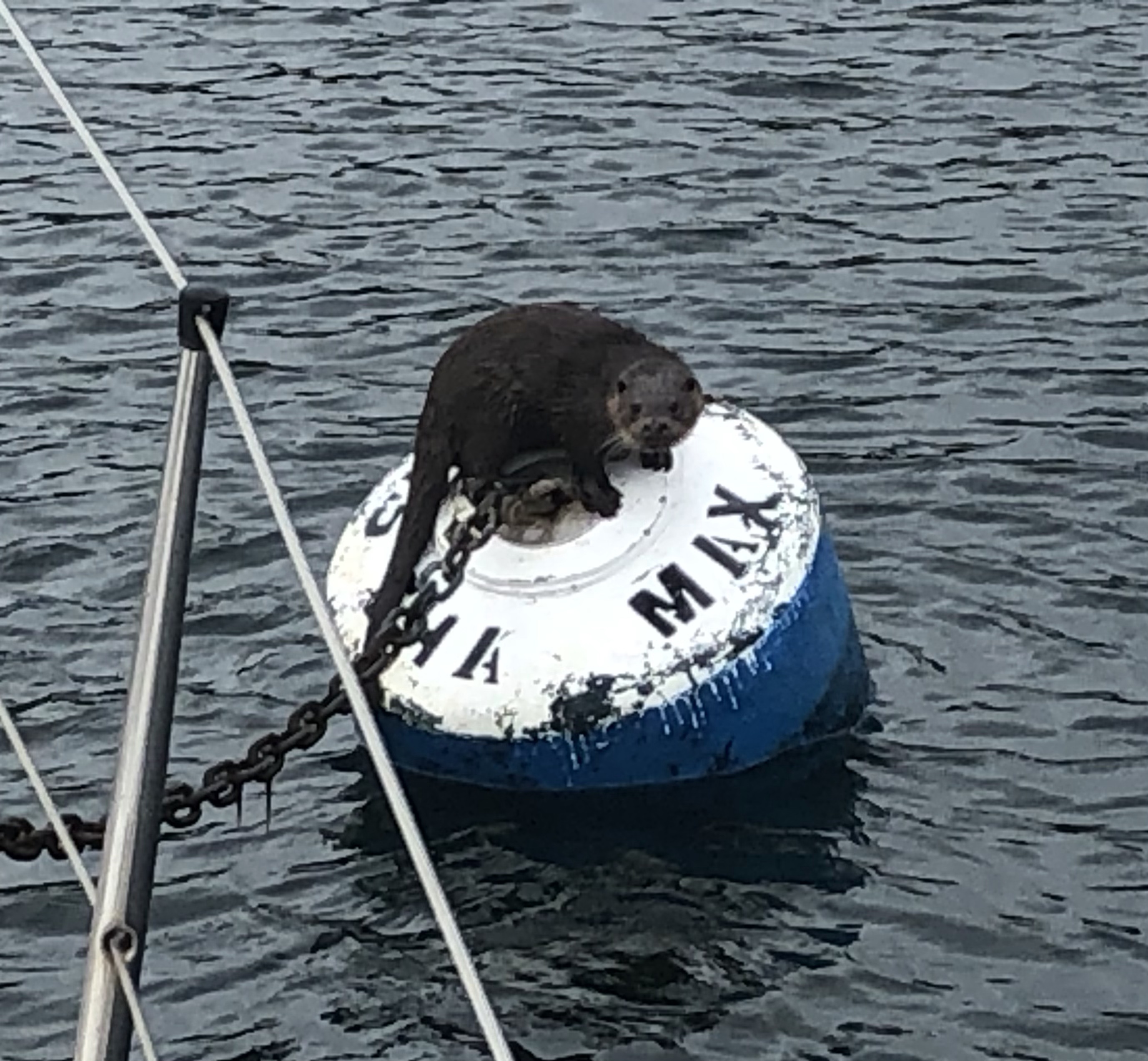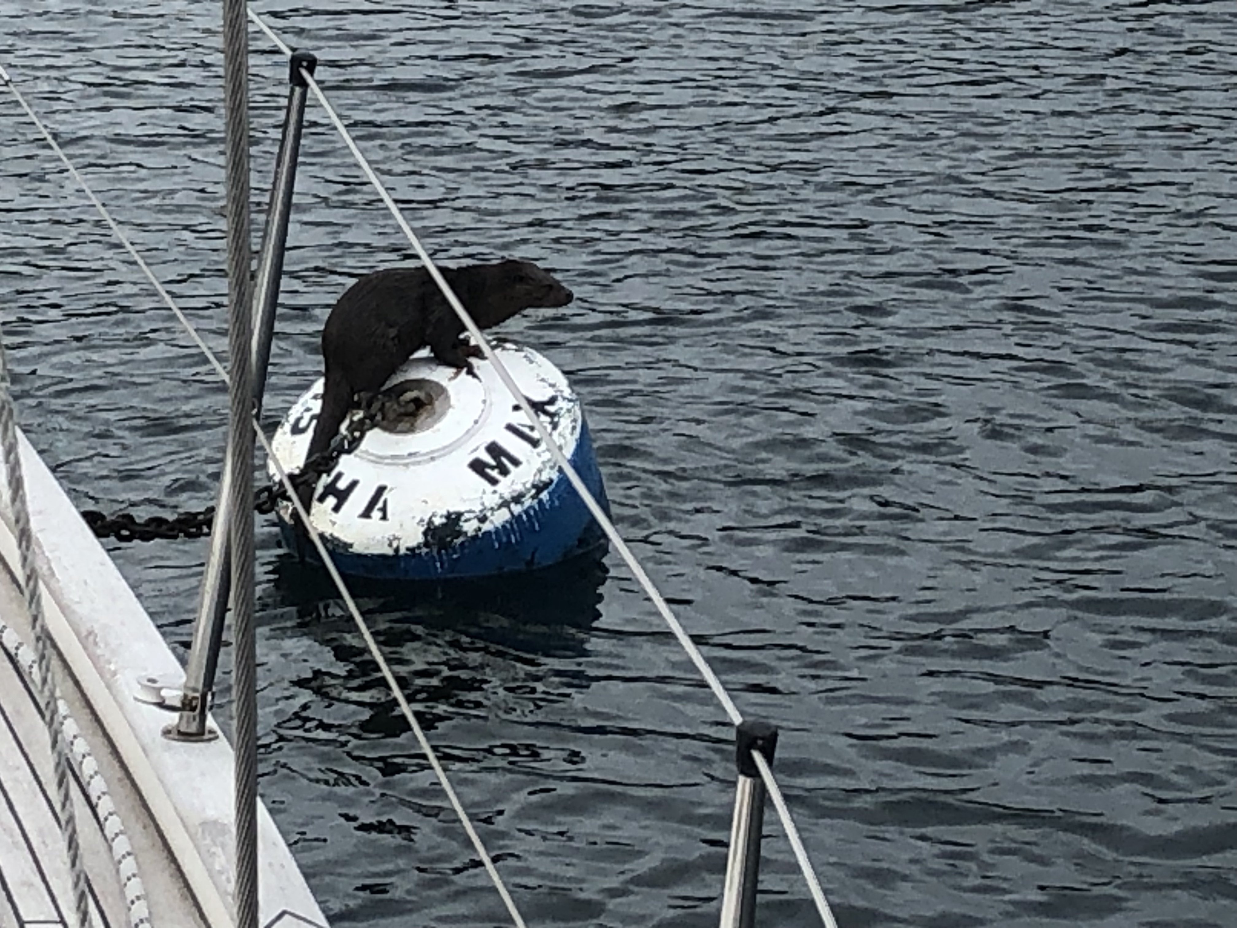 A very murky start to the day. Boats feel damp very quickly. But fortunately dry out quickly when it cheers up! We went ashore at 10 as it was Sunday and I wanted a few gifty things and J was going to do the grocery shopping. A lot of people about and most of the shops seemed open. We went across to the marina office to pay our dues. I had wanted to go to the Hebridean whale and dolphin trust shop but it didn’t open til 12. I saw the Tobermory cat ! He is a notorious character in this small town…. has had books written about him and everything and he seems to be going strong. J did a meagre shop as the shelves were not very well stocked… very limited fresh stuff! Anyway. Got what I wanted and went back to our bakery buoy ( as we call it …..cos it’s near the bakers shop- though sadly no bakery open today! ) The Sunday papers hadn’t got in on the ferry yet so another trip was needed for that! When J got back with the paper he suddenly said “ get your camera “ , and there , sitting eating a fish on our bakery buoy , was an otter! We watched him/ her for a good 5 minutes before she/ he swam off ….. only to return a few minutes later when I got some video. Maybe our buoy is his/her favourite to sit on. We called it Max as you can see why from the photo! It is such a privilege to be able to observe wild animals at close quarters. Eventually we left Tobermory in the damp grey weather but Max had lifted our spirits and we set off. Before heading out…. went to look at Aros bay in the far corner of Tobermory bay, where we’d been told there are 2 visitors moorings quite away from the town so really like a separate anchorage. Looking forward to trying them next time we’re here. The sail down the sound was quiet and peaceful with the wind behind us. I had put in a request for attaching ourselves to a pontoon at Loch Aline tonight, as I wanted to have a shower ( proper) dry my hair ( properly) , have WiFi, watch telly ( the highlights of the open) and have a really good nights sleep! The little marina wasn’t busy so we found ourselves a suitable berth and had a lovely evening doing all those things! Chicken curry to eat followed by coop trifles! 😋
