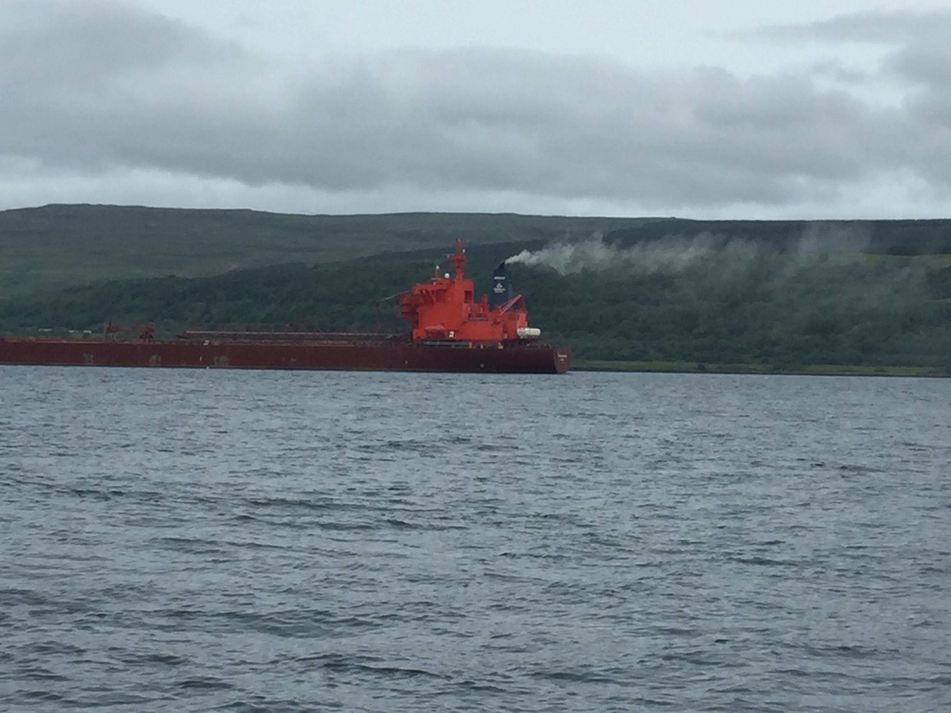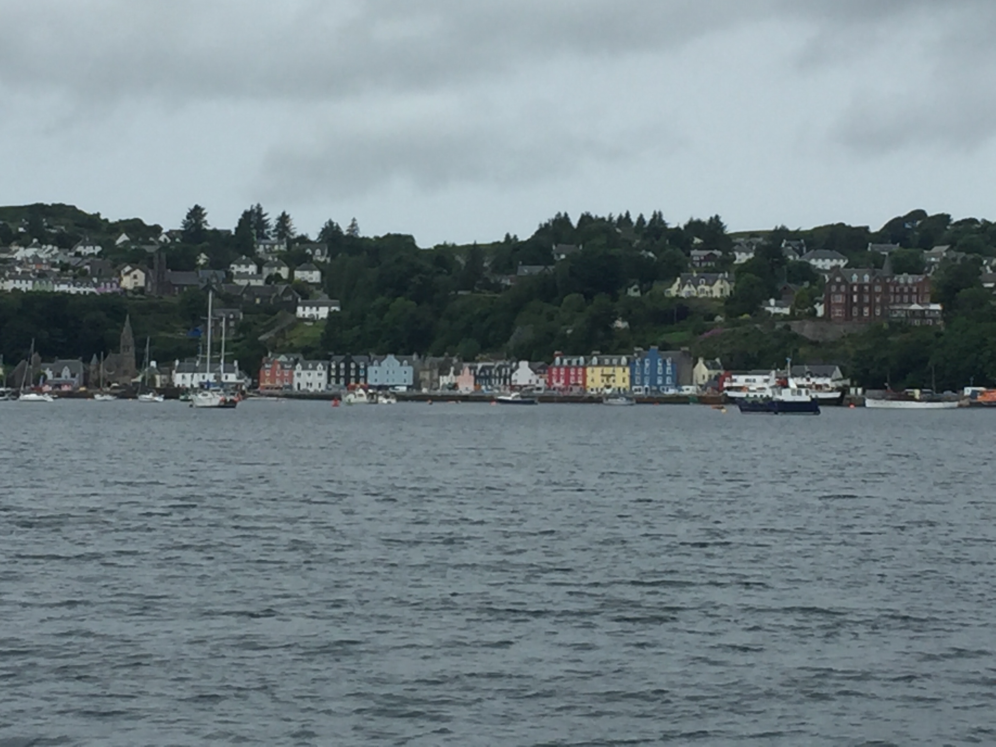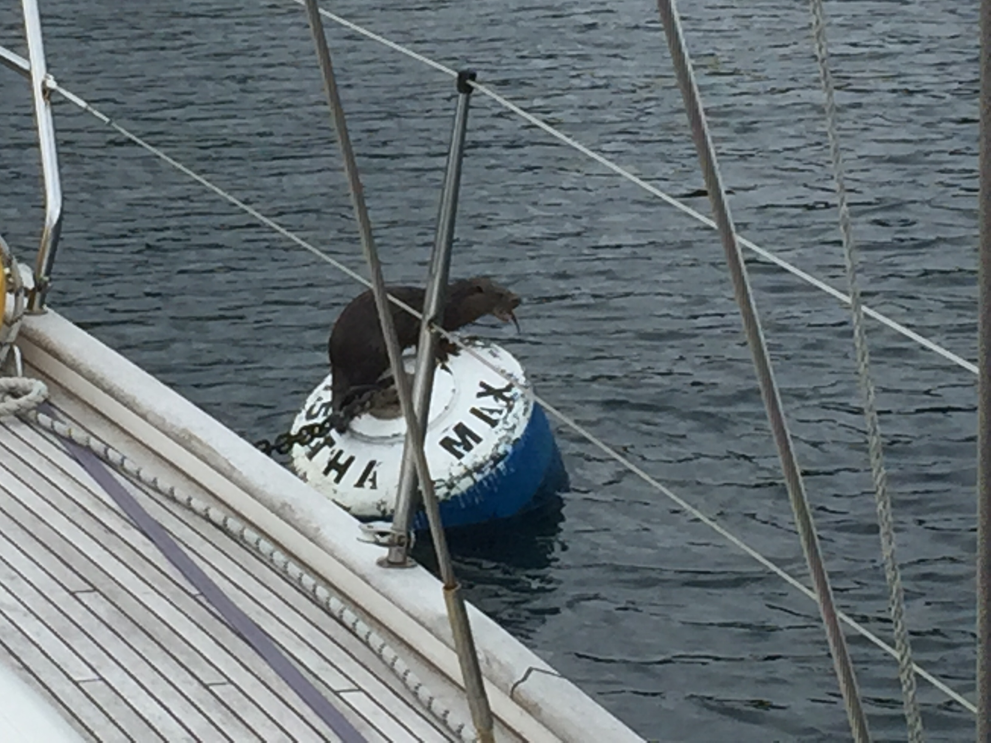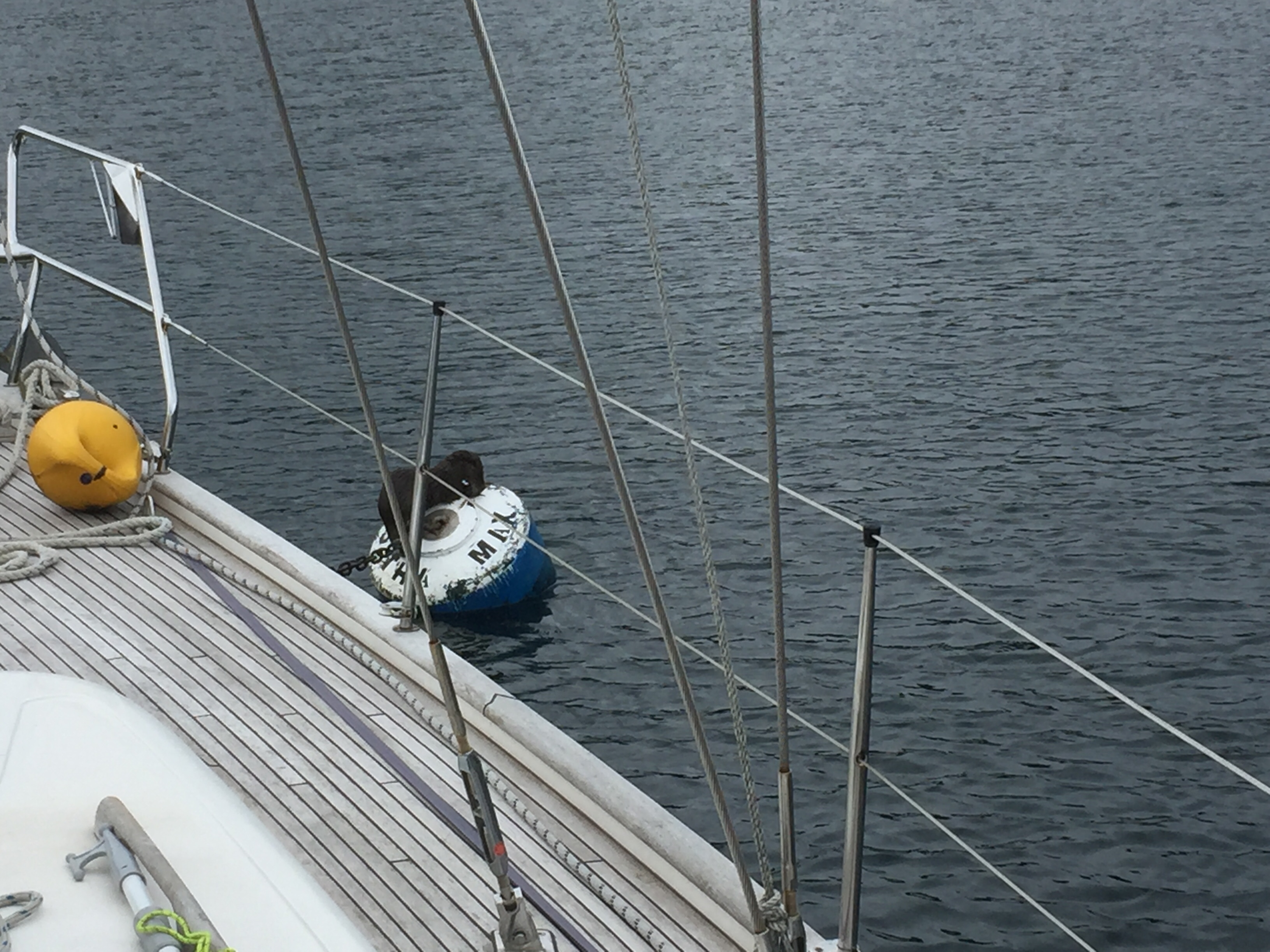 A very murky start to the day. Boats feel damp very quickly. But fortunately dry out quickly when it cheers up! We went ashore at 10 as it was Sunday and I wanted a few gifty things and J was going to do the grocery shopping. A lot of people about and most of the shops seemed open. We went across to the marina office to pay our dues. I had wanted to go to the Hebridean whale and dolphin trust shop but it didn’t open til 12. I saw the Tobermory cat ! He is a notorious character in this small town…. has had books written about him and everything and he seems to be going strong. J did a meagre shop as the shelves were not very well stocked… very limited fresh stuff! Anyway. Got what I wanted and went back to our bakery buoy ( as we call it …..cos it’s near the bakers shop- though sadly no bakery open today! ) The Sunday papers hadn’t got in on the ferry yet so another trip was needed for that! When J got back with the paper he suddenly said “ get your camera “ , and there , sitting eating a fish on our bakery buoy , was an otter! We watched him/ her for a good 5 minutes before she/ he swam off ….. only to return a few minutes later when I got some video. Maybe our buoy is his/her favourite to sit on. We called it Max as you can see why from the photo! It is such a privilege to be able to observe wild animals at close quarters. Eventually we left Tobermory in the damp grey weather but Max had lifted our spirits and we set off. Before heading out…. went to look at Aros bay in the far corner of Tobermory bay, where we’d been told there are 2 visitors moorings quite away from the town so really like a separate anchorage. Looking forward to trying them next time we’re here. The sail down the sound was quiet and peaceful with the wind behind us. I had put in a request for attaching ourselves to a pontoon at Loch Aline tonight, as I wanted to have a shower ( proper) dry my hair ( properly) , have WiFi, watch telly ( the highlights of the open) and have a really good nights sleep! The little marina wasn’t busy so we found ourselves a suitable berth and had a lovely evening doing all those things! Chicken curry to eat followed by coop trifles! 😋