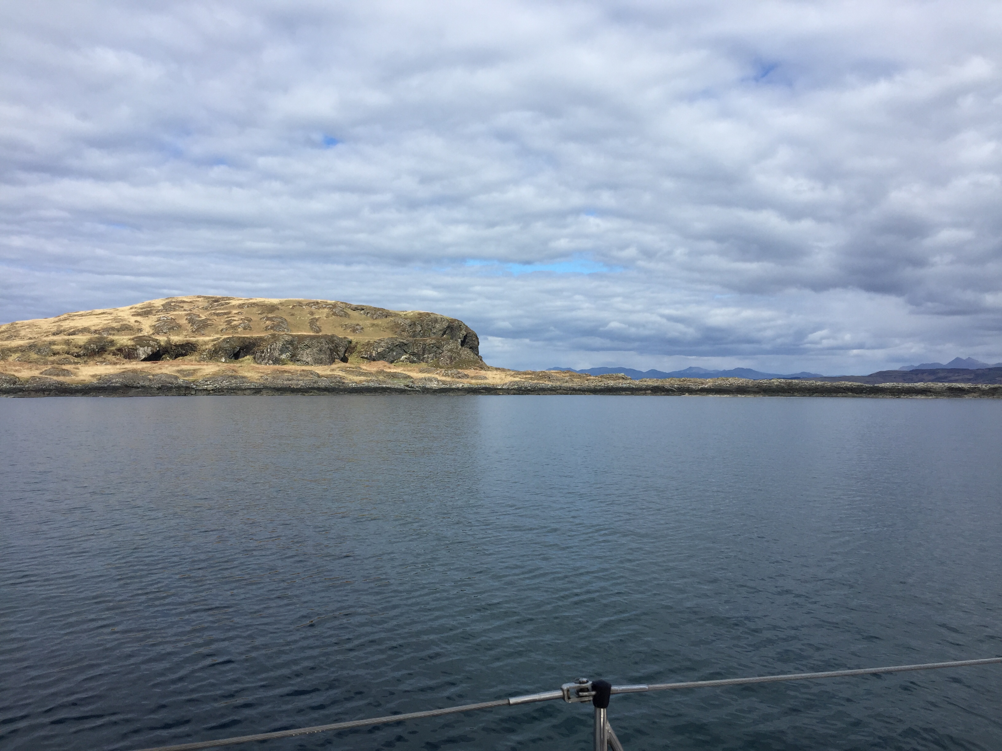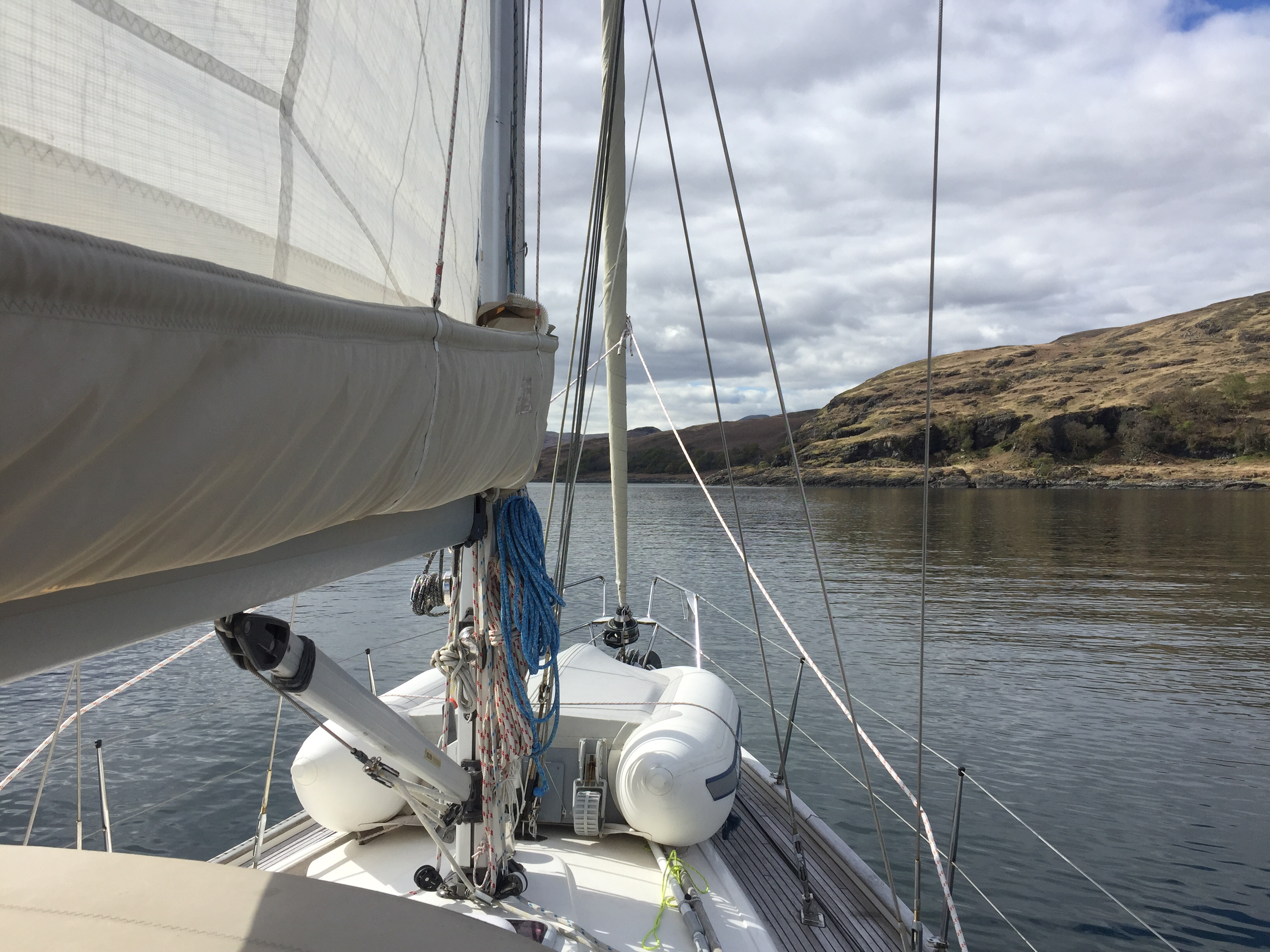 Bit of a lazy day! Woke to grey skies and hardly any wind! Blissful. Had a brunch of bacon Scrambled eggs and beans ( Alice had halloumi and quorn sausage š³) with pan toasted muffins. Sorted the stern line for the dinghy before putting it on board so thatās another job done. Even sowed a black mark with thread into the painter ( rope at front) to mark exactly where it has to go on the port cleat when itās attached to the back of the boat. š¬. This time of year the light seems very clear and we could see Ben Nevis poking out about all the other peaks as we sailed gently in s 9 knot breeze across the firth of lorne. Our destination was Loch Spelve on the island of Mull. I can only imagine how beautiful it was before they put any fish farms here. It is now full of them. Mainly mussels. Row upon row of buoys presumably suspending ropes of the shellfish. We anchored however in the SE corner of the northern arm which is peaceful beyond belief and just wild. The wind has disappeared for now and left us in a mill pond surrounded by seaweedy rocks, seals and mountains. After a meal of scotch pie and veg, we played monopoly deal …. a favourite of Alices. A quiet and enjoyable day for all of us.