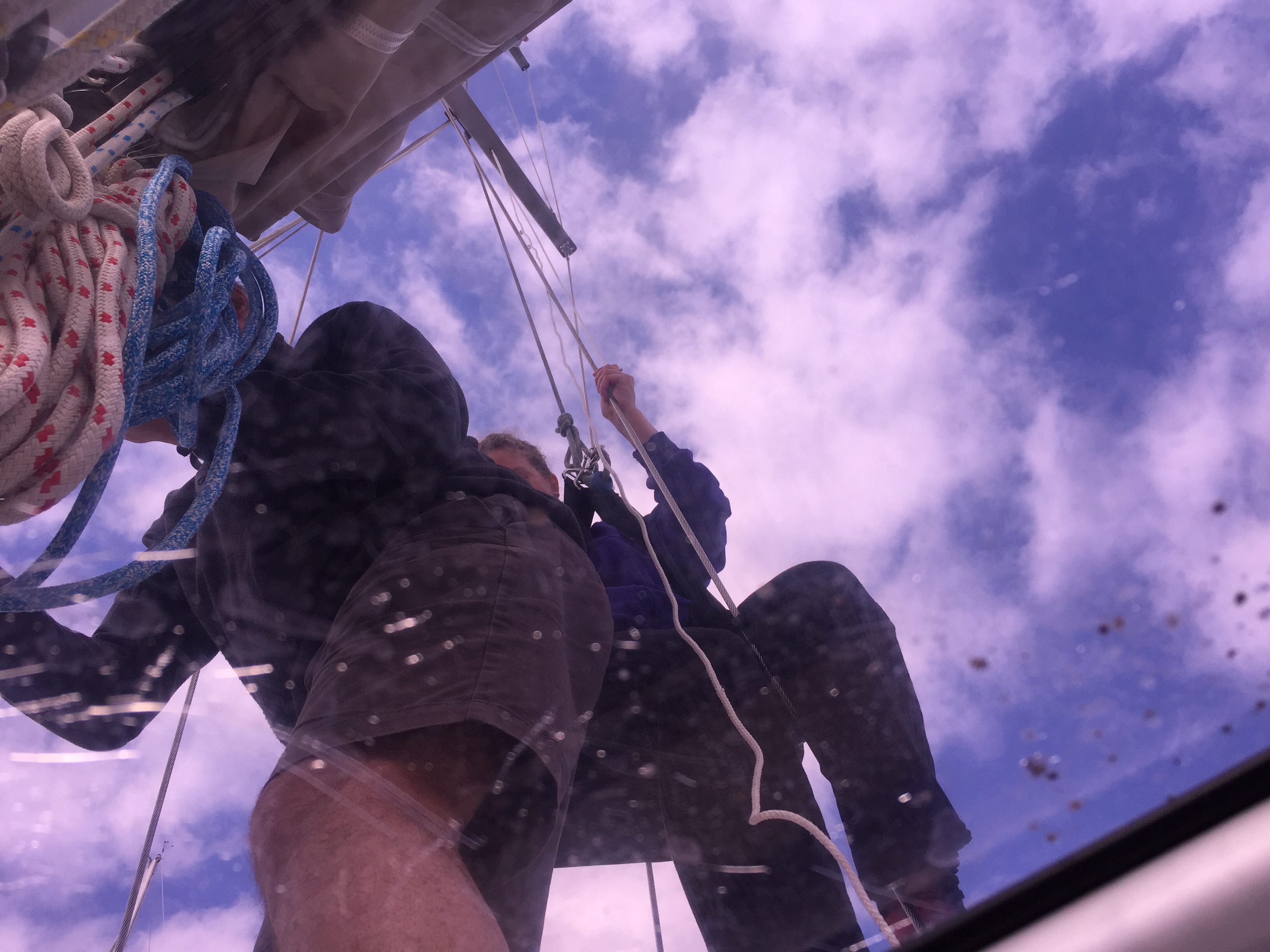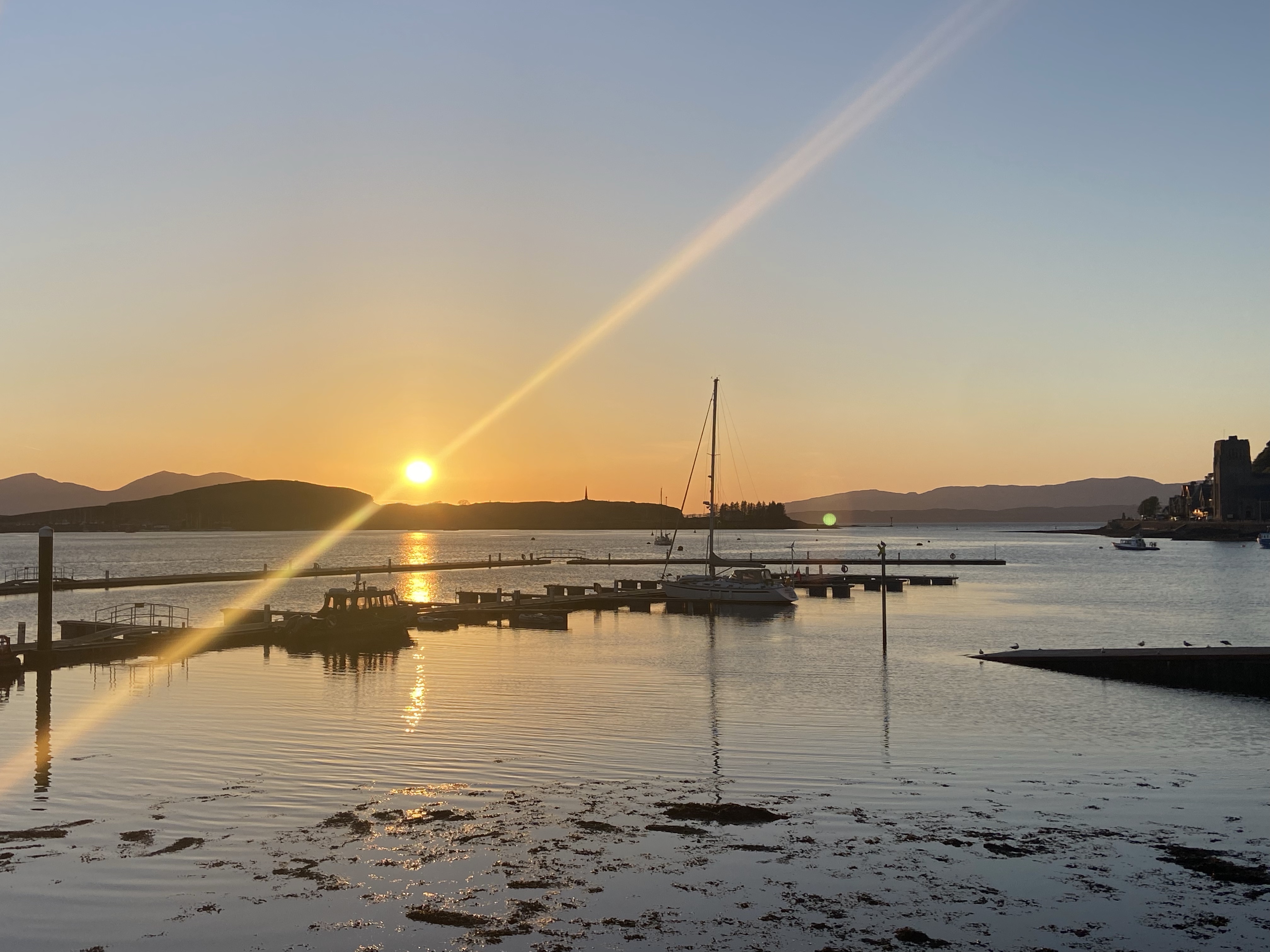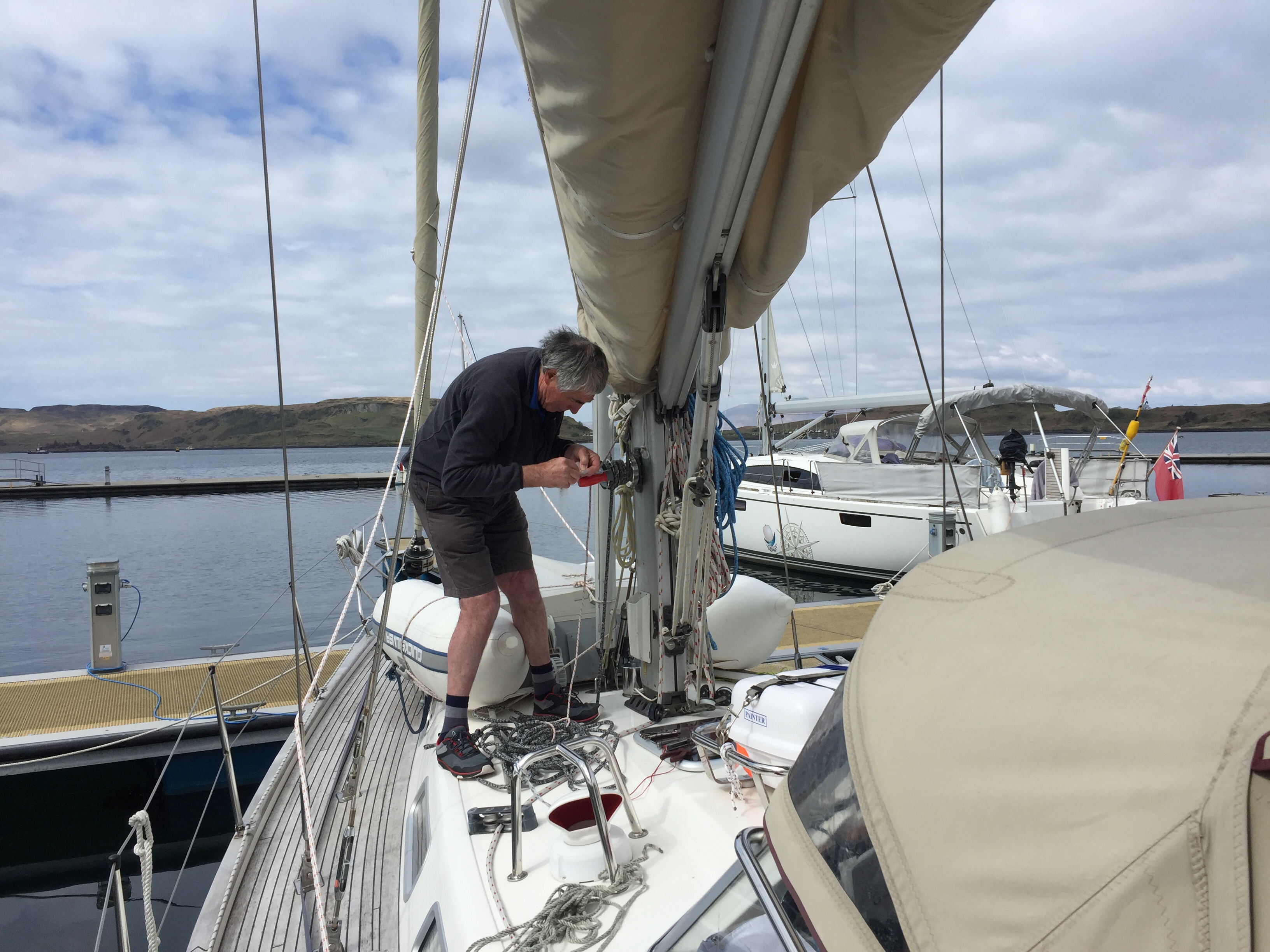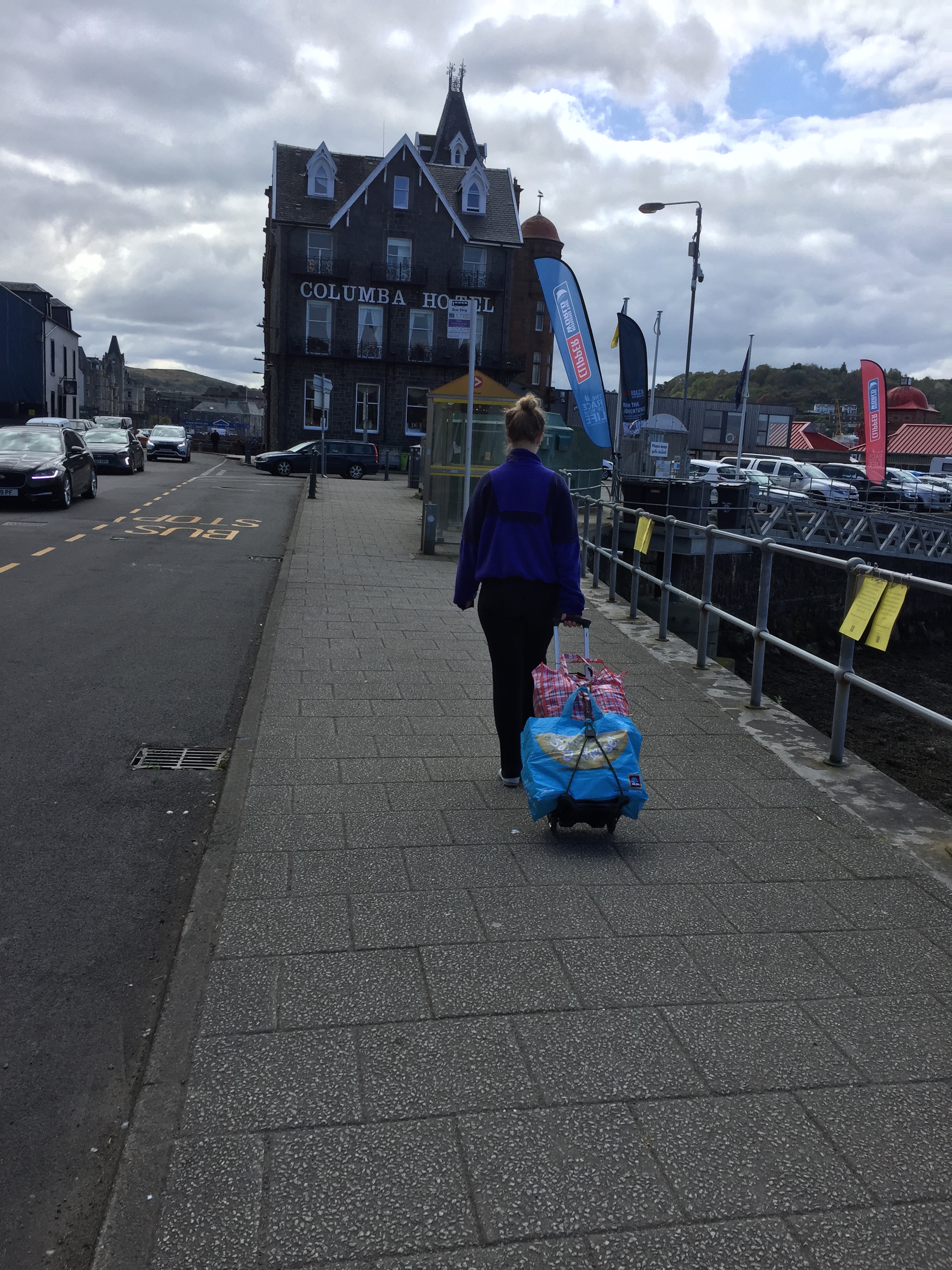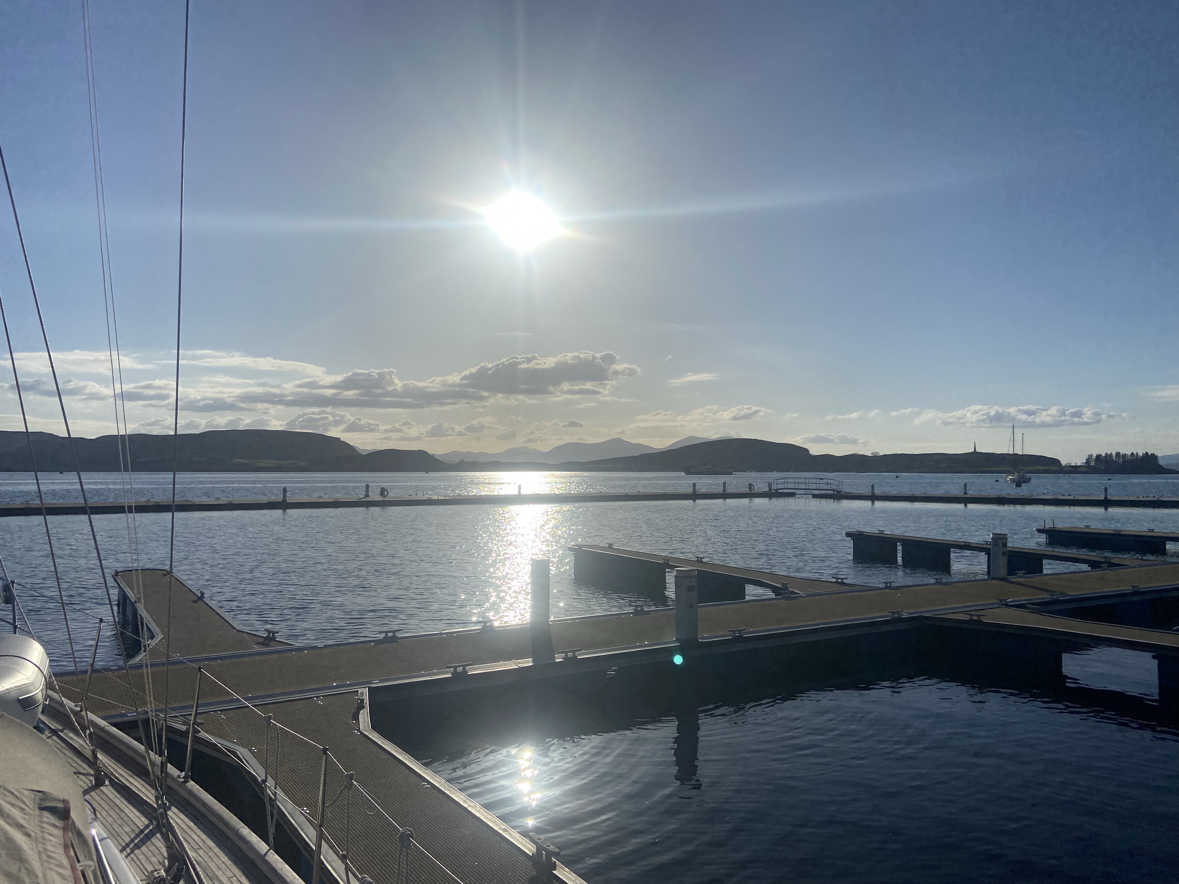 A lovely day doing chores. Alice and l went to farm foods whilst Julian endeavoured to fix the clevis pin situation.!! Fortunately there was no wind , so He could put the main sail up to take some weight off the boom and Eventually he was pleased with the result …..but we have ordered a new one to be delivered to Lochinver ! Alice then got sent up the mast to retrieve the bit of string holding on our saltire ( Scottish flag penant) which had got snapped somehow. We also took the washing to the “magical “ mandarin laundry. Magical because they turn 11 kg of crumpled smelly washing into 2 bags of sweet smelling warm dry and folded laundry. Bliss!. After that I cleaned the boat inside whilst Al and Julian went to Tesco’s and Aldi to get everything else on the list . Eventually with all the chores done we had showers got ready to go out! Very excited! The meal we had at Piazza on the front at Oban, was wonderful . Typical Italian comfort food … delicious!