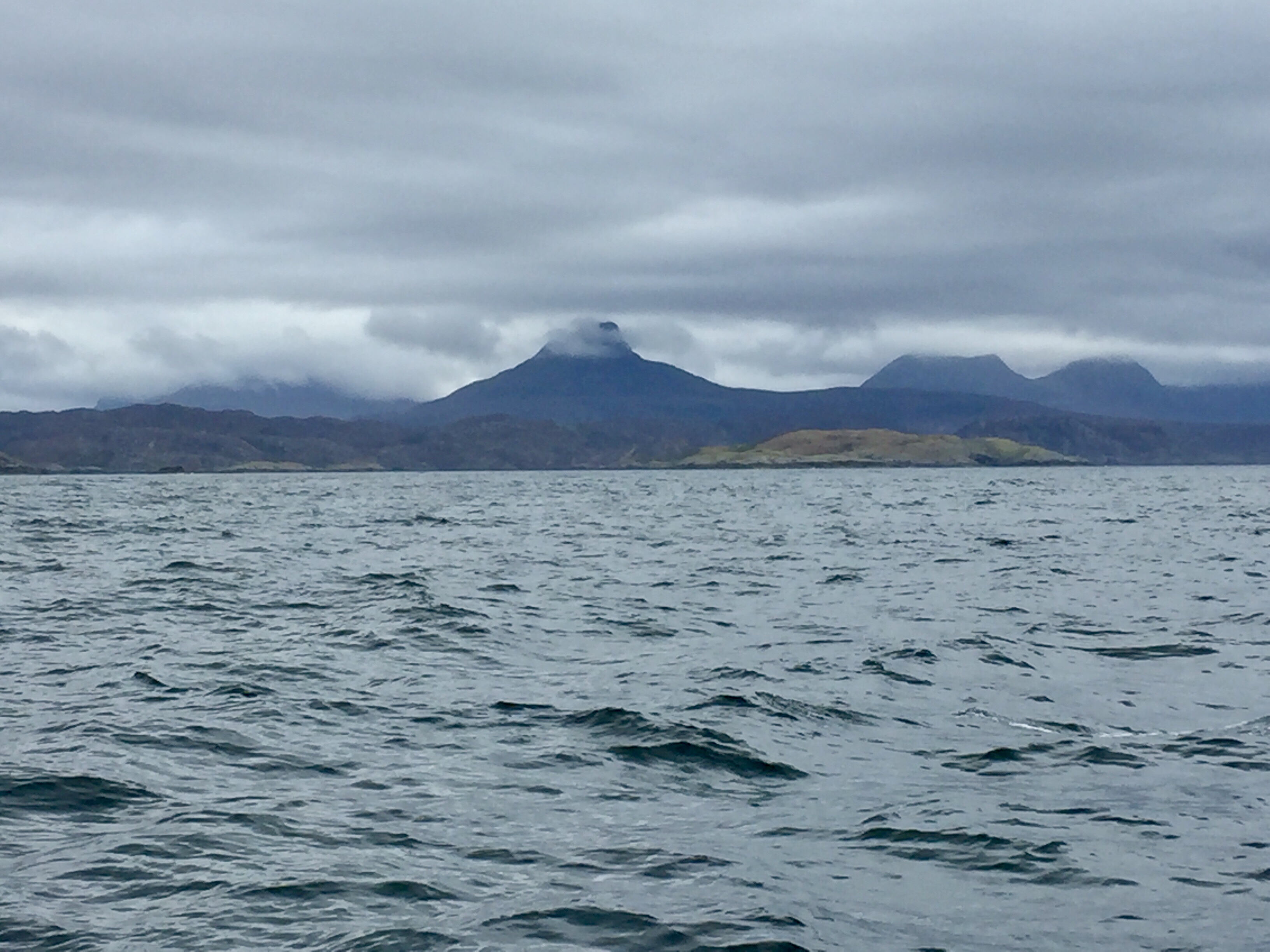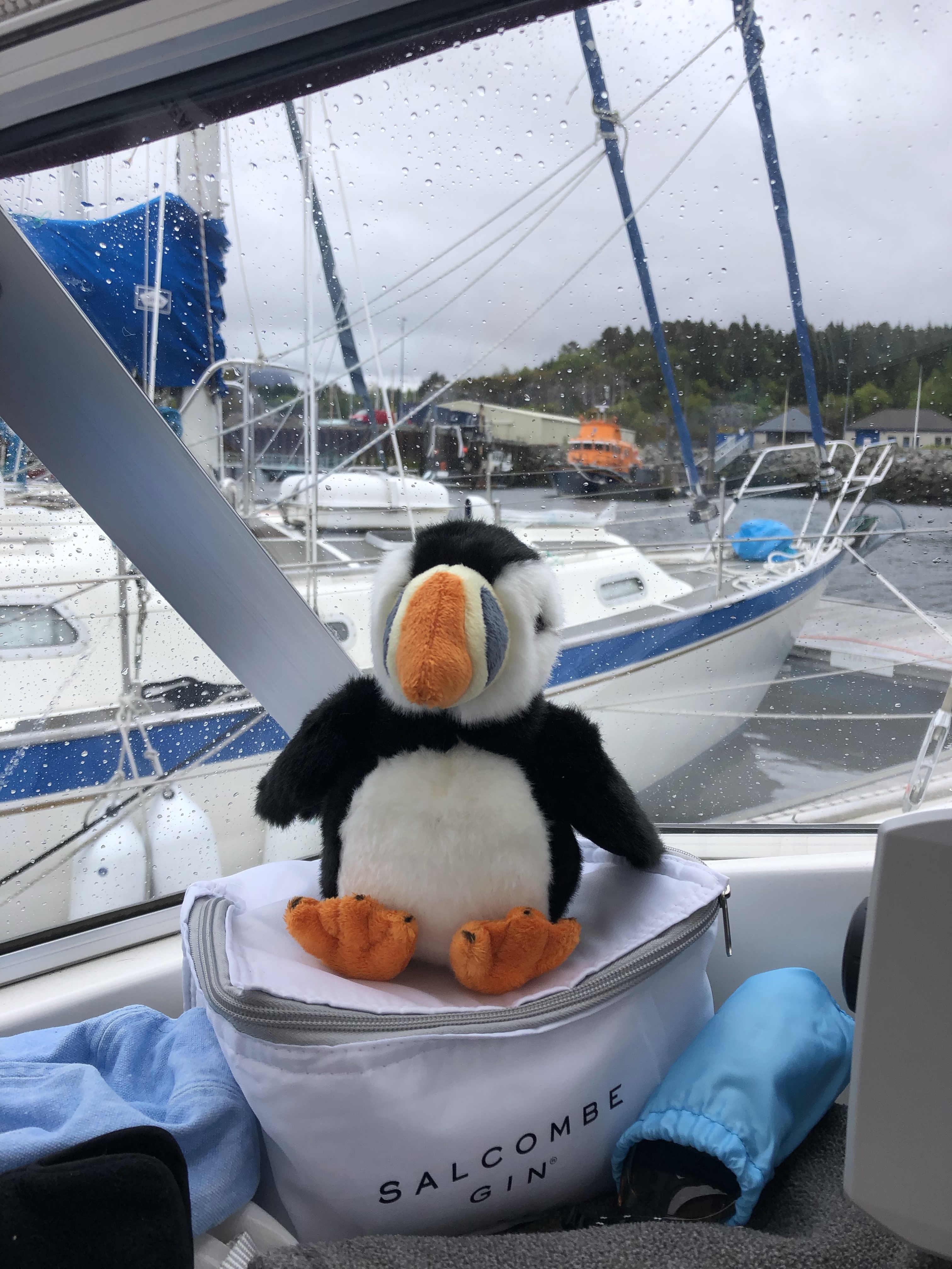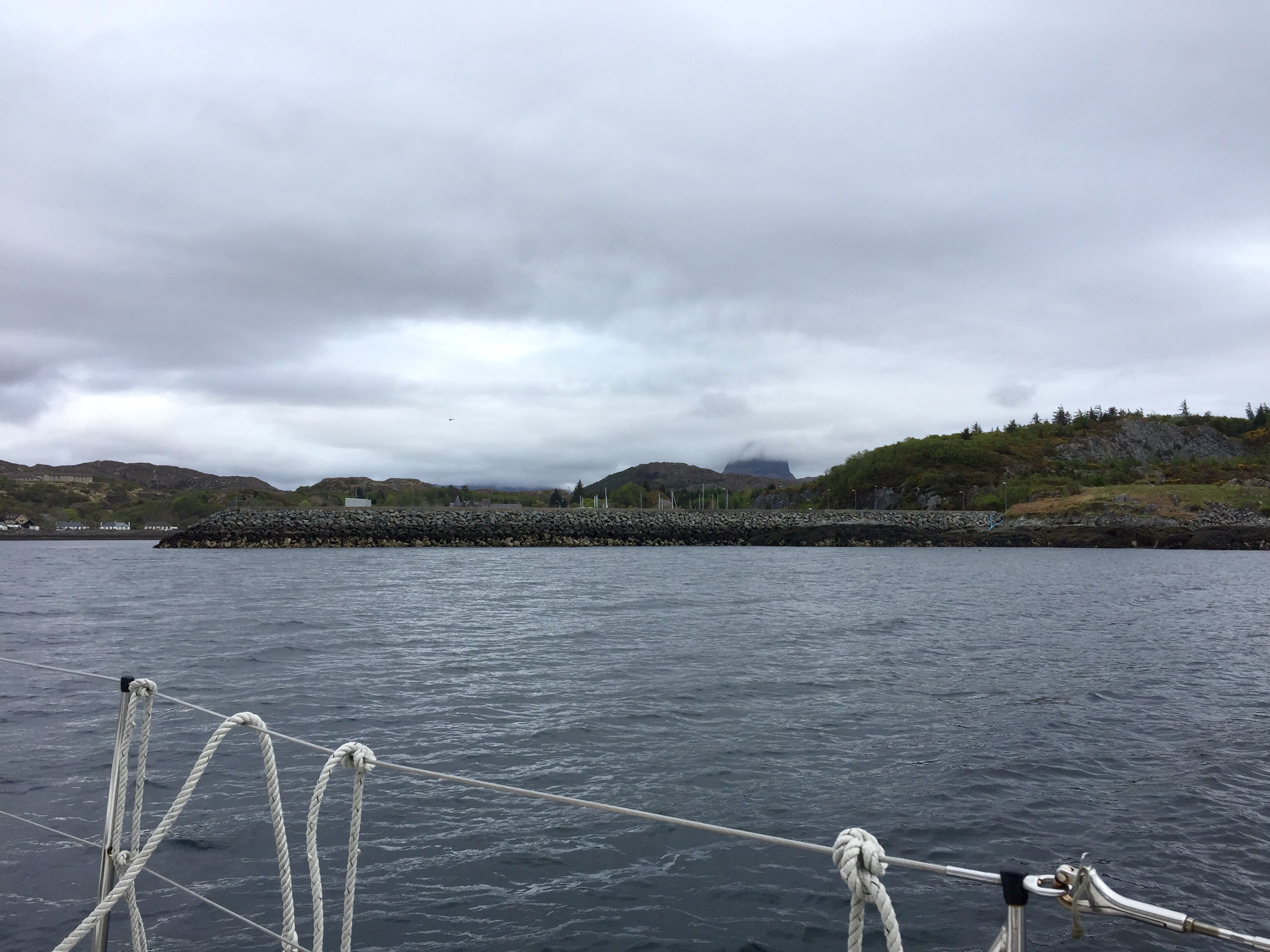 A grey day . From start to finish really. First turn on of the plotter told us we were in Senegal ?!?! She sorted herself out and settled down to a new normal. Bounced out into the wind and waves under motor at about 0830. The wind had threatened to change direction and at least weren’t beating north for the first time since the Mull of kintyre. However a roly poly sea with the wind behind is not that comfortable so after having put a reef in the main, we decided to take it down altogether and sail under headsail only. Grey seas and grey skies with grey mist on what coast was visible… doesn’t make good photos! Apologies! We did see lots of puffins our at sea, along with guillemots and Razorbills. The sight of them kept us going and they are so funny when trying to fly along wavy water which they keep bumping into. We arrived in Lochinver where it was surprisingly busy but fortunately we found a free berth in the small marina and some kind folks helped us with our lines. We wanted to go for a pie in the famous pie shop but we’re too tired so hoping to buy some tomorrow. An evening of watching tv …. always a bonus when there’s a signal and a link with normality. And then falling asleep on the sofa ( just like home!)