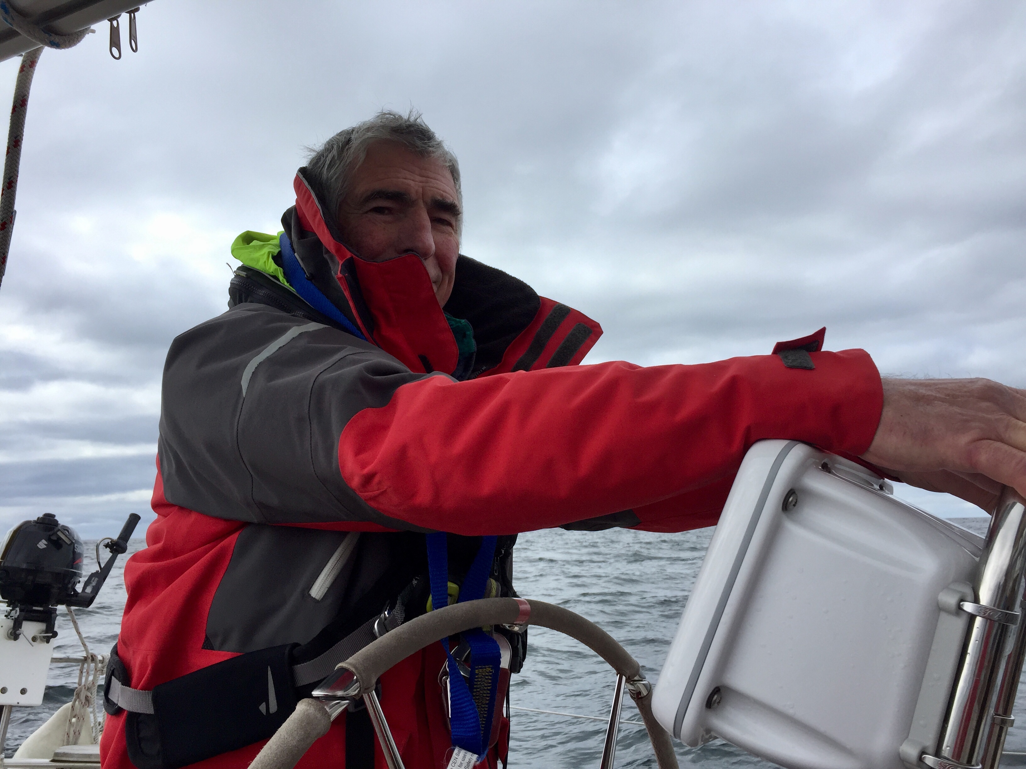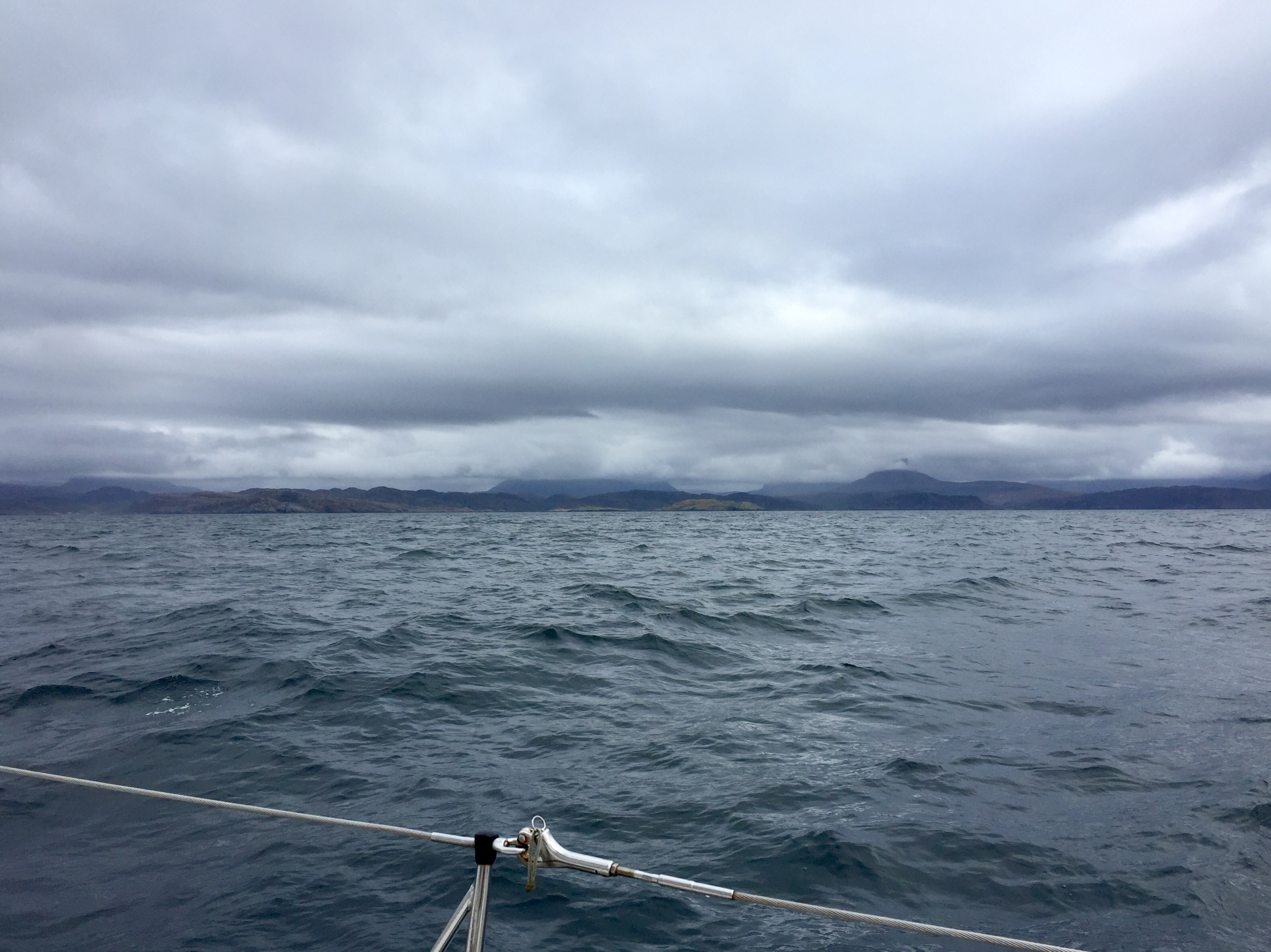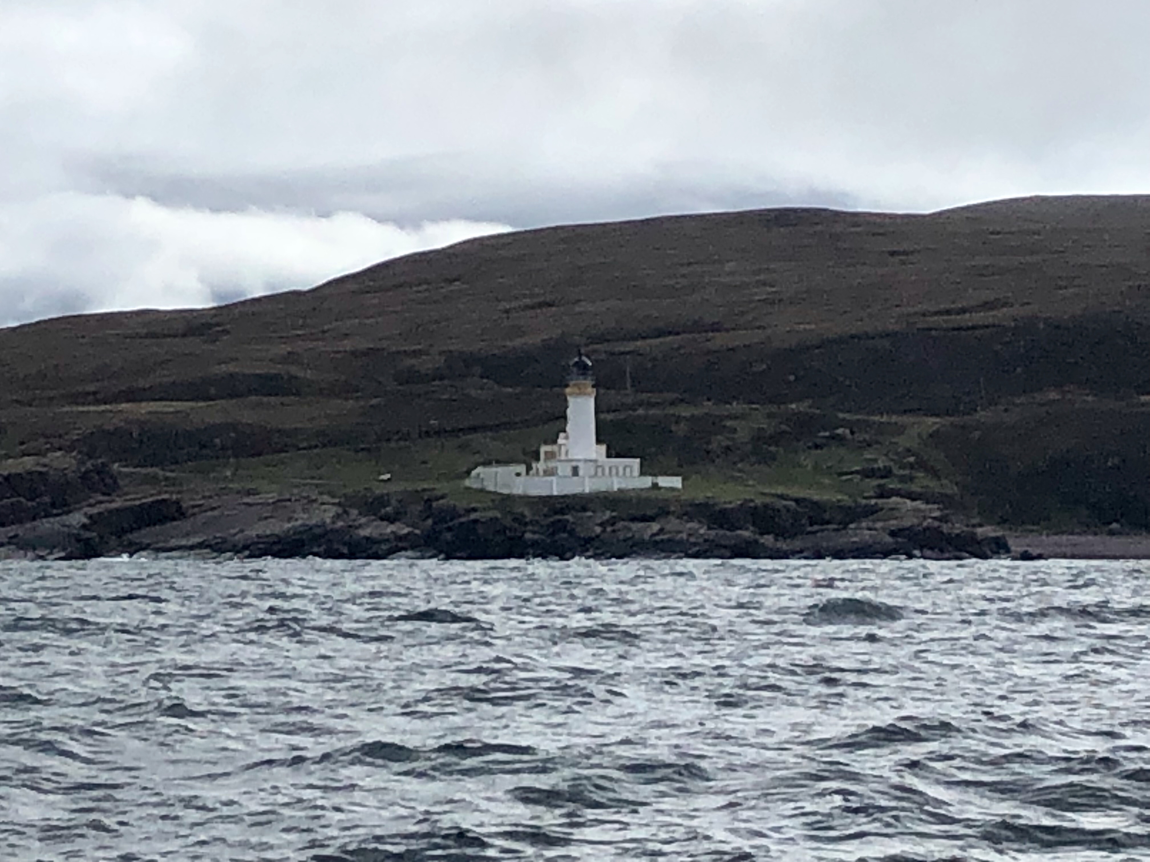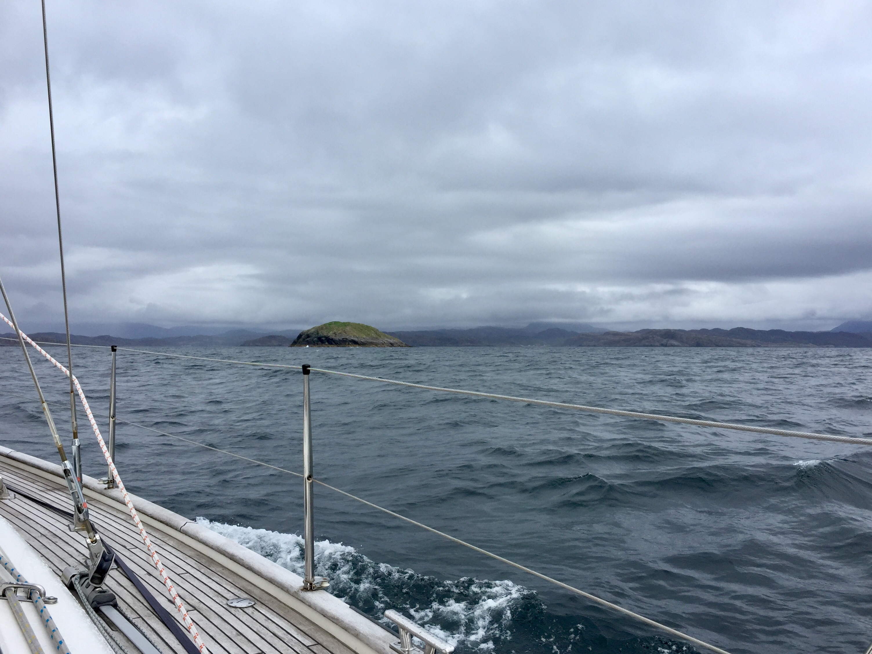 A grey day . From start to finish really. First turn on of the plotter told us we were in Senegal ?!?! She sorted herself out and settled down to a new normal. Bounced out into the wind and waves under motor at about 0830. The wind had threatened to change direction and at least weren’t beating north for the first time since the Mull of kintyre. However a roly poly sea with the wind behind is not that comfortable so after having put a reef in the main, we decided to take it down altogether and sail under headsail only. Grey seas and grey skies with grey mist on what coast was visible… doesn’t make good photos! Apologies! We did see lots of puffins our at sea, along with guillemots and Razorbills. The sight of them kept us going and they are so funny when trying to fly along wavy water which they keep bumping into. We arrived in Lochinver where it was surprisingly busy but fortunately we found a free berth in the small marina and some kind folks helped us with our lines. We wanted to go for a pie in the famous pie shop but we’re too tired so hoping to buy some tomorrow. An evening of watching tv …. always a bonus when there’s a signal and a link with normality. And then falling asleep on the sofa ( just like home!)