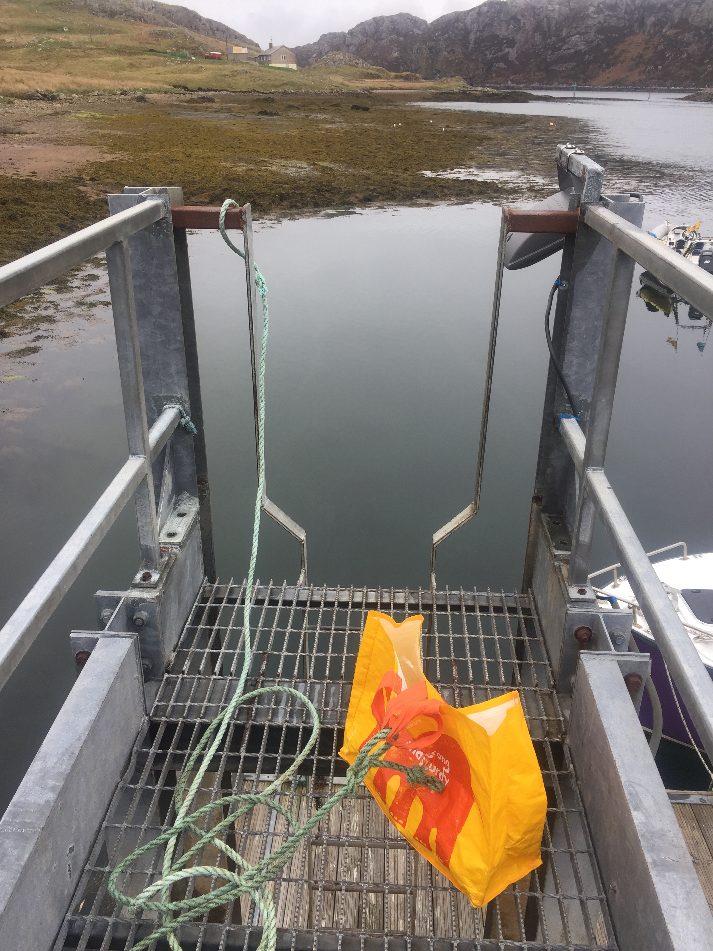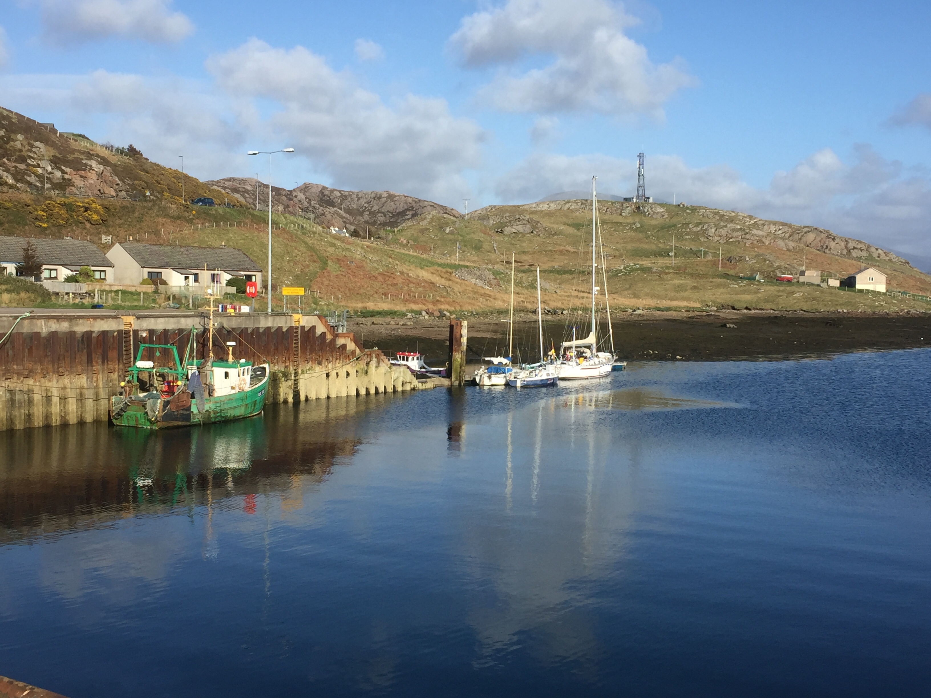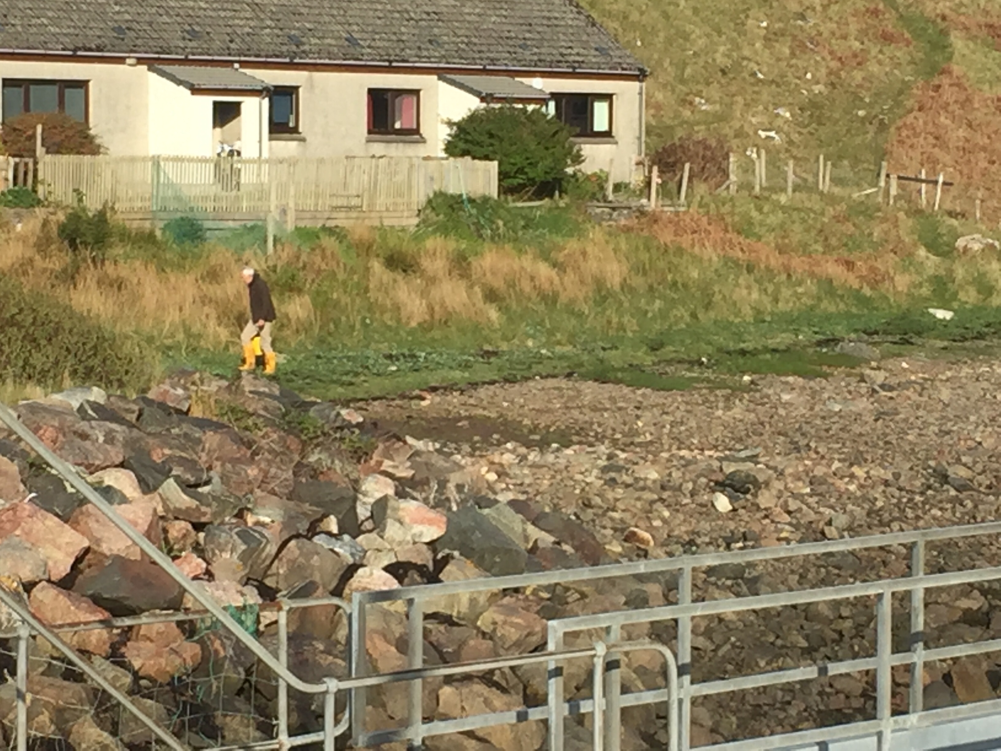 Waking up at 6 am to hear pouring rain and wind, I was very thankful to not be going anywhere! We spent the morning doing stuff on board as the weather wasn’t very pleasant. Julian poured over charts, almanacs and tide tables whilst I wrote postcards and letters to family. I also spent a while watching a man with a yellow bucket collecting seaweed. I’d noticed him last night doing the same and he appears to do it twice daily. I am intrigued to know what for? Any ideas ? By now the clouds and rain had given way to almost no wind, warmth!!! And a clearing blue sky!After a bacon muffin for lunch, we set off out. We needed some shopping so we did that first. The tide was in enough for us to have to use the ladder to reach the key. Very sensibly, there was a rope at the top which could be used to hoist things like rubbish or shopping up and down…. it came in very handy as climbing up a vertical ladder requires all hands to be used. Once the shopping was stowed, we went for a lovely walk in the sunshine with stunning views along the road out towards the northwest which is part of the North Coast 500. We didn’t walk quite far enough to see the beautiful beaches at Olshoremore. I picked some lucky heather for Angelique as I put it on her bow every year. On the way back we stopped for a welcome beer at the hotel… busier today…. maybe because it’s sunny or Friday; or both. We had thought we might move the boat into the now vacated main pontoon, but when we got back another yacht had taken up the space. Never mind. Watched tv in the evening and had fish and chips from the Spar. 😋