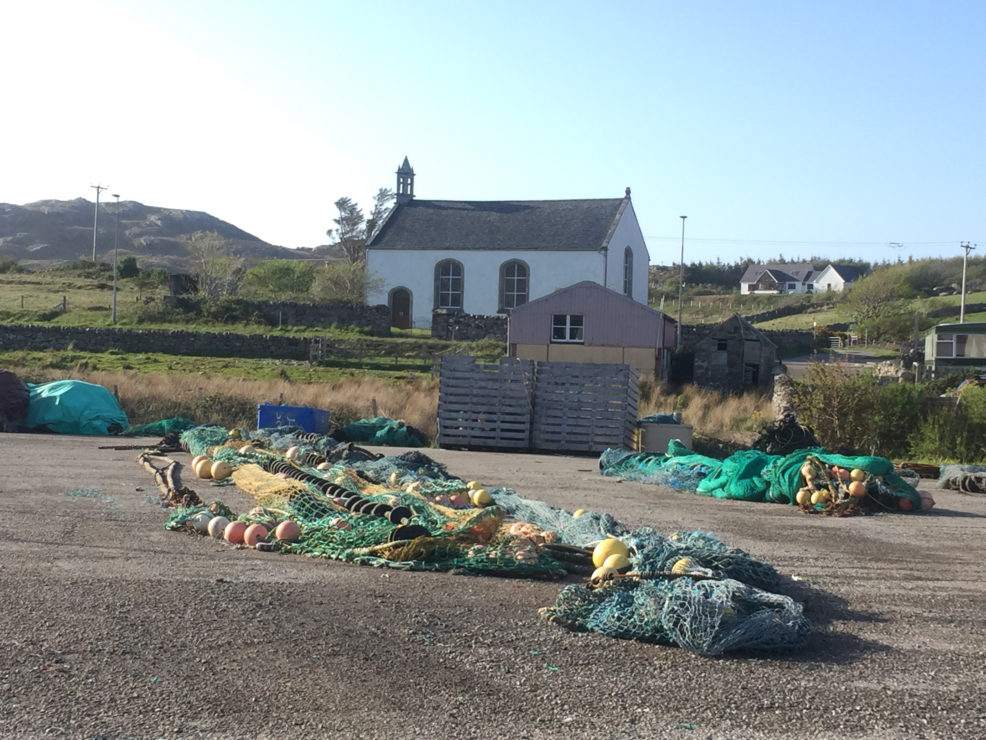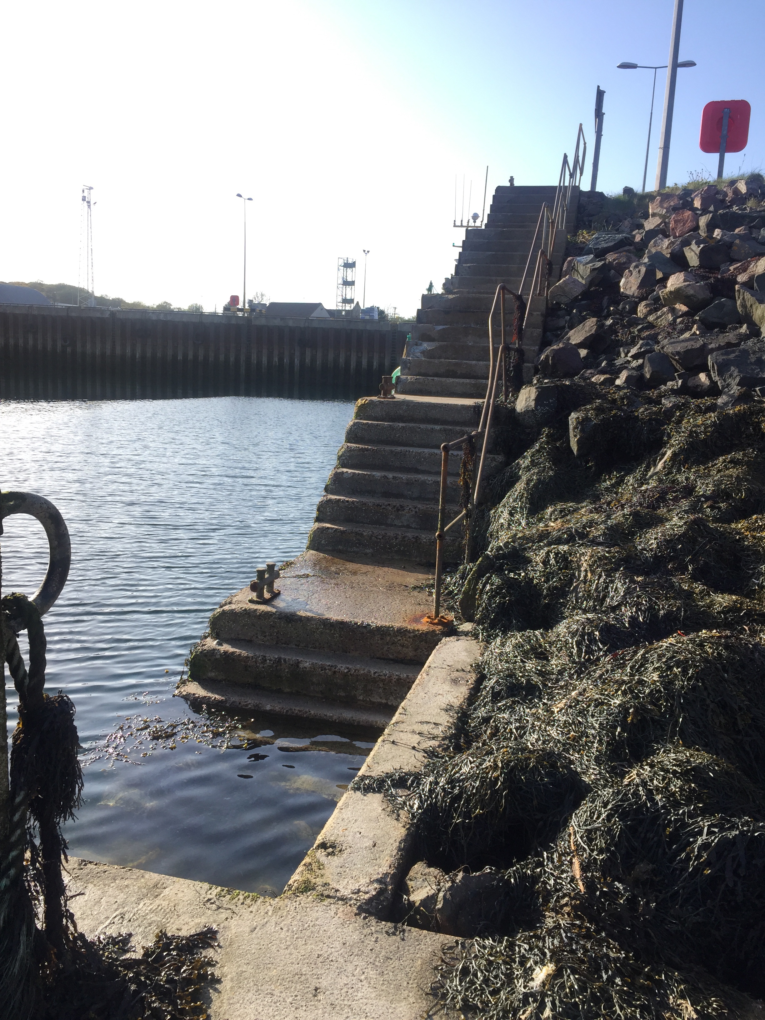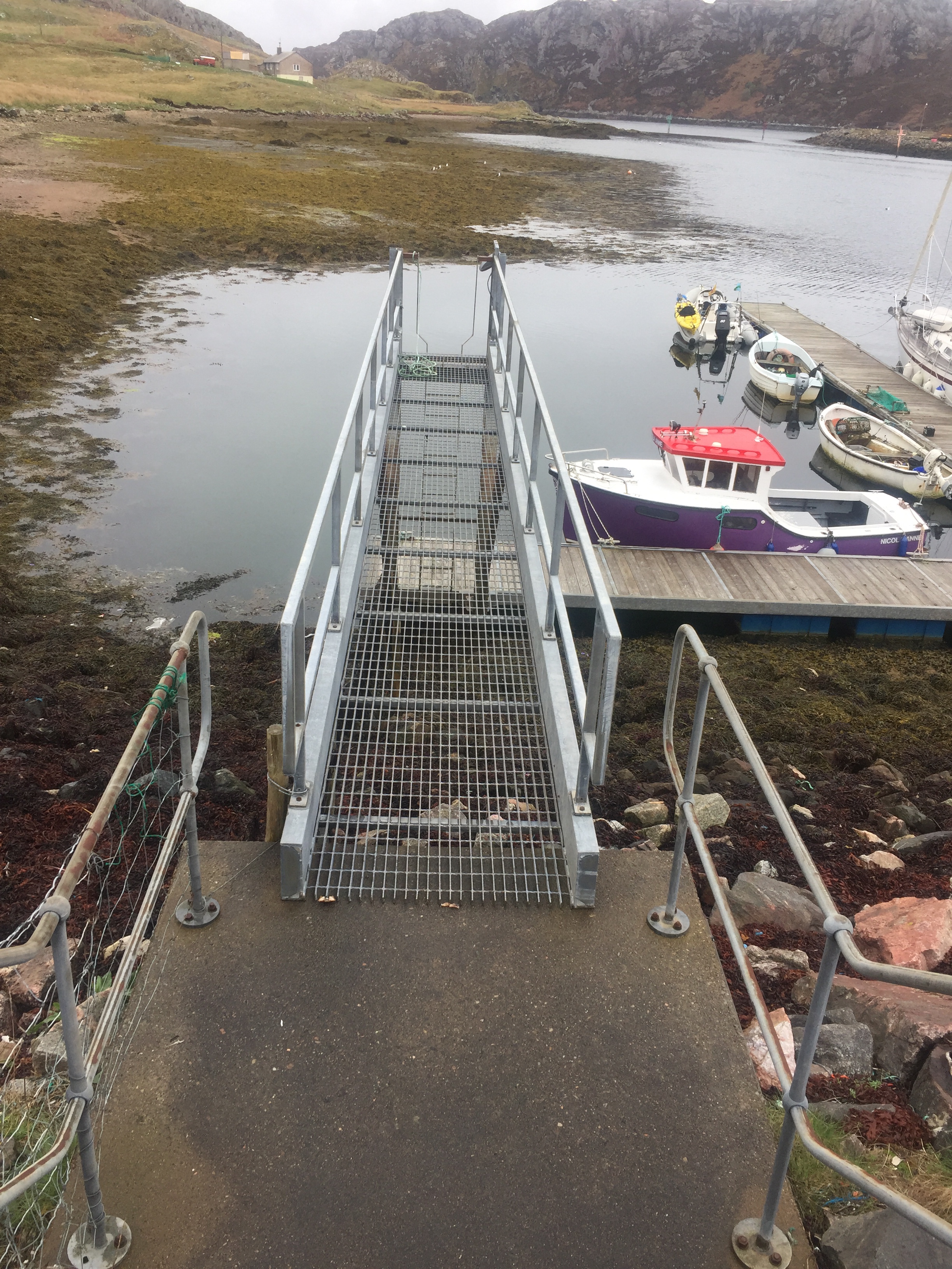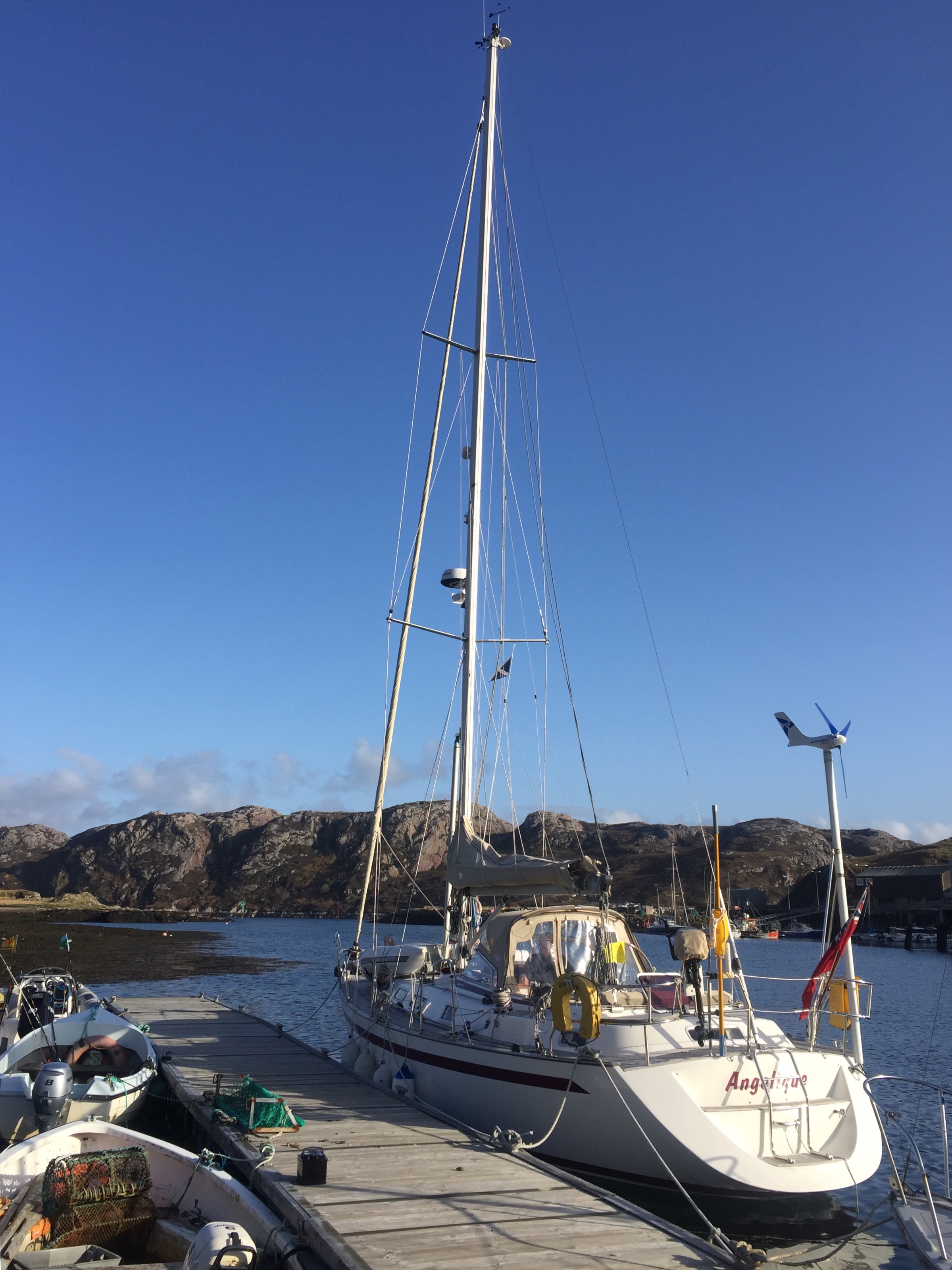Waking up at 6 am to hear pouring rain and wind, I was very thankful to not be going anywhere! We spent the morning doing stuff on board as the weather wasn’t very pleasant. Julian poured over charts, almanacs and tide tables whilst I wrote postcards and letters to family. I also spent a while watching a man with a yellow bucket collecting seaweed. I’d noticed him last night doing the same and he appears to do it twice daily. I am intrigued to know what for? Any ideas ? By now the clouds and rain had given way to almost no wind, warmth!!! And a clearing blue sky!After a bacon muffin for lunch, we set off out. We needed some shopping so we did that first. The tide was in enough for us to have to use the ladder to reach the key. Very sensibly, there was a rope at the top which could be used to hoist things like rubbish or shopping up and down…. it came in very handy as climbing up a vertical ladder requires all hands to be used. Once the shopping was stowed, we went for a lovely walk in the sunshine with stunning views along the road out towards the northwest which is part of the North Coast 500. We didn’t walk quite far enough to see the beautiful beaches at Olshoremore. I picked some lucky heather for Angelique as I put it on her bow every year. On the way back we stopped for a welcome beer at the hotel… busier today…. maybe because it’s sunny or Friday; or both. We had thought we might move the boat into the now vacated main pontoon, but when we got back another yacht had taken up the space. Never mind. Watched tv in the evening and had fish and chips from the Spar. 😋