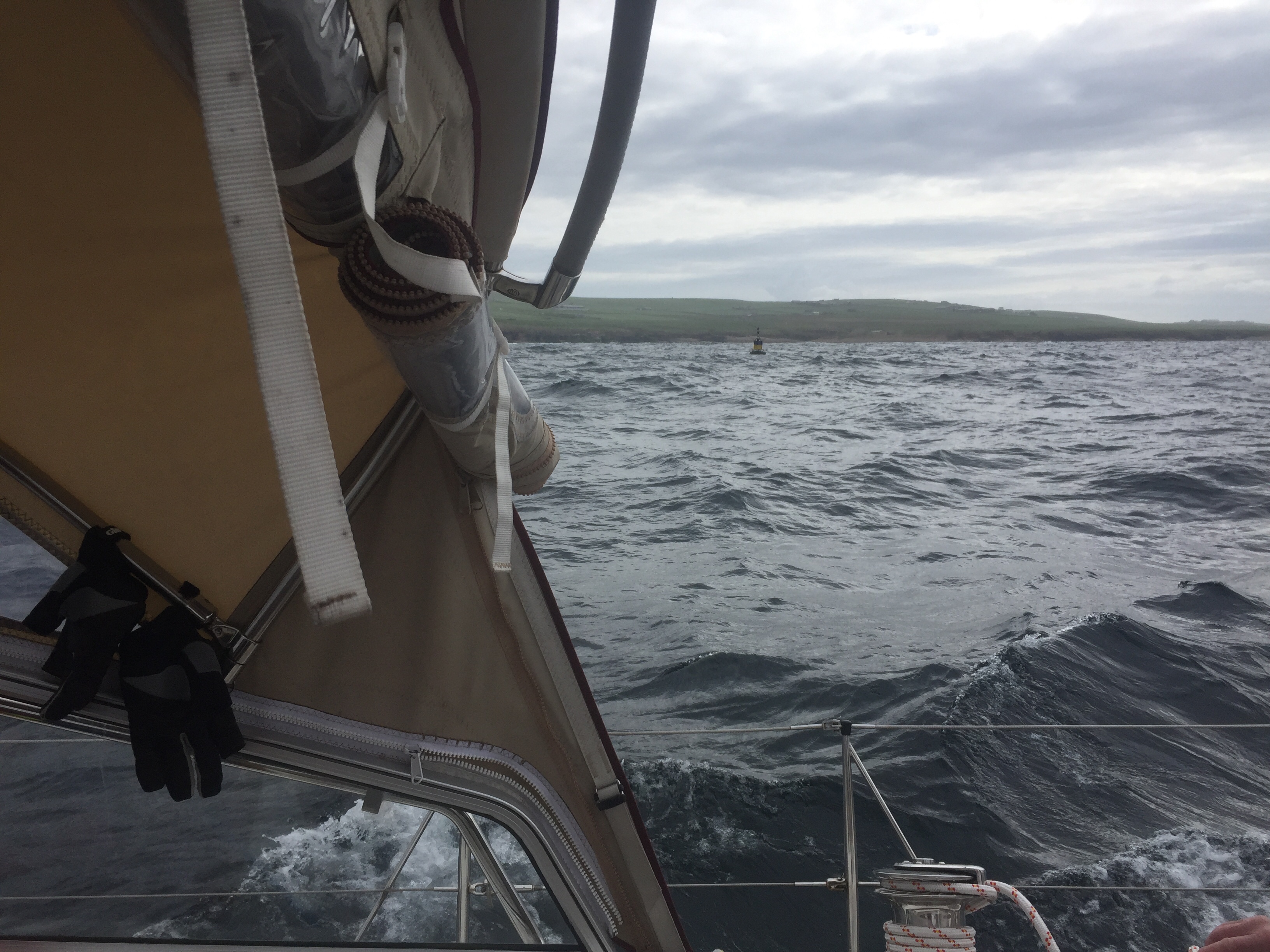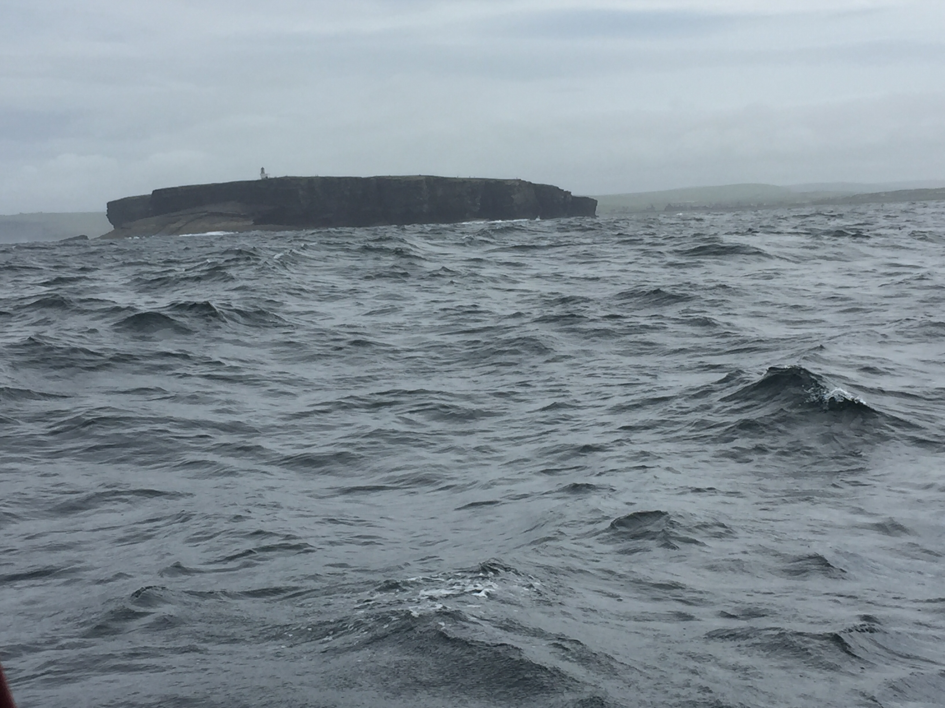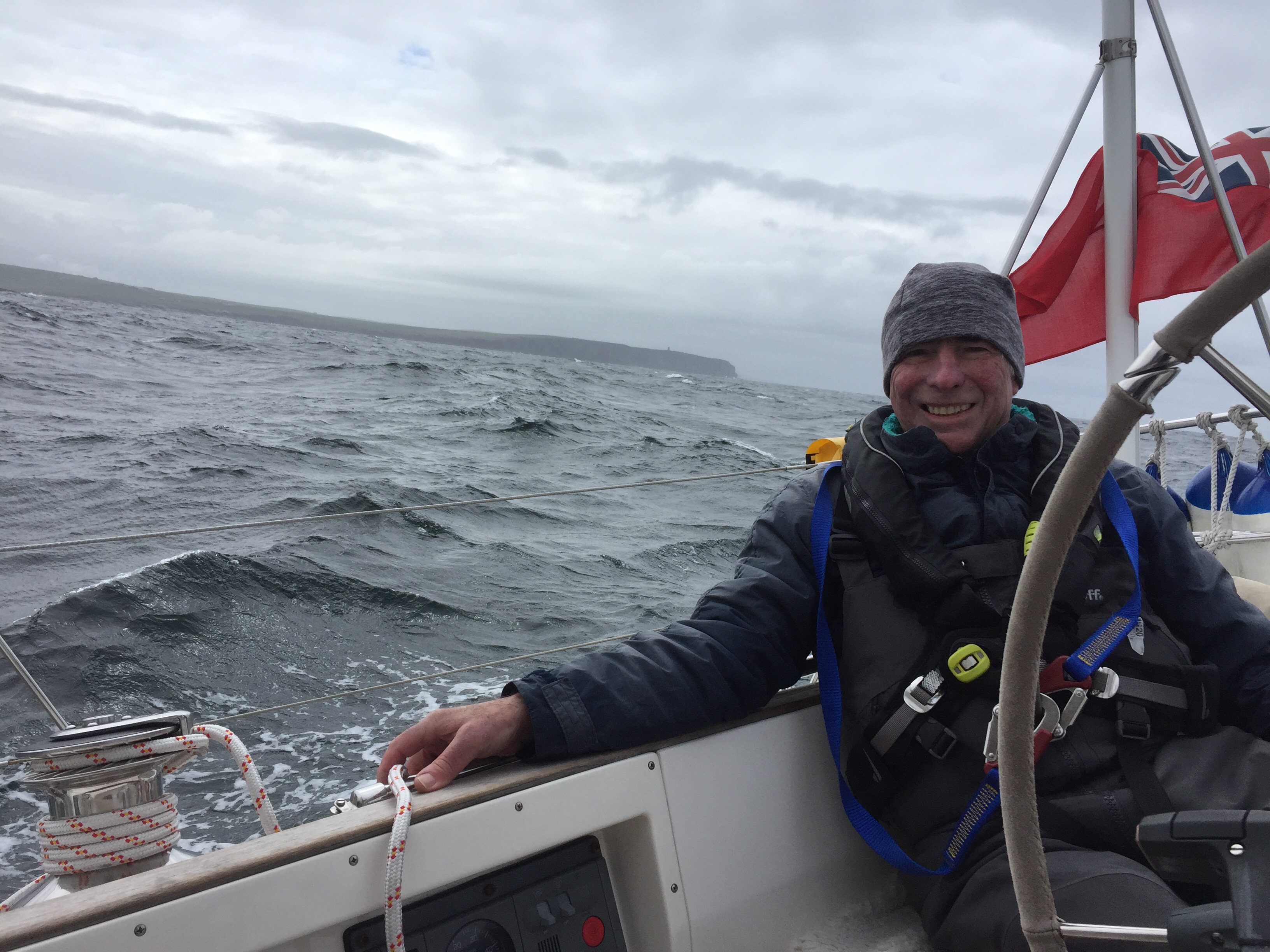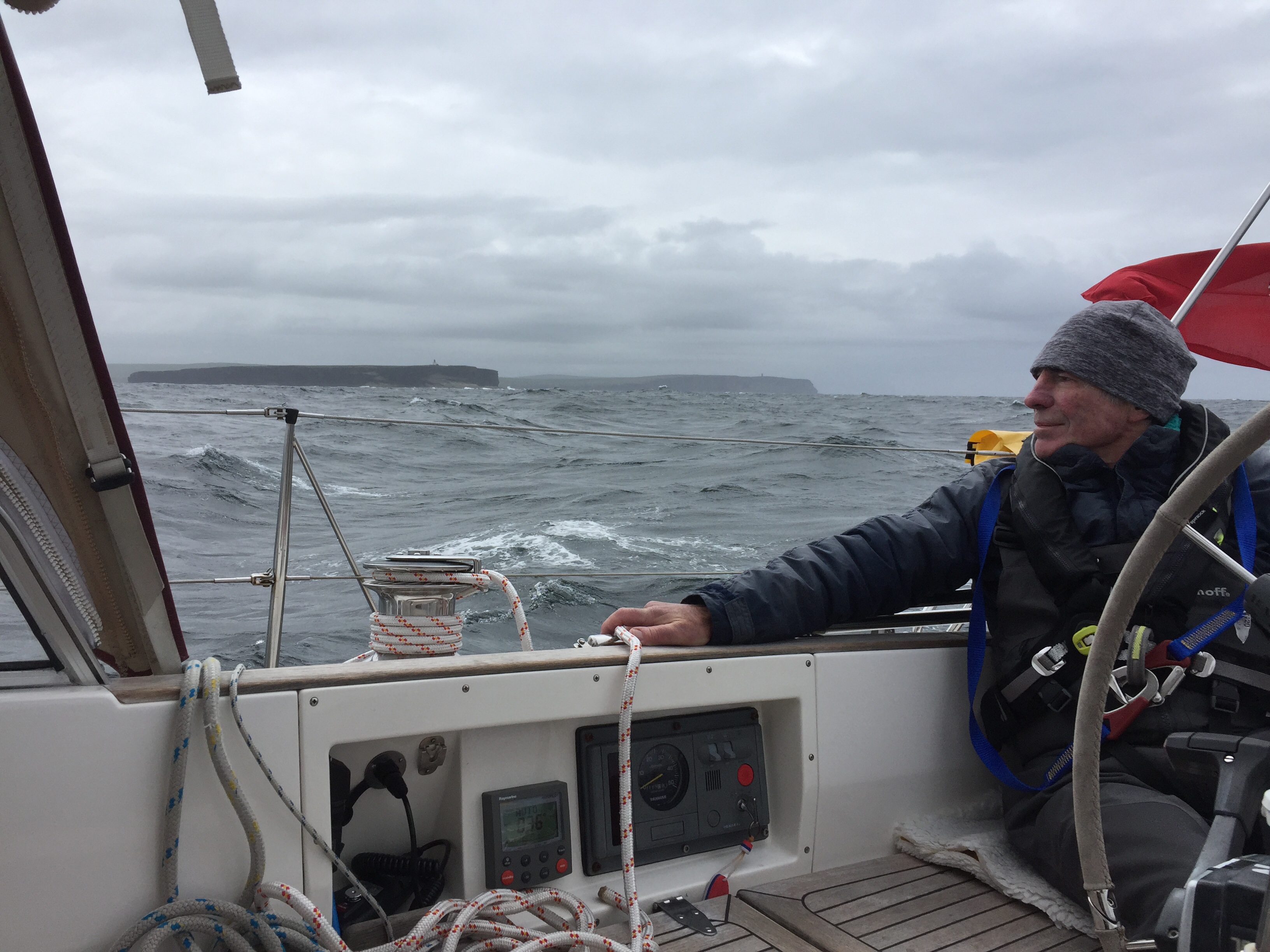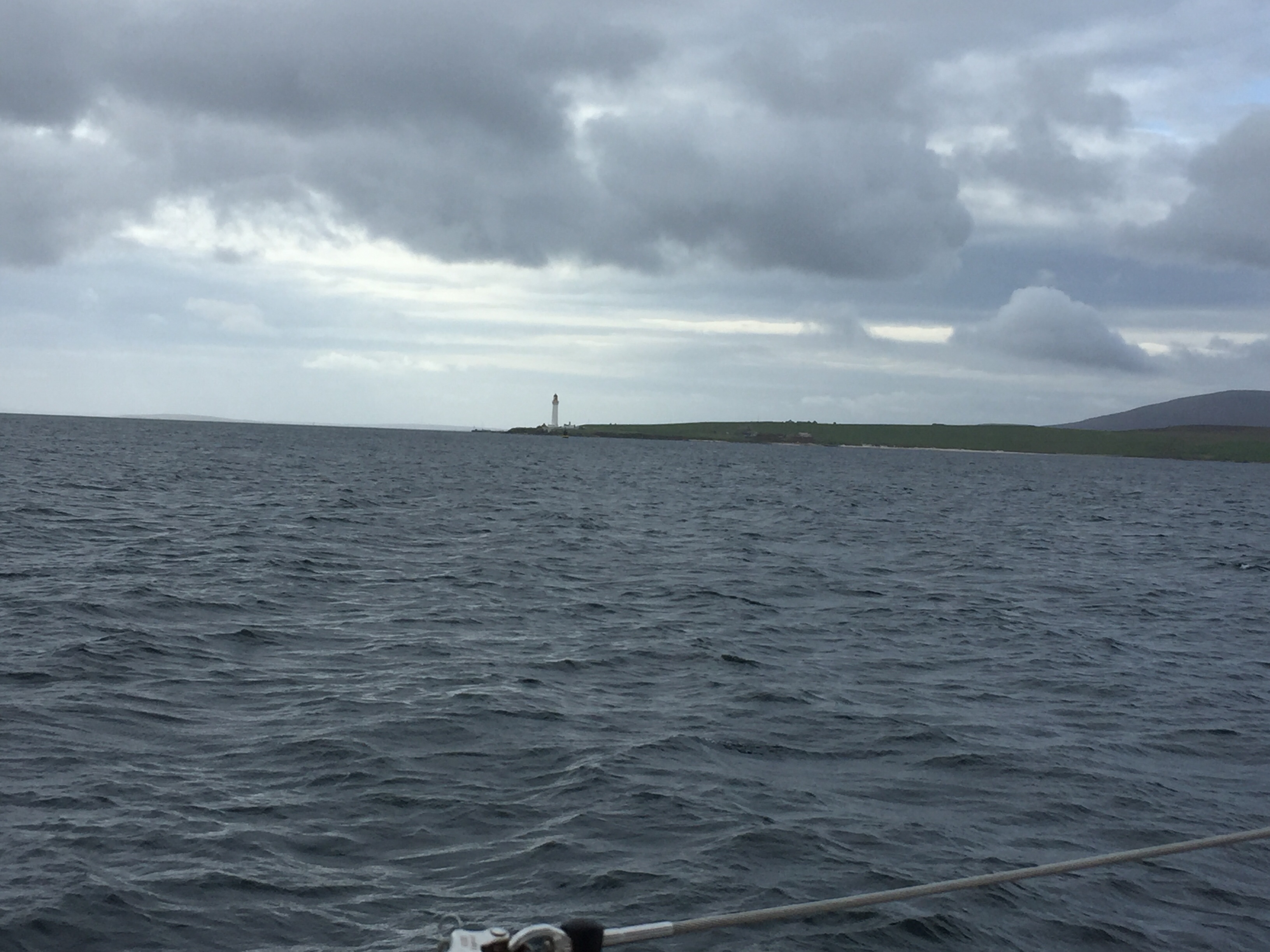 It was another grey morning. We saw our pals on Flying boat set off about 0830 headed for Wick. They had been with us since Lochalsh . We kept an eye on them all day … on marine traffic. They arrived 9 pm. We set off st 9 so as to get the tide going out of Hoy Sound. Trouble was the wind was coming from the west so the result was horrible big waves that we just had to bash into under motor. I was praying that there would be enough wind that meant we could just sail with the head sail. The thought of having to put up the main in that sea was frankly 😱. On Angelique, Julian has to physically go to the mast to hoist the sail whilst my job is keeping her head to wind during the procedure. All okay in reasonable weather and not massive waves. Anyway we got out of Hoy Sound and turned right. Wind was southwesterly so a good direction and about 18-25 knots so we just put the headsail out and were on our way to to mist northerly point of our trip. It wasn’t a comfortable ride as the seas were rough and tossing Angelique from side to side. Fortunately I had remembered ( what I learned a few years ago) to wedge foam pads into all the cupboards, especially those with pans etc in them. This stops the contents from banging against the doors continuously for 8 hours…. so annoying! Pasties for lunch were a highlight of the trip. The coastline is stunning with dramatic cliffs and lonely lighthouses. Strange to see from the sea, what we had trod on a few days ago. In the grey and the gloom we finally approached our destination.