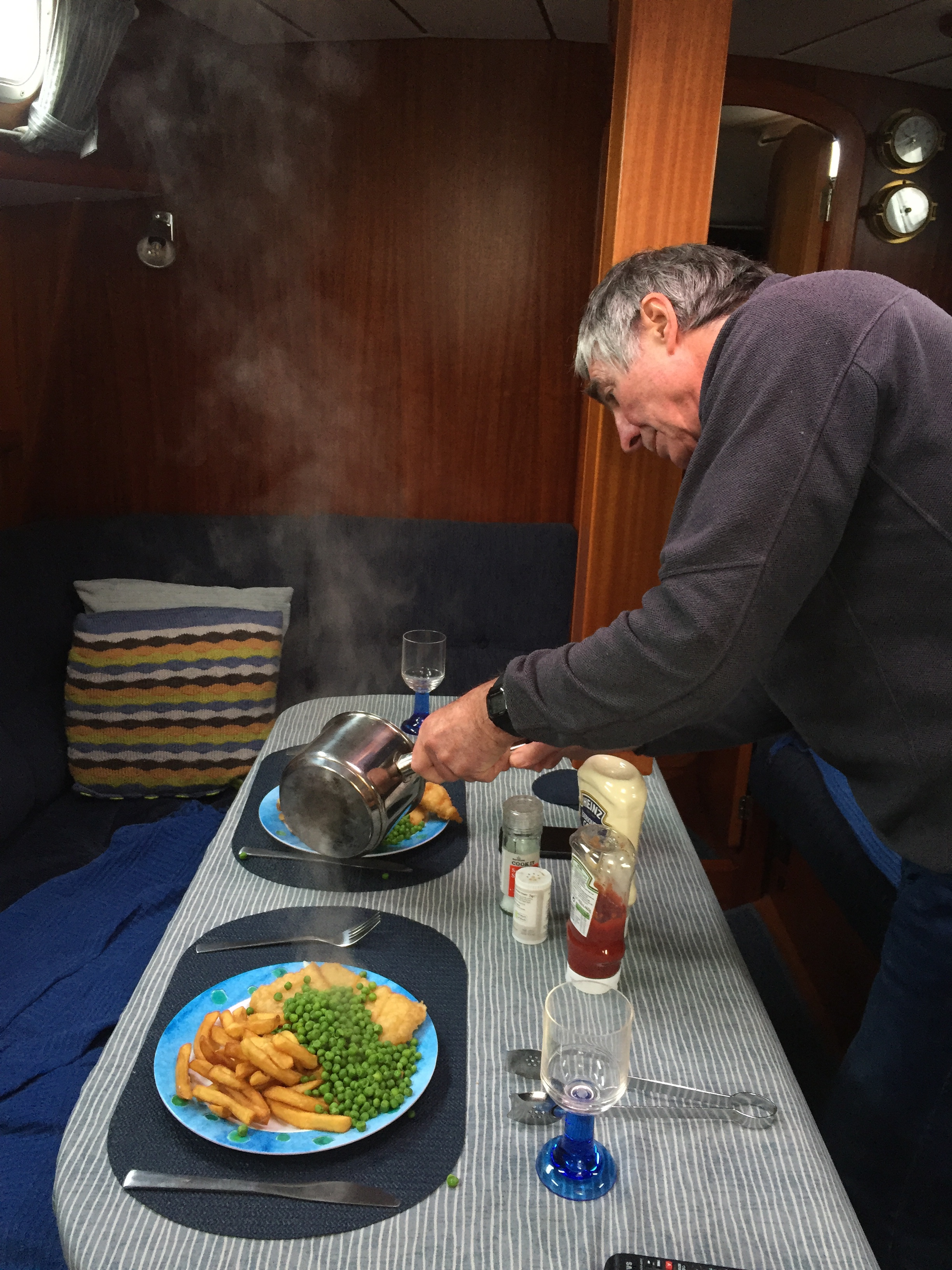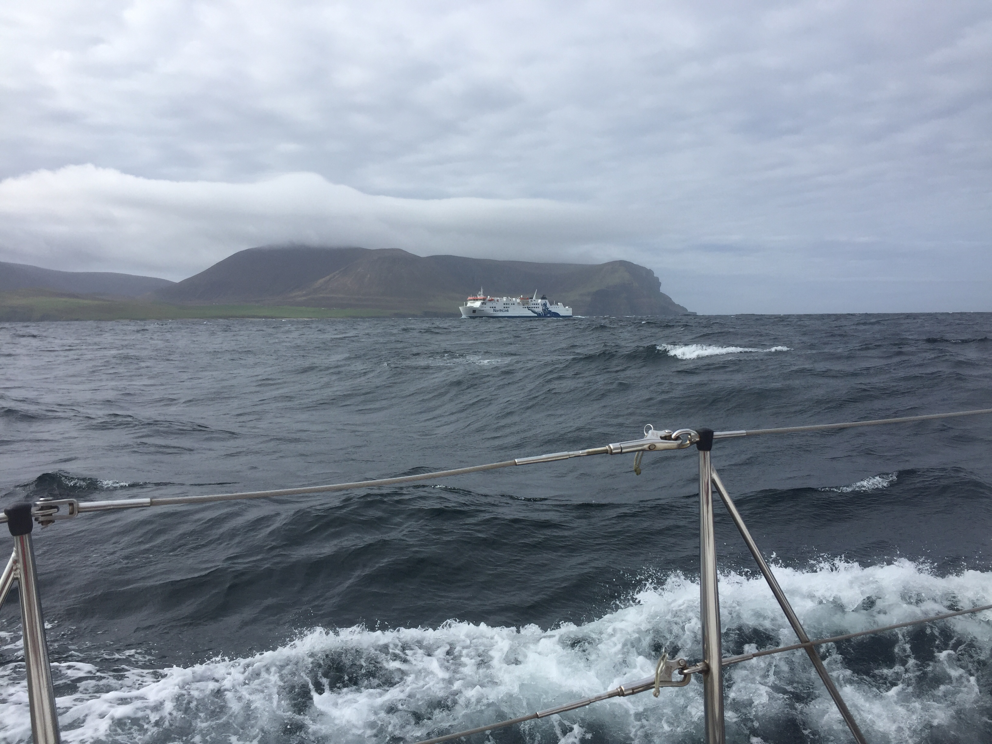 on the way and at one point you could actually tell where the sun was ….. even if you couldn’t actually see it. After Nope head we gybed and made course for Papa Sound which separates Westray from Papa Westray. We furled the headsail and motored through the sound and on into Periowall marina. Men from the commercial vessel that went in before us kindly took our lines and helped us tie up. Shortly after we had a visit from Jacob the acting Harbour master, who was SO welcoming and kind. He gave us the phone number for fish and chips who actually delivered them to the boat! Amazing and delicious. Thank you! Then a successful night on the tv! ( It doesn’t work everywhere) Liverpool won the cup and Sam Ryder came second in Eurovision!!! Truly a night to remember…… and I can have a lie in tomorrow! 👍