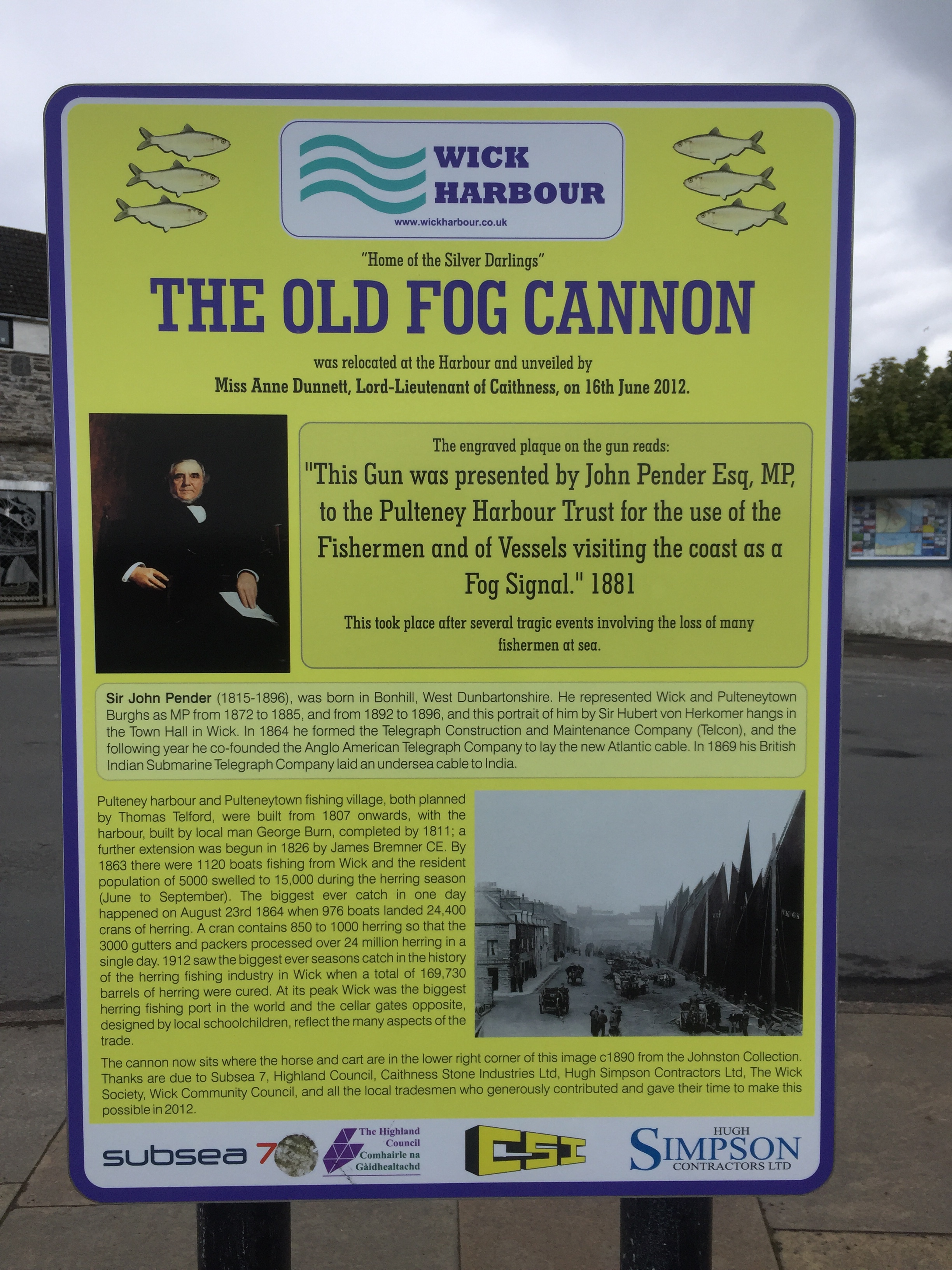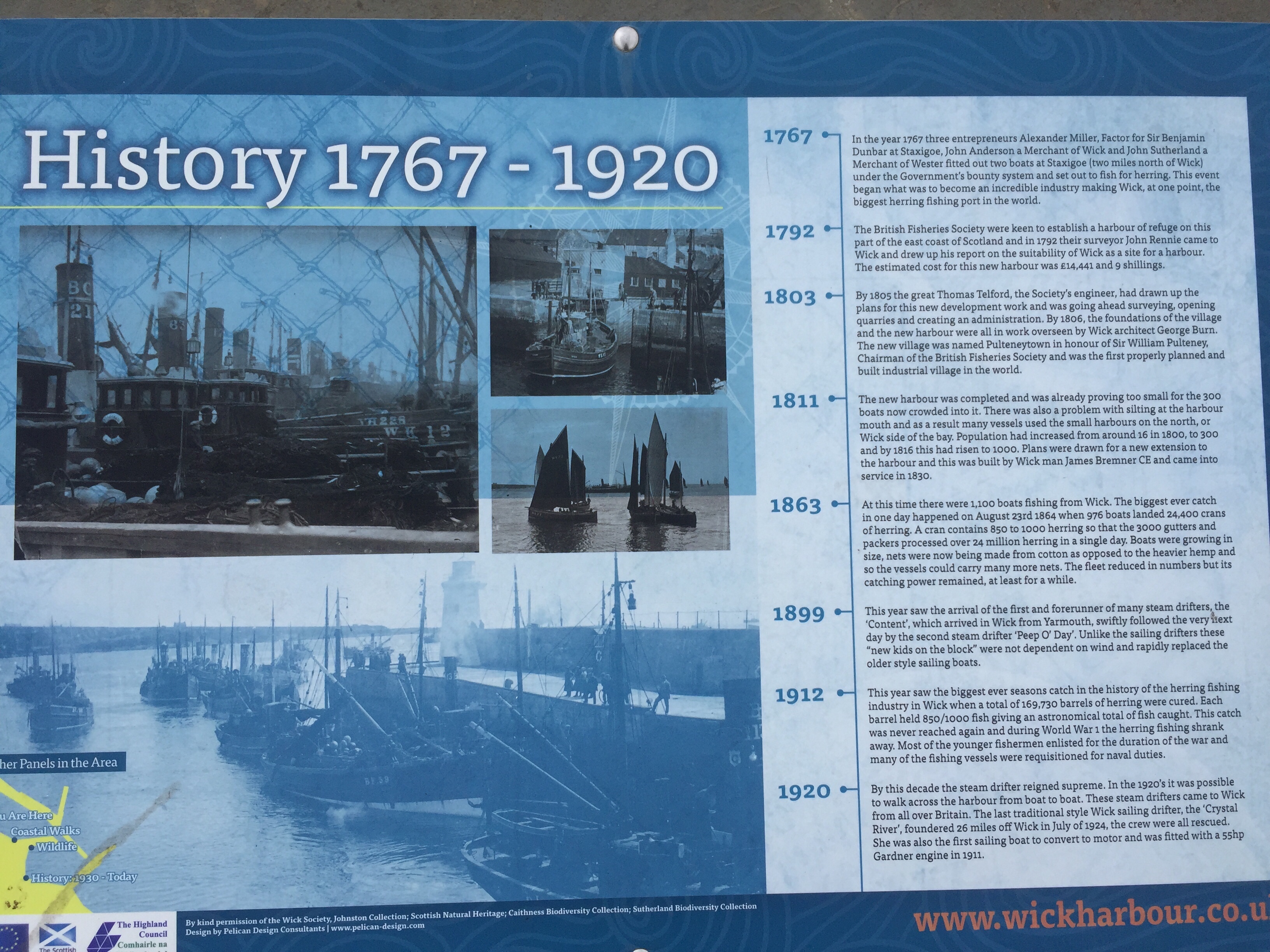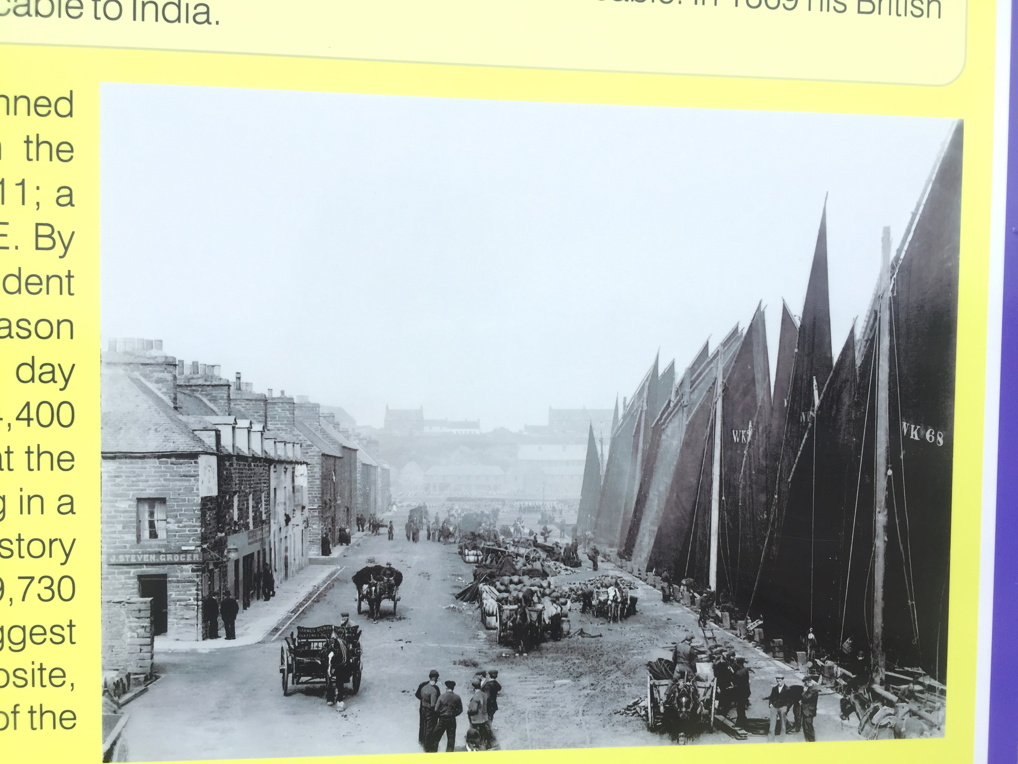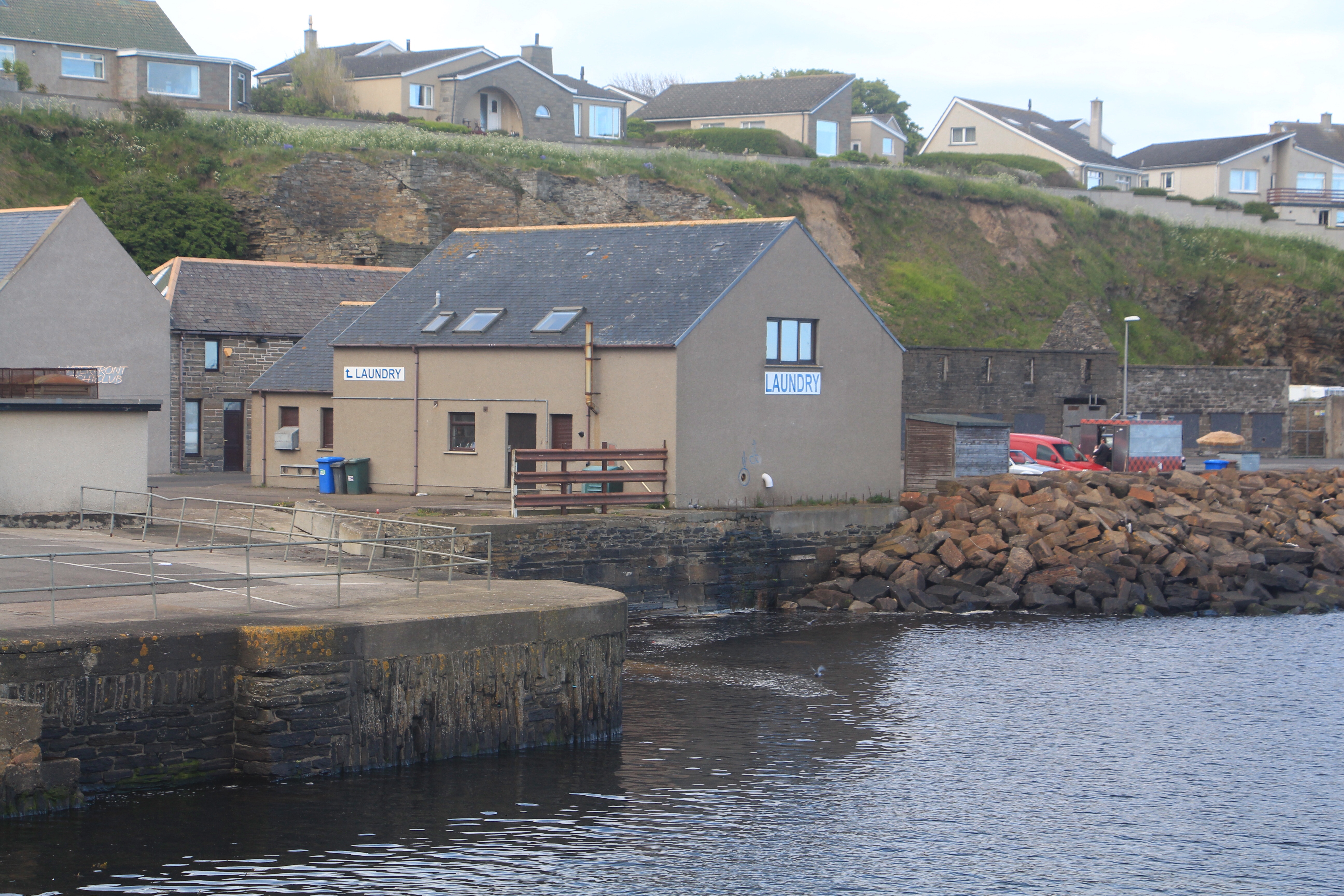 Today was a lot brighter and less wet! After a wonderful cooked breakfast for a treat it was to be a doing jobs day. Laundry, shopping, various phone calls, cleaning the boat, etc etc. we had established that not much opens in Wick on a Sunday, and therefore was with glee that I discovered that there was a 24 hour 7 day a week, coin operated self service laundrette… within walking distance . Surprisingly the harbour master said he wasn’t sure because he’d never been asked about laundry before 🤔. I left J cleaning Angelique whist I went off to the find Wick laundry. Obviously a locals laundrette so there were absolutely no instructions, but I had taken lots of coins so no problem!Fortunately there were friendly folk on hand and I put the washing on for £5.50 . While waiting I took advantage of “the Scran van” and had a cup of tea sitting under a rather incongruous Hawaiian looking umbrella. Then of course once done it had to be dried….. no driers free, so I had to wait until one was. All very time consuming. Julian had had time to clean the whole boat and do the phone calls , but all had gone well, except he’d managed to fill one of his wellies with water whilst doing so. Next job was shopping so off to the coop we went, list in hand. With our trolley and rucksacks. On the way we read the various plaques telling us all about Wick harbour and Pulteneytown, was at one time the biggest herring port in the world. I photographed some of the plaques as it’s an interesting history. Walking around you could see how wealthy the town must have been in the 1800’s, with all sorts of statues and memorials to people and lists of important people who had been there. One interesting feature was there were commemorative flag stones in the pavements depicting long gone shops and local businesses…… and also the signature of L.S Lowry and some of his figures.. not sure why. Or what the connection may be. Maybe you might know Christine or Stan? Anyway after eventually finding the co op; we trundled our trolley back avoiding the many “trolley hazards “ that go unnoticed in normal life. Kerbs, cobbles, potholes, uneven flagstones and of course 🐕 💩😩.