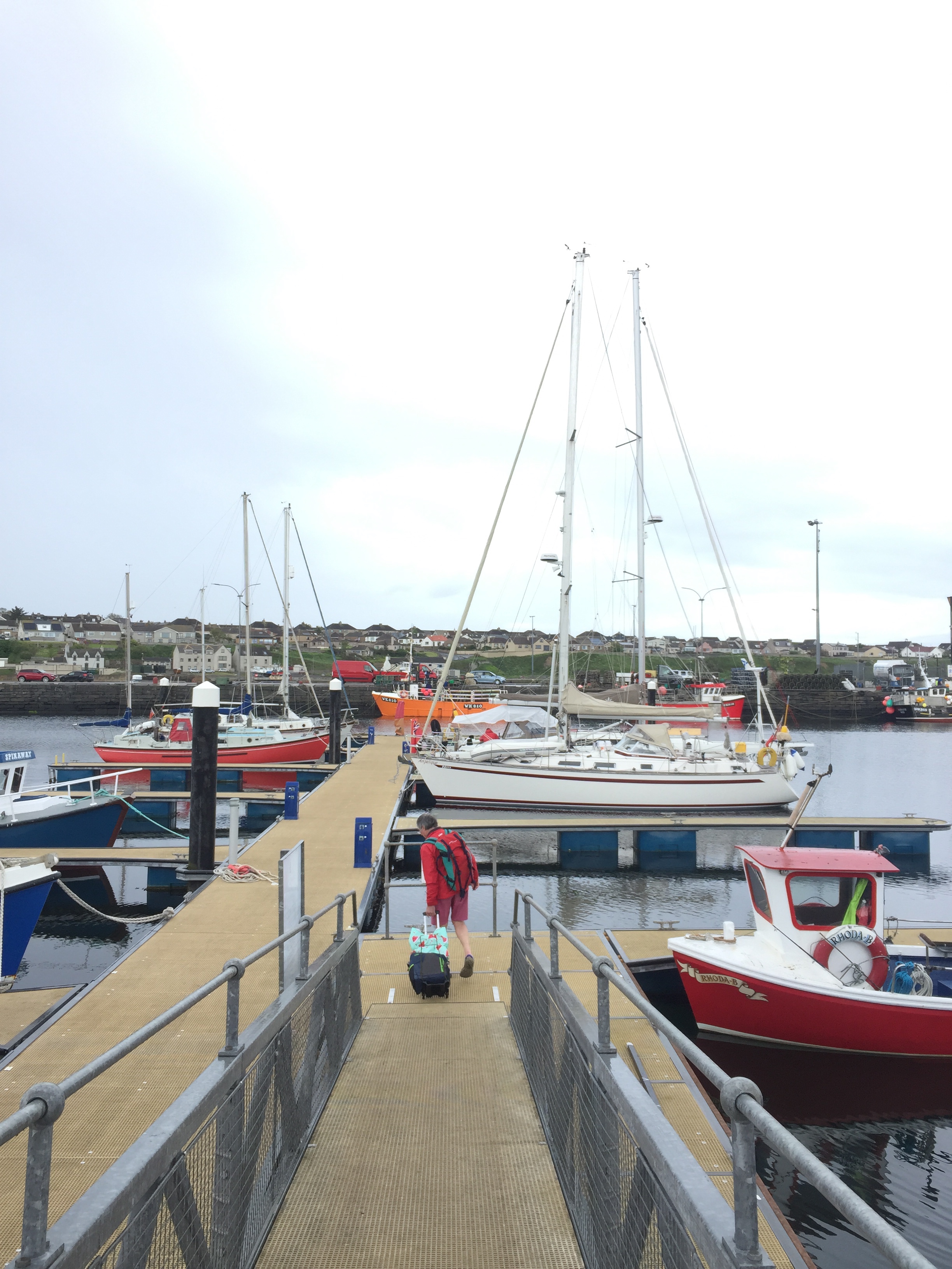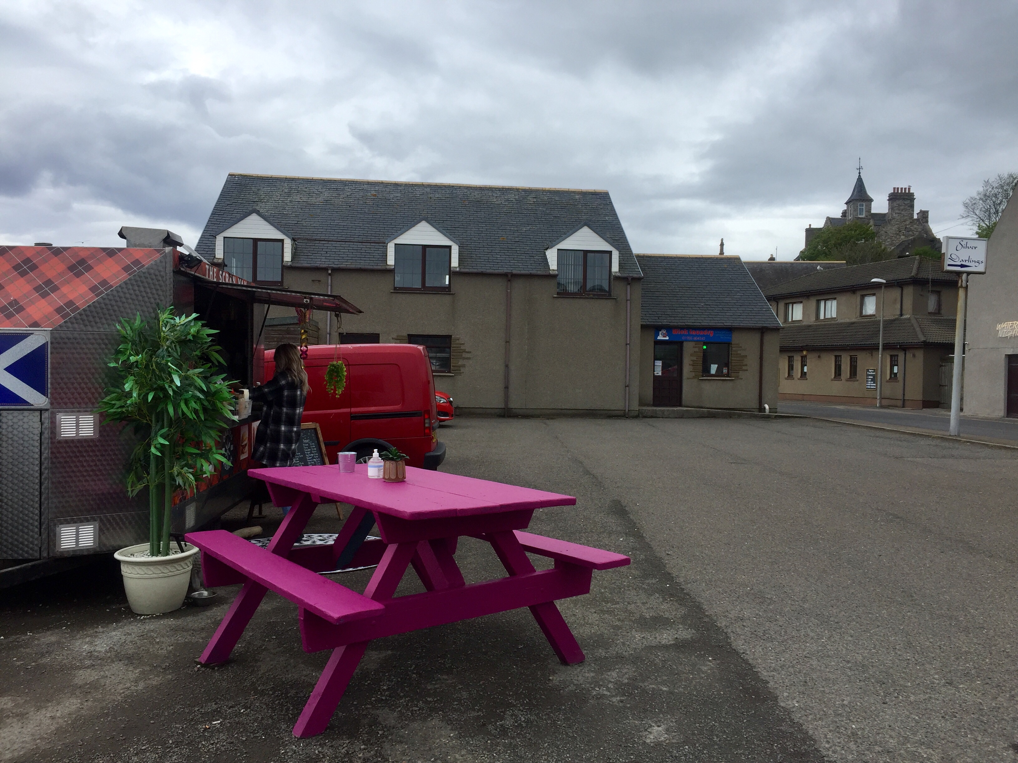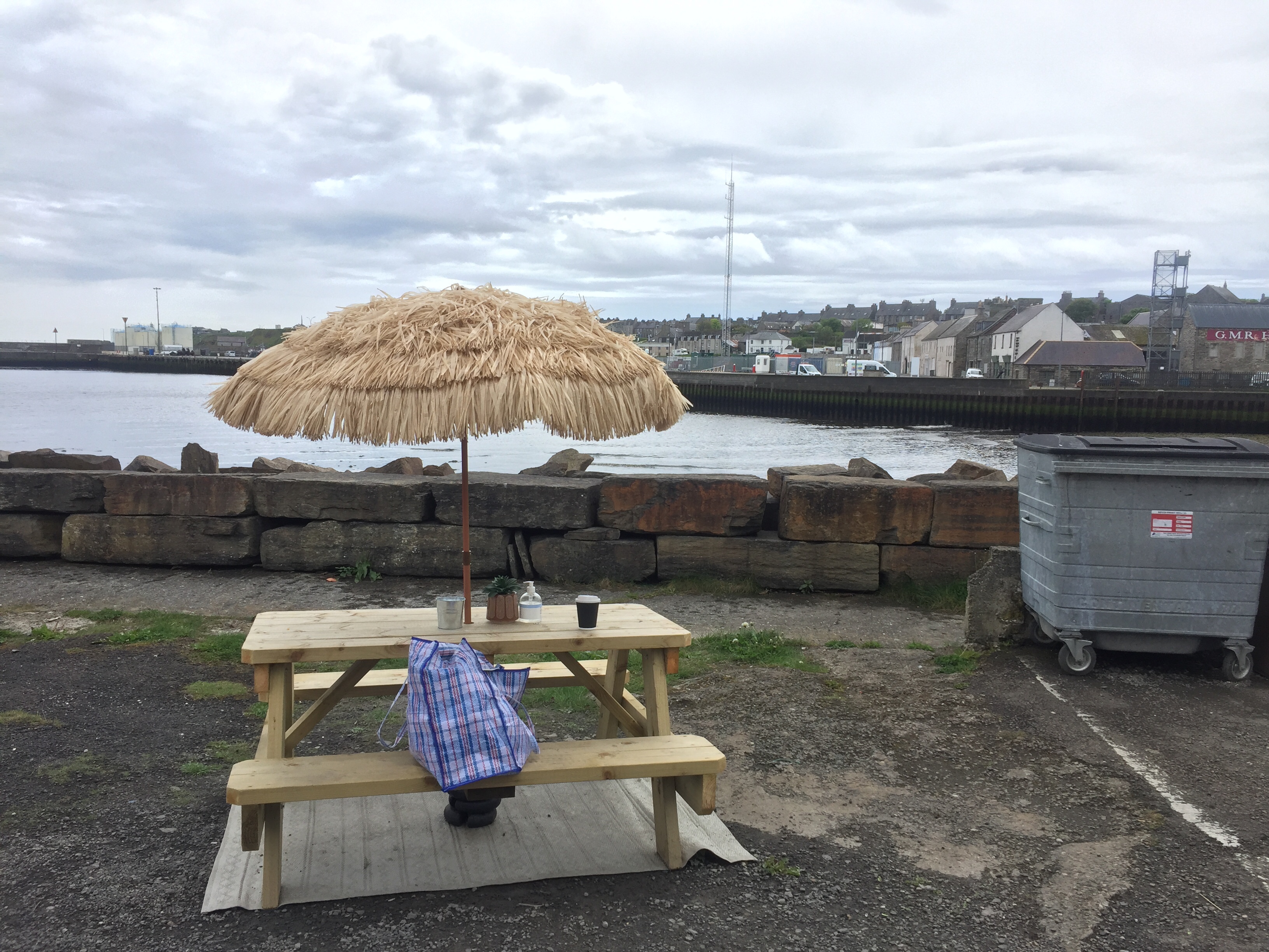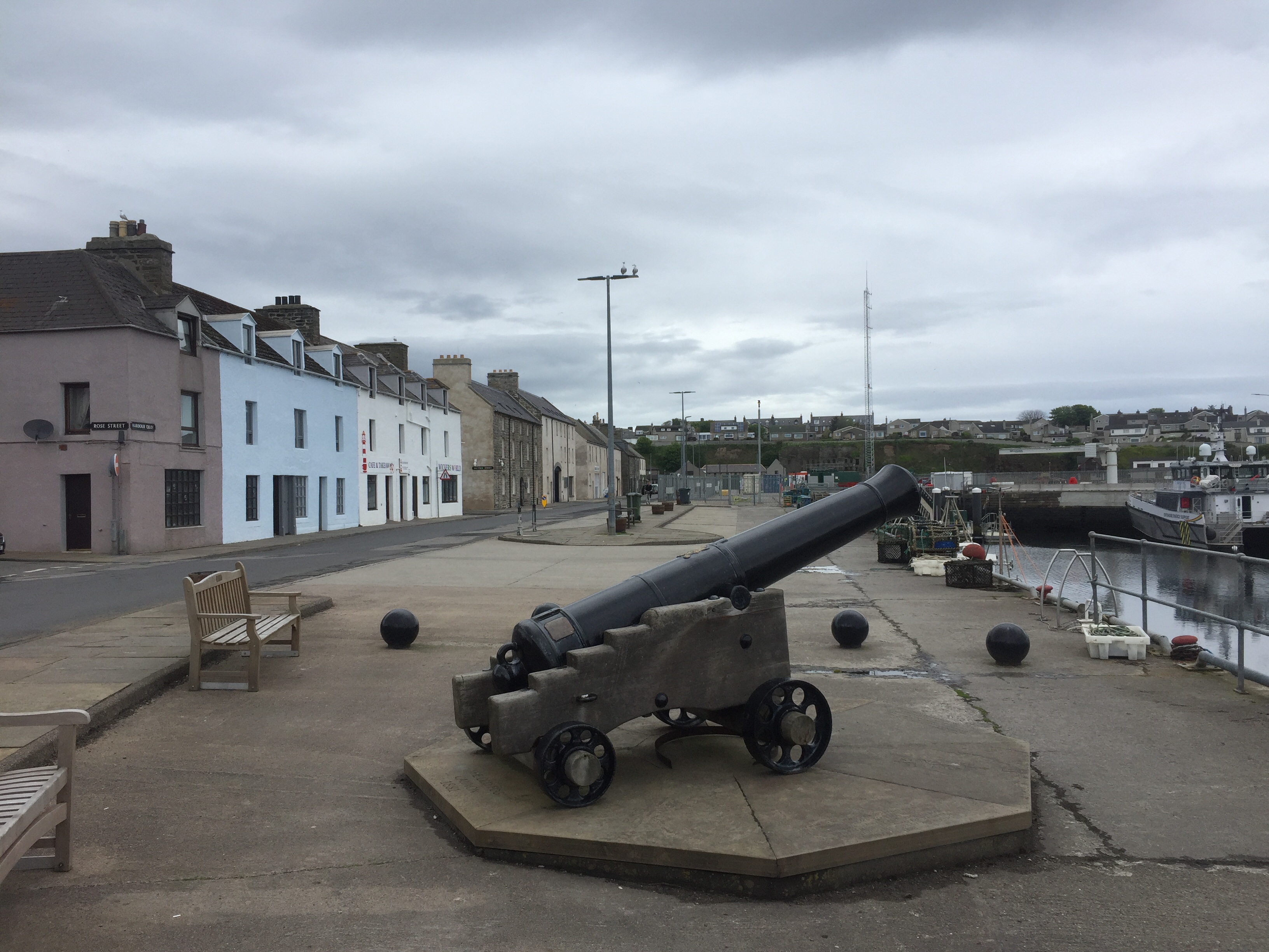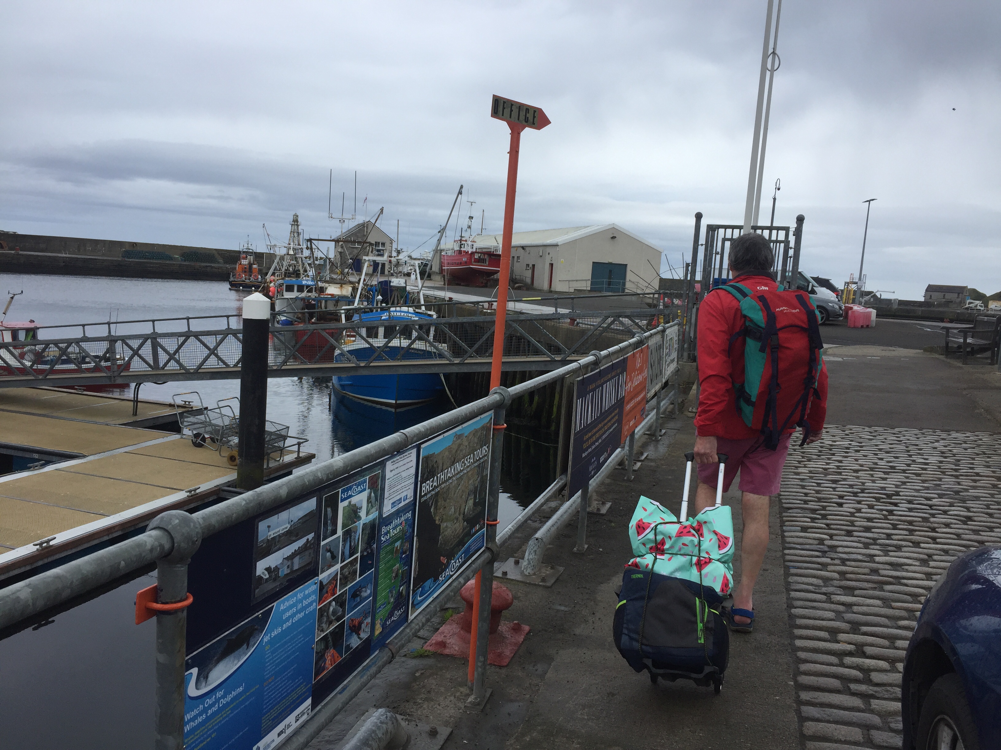 Today was a lot brighter and less wet! After a wonderful cooked breakfast for a treat it was to be a doing jobs day. Laundry, shopping, various phone calls, cleaning the boat, etc etc. we had established that not much opens in Wick on a Sunday, and therefore was with glee that I discovered that there was a 24 hour 7 day a week, coin operated self service laundrette… within walking distance . Surprisingly the harbour master said he wasn’t sure because he’d never been asked about laundry before 🤔. I left J cleaning Angelique whist I went off to the find Wick laundry. Obviously a locals laundrette so there were absolutely no instructions, but I had taken lots of coins so no problem!Fortunately there were friendly folk on hand and I put the washing on for £5.50 . While waiting I took advantage of “the Scran van” and had a cup of tea sitting under a rather incongruous Hawaiian looking umbrella. Then of course once done it had to be dried….. no driers free, so I had to wait until one was. All very time consuming. Julian had had time to clean the whole boat and do the phone calls , but all had gone well, except he’d managed to fill one of his wellies with water whilst doing so. Next job was shopping so off to the coop we went, list in hand. With our trolley and rucksacks. On the way we read the various plaques telling us all about Wick harbour and Pulteneytown, was at one time the biggest herring port in the world. I photographed some of the plaques as it’s an interesting history. Walking around you could see how wealthy the town must have been in the 1800’s, with all sorts of statues and memorials to people and lists of important people who had been there. One interesting feature was there were commemorative flag stones in the pavements depicting long gone shops and local businesses…… and also the signature of L.S Lowry and some of his figures.. not sure why. Or what the connection may be. Maybe you might know Christine or Stan? Anyway after eventually finding the co op; we trundled our trolley back avoiding the many “trolley hazards “ that go unnoticed in normal life. Kerbs, cobbles, potholes, uneven flagstones and of course 🐕 💩😩.