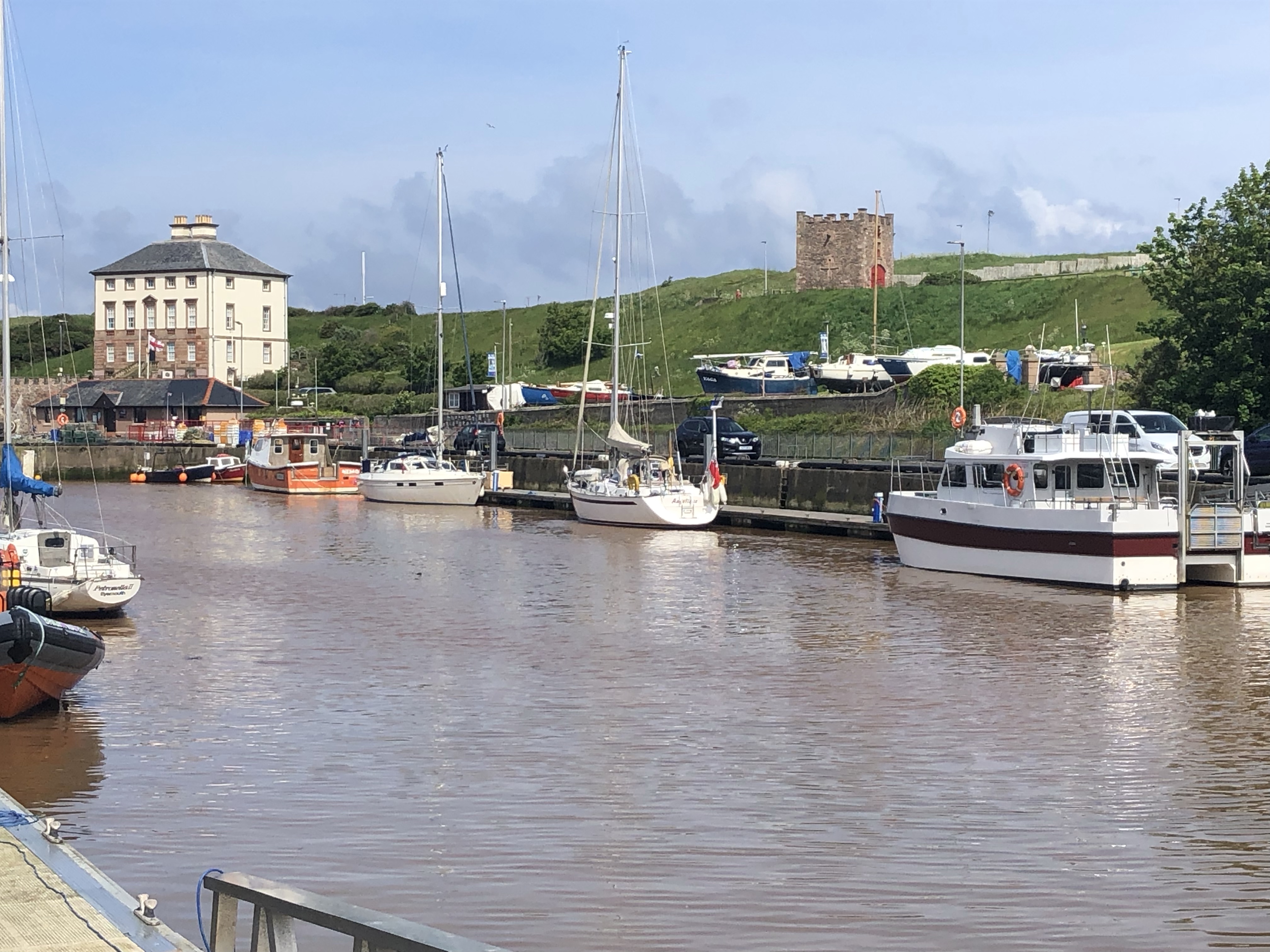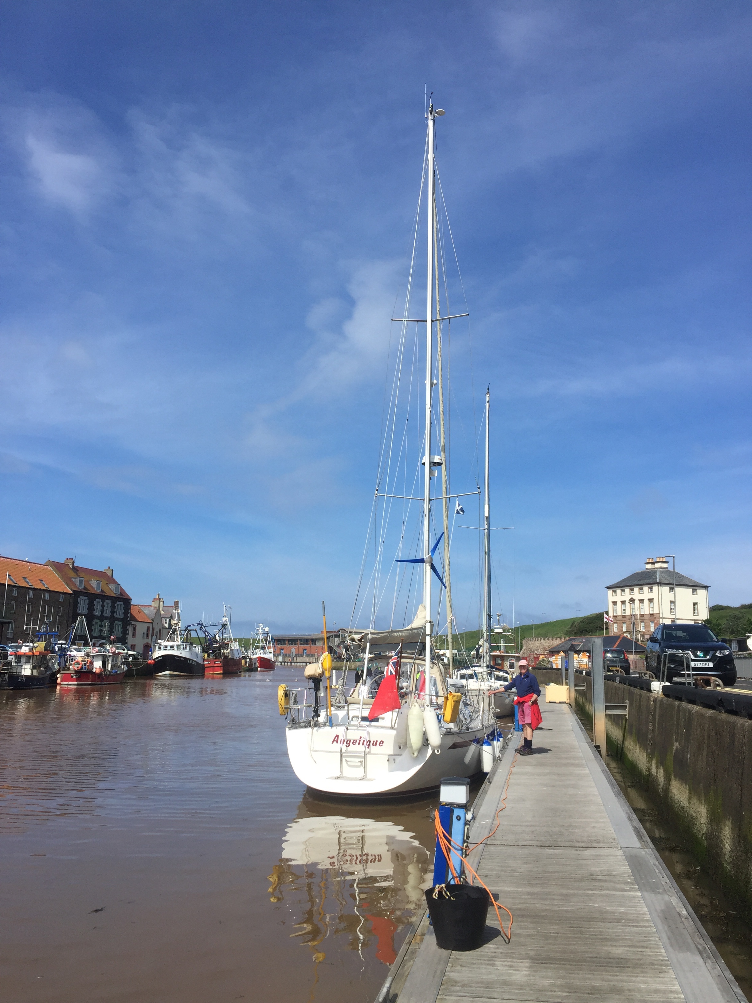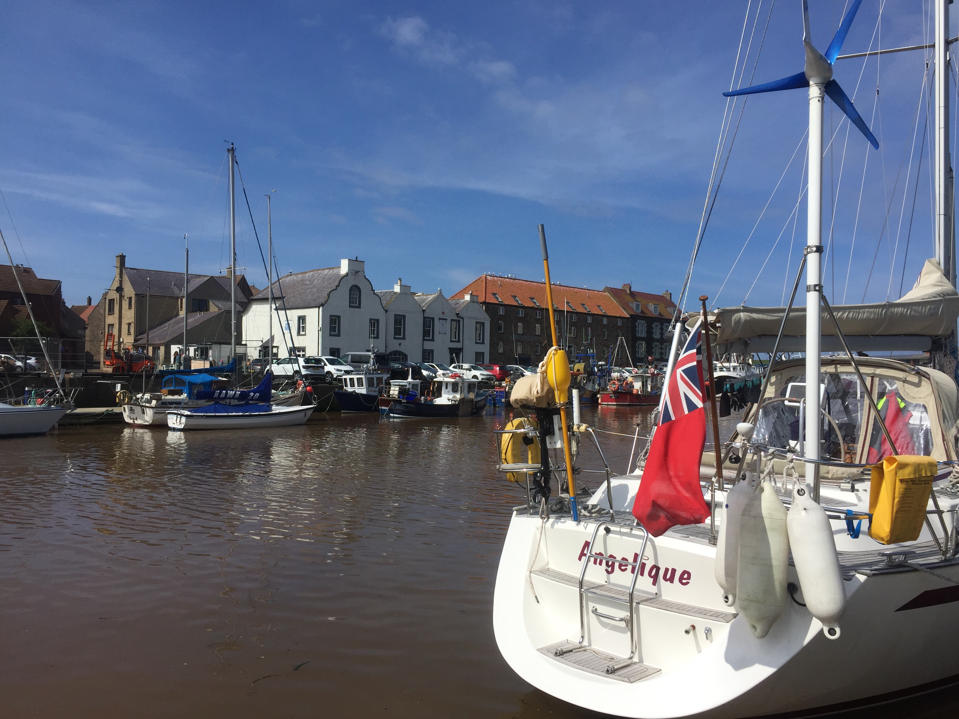 The first hour of today’s trip was not great. The anchorage wasn’t too bad until the wind changed to a more northerly direction, bringing the North Sea swell in. Arose at 0400 hrs It was raining, pretty gloomy and Angelique going up and down like a bucking bronco. There was a line in the sky on the horizon where the dawn was breaking meeting with the glow in the west from the previous sunset. We got the anchor up and the boat immediately turned towards the mouth of the tunnel like entrance into Eyemouth harbour. Once inside life was transformed into a peaceful quiet river setting. We knew where we were meant to go having spoken to the HM previously. Thankful that no one was on the pontoon we slid alongside and tied up. The incongruity of it all was magical. On the opposite side a small Italian bistro cafe had twinkly lights on, and a blackbird was singing nearby. I went back to bed and the town clock chimed 5 times. Both tired we slept quite late. After which we found where the harbour office and the facilities were. All very lovely and new but quite a walk. The harbour is not a marina. Basically a truly working fishing harbour but one that welcomes yachts. It’s obviously a thriving town and also holiday destination. It is really delightful. We went for a wander into the little town which surrounds the harbour. The harbour is long and thin and joins the river Eye with the sea. J managed to straight away get gaz from the chandlery and at the cheapest price we’ve seen for years! There is lots of fresh fish around to buy and at much cheaper price than in the supermarket. They’re redeveloping the whole one side of the harbour where the old fish market was so there’s obviously some money around. It is altogether a delightful bustling little place … holiday makers and working people seemingly enjoying what each brings. A colourful place which we will remember as one of the highlights of our journey so far.
