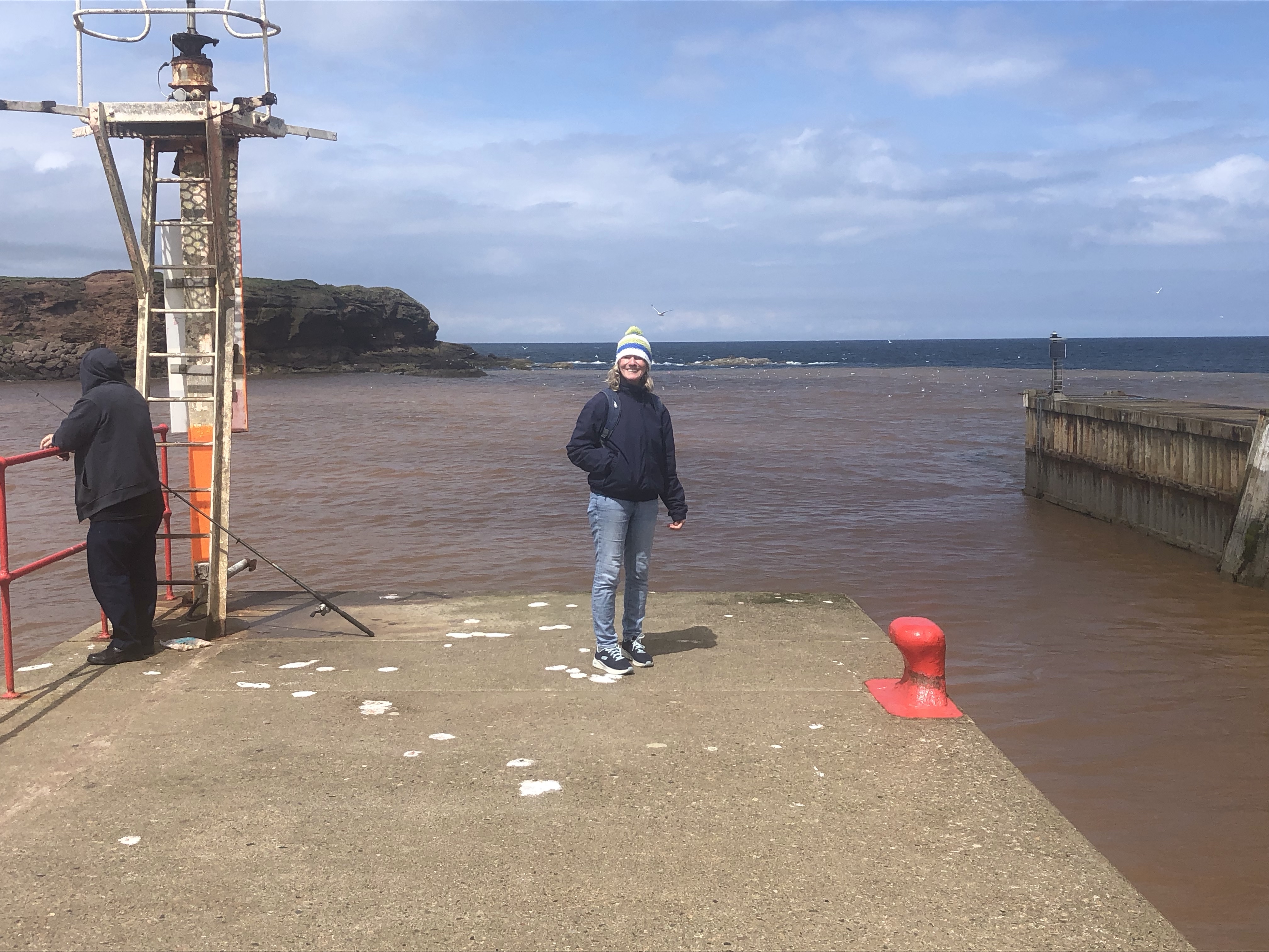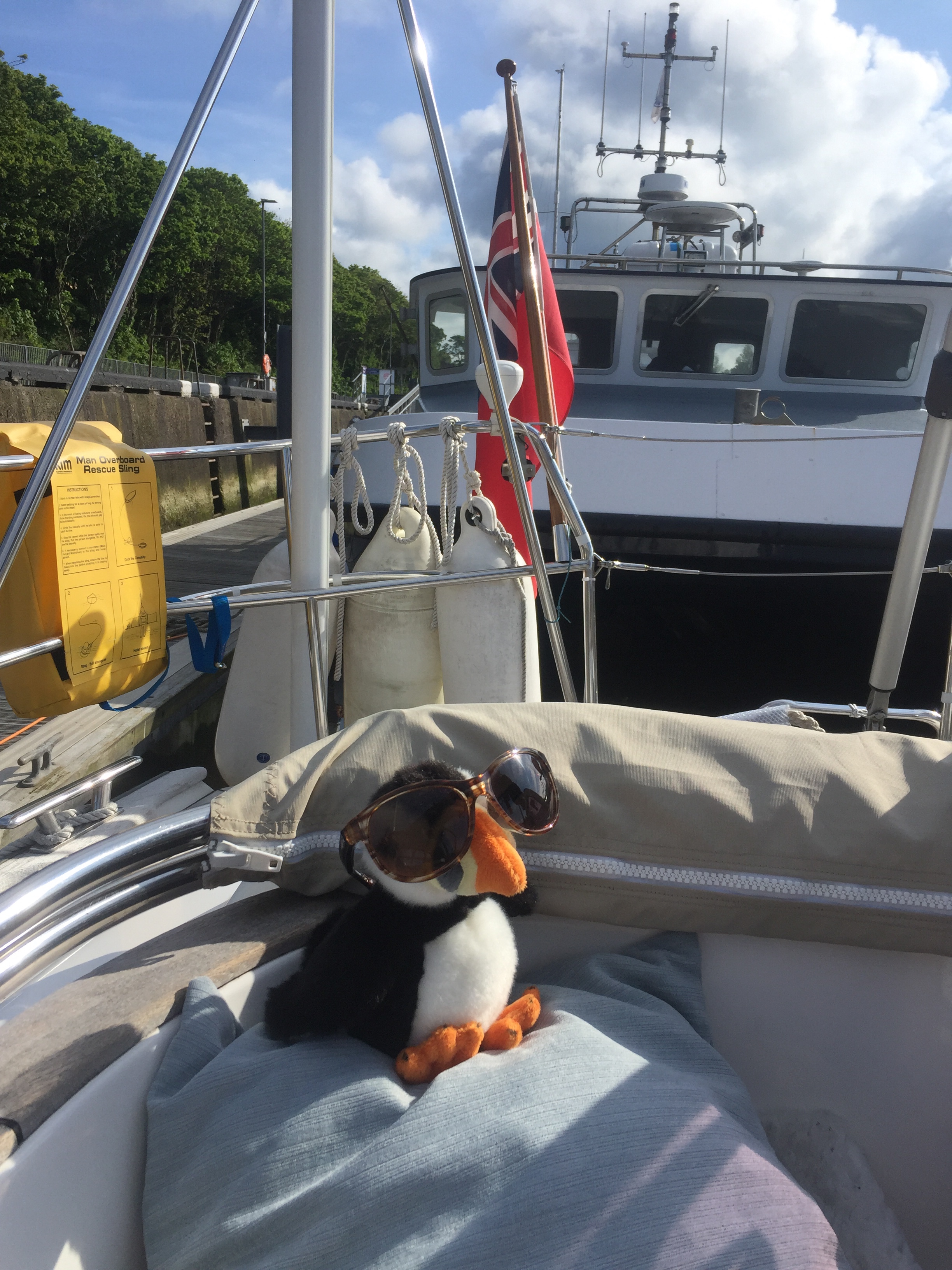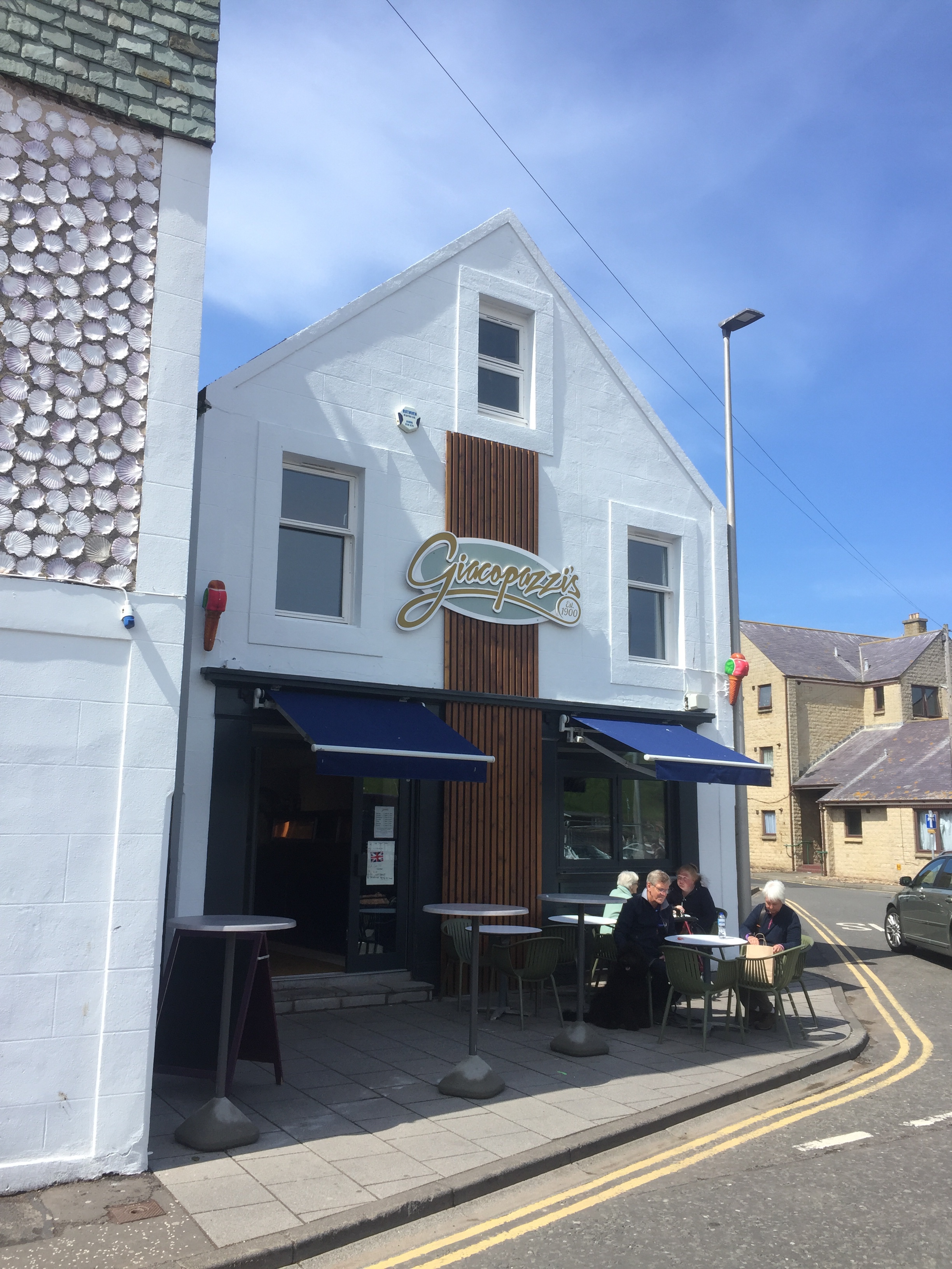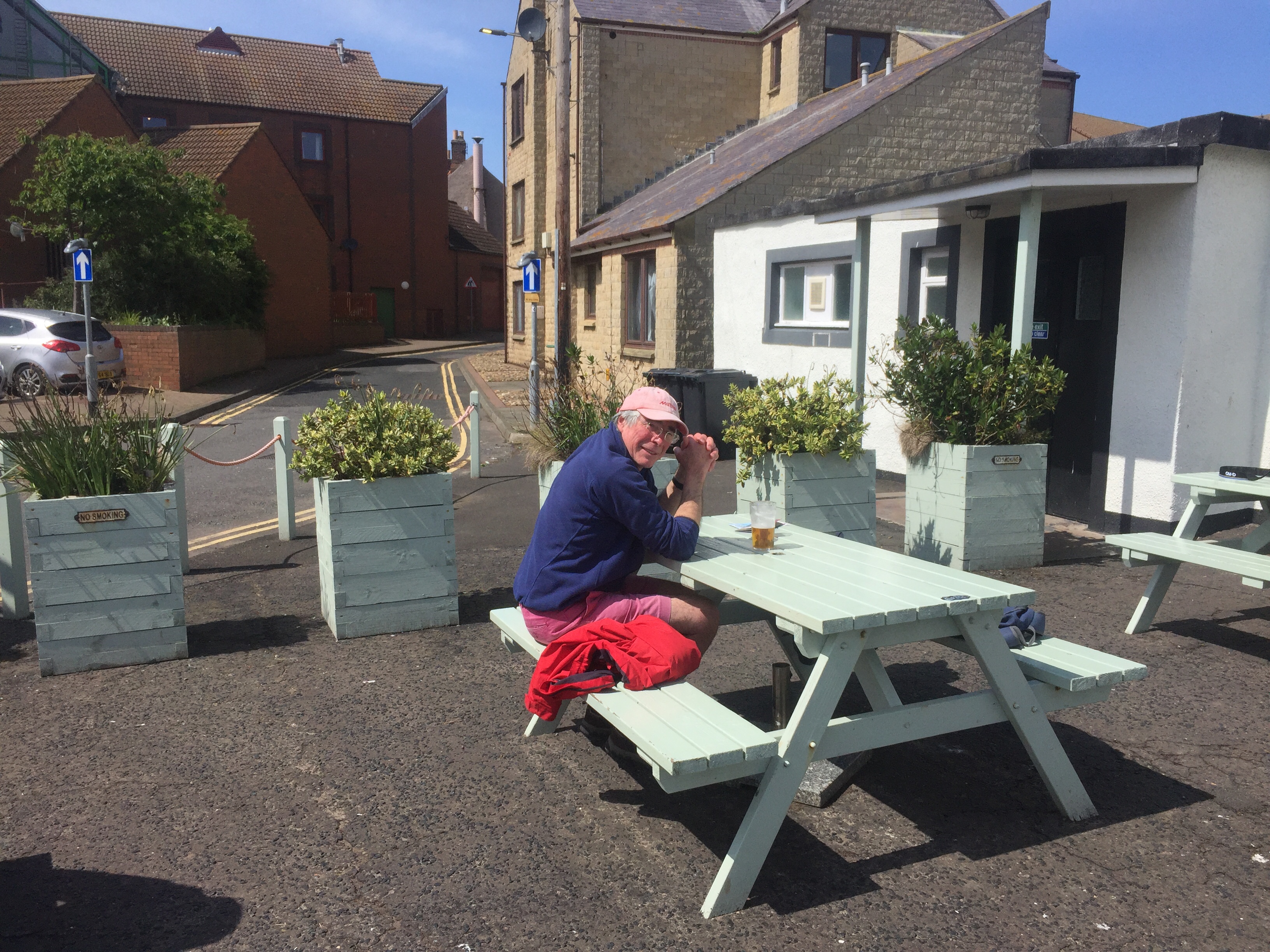 The first hour of today’s trip was not great. The anchorage wasn’t too bad until the wind changed to a more northerly direction, bringing the North Sea swell in. Arose at 0400 hrs It was raining, pretty gloomy and Angelique going up and down like a bucking bronco. There was a line in the sky on the horizon where the dawn was breaking meeting with the glow in the west from the previous sunset. We got the anchor up and the boat immediately turned towards the mouth of the tunnel like entrance into Eyemouth harbour. Once inside life was transformed into a peaceful quiet river setting. We knew where we were meant to go having spoken to the HM previously. Thankful that no one was on the pontoon we slid alongside and tied up. The incongruity of it all was magical. On the opposite side a small Italian bistro cafe had twinkly lights on, and a blackbird was singing nearby. I went back to bed and the town clock chimed 5 times. Both tired we slept quite late. After which we found where the harbour office and the facilities were. All very lovely and new but quite a walk. The harbour is not a marina. Basically a truly working fishing harbour but one that welcomes yachts. It’s obviously a thriving town and also holiday destination. It is really delightful. We went for a wander into the little town which surrounds the harbour. The harbour is long and thin and joins the river Eye with the sea. J managed to straight away get gaz from the chandlery and at the cheapest price we’ve seen for years! There is lots of fresh fish around to buy and at much cheaper price than in the supermarket. They’re redeveloping the whole one side of the harbour where the old fish market was so there’s obviously some money around. It is altogether a delightful bustling little place … holiday makers and working people seemingly enjoying what each brings. A colourful place which we will remember as one of the highlights of our journey so far.