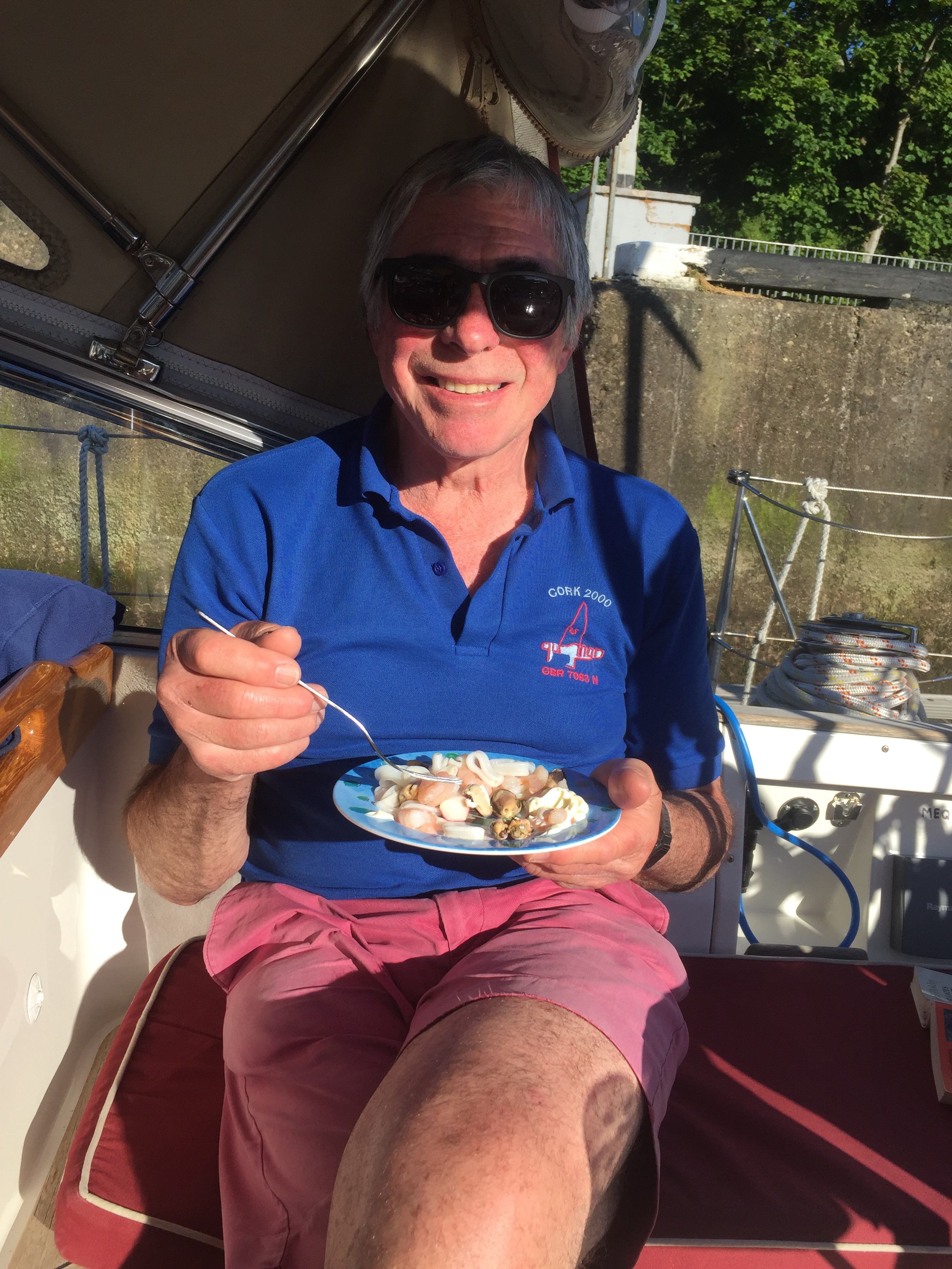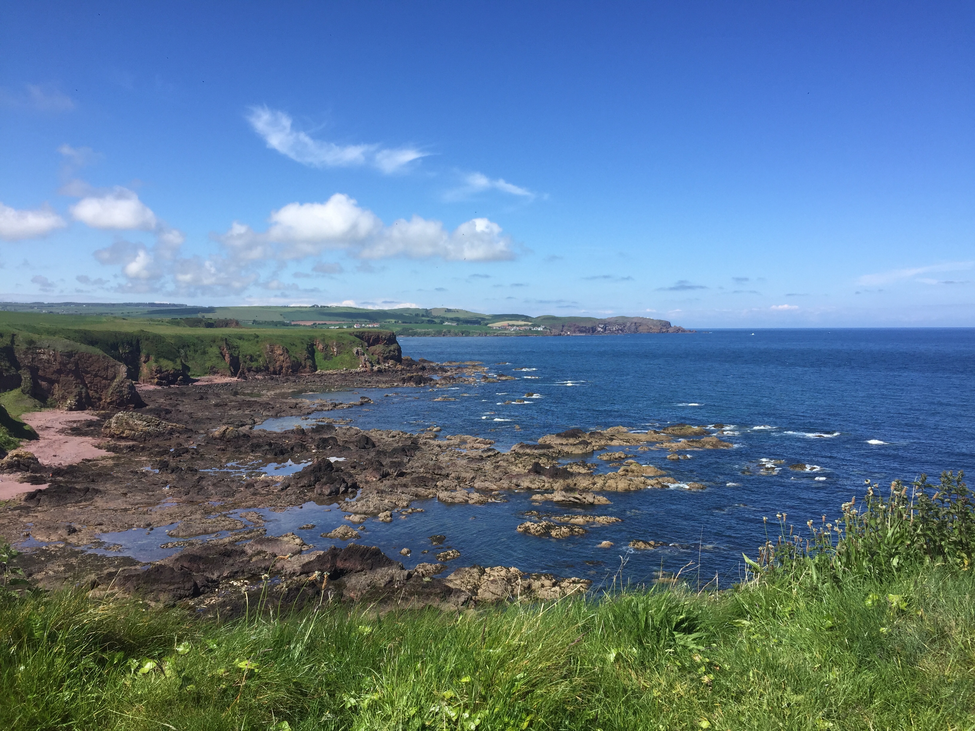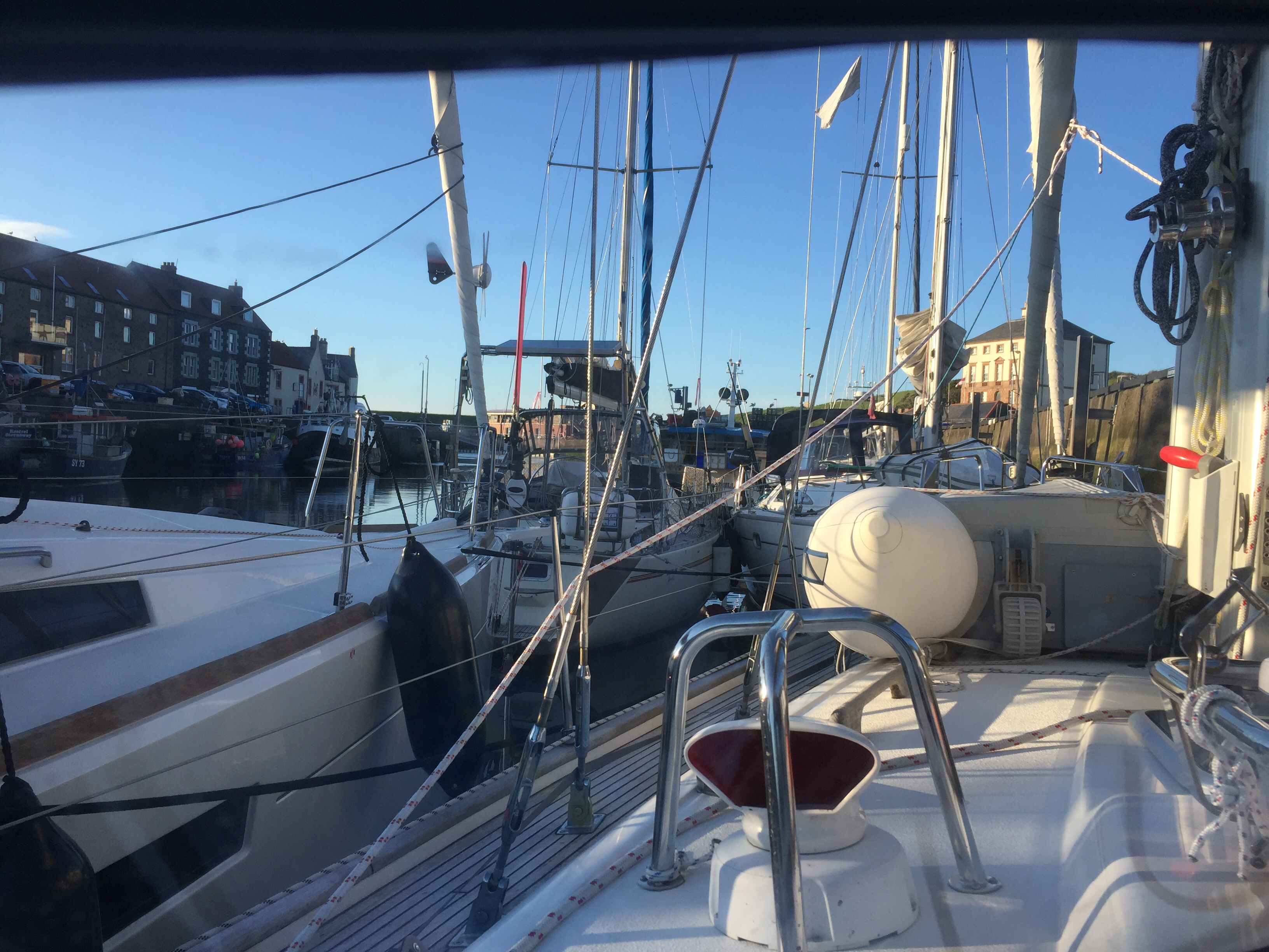 Lazy lovely waking. Secure safe and the sun is on the way . A few more yachts are arriving so needed to help sort lines etc. It’s a lovely thing about sailing that everyone helps everyone else. We all know that it’s not always easy. Some people ( quite a lot actually) are sailing single handed. I did a bit of hand washing since it’s sunny and put them on my drier. One bad thing that happened was a seagull had decided that our boat was the one to crap on…… it was everywhere 😳. ! …. as luck would have it , although I had left our bedroom hatch open… the SG had not managed to aim into it! Julian spent a good hour cleaning it all up. After we set off on a coastal path walk to st Abbs which was about 5 miles and took in amazing views in a cloudless blue sky. we walked past Coldingham bay where we had tried to anchor a couple of nights ago. It looked lovely but still a bit roly. Lots of families enjoying the sun and sea. A fabulous place. We enjoyed an ice cream on our walk and eventually ended up at st Abbs. What a fantastic little place. Tired though we didn’t spend much time there as the bus was due any minute for a return journey to Eyemouth. As I’ve said before, we do like s bus journey. Getting back we had a few more neighbors than when we left but no problem as they want to leave at the same time tomorrow.Boats raft up when there is not enough pontoon space. J had his small fish platter for supper, ( squid etc😩) before I cooked fresh plaice that I’d bought earlier.