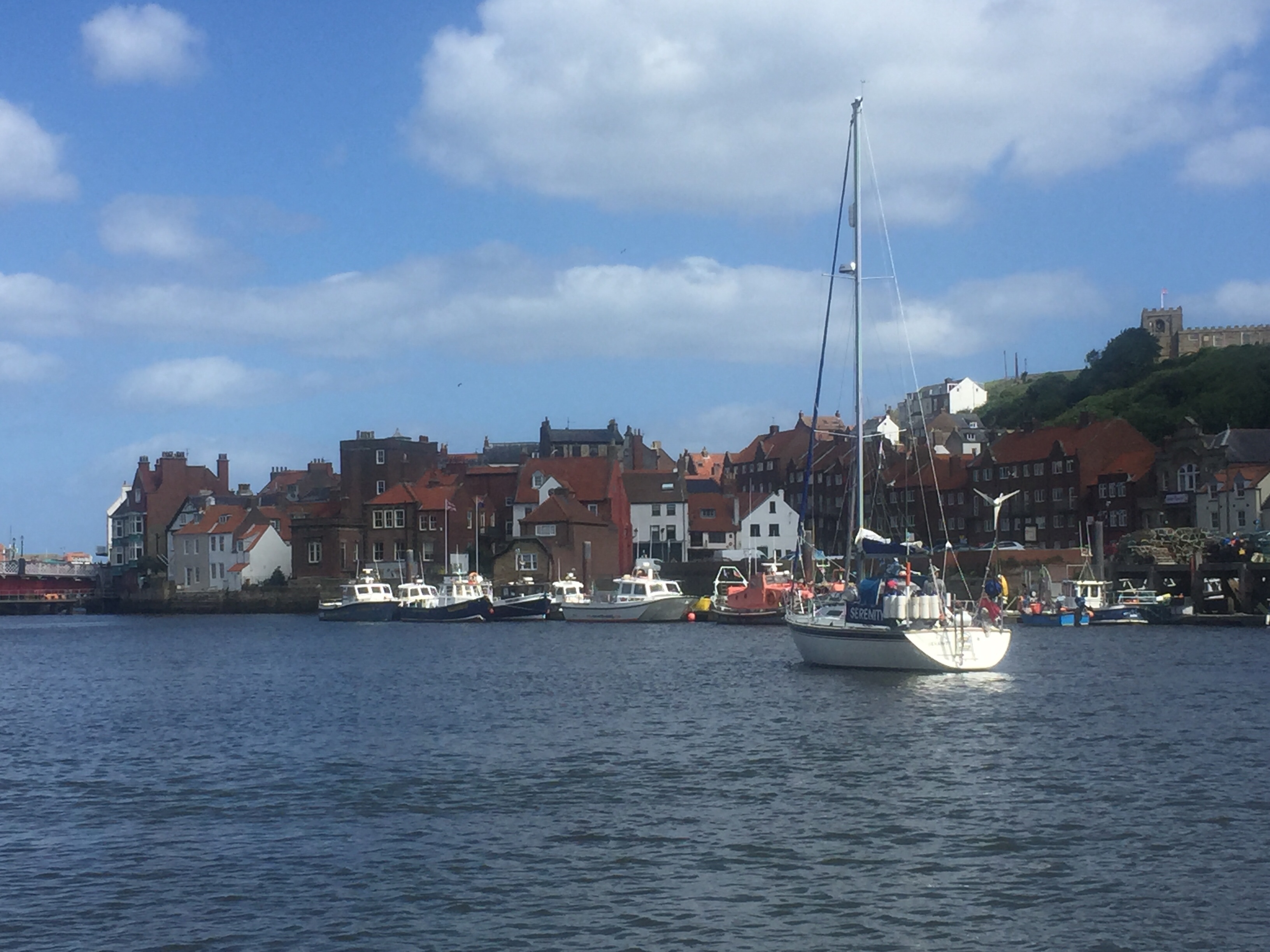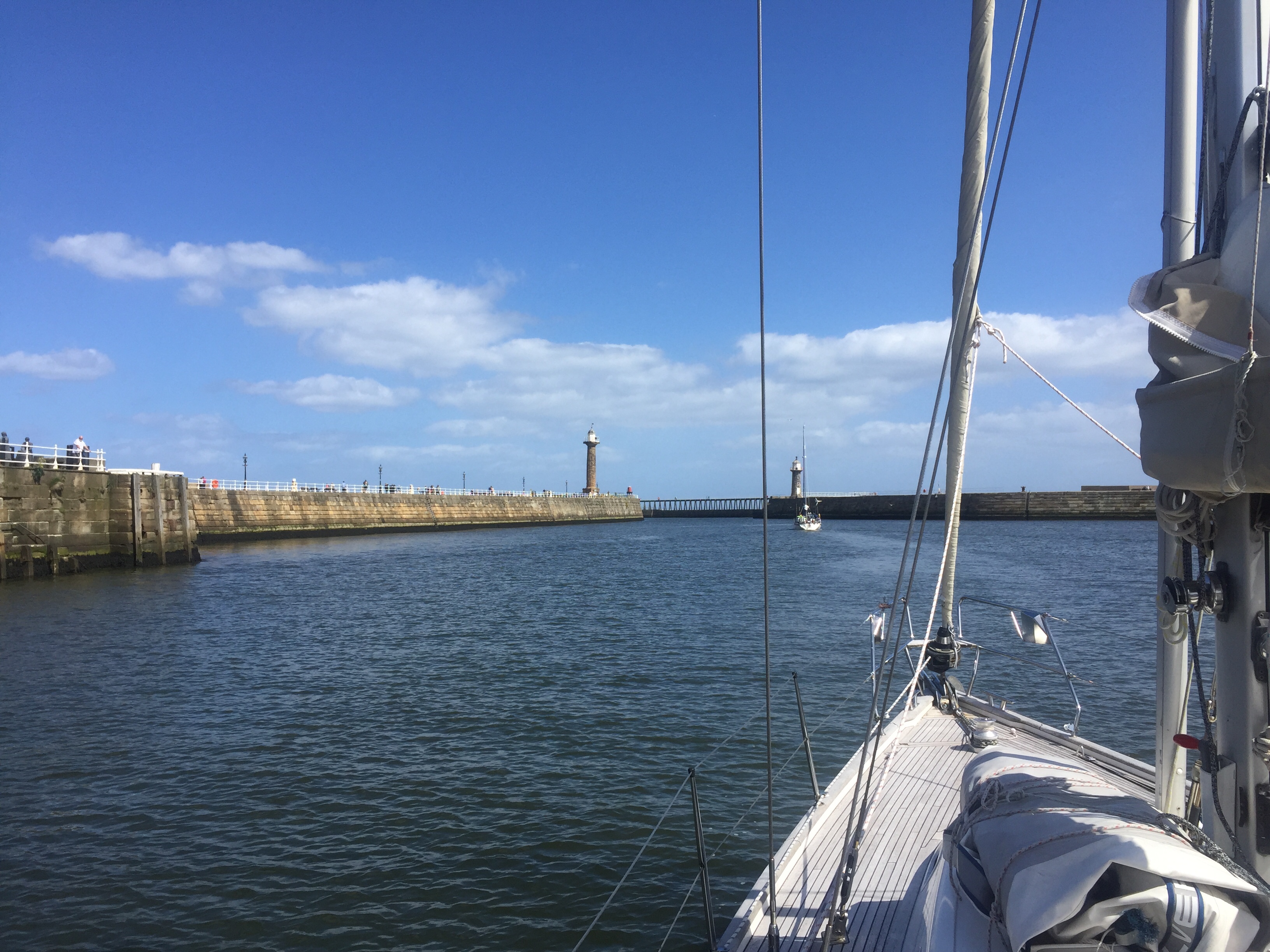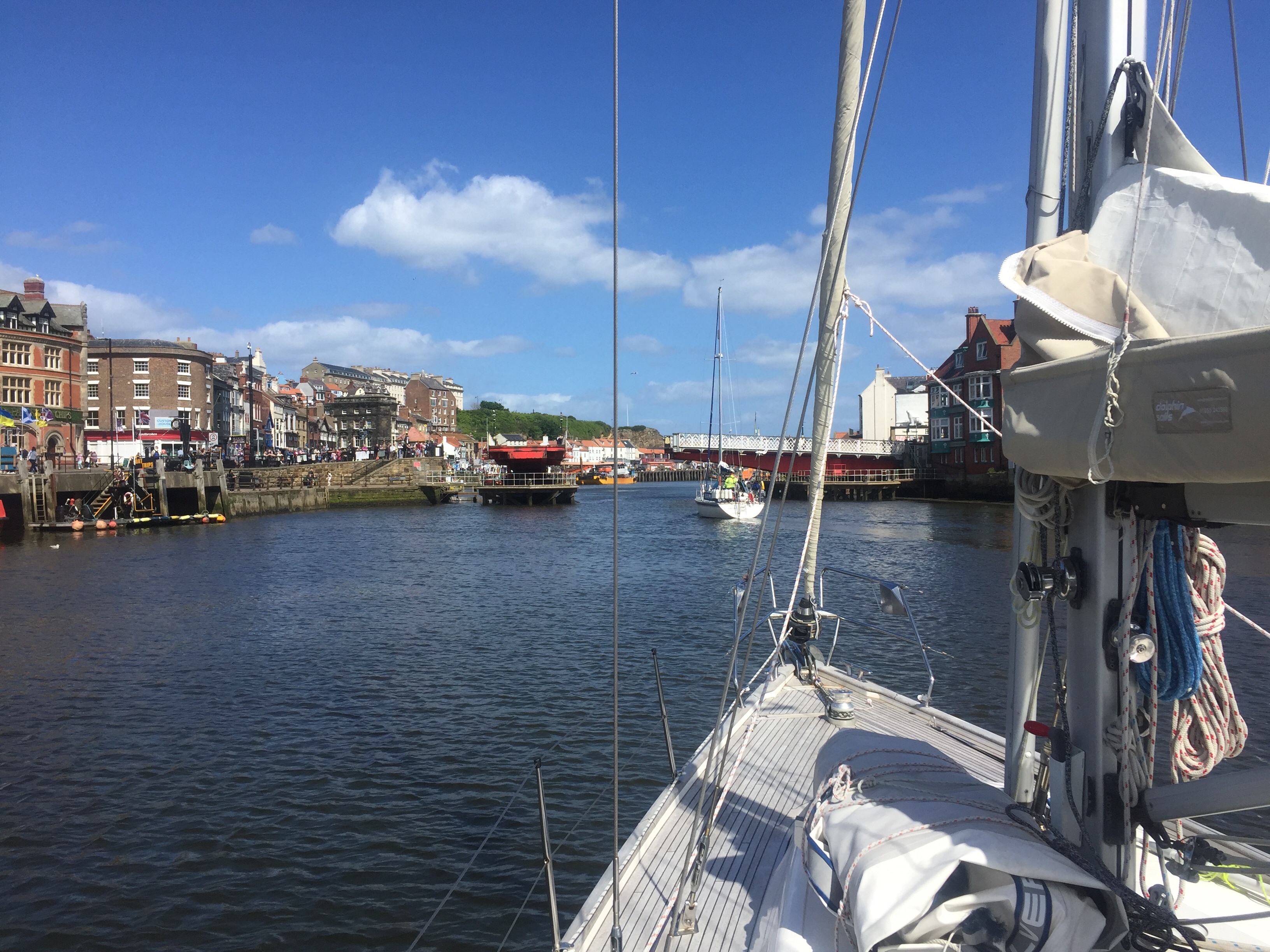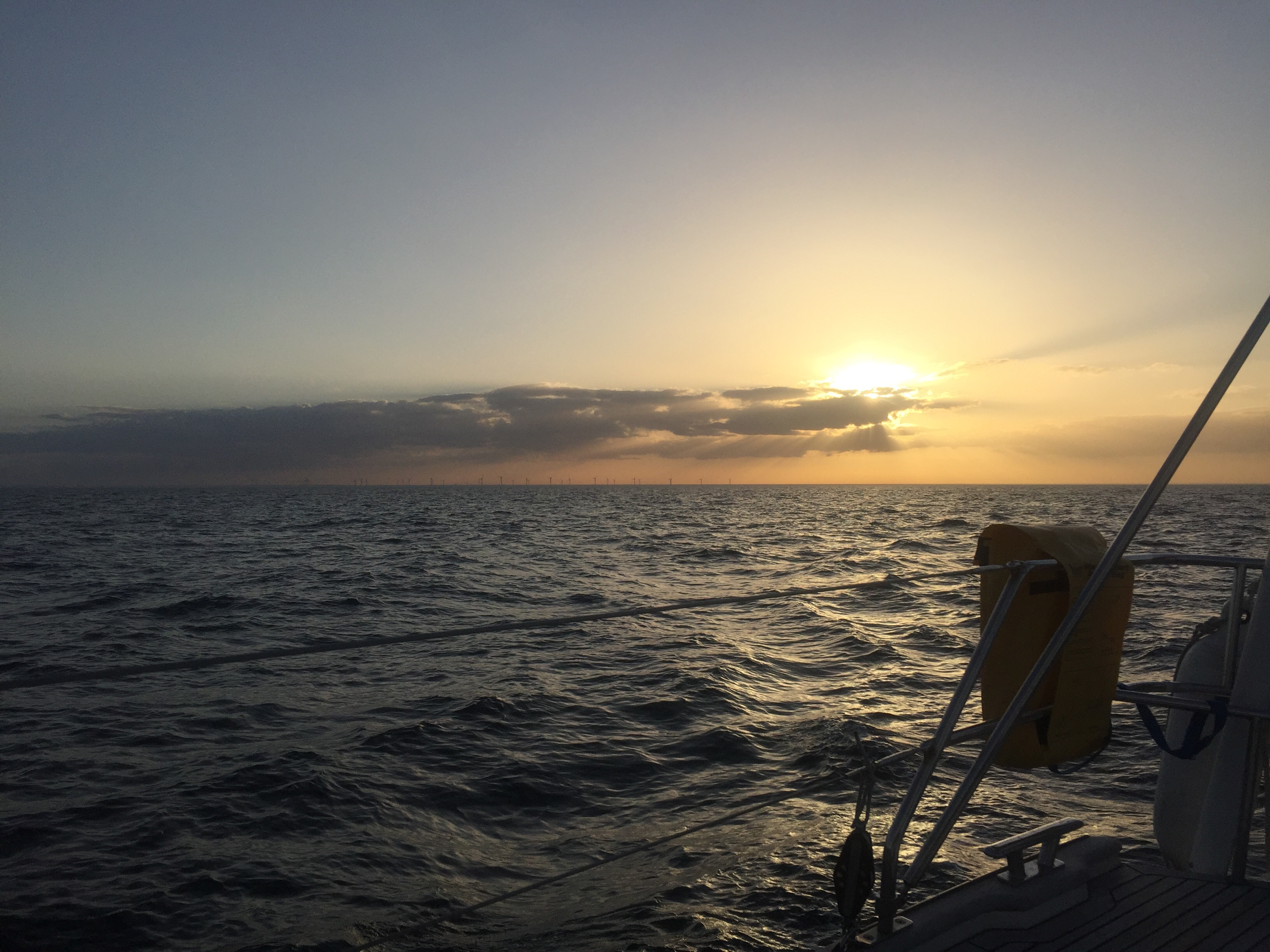 A long way! This is the longest bit of the trip. We had abandoned the idea of going to Grimsby due to various tidal constraints and timings. Proved to be the right decision. Friday morning dawned sunny. With a breeze blowing from the SW. perfect! And it did for once turn out to be a brilliant sailing wind in the right direction for the entire 24 hour voyage. Not many times that’s happened!We left Whitby at 1105 when the swing bridge opened. We were sad to leave this lovely town. Pottering towards the entrance it was so easy to imagine how it would have been in the 1700s with all the harbour lined with boats and taverns alive alive o. Leaving the harbour behind us the sea looked very different to when we arrived! We turned right, along with our friends from Serenity ( the westerly storm). I did take lots of pictures of you! We’ll email them! We set up a watch system., Having this discipline is good as it makes the time go quickly and does allow for some rest. So …..the on watch person is basically on the helm ( or in charge of the auto helm), second person is in charge of keeping them company, looking out for lobster pots and generally being helpful! Third person can rest. Julian did of course have one eye open all the time! As I said the wind was kind. Blowing from the SW meant the water was flattish. The strength varied between 10-17 knots the whole way, which meant we went the first 140 miles on one tack. To begin with we had one reef in, but took it out when the evening approached as the wind dropped slightly. Lowestoft has no tidal constraints so we could go as fast as possible……. and we were averaging 6.6 , top notch 10 knots… it felt like we were going like a train! We waved bye to Serenity as they dived off towards Scarborough. We were alone on our way to the south. Soon we were leaving land behind and heading out to sea, crossing the entrance to the Humber and then the Wash. we ate the pasta bolognese which I’d prepared earlier and Julian heated up. The sun set over one of the many wind farms we passed. the moon shone brightly on our starboard side. We all noted how strange it was that lobster pots completely disappear at night. 🤔 . wind farms are lit up by white light at the base and a red light at the top of each turbine . So there are great fields of lights. Then there’s shipping lights and navigation marks. Some are moving and some stationary. Having the chart plotter you can match up the lights you see with what’s on the chart. It even has the boats on so that really helps with interpretation of what you’re seeing! Usually! One rather interesting moment was a green light in the distance in front of us which was getting bigger quite quickly. Not on the plotter until it appeared apparently right in front of us, it was another sailing boat which we passed quite close to in the end, but maybe the dark made us just feel it was! Time passed and so approached the mile stone moment of our 1000th mile!!! We celebrated by having an orange club biscuit ! Julian and I were on watch as the sky lightened into a beautiful dawn. The colours a mixture of yellow oranges and blues in what appeared to be a cloudless sky. We saw the first blip of a huge orange sun peep above the horizon. Magical. That was about 4 am. Another 40 miles to go. Eventually we rejoined the coast. We had left England in Yorkshire and rejoined in Norfolk! This coast becomes very shallow and the last 2 hours are tricky navigating as you have to keep going from buoy to buoy down the deeper channel. This was the first time since leaving that we had to tack! Eventually we arrived outside the harbour and took down the sails. It had been an amazing nights sail. One which we will all remember. We had been truly blessed with wind strength, direction and tides. The whole trip took exactly 24 hours. We tied up in the marina of the Royal Norfolk and Suffolk yacht club. We then all went to 😴 sleep for about 5 hours. Tired but exhilarated and relieved to be here. Later in the evening Sue joined us eventually having had the usual train nightmare journey, and we re-celebrated🥂!
