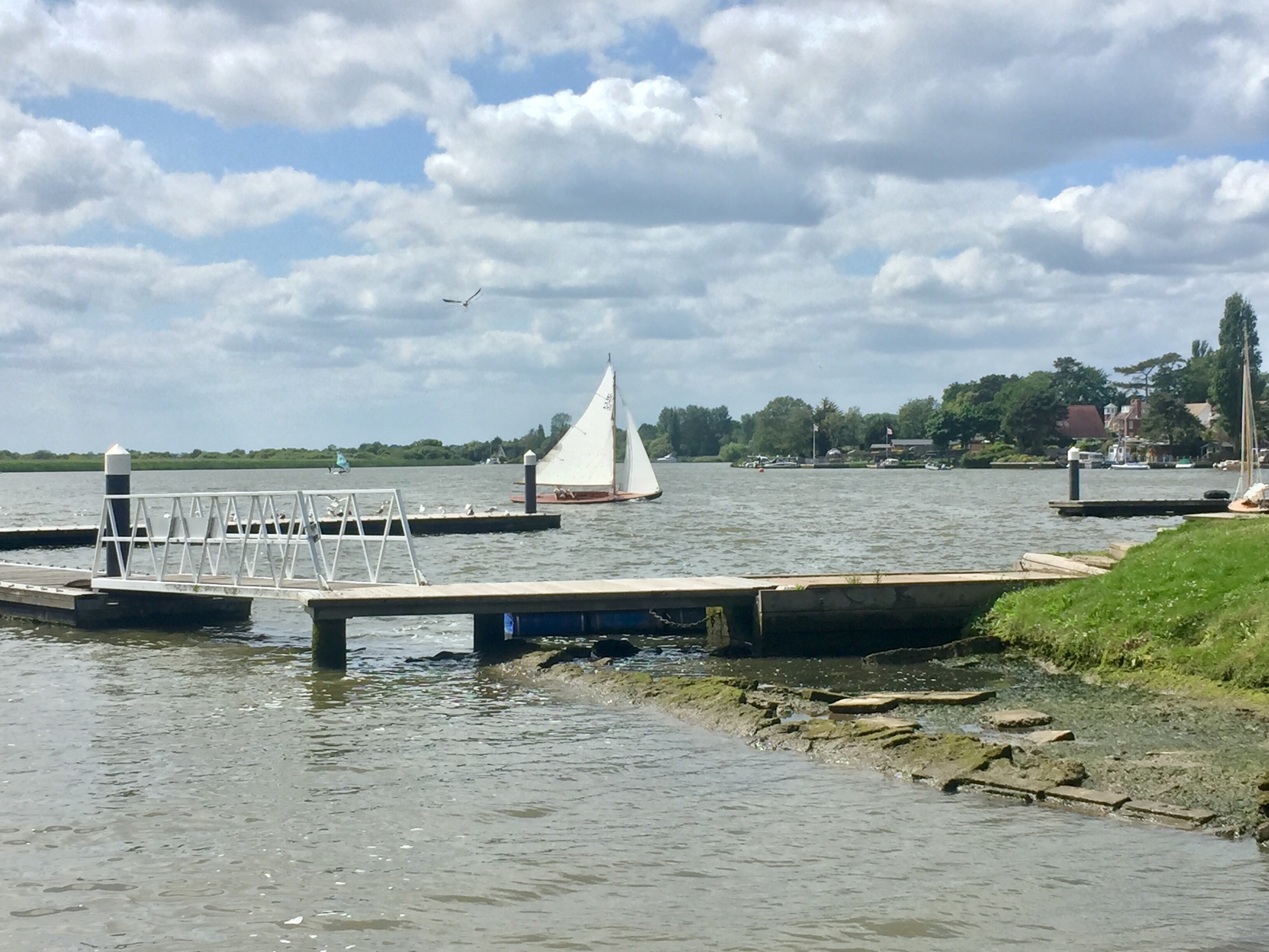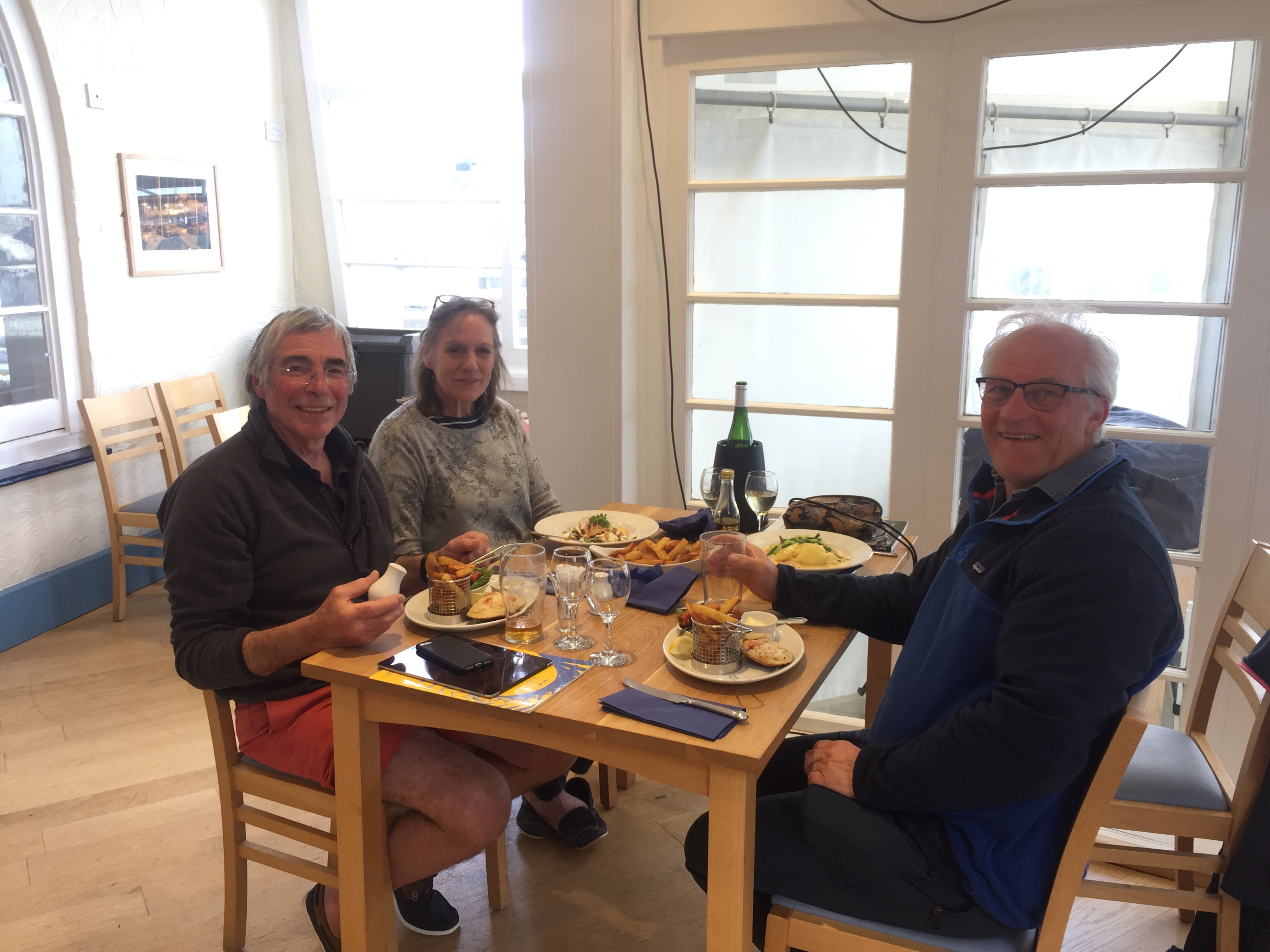 Today was a rest day. We had a late brunch…. bacon and egg and all the trimmings courtesy of Julian. I went in search of a Sunday paper and had to go further than I thought. Around the harbour seems a little disheveled. Eventually I asked a lady who was busy pressure washing tables outside weatherspoons, where I might find a Sunday paper. She directed me to a little shop who thankfully had one Sunday times left. Brunch done we set of on a walk to Oulton Broad….. a village which is the “gateway “to the Norfolk broads. the walk was along a busy road and then through a housing estate until we eventually got to the pretty area called Oulton Broad. We had a drink at a bar/ cafe in a lovely park area on the side of the broad ( lake) . It was nice to see lots of people and families enjoying themselves in the sunshine. We then walked around the lakeside marvelling at the person on the hydrofoil windsurfer…. something I’d not seen before. We walked on round enjoying watching the typical broads type boats, but also saddened at all the many derelict boats just seemingly rotting away in their moorings. This appears to be a country wide problem and a huge environmental issue. We then made our way to Oulton south railway station and paid £1.70 each to get a train back to Lowestoft. On our return to the marina, we booked a table at the yacht club for dinner which sounds grand but was very informal and delicious food! An early night followed as we had to catch the tide at 0430 tomorrow.