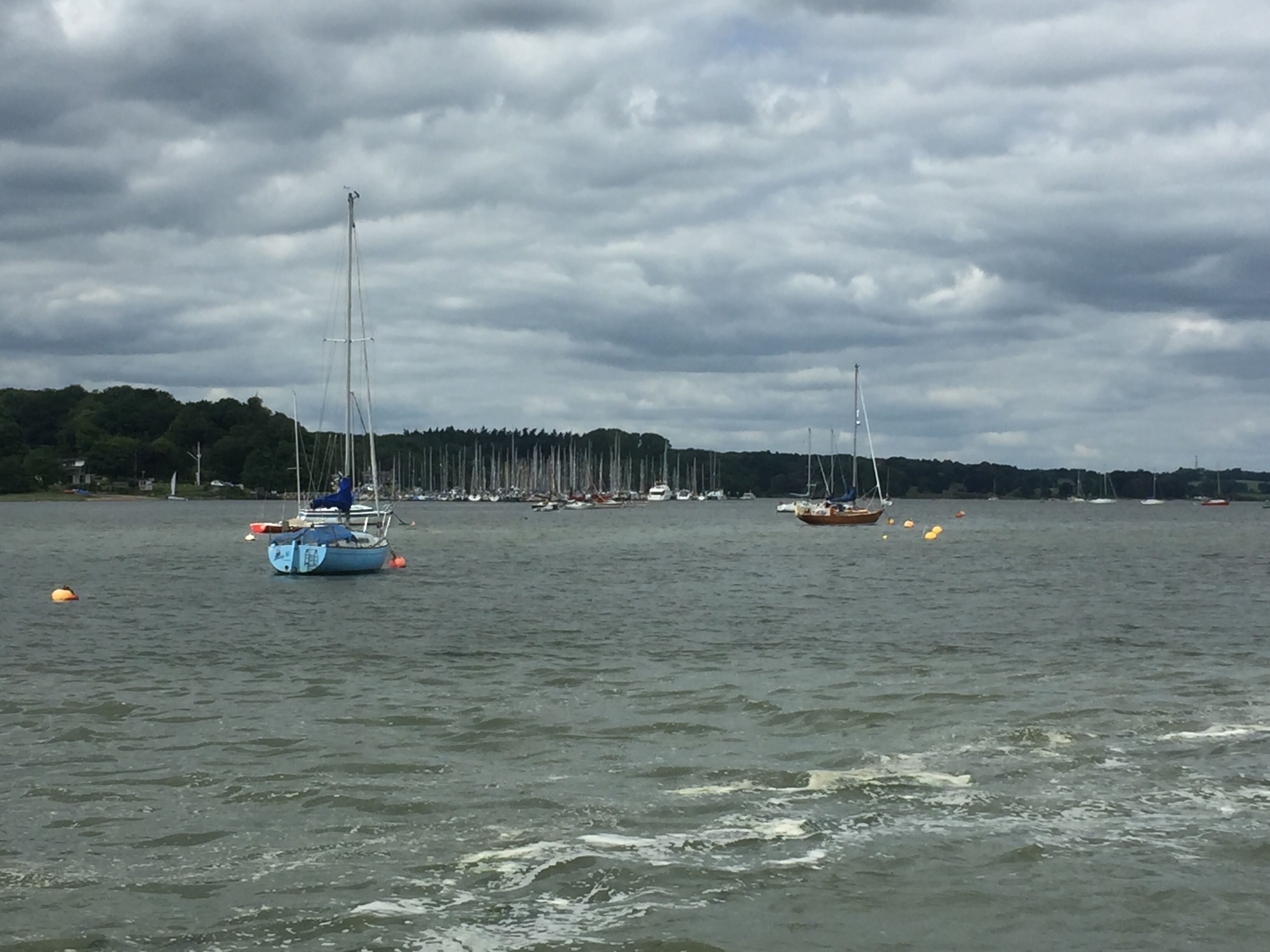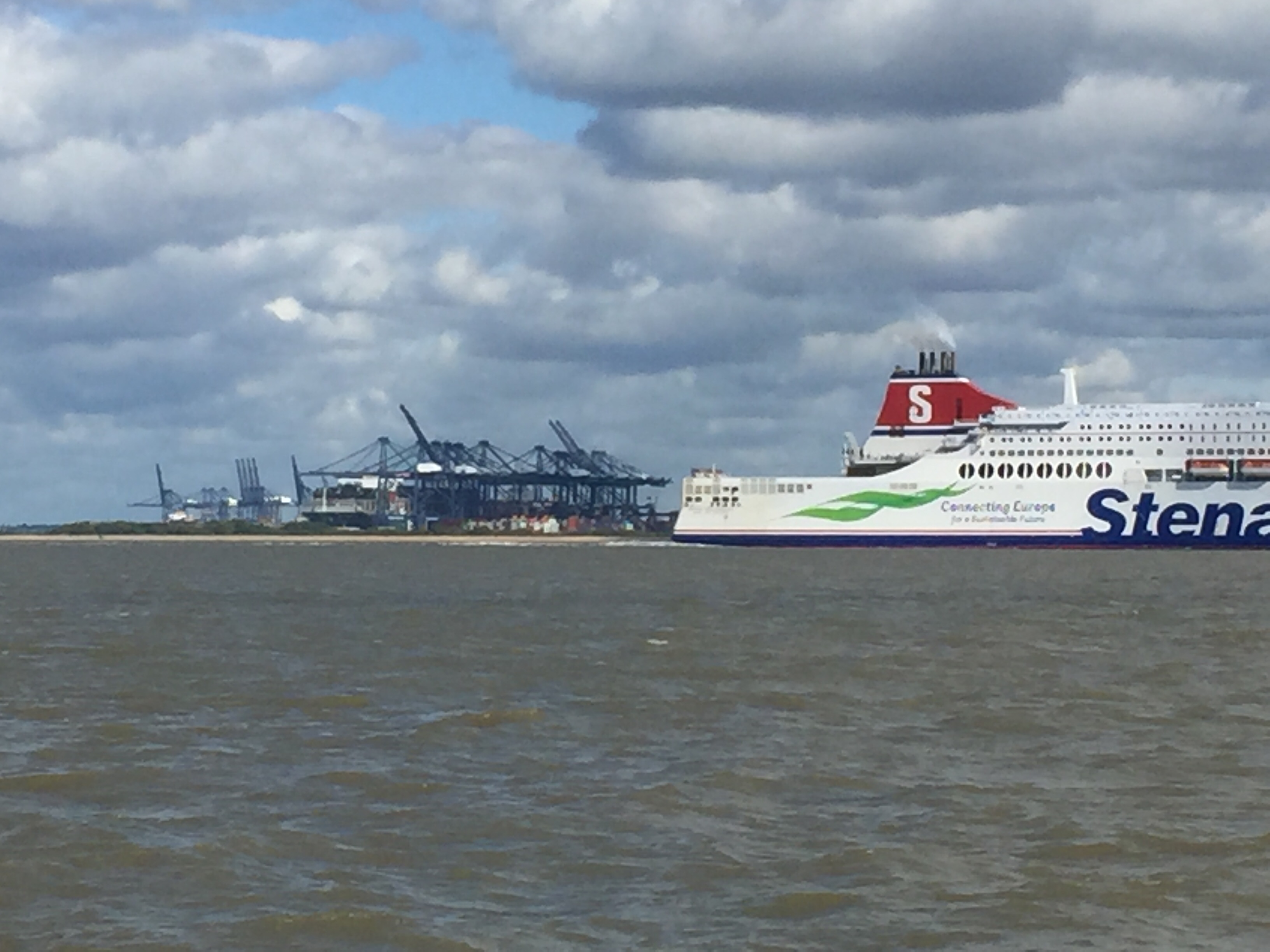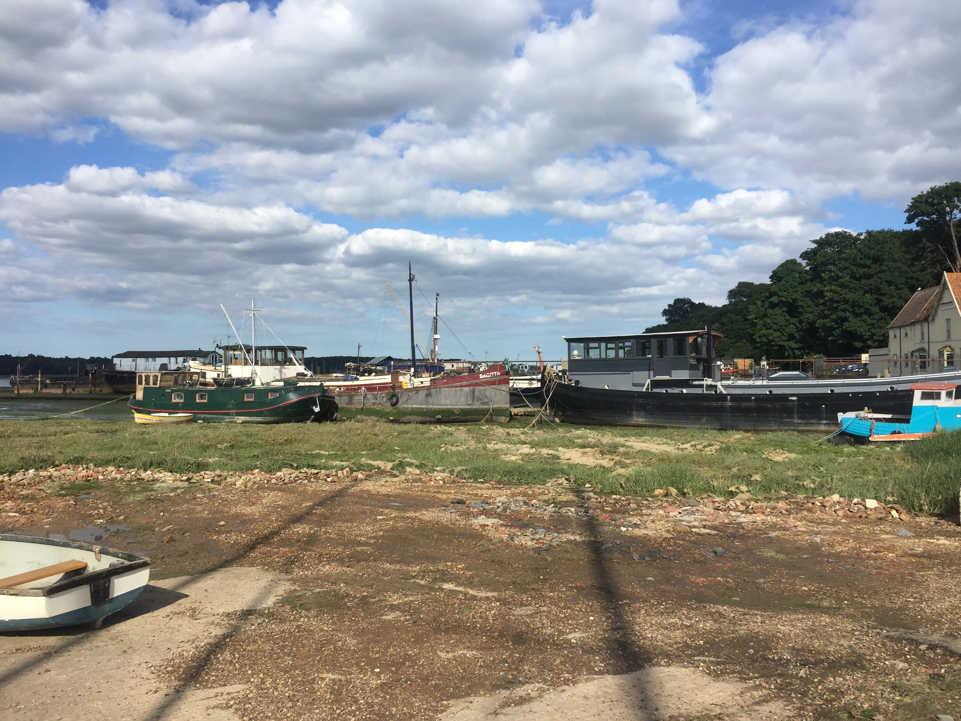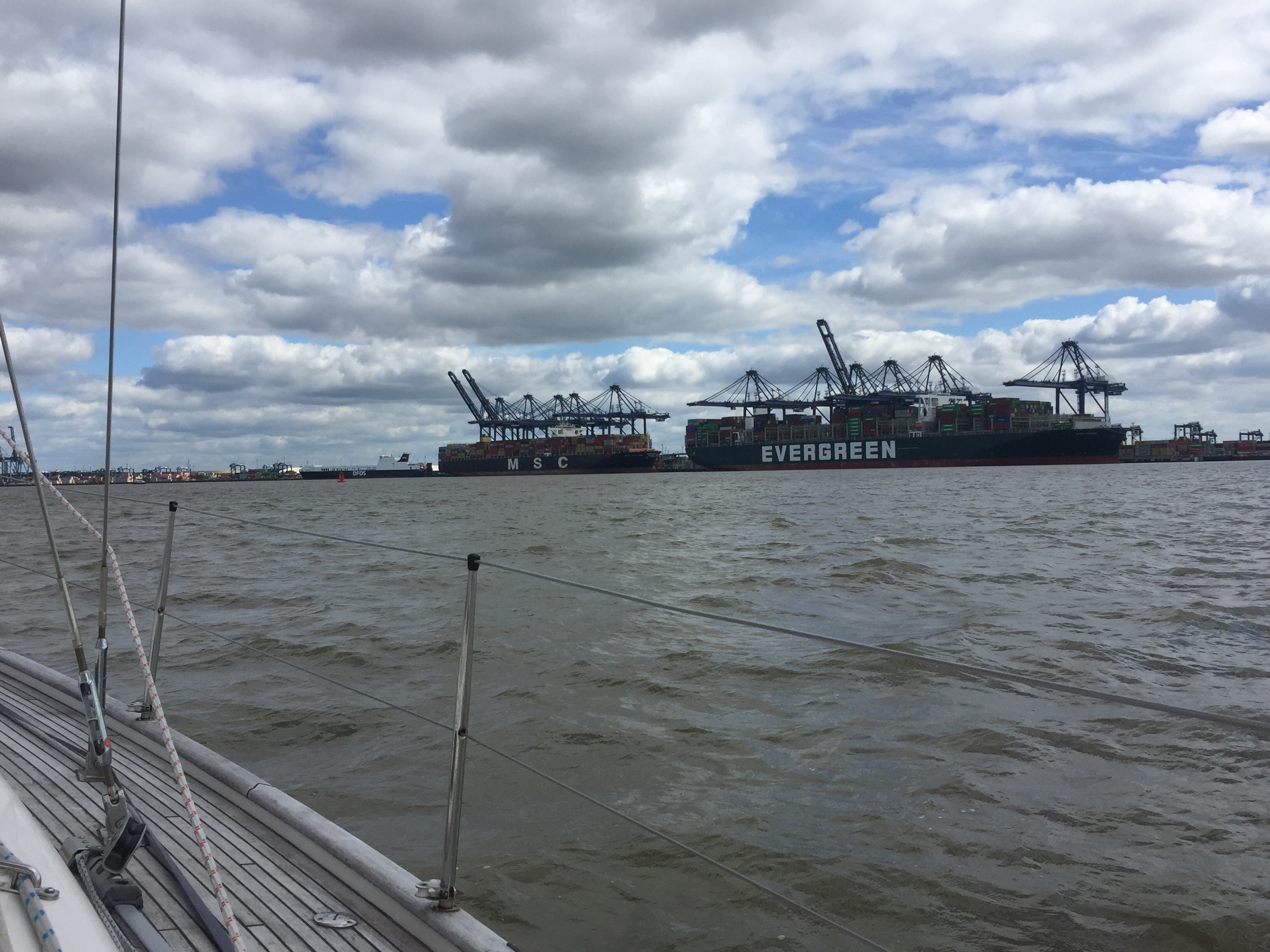 Another 0330 wake up☹️. But the sky is light and looks as if it’s going to be a sunny day! It was , in fact cloudless. We radioed the port to ask for permission to leave ( getting more familiar with this) and off we went. The water was flat because the wind has west in it and therefore an offshore wind. And brown! So despite the blue skies the water has gone from grey to brown! Cos it’s so shallow and churns up the sand and mud below I’m presuming. So just to compare…. in the N of Scotland we usually sail in depths of 100 odd metres. Here it’s 10 -20! Had full sails up and what bliss there didn’t seem to be any lobster pots! We flew down the coast doing 8-10 knots. The wind was on our beam ( side) and blowing a nice 10-15 knots. We passed Sizewell nuclear place… very identifiable with its huge white dome and then continued on towards Harwich with its massive cranes. The approach is interesting with lots of shallow bits and loads of navigation marks everywhere to identify. Thank goodness for the plotter.. again! There is a “recommended route” got yachts shown which is helpful so we just followed that after taking our sails down just before the entrance. Once into the entrance we marvelled at the enormous container ships in the dock. You can just imagine all the stuff inside and where it’s all going. Each one on a lorry. Hardly seems to support the name! See picture! The tide is still running quite strongly but we are now into a pretty river. The Orwell. Wide and flanked with fields and woodland. Many boats bobbing about on moorings and a few sailing up and down. We hadn’t been able to get into Shotley marina ( our original intention) as it was full, so made our way up river to Woolverstone where we had arranged to meet our lovely friends John and Christine. A slightly less than perfect landing wounded our pride a bit, a tight corner, tide and wind blowing us off. ☹️What a lovely marina though! So peaceful and pretty and so different from anywhere we’ve been. They arrived early afternoon and we ate cake , watched the swallows swooping to and fro and chatted in the sunshine. After which , we visited Johns beautiful boat Salamander on the same marina and then went for a delightful walk along the shore to the pretty village of Pin Mill. A typically quaint Suffolk village with painted cottages and roses round the doors. We had a beer at the pub and took a walk past the community of boat houses ( many built on top of the old working barges) along the way, through a leafy green wood. What an interesting country we live in, so different, so diverse. John and Christine left us after a lovely afternoon -and we slumped in front of the tv with a simple supper. Lie in tomorrow 😊.