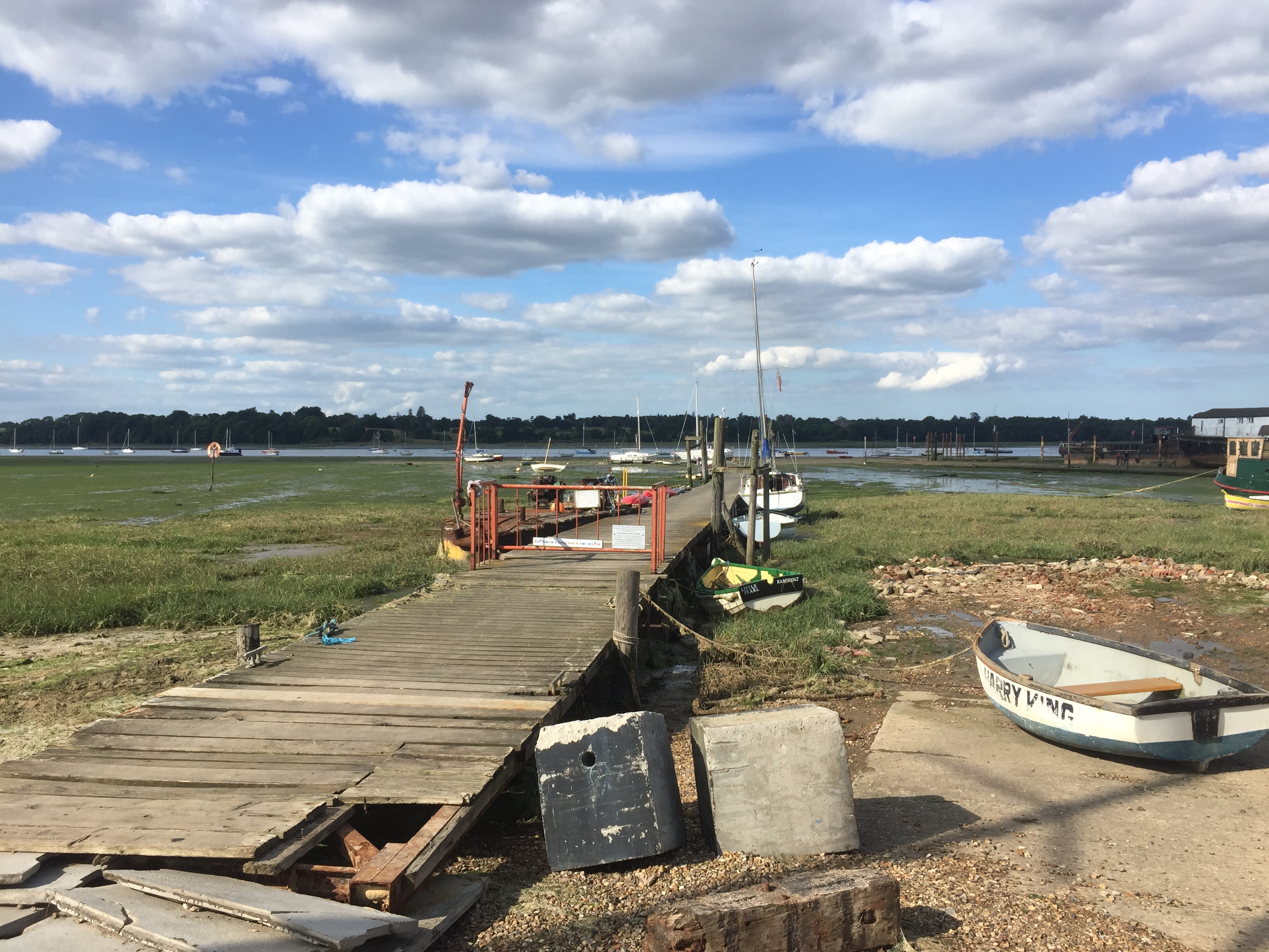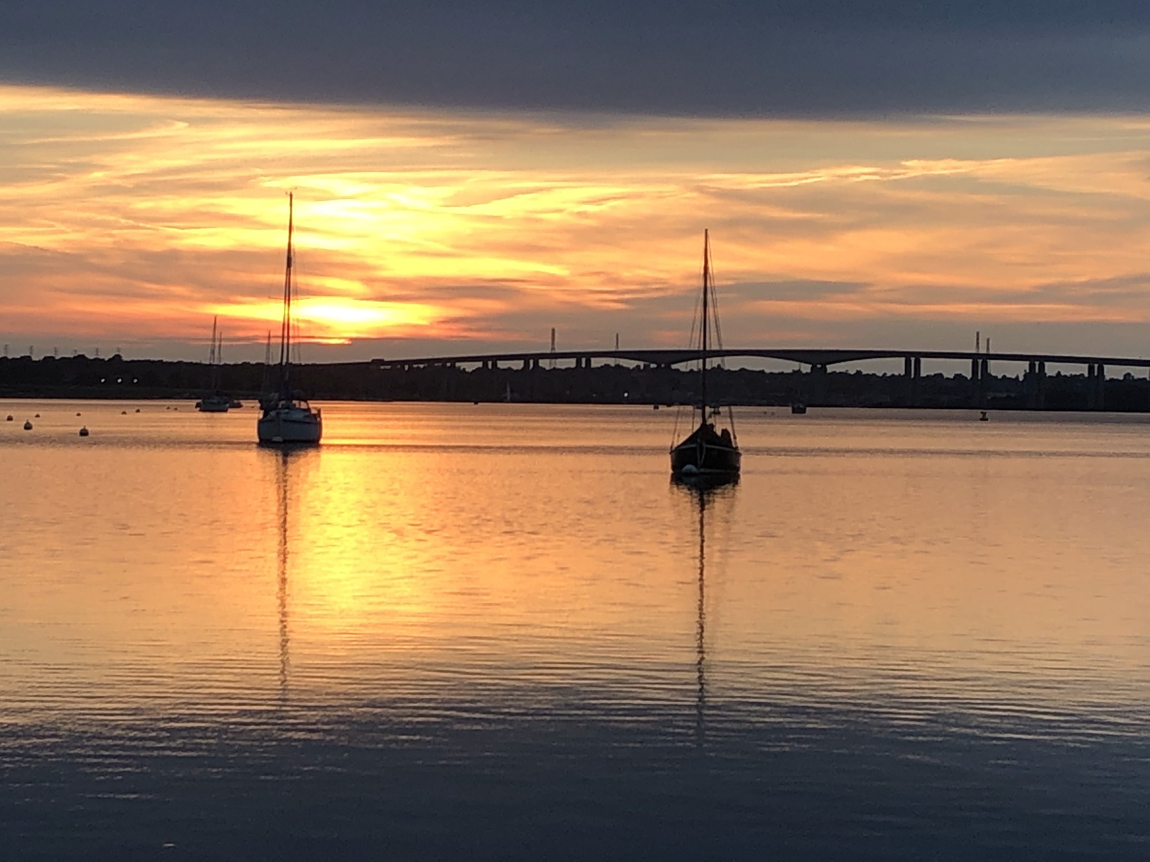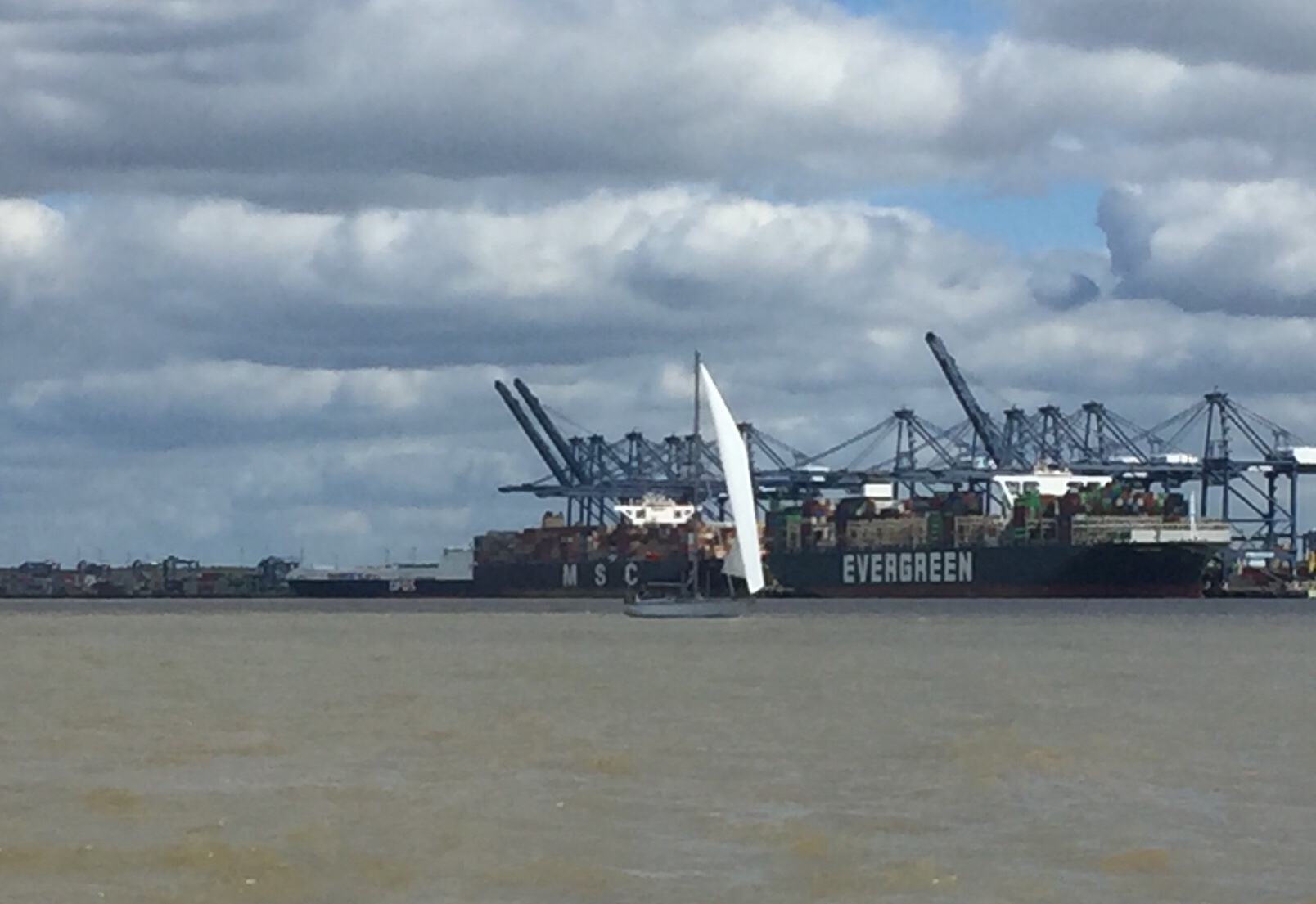 Another 0330 wake up☹️. But the sky is light and looks as if it’s going to be a sunny day! It was , in fact cloudless. We radioed the port to ask for permission to leave ( getting more familiar with this) and off we went. The water was flat because the wind has west in it and therefore an offshore wind. And brown! So despite the blue skies the water has gone from grey to brown! Cos it’s so shallow and churns up the sand and mud below I’m presuming. So just to compare…. in the N of Scotland we usually sail in depths of 100 odd metres. Here it’s 10 -20! Had full sails up and what bliss there didn’t seem to be any lobster pots! We flew down the coast doing 8-10 knots. The wind was on our beam ( side) and blowing a nice 10-15 knots. We passed Sizewell nuclear place… very identifiable with its huge white dome and then continued on towards Harwich with its massive cranes. The approach is interesting with lots of shallow bits and loads of navigation marks everywhere to identify. Thank goodness for the plotter.. again! There is a “recommended route” got yachts shown which is helpful so we just followed that after taking our sails down just before the entrance. Once into the entrance we marvelled at the enormous container ships in the dock. You can just imagine all the stuff inside and where it’s all going. Each one on a lorry. Hardly seems to support the name! See picture! The tide is still running quite strongly but we are now into a pretty river. The Orwell. Wide and flanked with fields and woodland. Many boats bobbing about on moorings and a few sailing up and down. We hadn’t been able to get into Shotley marina ( our original intention) as it was full, so made our way up river to Woolverstone where we had arranged to meet our lovely friends John and Christine. A slightly less than perfect landing wounded our pride a bit, a tight corner, tide and wind blowing us off. ☹️What a lovely marina though! So peaceful and pretty and so different from anywhere we’ve been. They arrived early afternoon and we ate cake , watched the swallows swooping to and fro and chatted in the sunshine. After which , we visited Johns beautiful boat Salamander on the same marina and then went for a delightful walk along the shore to the pretty village of Pin Mill. A typically quaint Suffolk village with painted cottages and roses round the doors. We had a beer at the pub and took a walk past the community of boat houses ( many built on top of the old working barges) along the way, through a leafy green wood. What an interesting country we live in, so different, so diverse. John and Christine left us after a lovely afternoon -and we slumped in front of the tv with a simple supper. Lie in tomorrow 😊.