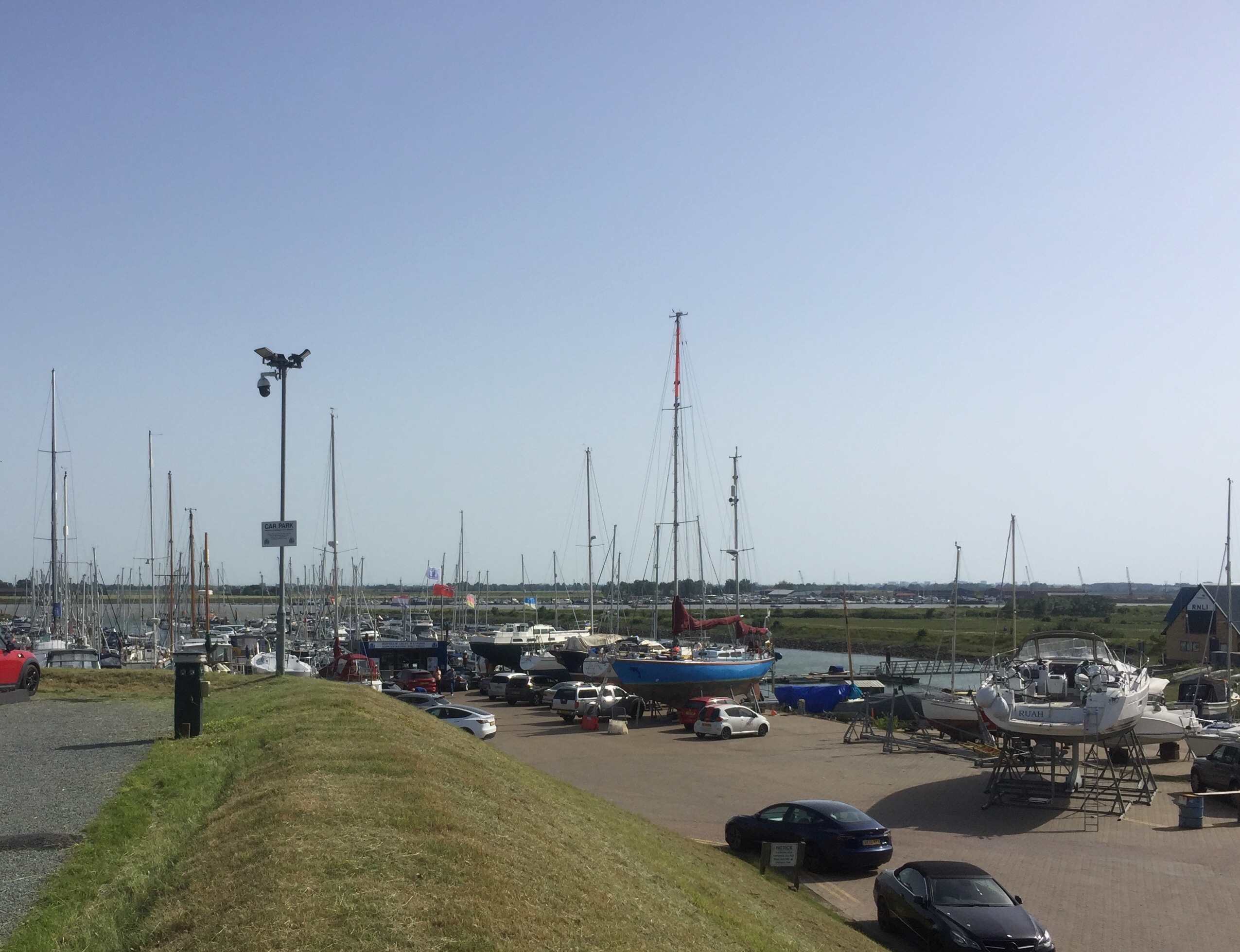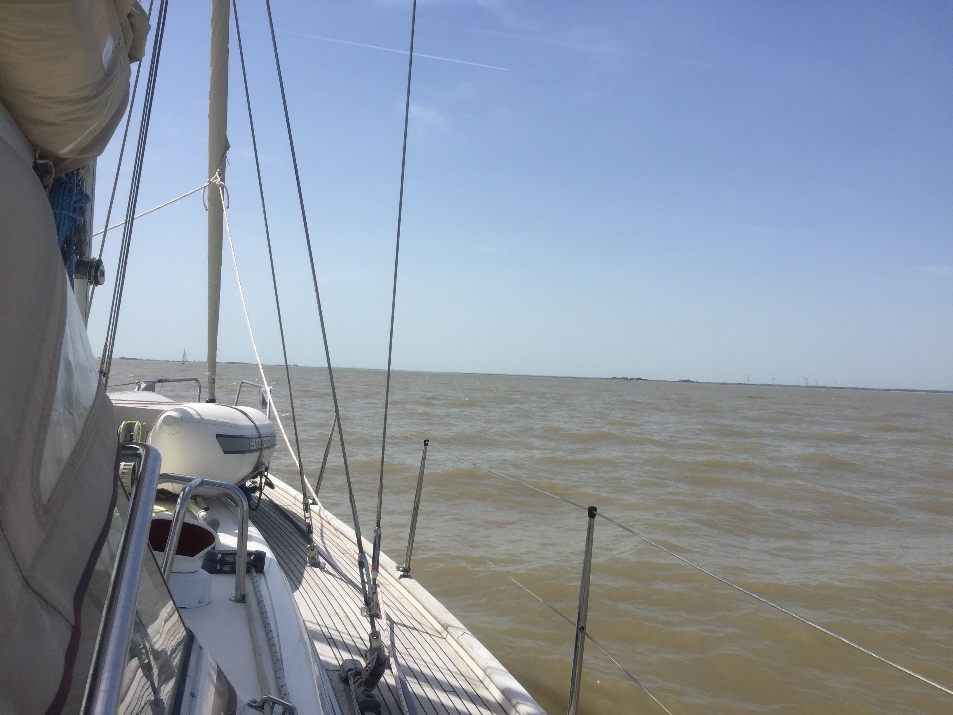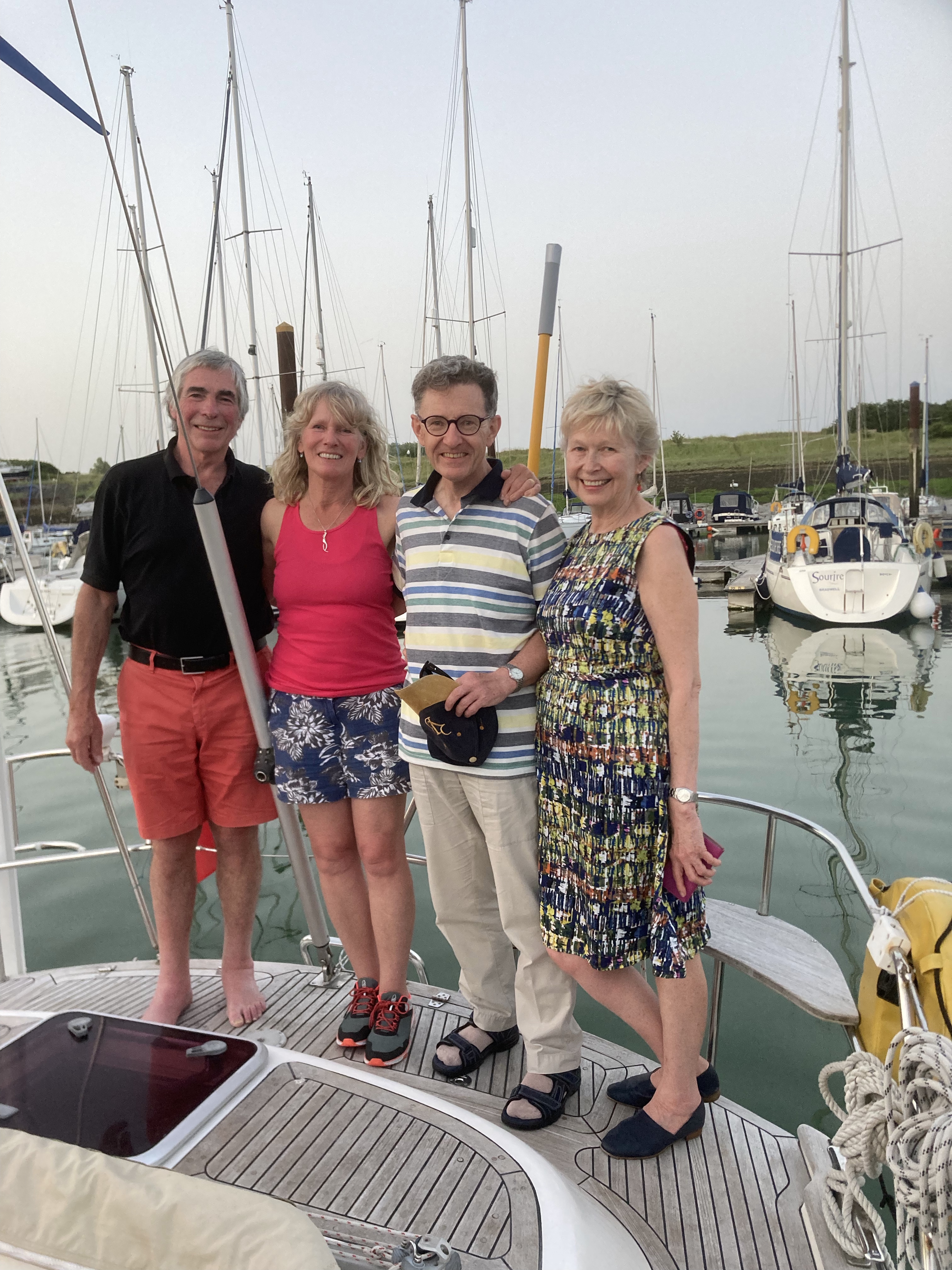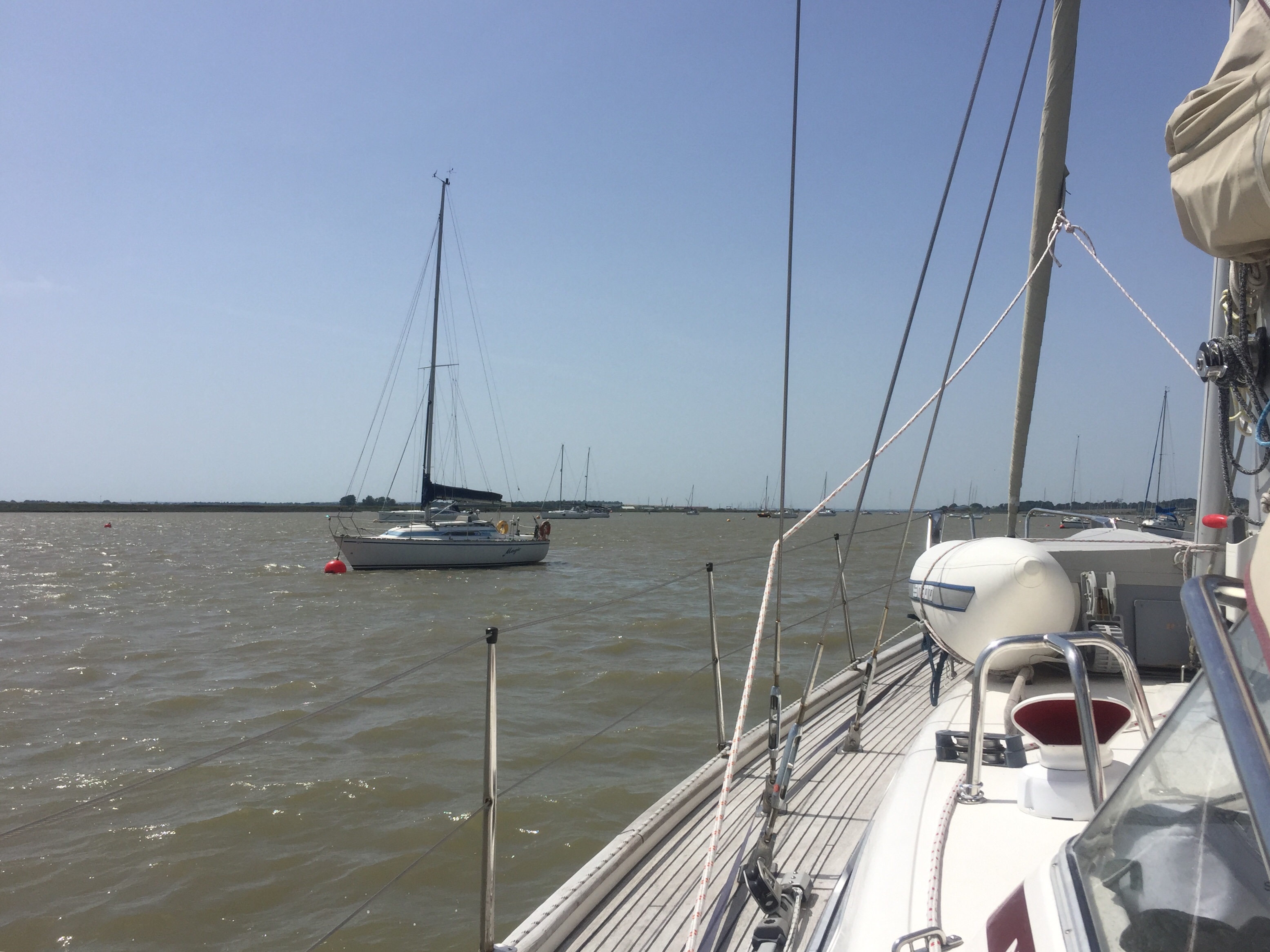 We awoke at 0530 and as the tide had already dropped to 4 m, we decided to go whilst we still could. So we went about 500 m and re anchored in slightly deeper water. We had to wait a while there , otherwise the tide wouldn’t have been in the right direction for later. If anyone has ever had any need or desire to look at the terrain of the Thames estuary, it is an area of constantly moving sandbanks with muddy channels between them. That is presumably why there are so many wind farms too….. easier to build them on sandbanks! They don’t all dry out but the depth of water over them is only enough to sail over with a keel boat, at certain times of the tide. The area is studded with navigation marks basically telling you to ; leave me on your left (Red/ port) leave me on your right (green/ starboard) , go north south east or west of me ( black and yellow cardinals) amongst others. We had a list of 27 to go past so we literally ticked them off as we went along. Most of them have odd individual names such as “The knoll” or “Inner Whitaker” , which presumably have historic meanings. The depth of water never getting much above 10 m . We sailed some of the time, the wind was light and it was probably the hottest day of the year for everyone in the country. Despite the strange colour sea and having to concentrate to navigate, it was a beautiful day to be out on the water. I wore my “old lady” hat to stop my neck getting sunburnt. Eventually we turned up along the Crouch . A wide brown river taking us upstream to Burnham on crouch and presumably eventually ends in Crouch end?? What a surprise! As per usual the wind decided to get up to 20 knots as we approached the marina. We had at least been given a berth number so we could work out that we would most likely be blown away from the pontoon . We set our lines and fenders according and got ready. What we weren’t expecting was such tiny thin wobbly pontoons😳. Within seconds we were lying neatly alongside our neighbour, Sue having leapt magnificently onto the other boat and then round to catch the lines, meanwhile I managed to lasso a cleat at the back of the tiny pontoon and we hauled ourselves in. Once secured we went up to the HM office, paid our dues and had a welcome shower. Very nice facilities here! The day was still hot at 5 pm and we had a lovely evening sitting in the cockpit chatting with My brother David and Louise over smoked salmon and gin and tonics. Followed by boat chilli.It was great to see them both! Thanks for coming! Tim is rejoining the boat first thing tomorrow so we look forward to seeing him.