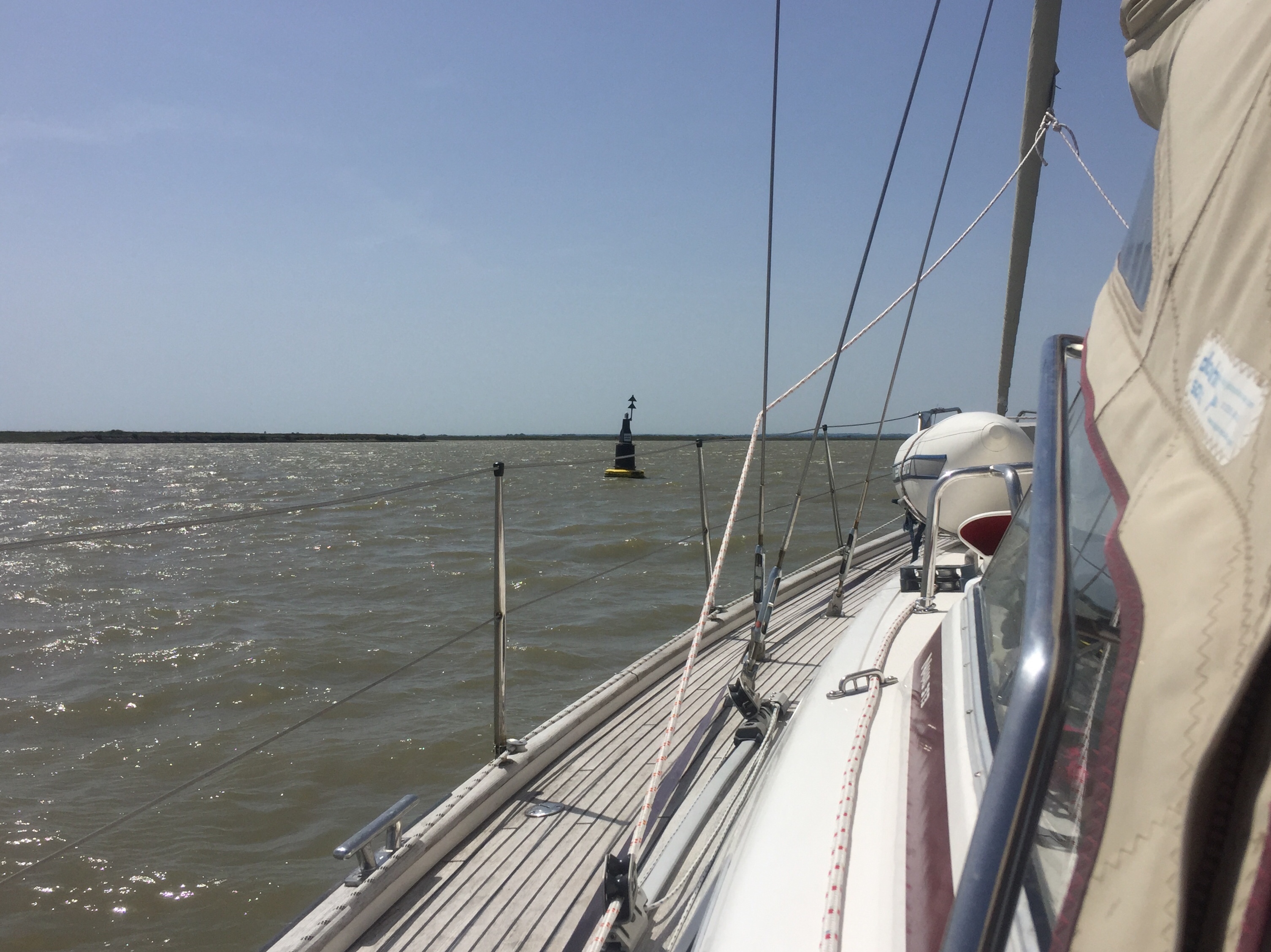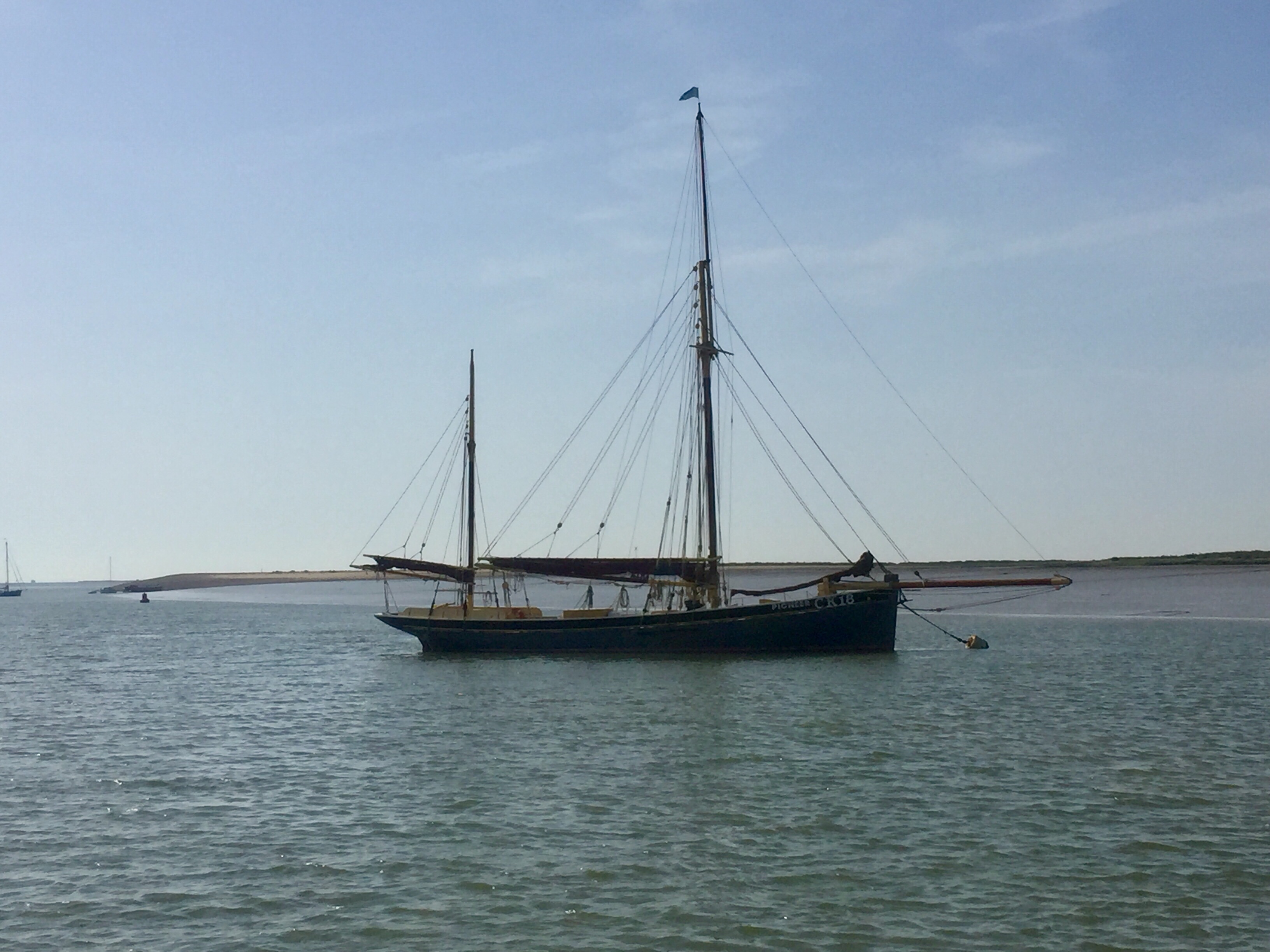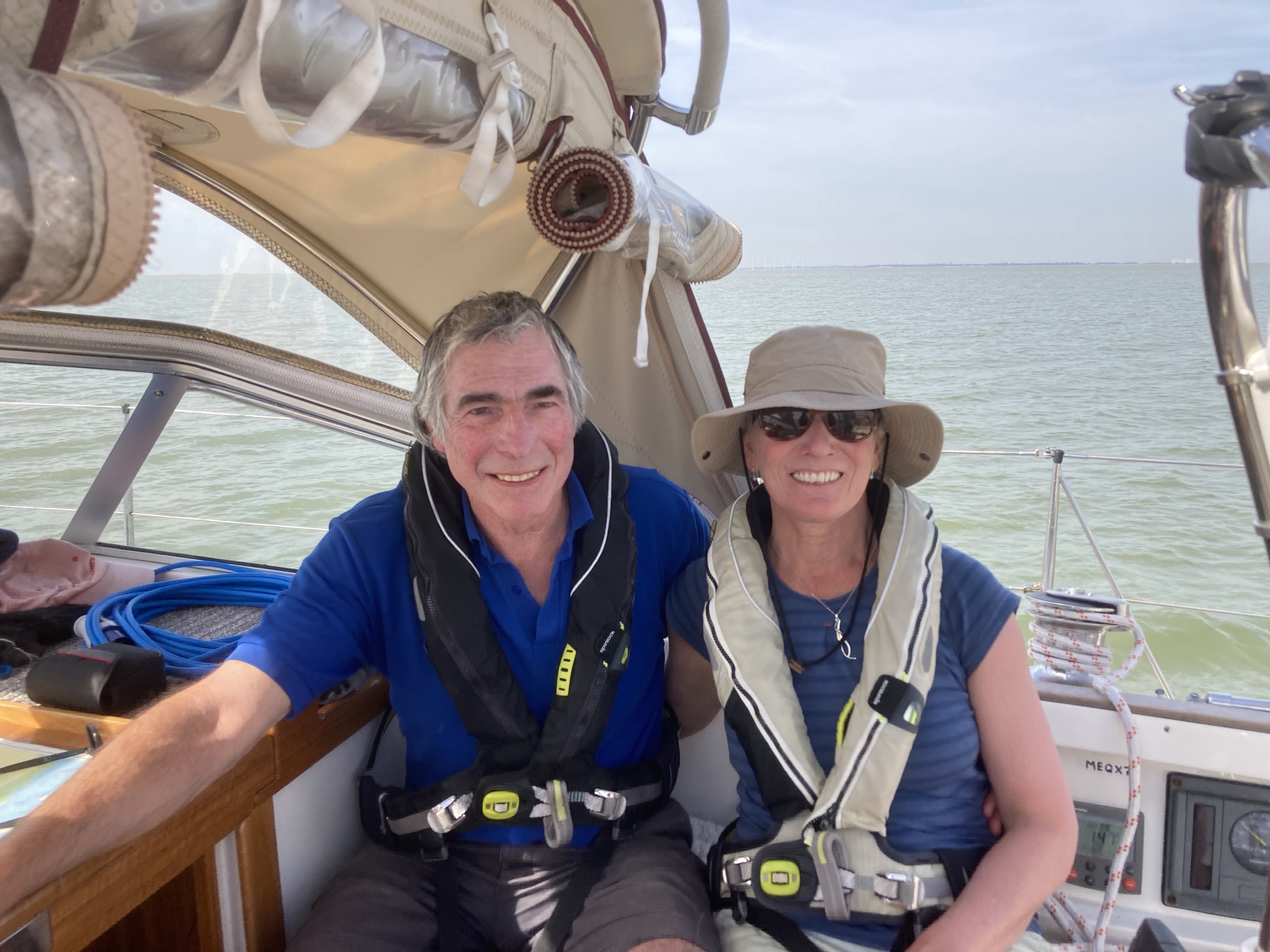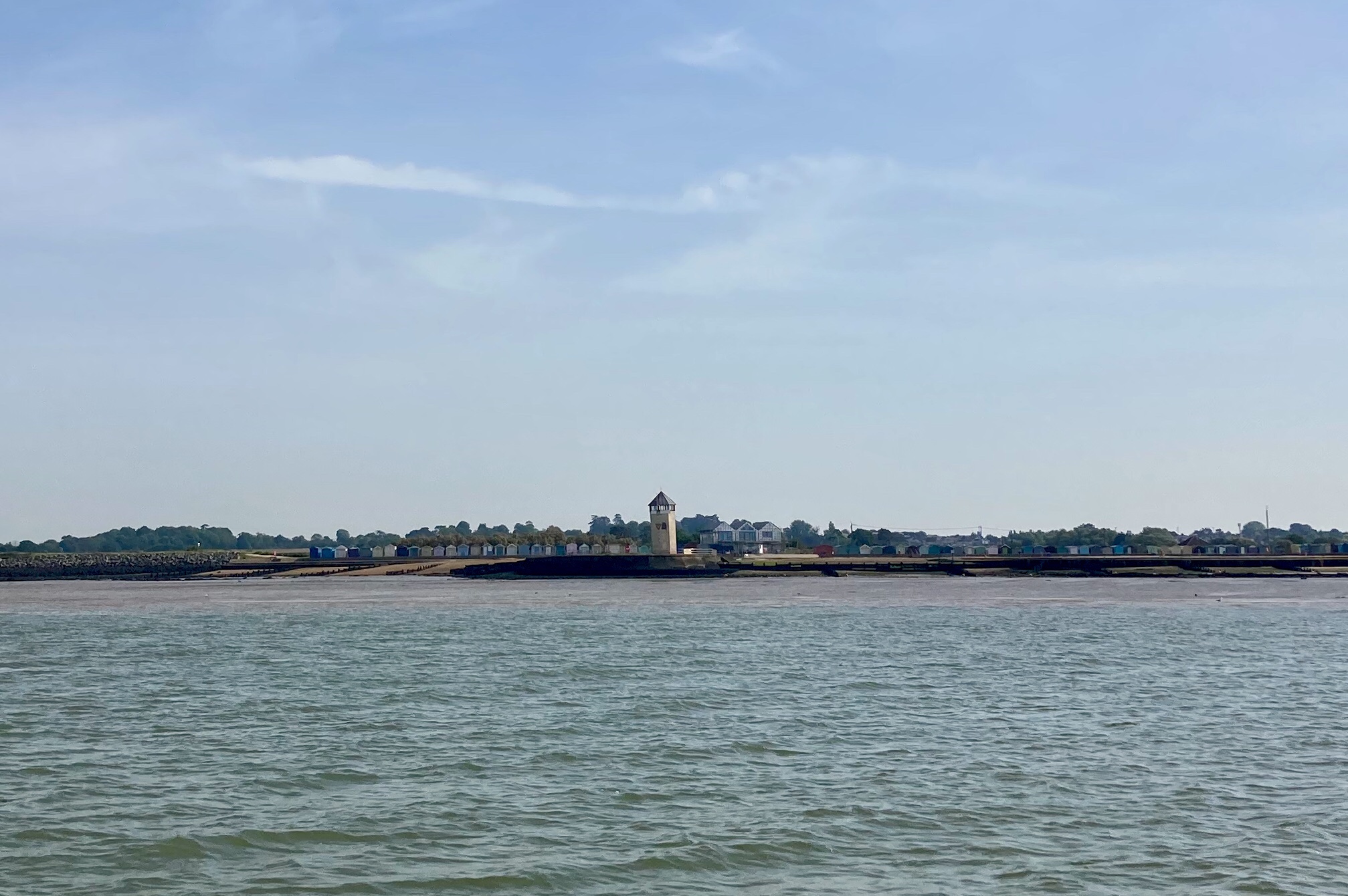 We awoke at 0530 and as the tide had already dropped to 4 m, we decided to go whilst we still could. So we went about 500 m and re anchored in slightly deeper water. We had to wait a while there , otherwise the tide wouldn’t have been in the right direction for later. If anyone has ever had any need or desire to look at the terrain of the Thames estuary, it is an area of constantly moving sandbanks with muddy channels between them. That is presumably why there are so many wind farms too….. easier to build them on sandbanks! They don’t all dry out but the depth of water over them is only enough to sail over with a keel boat, at certain times of the tide. The area is studded with navigation marks basically telling you to ; leave me on your left (Red/ port) leave me on your right (green/ starboard) , go north south east or west of me ( black and yellow cardinals) amongst others. We had a list of 27 to go past so we literally ticked them off as we went along. Most of them have odd individual names such as “The knoll” or “Inner Whitaker” , which presumably have historic meanings. The depth of water never getting much above 10 m . We sailed some of the time, the wind was light and it was probably the hottest day of the year for everyone in the country. Despite the strange colour sea and having to concentrate to navigate, it was a beautiful day to be out on the water. I wore my “old lady” hat to stop my neck getting sunburnt. Eventually we turned up along the Crouch . A wide brown river taking us upstream to Burnham on crouch and presumably eventually ends in Crouch end?? What a surprise! As per usual the wind decided to get up to 20 knots as we approached the marina. We had at least been given a berth number so we could work out that we would most likely be blown away from the pontoon . We set our lines and fenders according and got ready. What we weren’t expecting was such tiny thin wobbly pontoons😳. Within seconds we were lying neatly alongside our neighbour, Sue having leapt magnificently onto the other boat and then round to catch the lines, meanwhile I managed to lasso a cleat at the back of the tiny pontoon and we hauled ourselves in. Once secured we went up to the HM office, paid our dues and had a welcome shower. Very nice facilities here! The day was still hot at 5 pm and we had a lovely evening sitting in the cockpit chatting with My brother David and Louise over smoked salmon and gin and tonics. Followed by boat chilli.It was great to see them both! Thanks for coming! Tim is rejoining the boat first thing tomorrow so we look forward to seeing him.