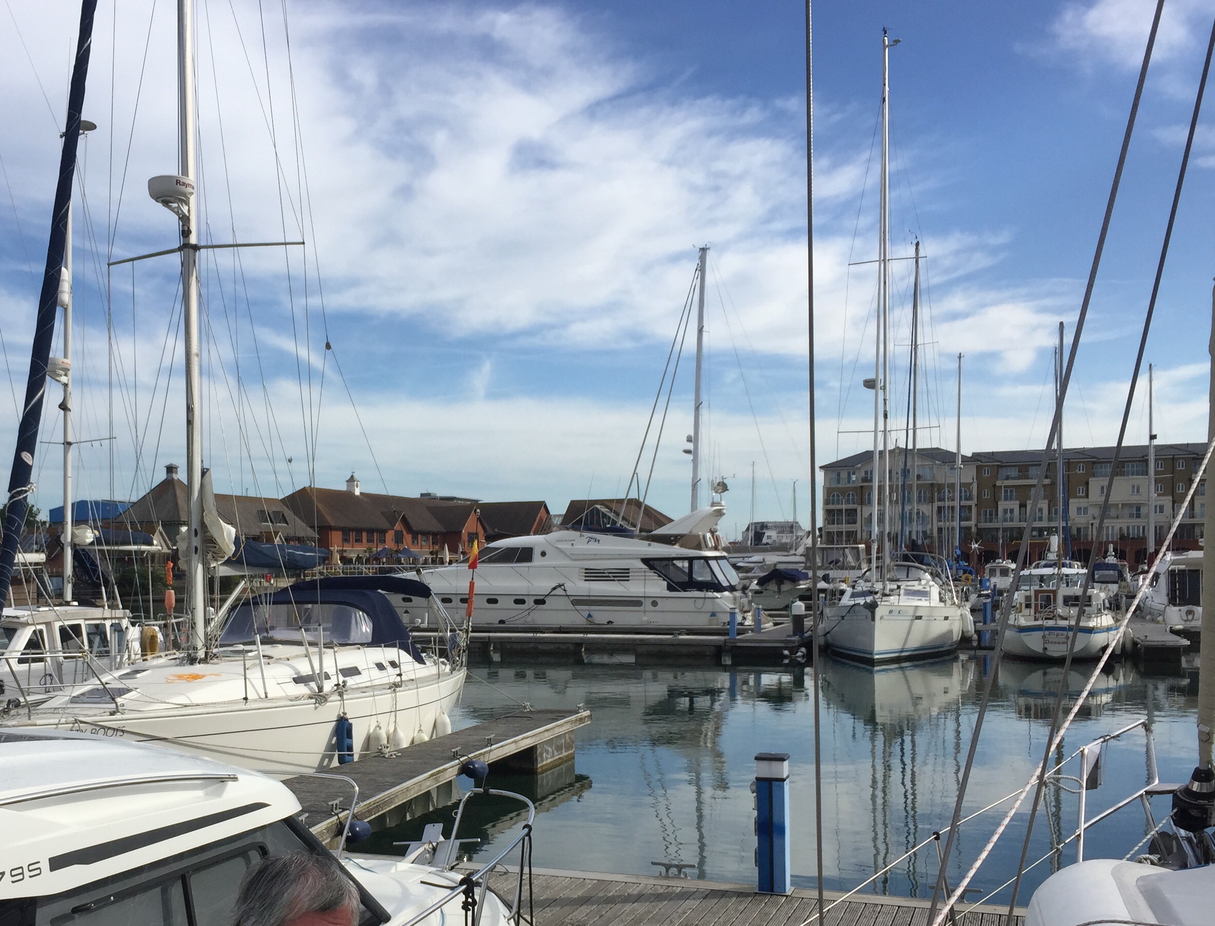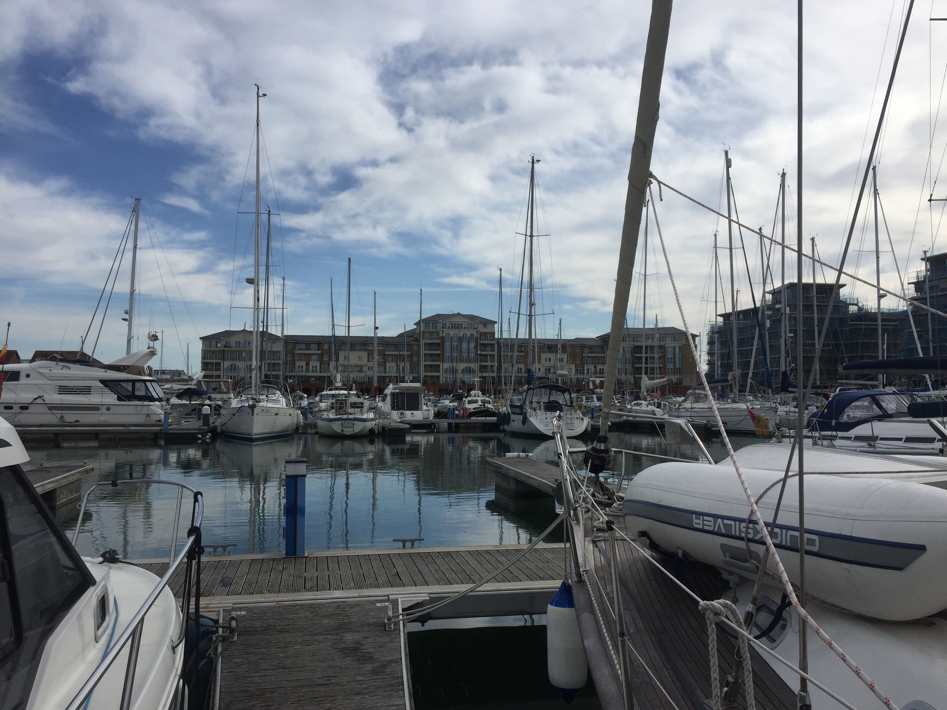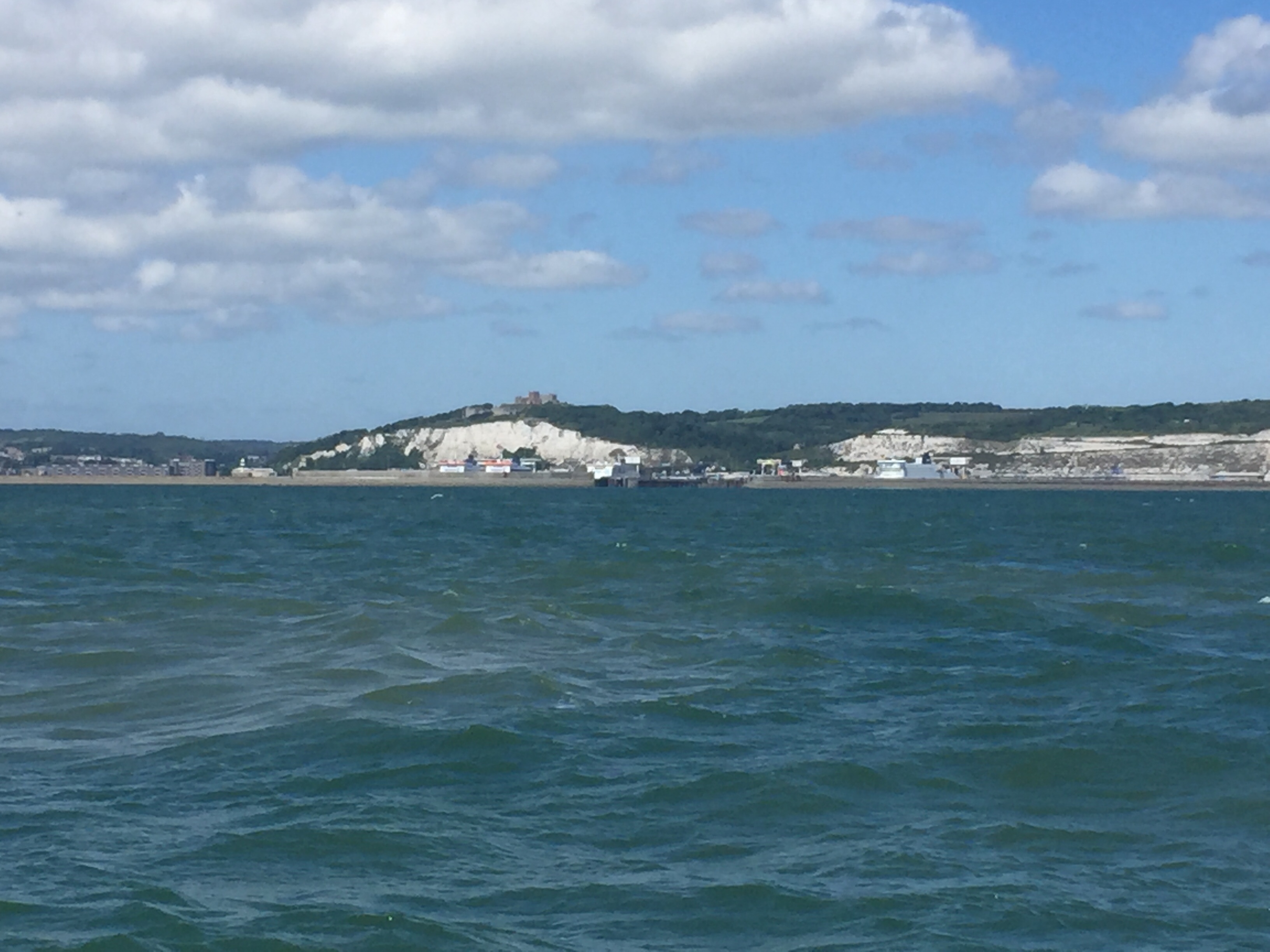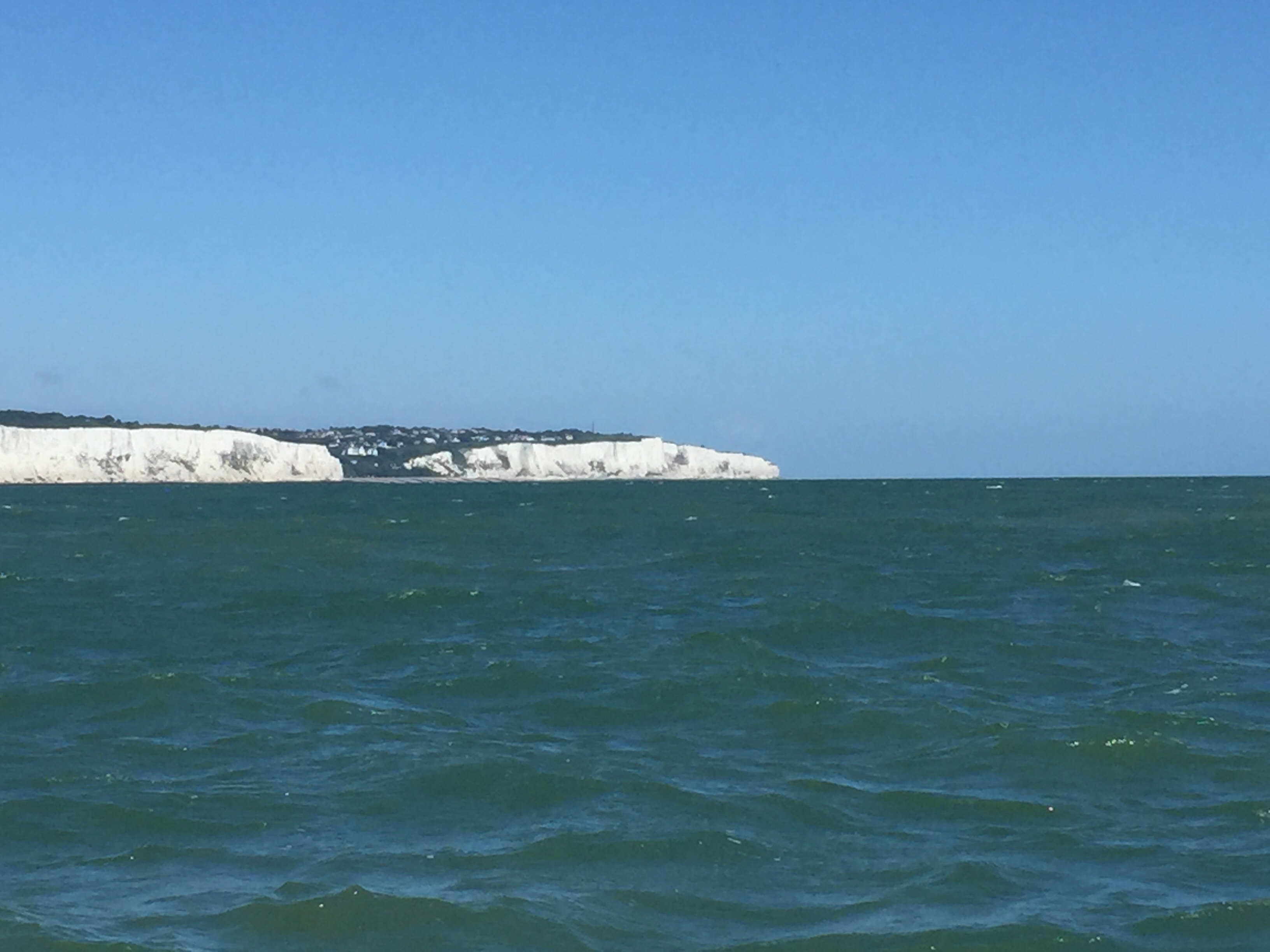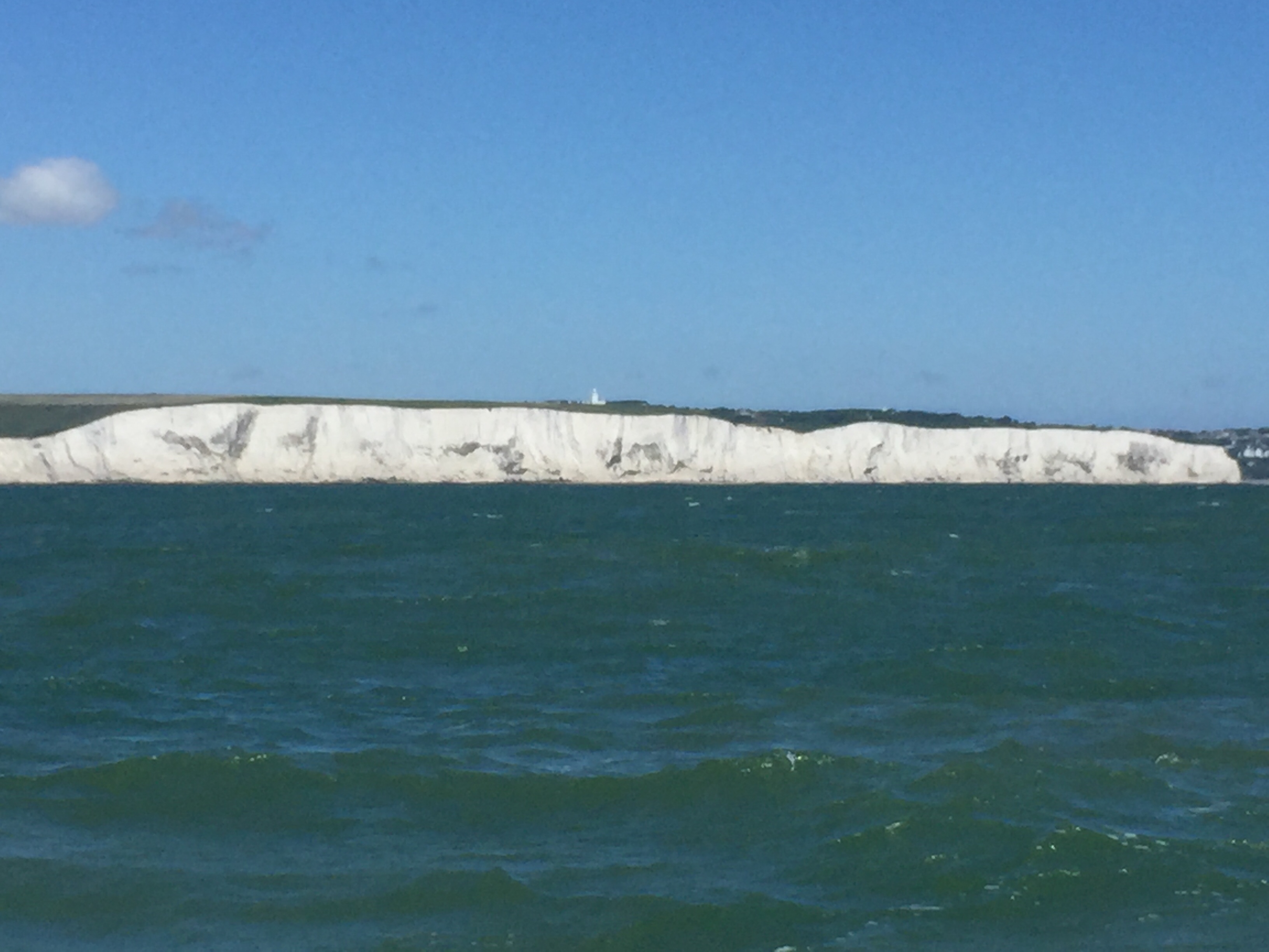 Sun shining again! Getting used to this now! We got up early in order to get to Waitrose for 8 am in order that we could leave at 0920. Sue and I walked up the interesting zig zag flights of steps up which had obviously been built up the original cliff face. The amazing ( presumably) Victorian facade runs alongside us to the right, covering the white cliffs. At the top we have a great view over the harbour. There are beautiful crescents of smart, tall terraced town houses, with wrought iron balconies looking out to sea. We found a post box that we needed and then the nearby Waitrose, just opening up. Just the fact that there IS a Waitrose means we must mean we have come a long way. An interesting observation was that when buying milk in these parts, ( in a Waitrose!)the UHT cows milk occupied a very small proportion of the shelves and it was on the bottom shelf….. whereas the main stock was milk made out oats, almonds, soya, potato and the jolly person stacking the shelf commented that they would soon be making milk out of cardboard 🤪. We returned to Angelique with our wares and got ready to leave. We ate fresh croissants and drank coffee on the way and soon we could see “the corner “ approaching!Only a few miles of the east coast to go! The white cliffs of Dover are dramatic against the blue green sea and the sky. A quiet emotional moment as we all thought about the war and what these cliffs and these waters had witnessed. For us, leaving the east coast behind and turning west was also poignant. This coast has had its challenges and rewards which we won’t forget in any hurry. Playing Vera Lynn from you tube, we sang along as we sailed. Dover Marina is closed for refurbishment at the moment, so we have no choice but to progress to The Sovereign marina at Eastbourne. It’s a big lock entrance with high pontoons on both sides. We had to sort the fenders at higher than normal height. The instructions were that we would receive berthing instructions once in the lock. That didn’t happen so we just sat there. Eventually we asked again on the radio and they told us to go to E 05. And that it would be starboard hand side Unfortunately arriving at E 05, it was obvious we wouldn’t fit in and would have completely squashed the other boat ! Radioed again they told us to go to E 15 which was almost as equally tight and the issue was confused by telling us it would be starboard side and it was port! So a complete shambles…. glad we had extra crew to help keep moving things around! A sausage supper and a bottle of fizz to celebrate rounding the third corner of our trip!