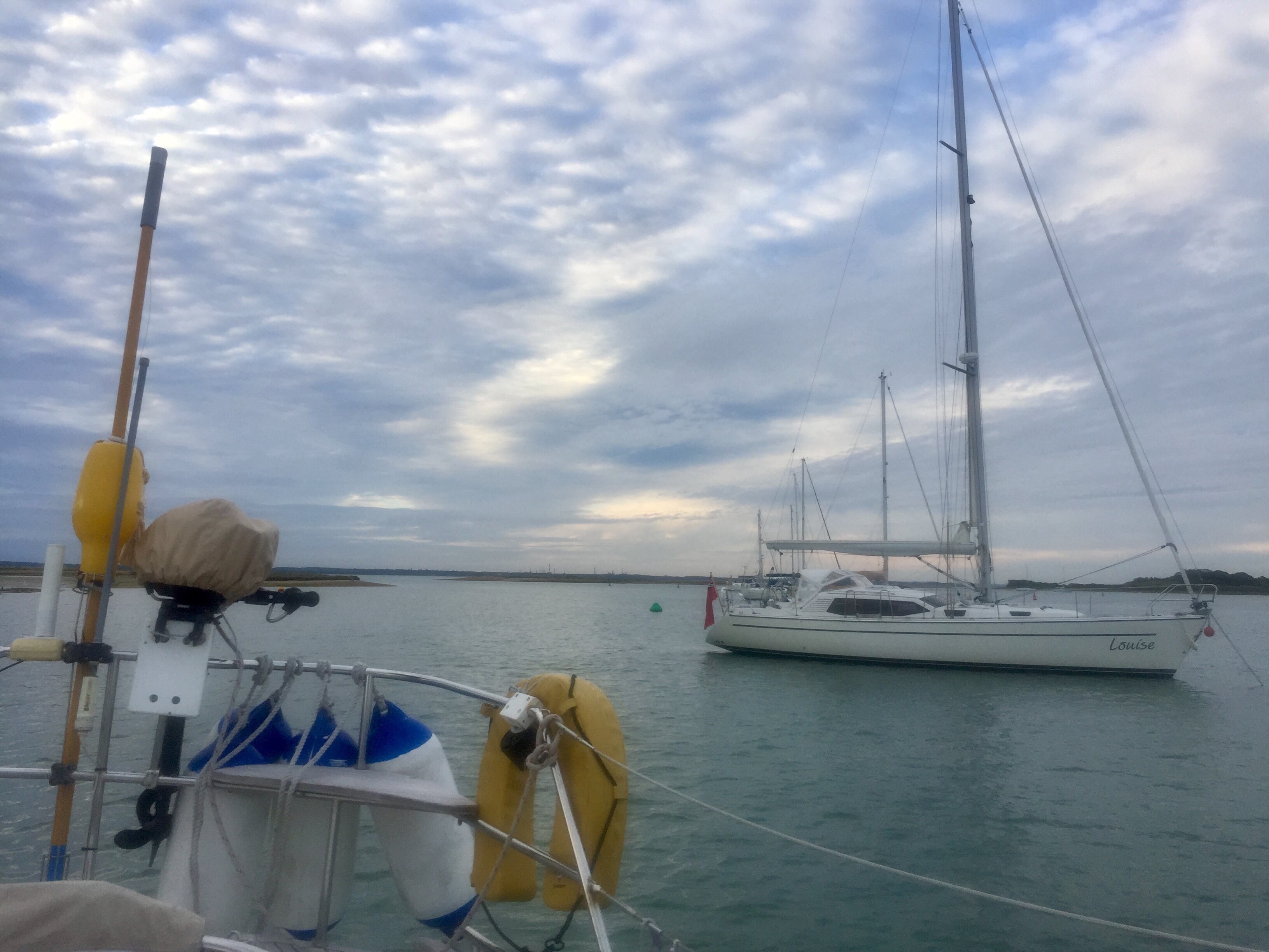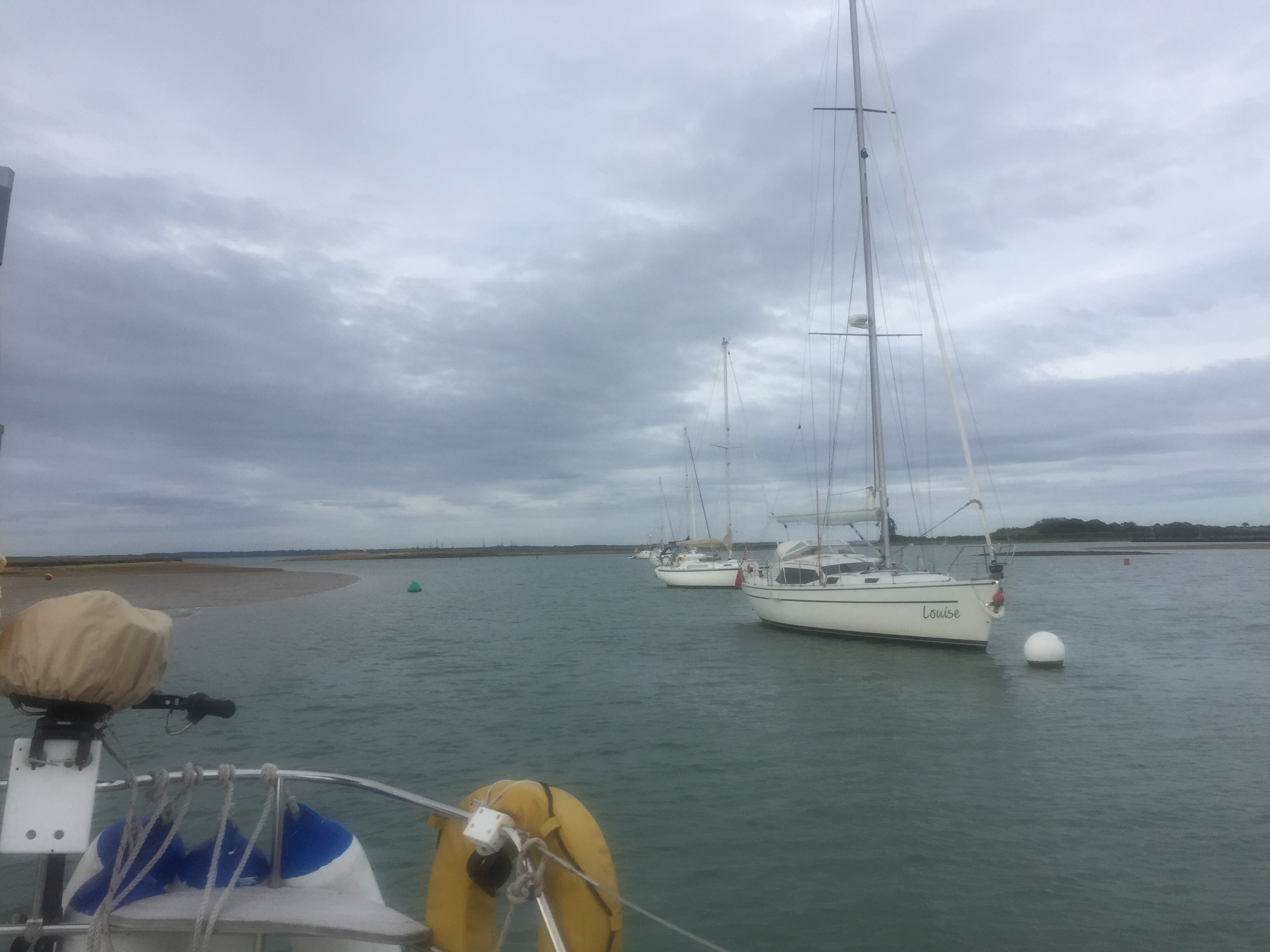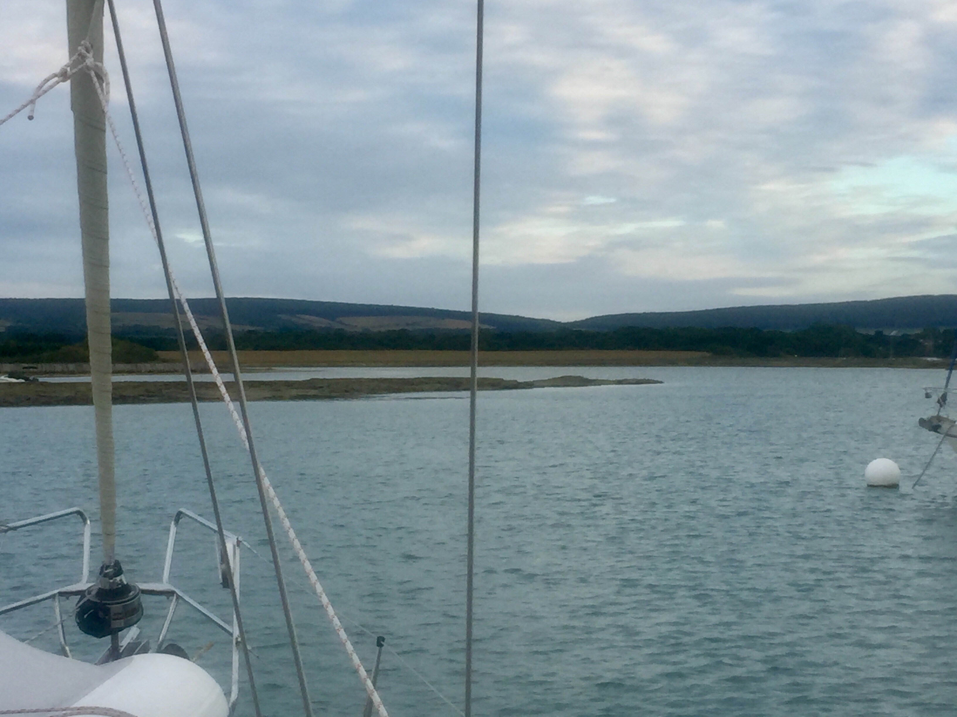 A lazy start in a peaceful river setting. Could happily stay! Has a bit of a “ wind in the willows “ feel. Anyway we are supposed to be slowly making our way west. This week definitely feels like a holiday! we dropped our mooring, making a note of the number as it’s a good one for friends to look out for. Past Buckler’s hard where Nelsons ships were built out of the great oaks that grow here. It’s still breezy down river…. we were definitely more sheltered round the bend up there. Once out into the Solent we started tacking towards our next destination on the Isle of Wight. I made a few phone calls to marinas to book for the next few days. Angelique really goes well even up wind just on A bit of the head sail, and as long as the wind is strong enough we get good boat speed. So we were doing 5-6 knots in 15-20 knots of wind, upwind! We got to the entrance just after high water which is fine. This estuary is odd in that the HW has what’s called a stand for two hours… so The level of water at HW is then maintained for roughly 2 hours and then sluices out quickly. Very odd . But quite useful. Not having been before we decided to pick up a big white bouy mooring…. no 9 . They are all in a line in the right hand channel of the estuary. Immediately we were attached, the jolly HM arrived in his launch to have a chat and take our money. This whole place is owned by the National Trust and is full of birds and hides on the shore. Being members however, doesn’t get you any money off! If it had been calm it would have been lovely to get the dinghy off and mooch about with a pair if binoculars, but it’s windy so we were happy to sit and observe from the cockpit. As the waters receded, muddy and shingle banks are revealed. We were always floating even though the depth Gauge said 1.8 at one time. Presumably moving through light sludge. Bird life the most abundant we’ve seen since leaving the North. Flocks of black headed gulls ( indisputably) , egrets, oystercatchers, ducks, and we saw our first curlew…. very exciting! We watched boats come and go. We saw a boat hook floating by from one but managed to hail the HM who fished it out and returned it. It was like ours so good to know they float! I made flapjack and watched Wimbledon. J cooked sausages for tea. A lovely afternoon and evening. Apart from managing to completely delete the blog I’d written for the 27th… somehow hitting the wrong thing after making some changes 😡. Livid. Ah well.