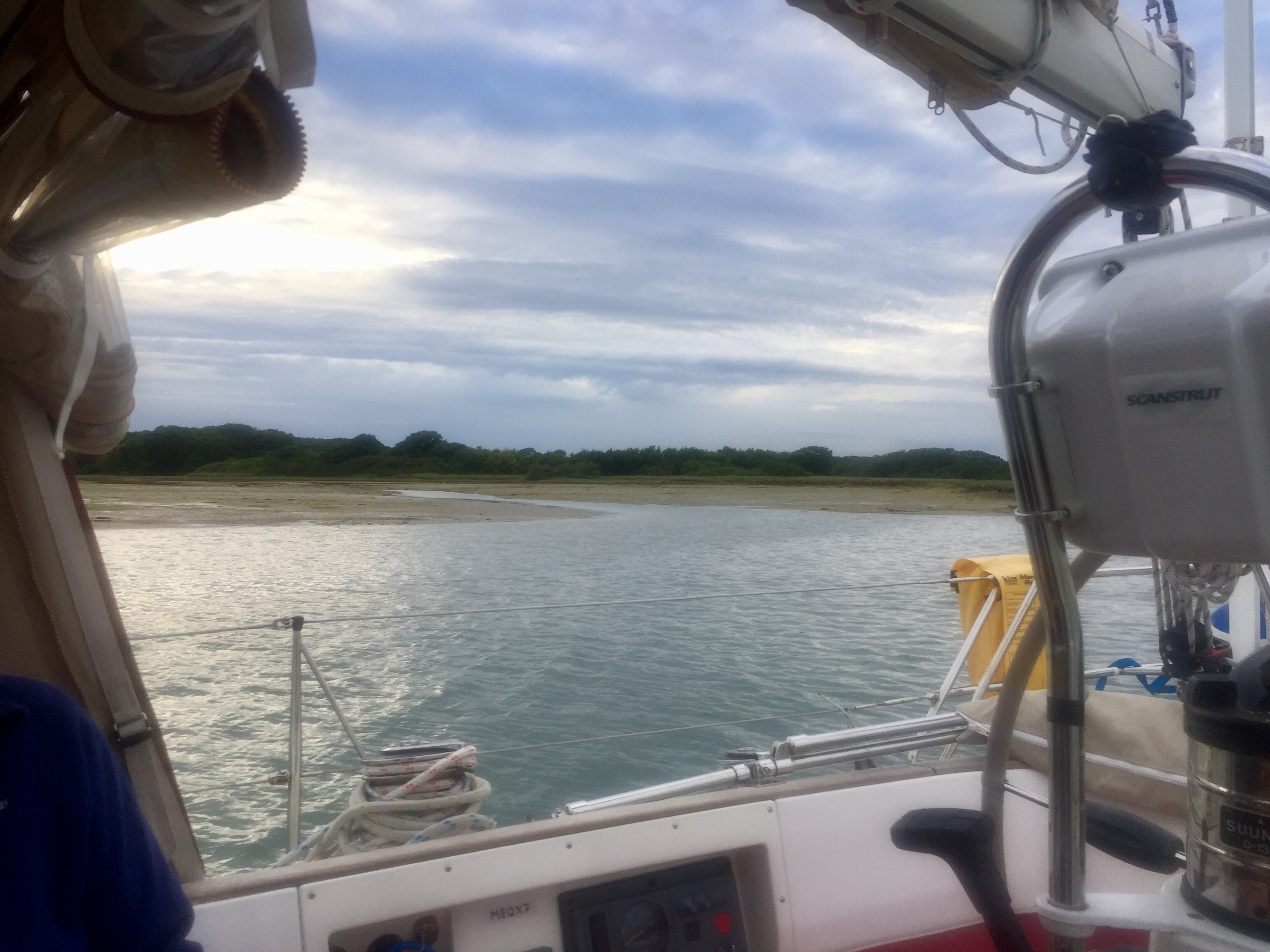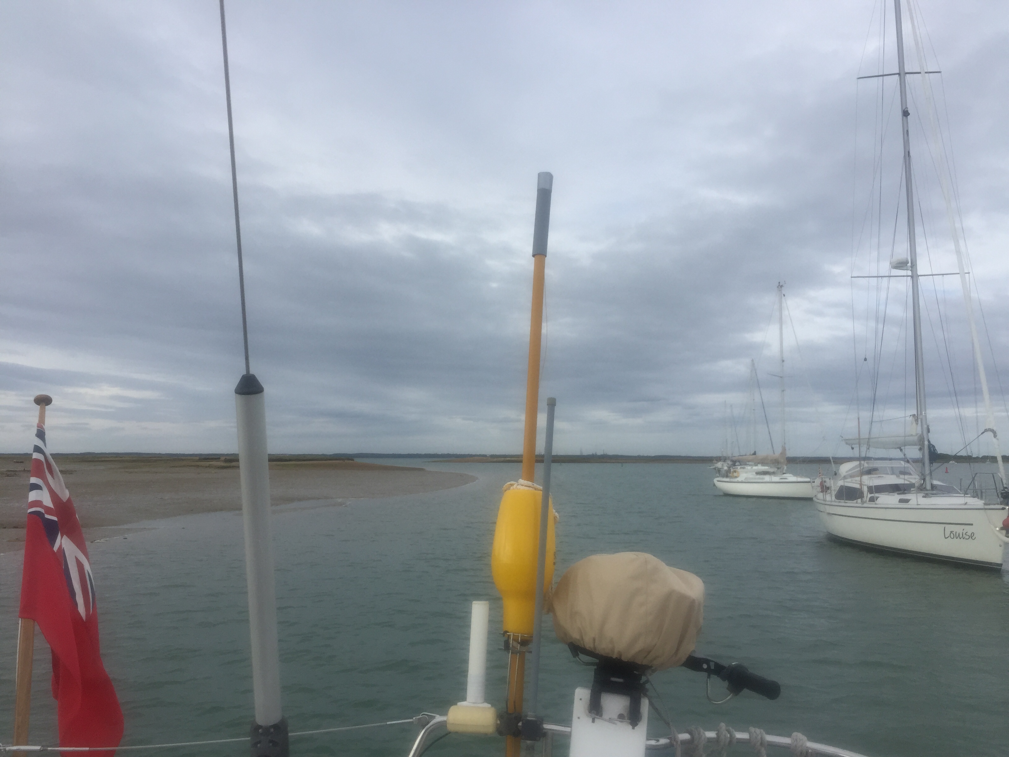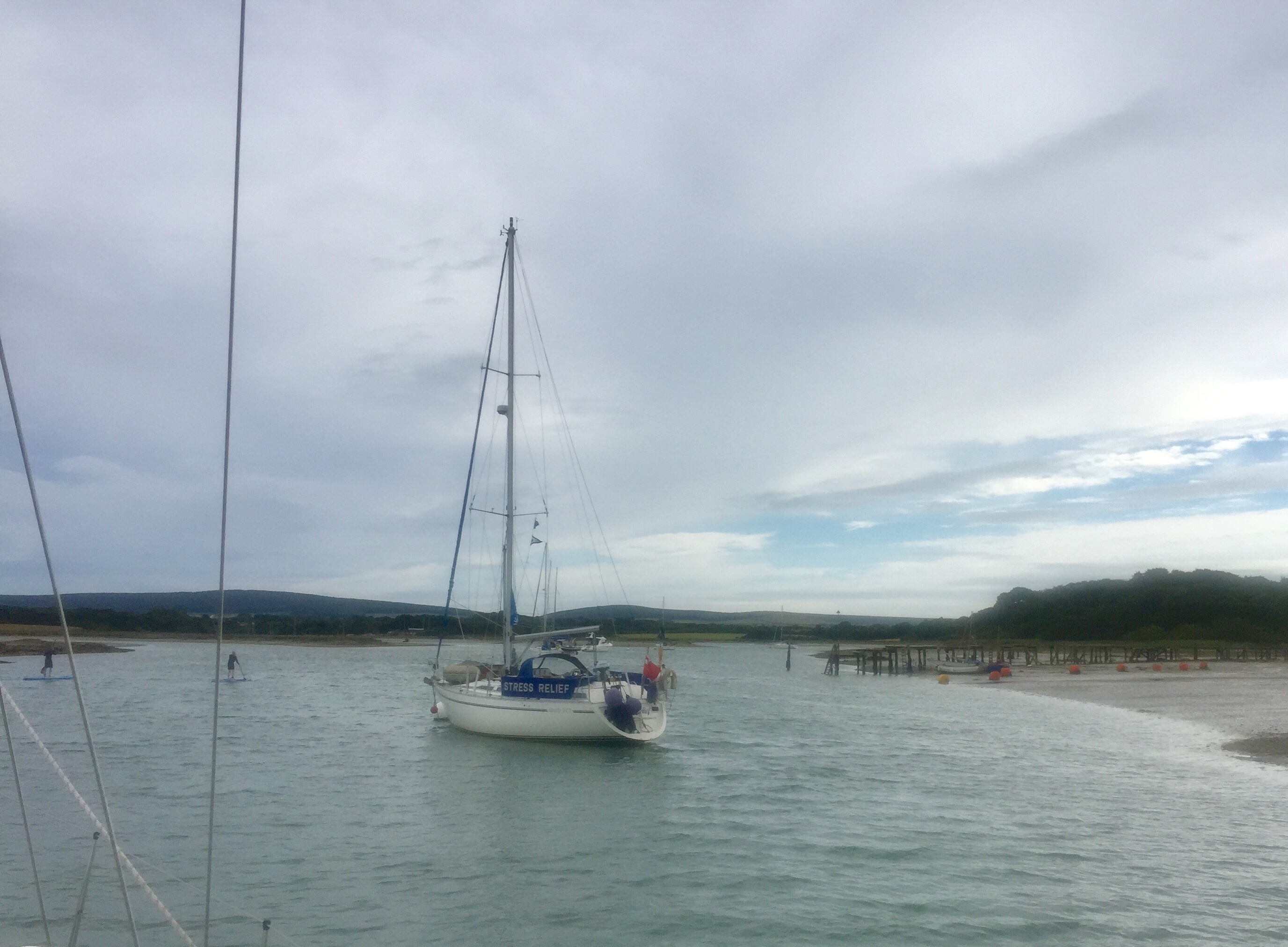 A lazy start in a peaceful river setting. Could happily stay! Has a bit of a “ wind in the willows “ feel. Anyway we are supposed to be slowly making our way west. This week definitely feels like a holiday! we dropped our mooring, making a note of the number as it’s a good one for friends to look out for. Past Buckler’s hard where Nelsons ships were built out of the great oaks that grow here. It’s still breezy down river…. we were definitely more sheltered round the bend up there. Once out into the Solent we started tacking towards our next destination on the Isle of Wight. I made a few phone calls to marinas to book for the next few days. Angelique really goes well even up wind just on A bit of the head sail, and as long as the wind is strong enough we get good boat speed. So we were doing 5-6 knots in 15-20 knots of wind, upwind! We got to the entrance just after high water which is fine. This estuary is odd in that the HW has what’s called a stand for two hours… so The level of water at HW is then maintained for roughly 2 hours and then sluices out quickly. Very odd . But quite useful. Not having been before we decided to pick up a big white bouy mooring…. no 9 . They are all in a line in the right hand channel of the estuary. Immediately we were attached, the jolly HM arrived in his launch to have a chat and take our money. This whole place is owned by the National Trust and is full of birds and hides on the shore. Being members however, doesn’t get you any money off! If it had been calm it would have been lovely to get the dinghy off and mooch about with a pair if binoculars, but it’s windy so we were happy to sit and observe from the cockpit. As the waters receded, muddy and shingle banks are revealed. We were always floating even though the depth Gauge said 1.8 at one time. Presumably moving through light sludge. Bird life the most abundant we’ve seen since leaving the North. Flocks of black headed gulls ( indisputably) , egrets, oystercatchers, ducks, and we saw our first curlew…. very exciting! We watched boats come and go. We saw a boat hook floating by from one but managed to hail the HM who fished it out and returned it. It was like ours so good to know they float! I made flapjack and watched Wimbledon. J cooked sausages for tea. A lovely afternoon and evening. Apart from managing to completely delete the blog I’d written for the 27th… somehow hitting the wrong thing after making some changes 😡. Livid. Ah well.
