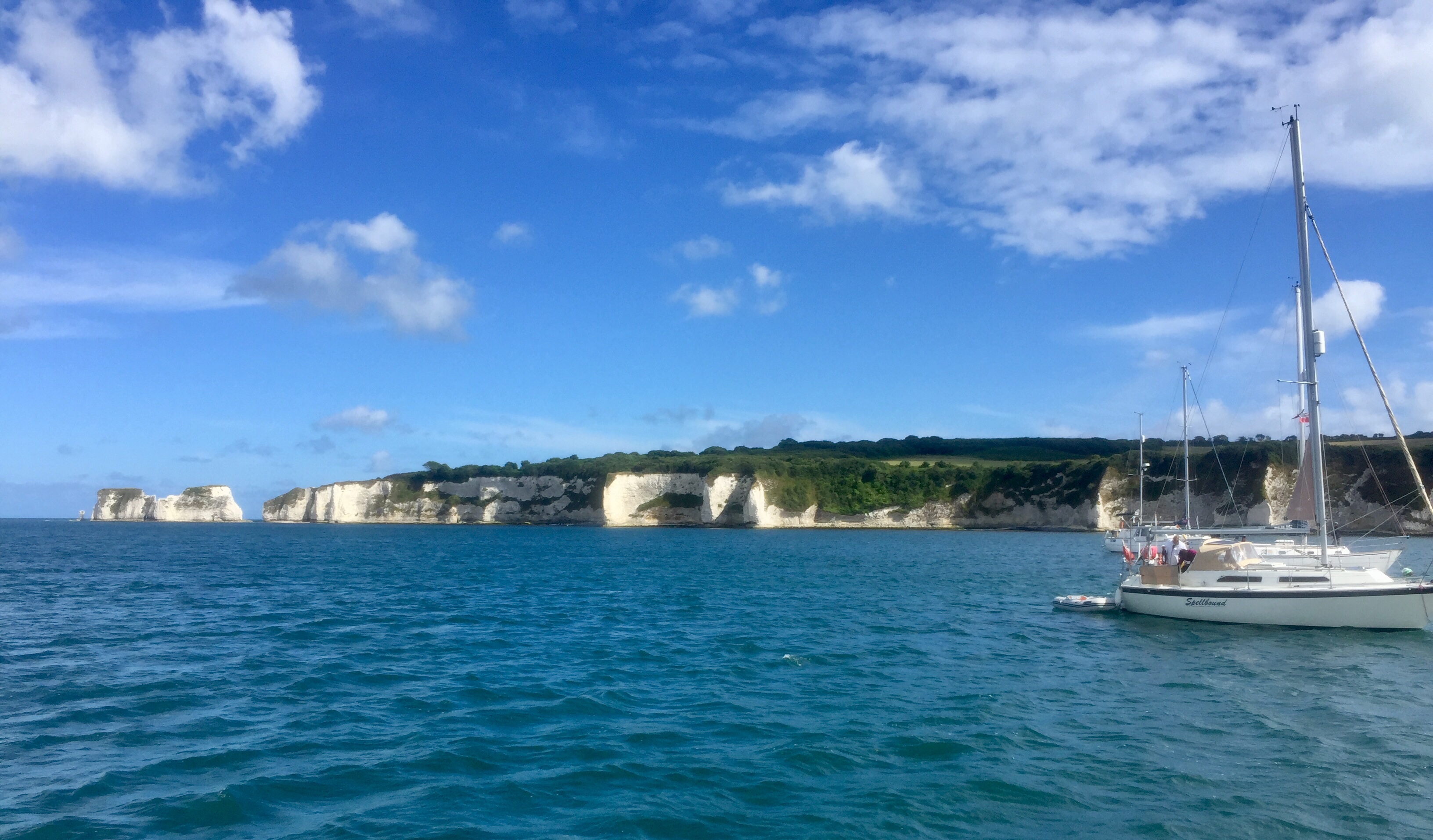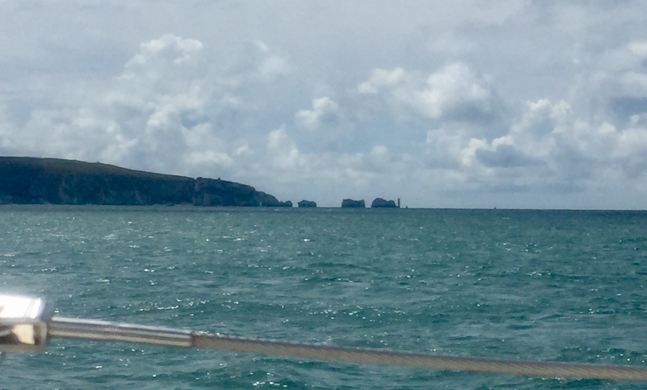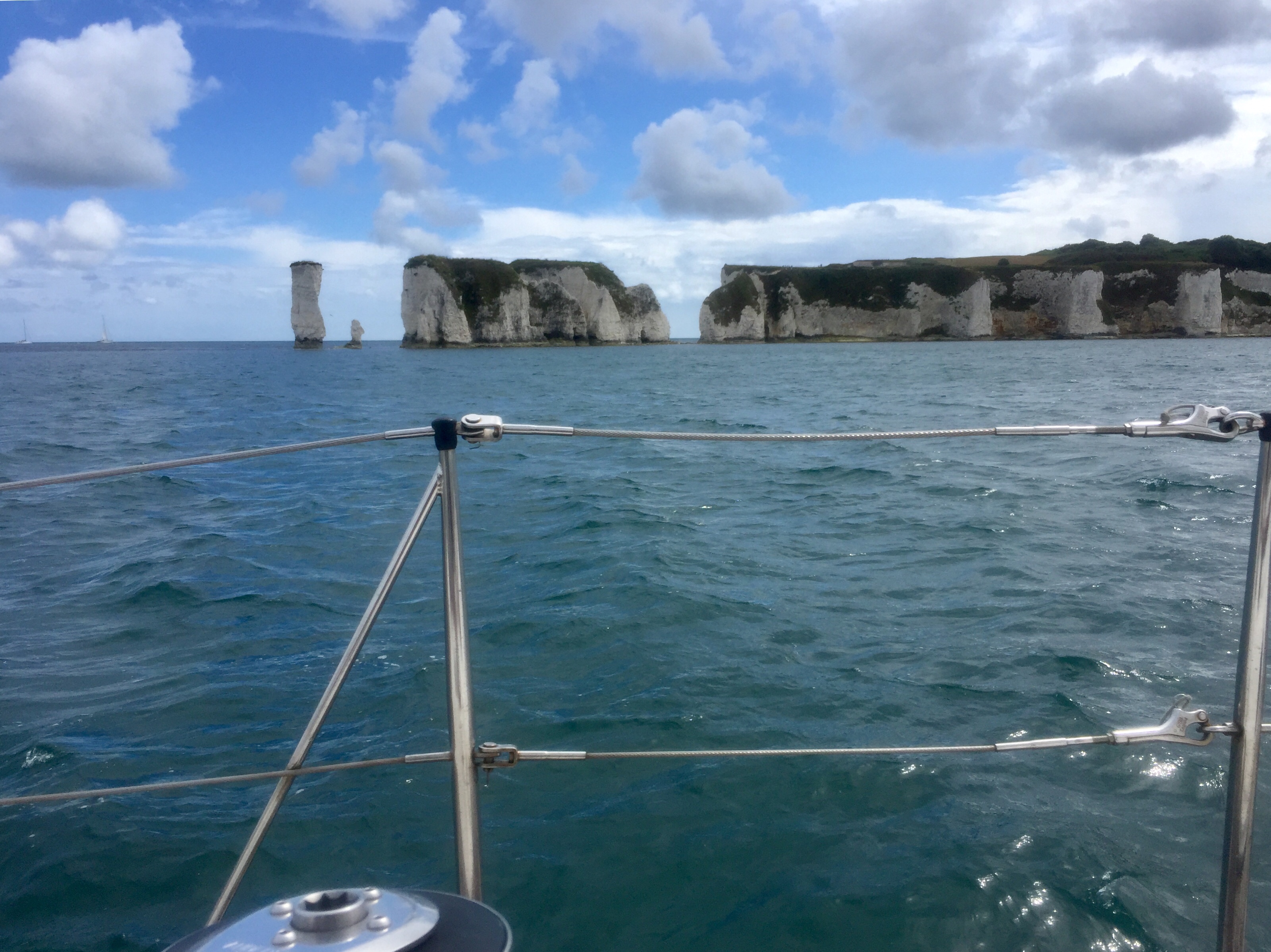 Still sunny we left Lymington late morning and emerged into the Solent with a few other boats. Tacking back and forth, dodging boats and all the “rules of the road “ involved, reminded me of happy days gone by on Quango….. a Hunter 707 we used to race up in North Wales. Once past the nice bright white lighthouse and Hurst castle.. presumably napoleonic? We took the Route of the North channel rather than bucking lumpy wind and tide out by the needles. Which did mean no iconic pictures! We had one reef in the main and in the headsail and we sailed on the wind putting in a couple of tacks as needed. It was only a few hours journey and with the wind still blowing 15-20 knots as usual we were approaching Studland bay off Poole, in no time. The very obvious white cliffs and stacks of Old Harry approaching are truly stunning. Especially as we had blue sky and sea with green fields to complete the scene. What amazing geology we have in this island of ours. We were aware of all the issues surrounding anchoring in Studland bay, given its been in yachting monthly etc, but couldn’t find out on the internet just exactly what was there… we gathered there were some visitors mooring buoys but it wasn’t clear how many. We could see a line of neatly separated boats maybe 6 or 7 , and then a few random ones. We rightly guessed that the line did represent moorings but they are small and white, so not easy to see. However, binoculars in hand we made our a free one between two boats and headed for it. On arriving at it, no pickup but a nice open metal hoop of narrow gauge. J turned around so I could get my yellow mooring tool ready and a line. Not easy as it’s still windy but we managed to get a line on it to secure us. Once secure we did the same with our ( heavy duty….. weighs a tonne) chain bridle. Fixed for the night! There is a website that you’re directed to, to make a donation to the seahorse trust. I did this but wondering how many people do? I’m hoping they do because that’s the only way they will afford to put more mooring buoys down. At the moment there are only 10, which patently obviously is nowhere near enough if you look at photos of this place on summer holiday weekends. We loved the place and despite the wind we had a really comfortable night. We watched Wimbledon and the world go by…… eventually the sun went down. Good to imagine the little long-snouted seahorses in their weedy home underneath our boat .